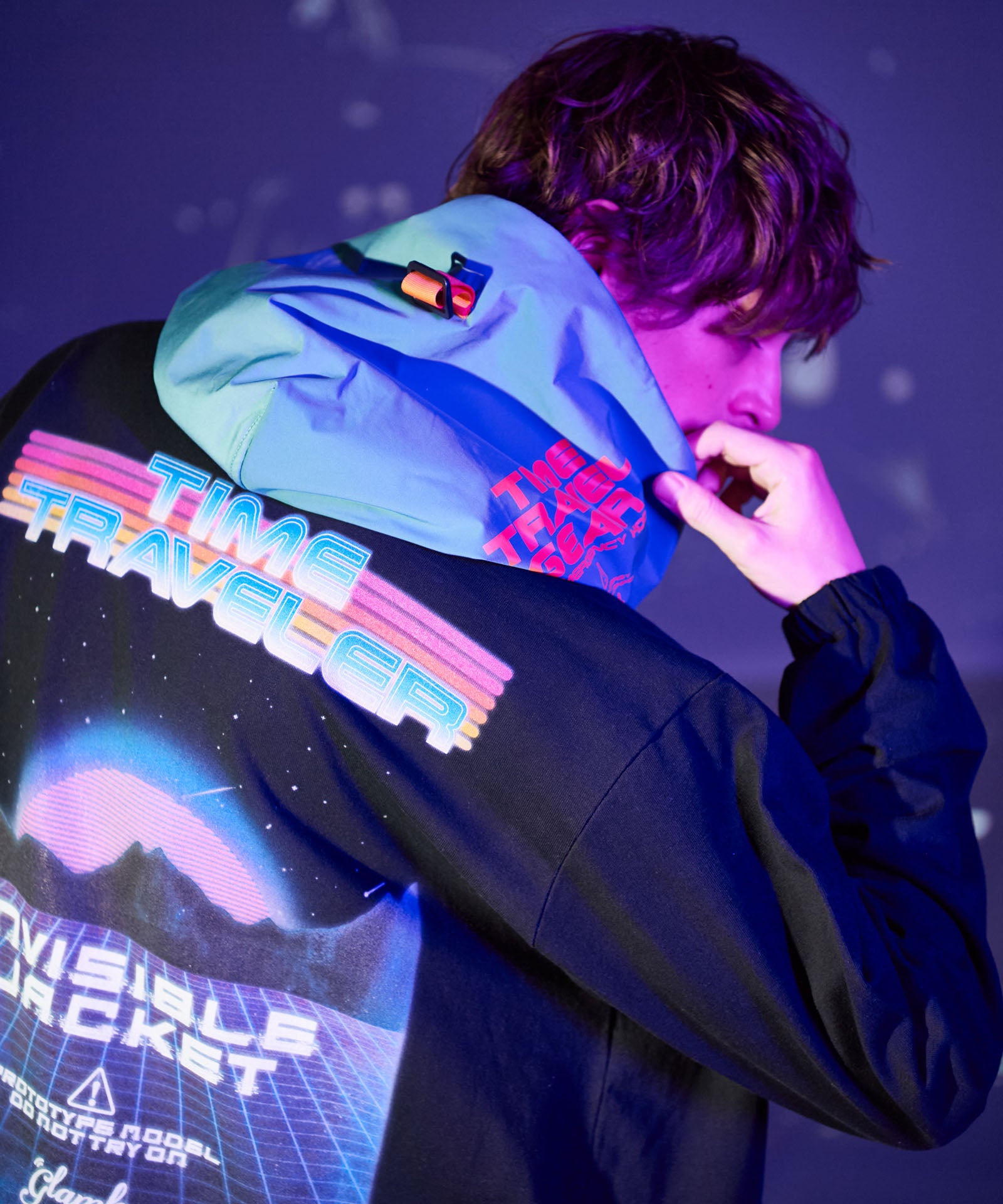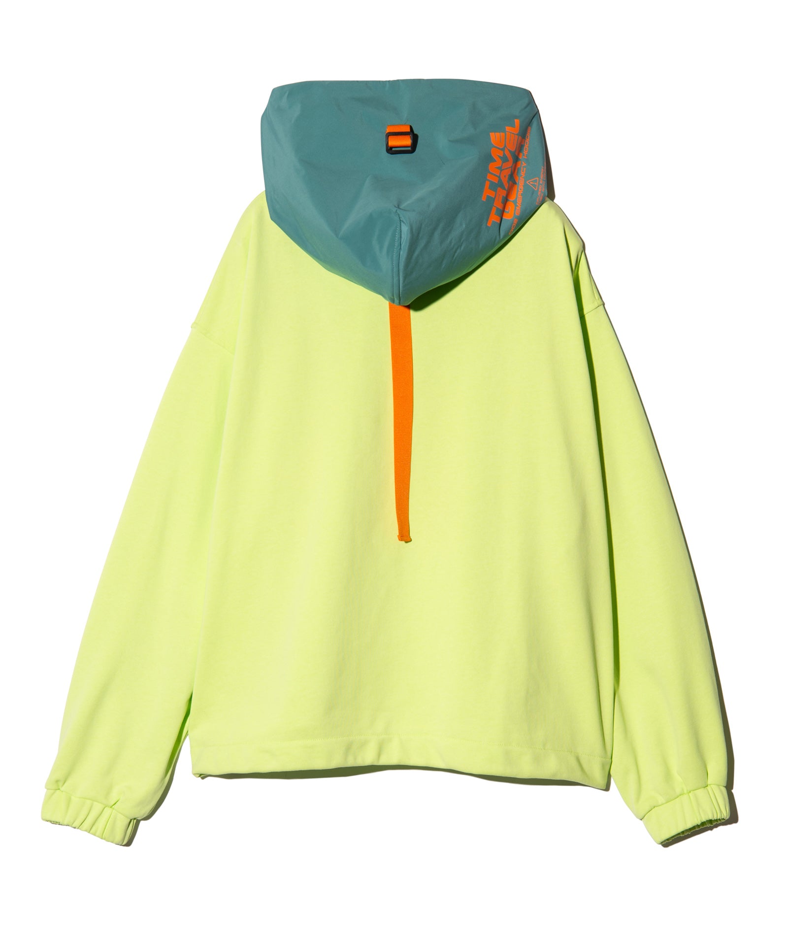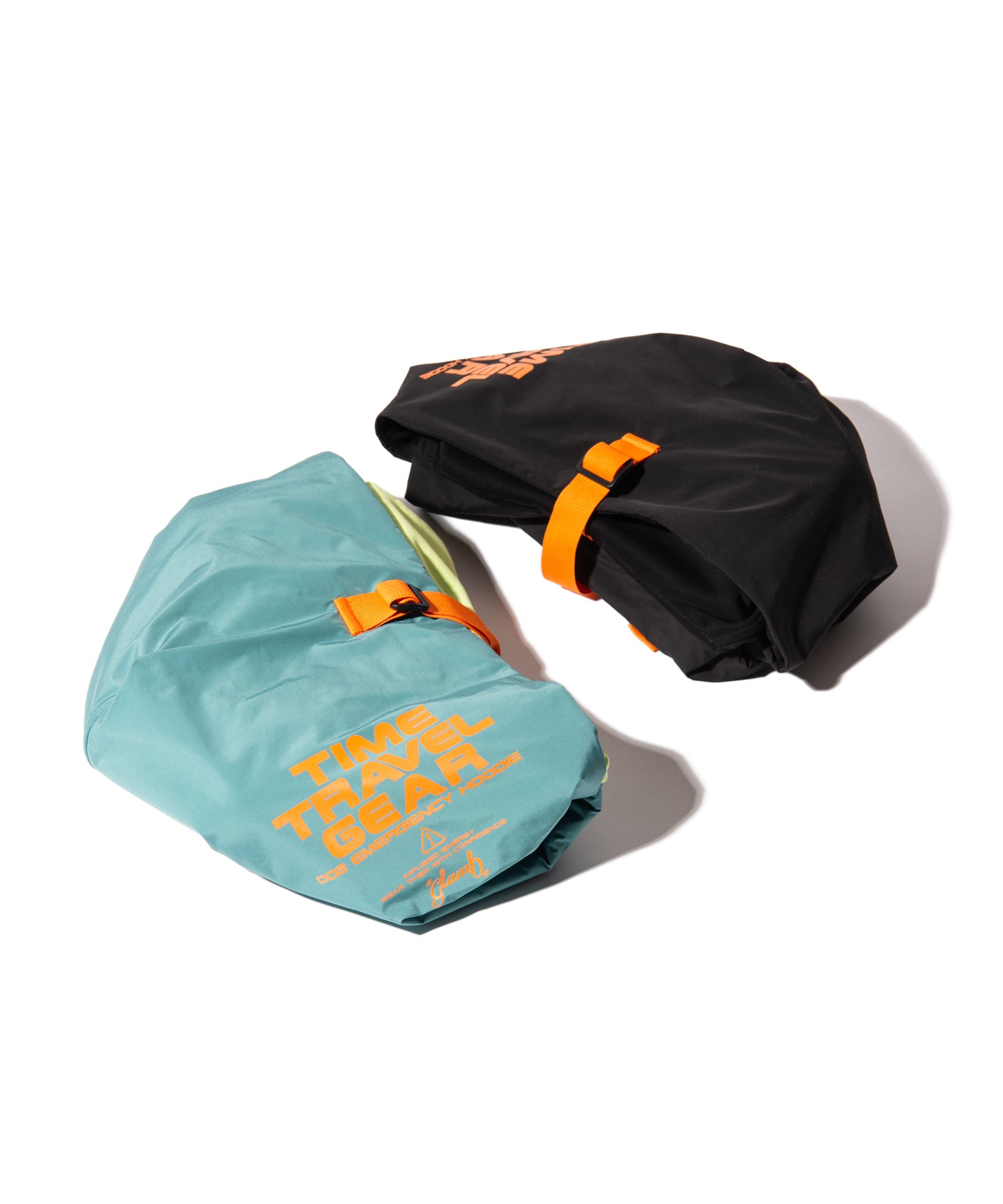 The TIME TRAVELER Emergency Hoodie (GEAR 002) is a series that strongly reflects the concept of this season's theme, "TIME TRAVELER." This is a TIME TRAVELER Emergency Hoodie (GEAR 002) that you should bring in in case of time travelling emergency. This packable design allows you to store the main unit compactly in the hood and carry it around, and can be used as a neck pillow inside a time machine. If you are experiencing problems, please convert it into a hoodie by pulling the orange ribbon and protect yourself from changes in weather. The big silhouette with a short length creates an active top style. The texture of the body fabric, which exudes a sci-fi-like luster, will also invite you to time travel.