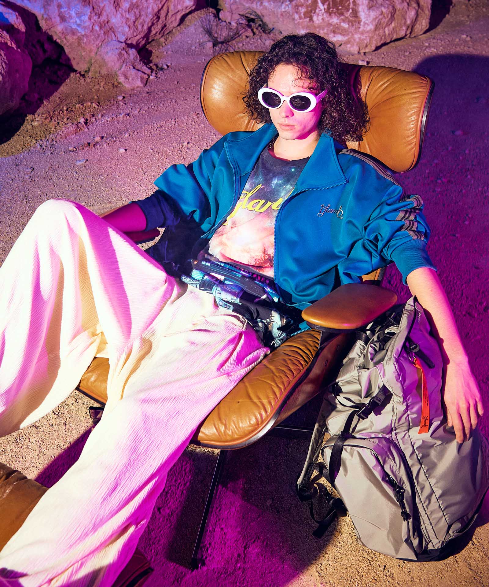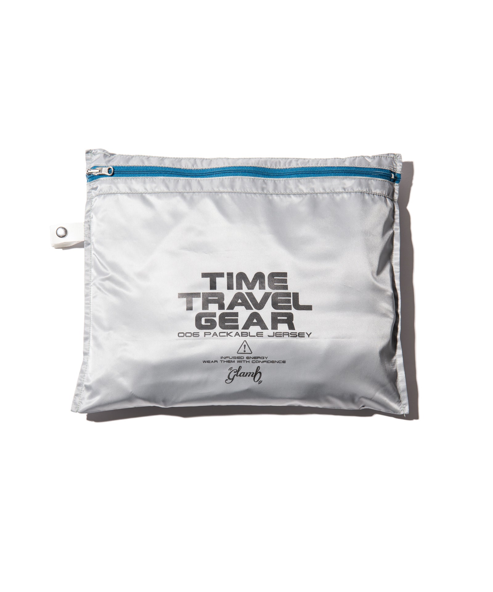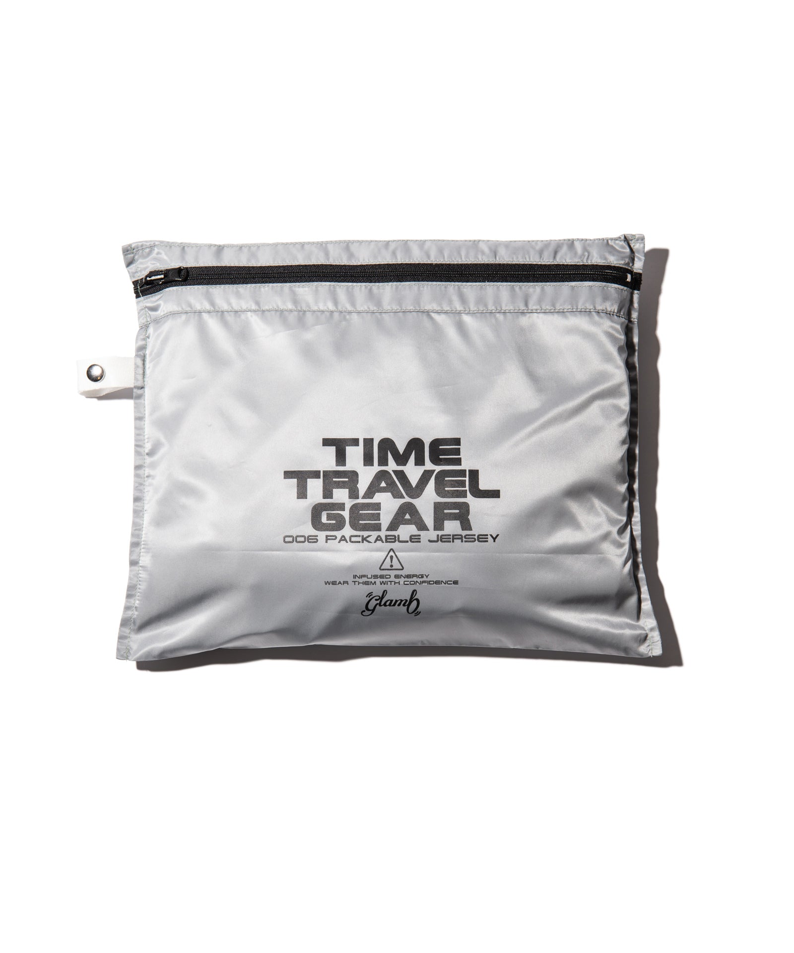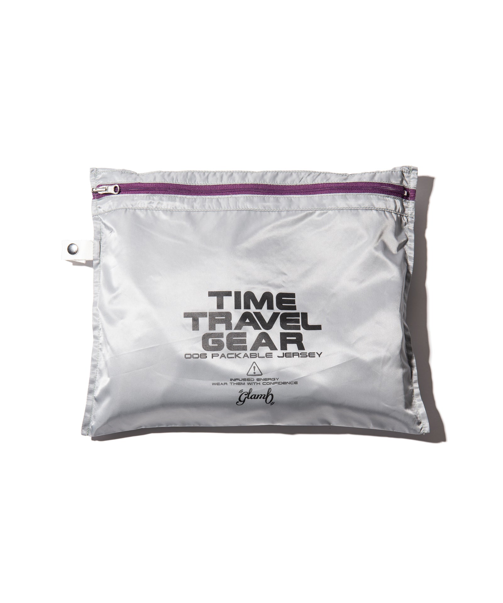 TIME TRAVELER Packable Jersey (GEAR 006) is a series that strongly reflects the concept of this season's theme, "TIME TRAVELER." This season's theme is "TIME TRAVELER," and offers line jerseys as travel wear. The body is made of ester textile that is less likely to wrinkle, and is accented with a high neck with loose drapes around the neck. The arm lines are original designs knitted with two colors of yarn and varying pitch. The glamb spin logo is embroidered on the chest. It is packable and can be stored in a package placed inside, but it can also be used as a cushion, and it is a playful device that connects retro and future between the inside and outside of the pack.