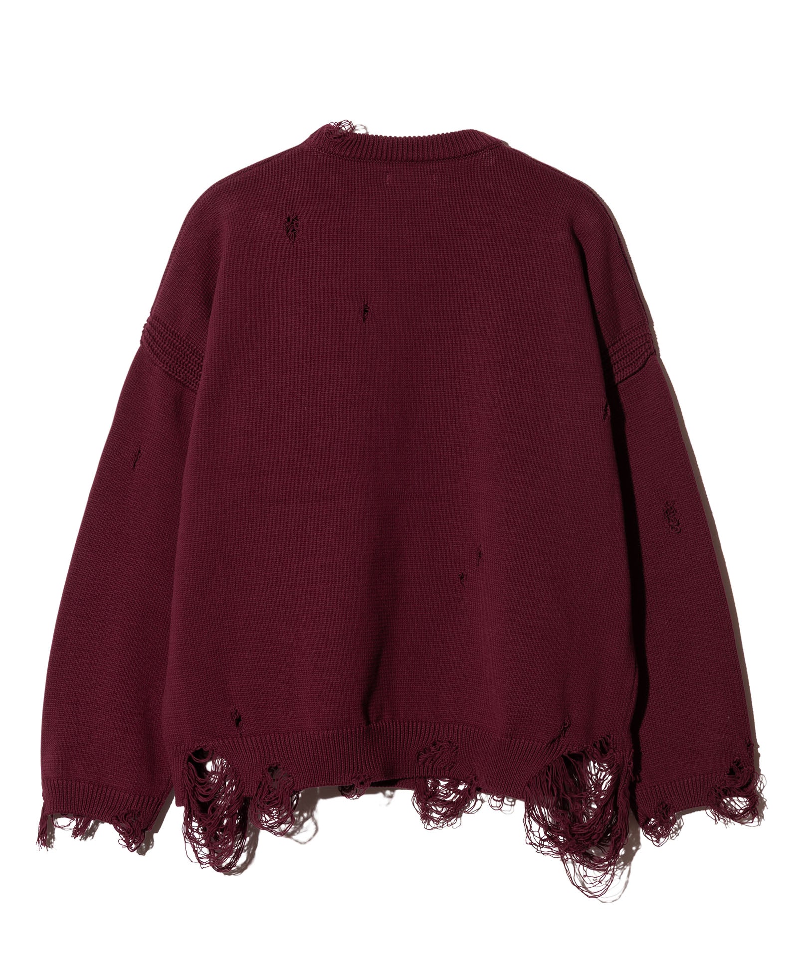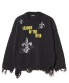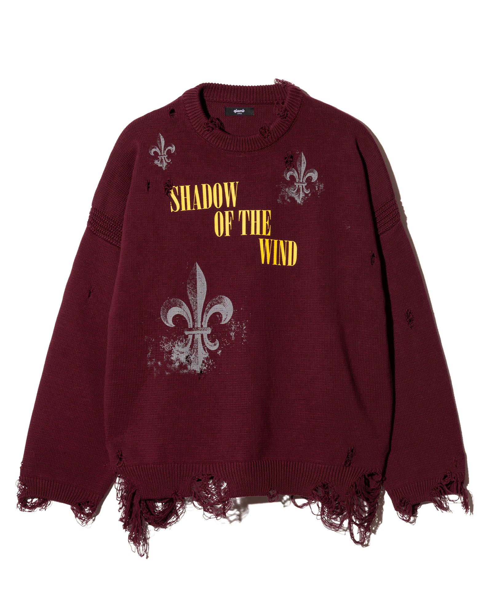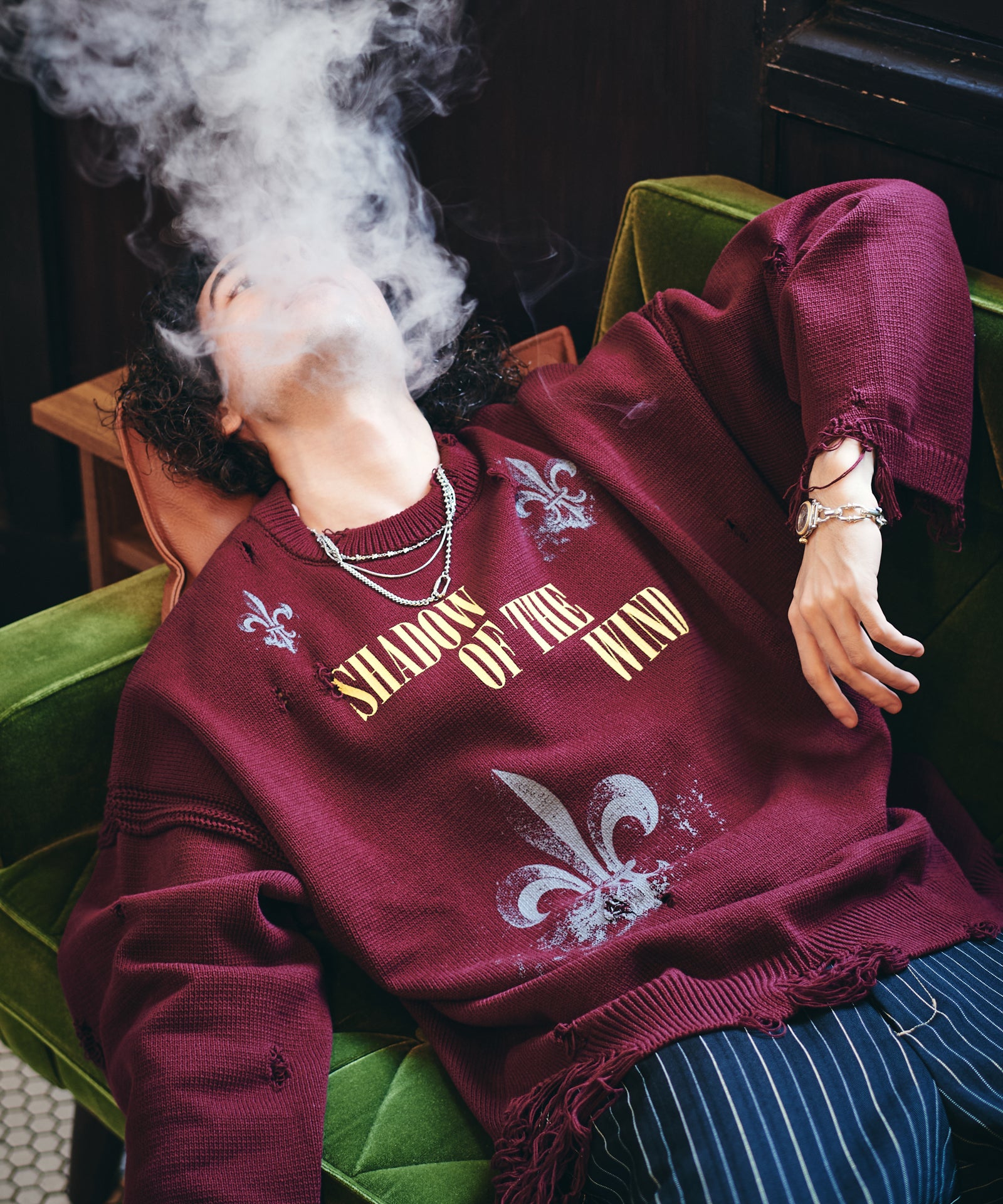 This season, with the theme of "Shadow of the Wind," the world's light and shadow are depicted in the wardrobe, and Sacred Damage Knit incorporates a design with a gap in pullover knit. The body pattern is classic with a lily emblem, but the key points are hard distressed. The coat of arms itself is also faded to create a mixture of aristocratic motifs and street style. The material used is 100% cotton twin yarn. The body is jersey knit, the neck, cuffs, and hem are rib knit, and the armholes are single ridge knit, making the texture changes unique to knits appealing.