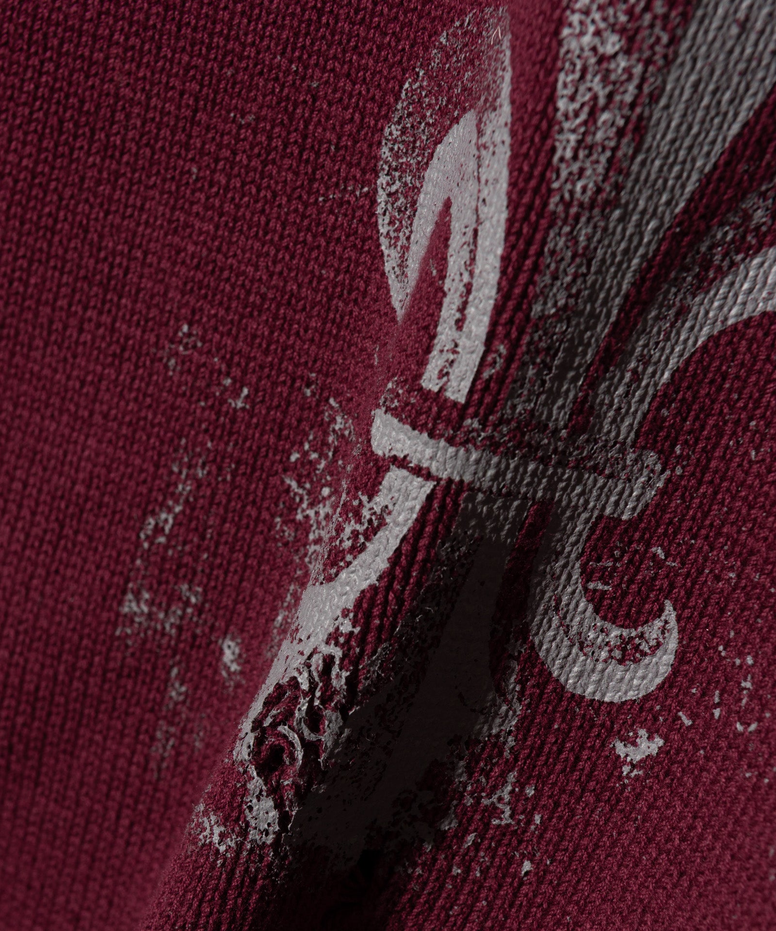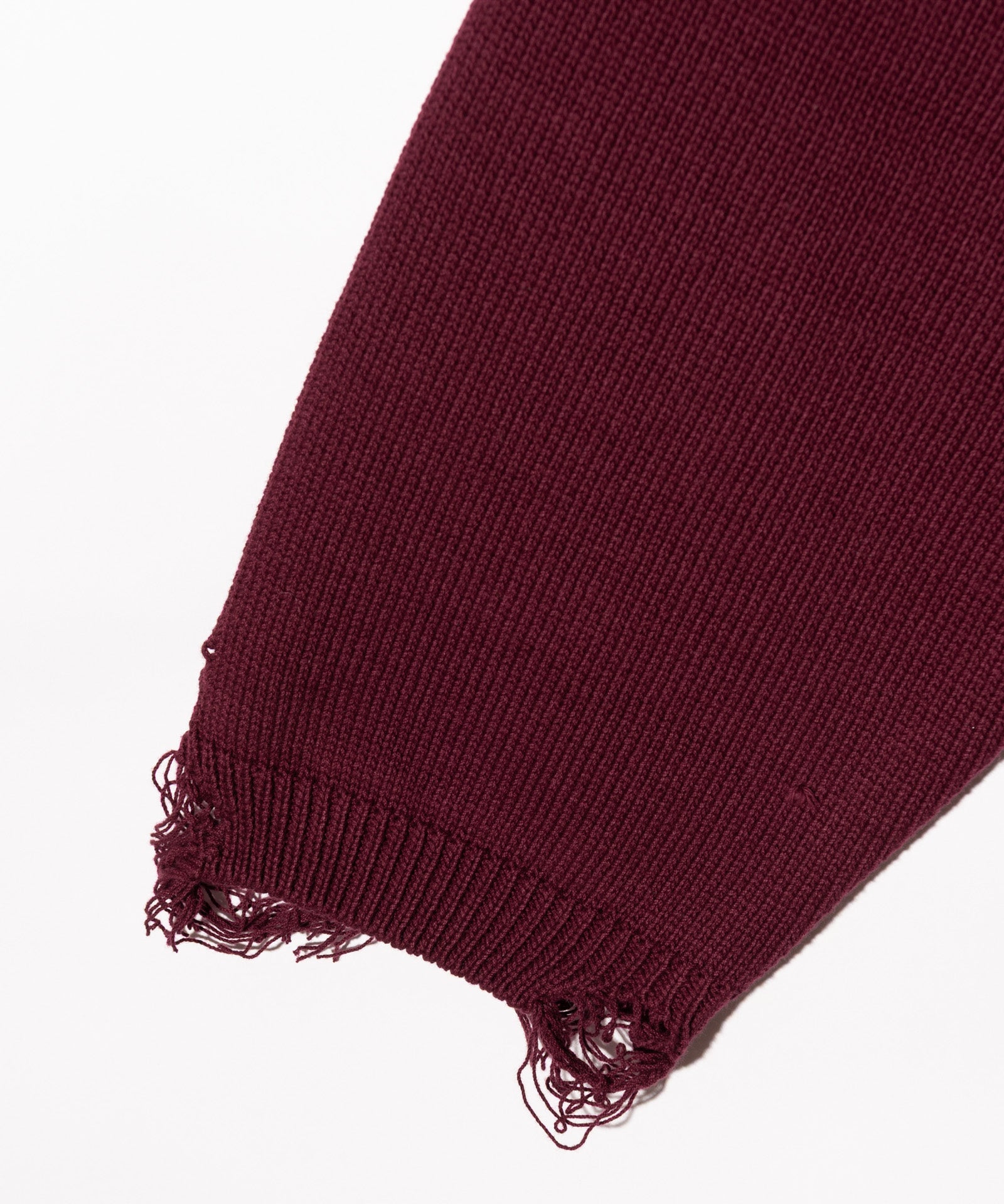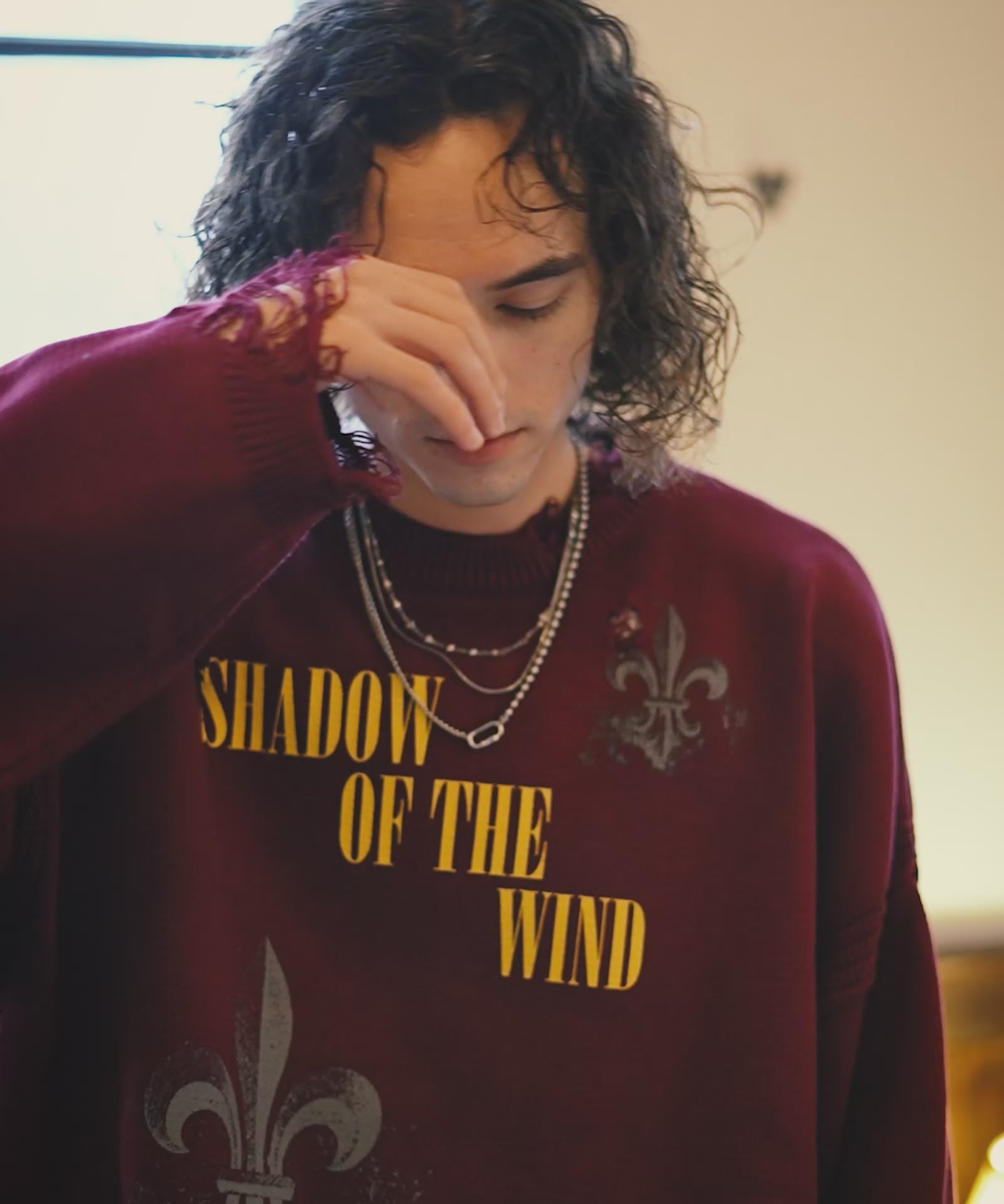 This season, with the theme of "Shadow of the Wind," the world's light and shadow are depicted in the wardrobe, and Sacred Damage Knit incorporates a design with a gap in pullover knit. The body pattern is classic with a lily emblem, but the key points are hard distressed. The coat of arms itself is also faded to create a mixture of aristocratic motifs and street style. The material used is 100% cotton twin yarn. The body is jersey knit, the neck, cuffs, and hem are rib knit, and the armholes are single ridge knit, making the texture changes unique to knits appealing.