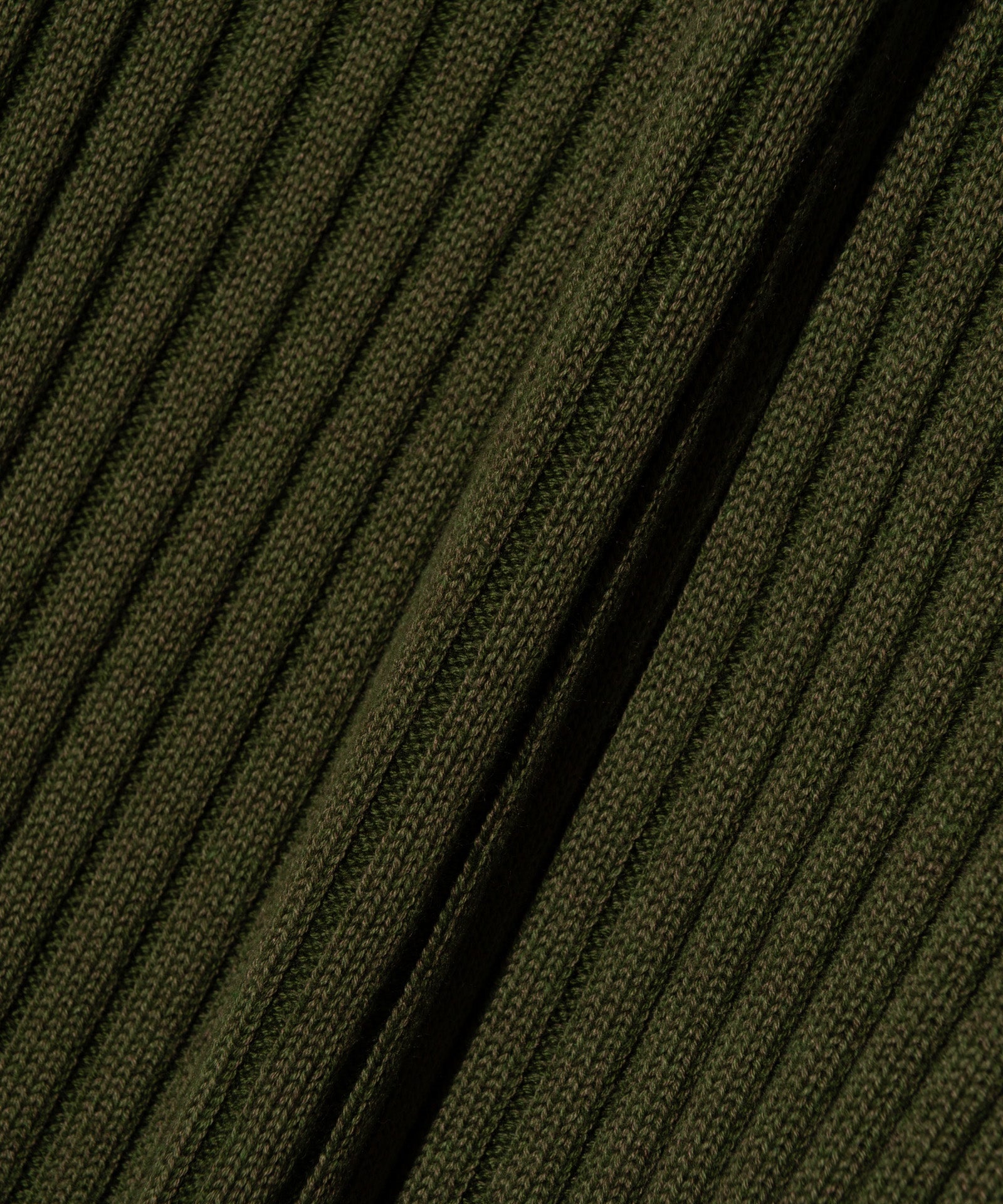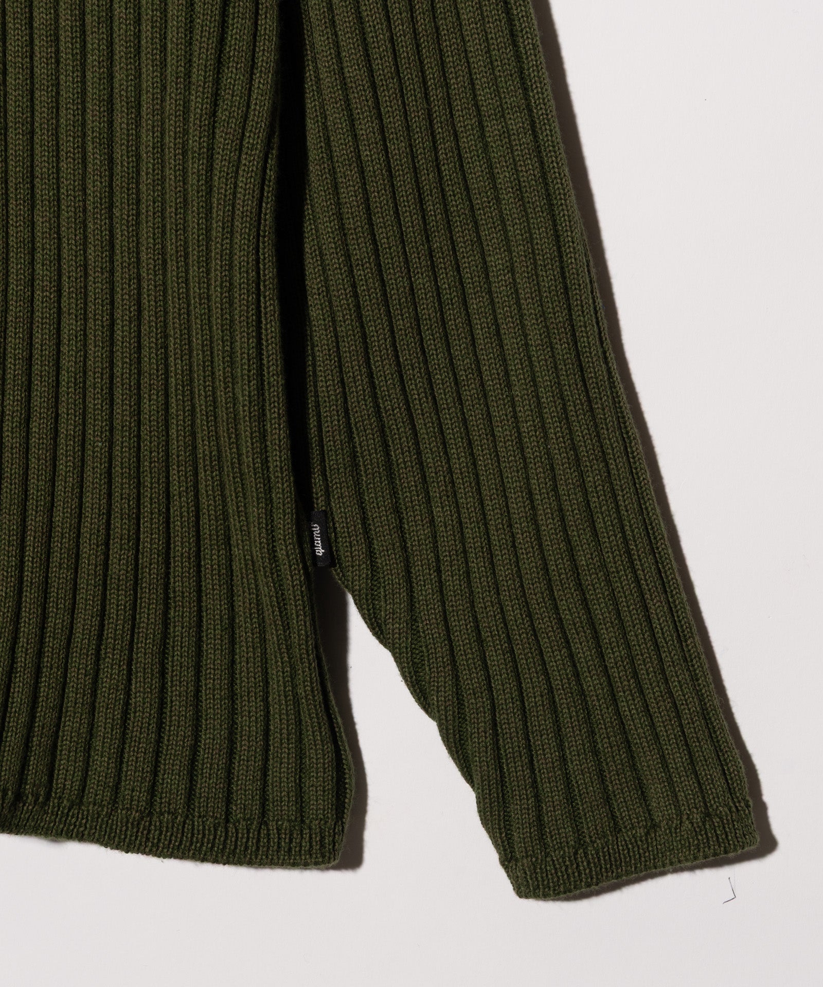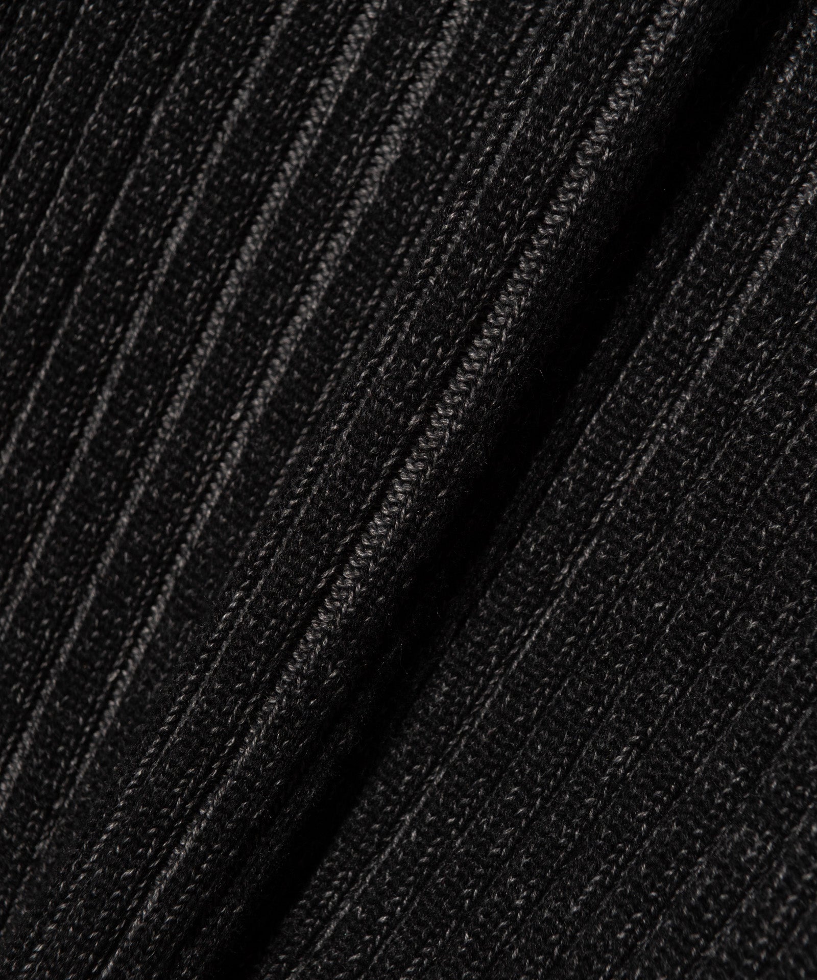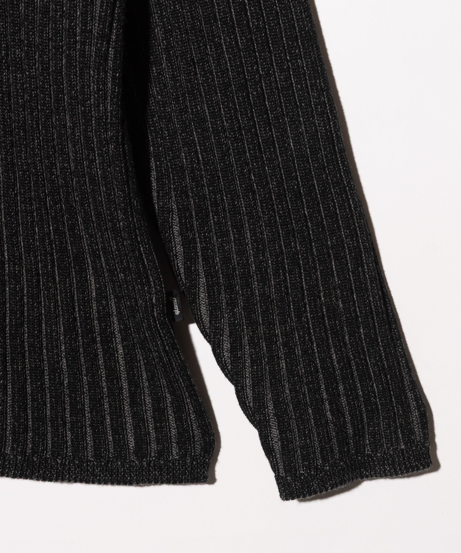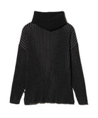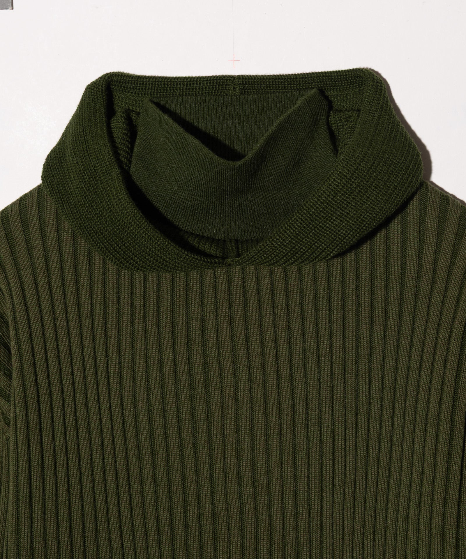 Stripe Rib Knit Hoodie proposes a brand new pullover style using techniques unique to knitting. The body has a complex texture made of acrylic cotton thread knitted into double milled wide ribs. By knitting the two colored threads at the same time, each color is shown on the front and back. The neckline is decorated with a layered hood with ribbed knitting and a high neckline with ribbed knitting. The silhouette has a loose fit with a short length, suggesting a balance of styling that is typical of this season.