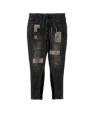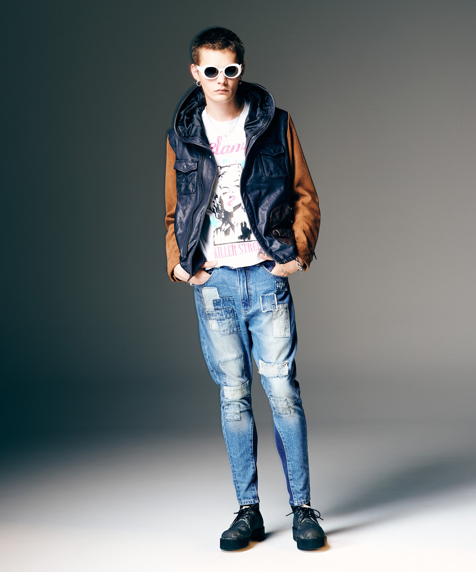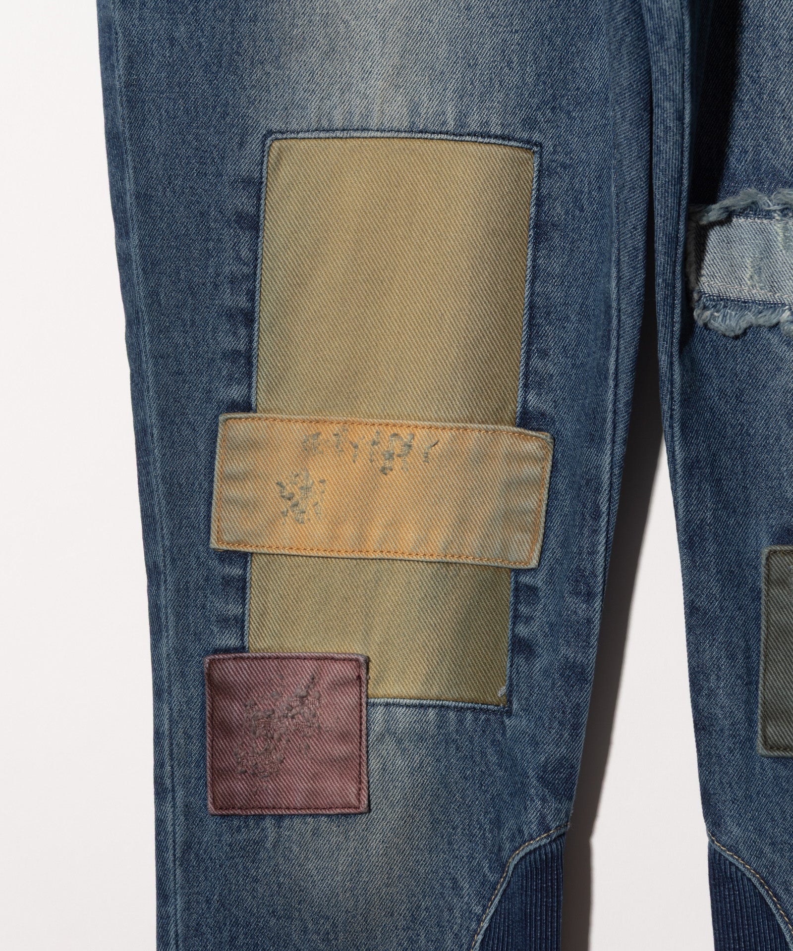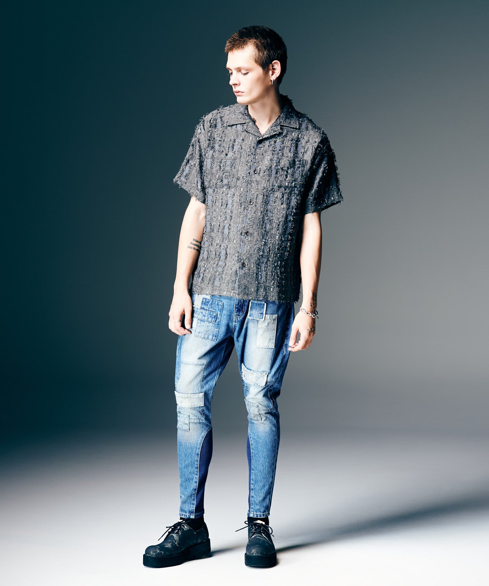ブランドを代表する2つのデニムクラフトを掛け合わせたマスターピース的な面持ちで登場するUnplugged Poly Denim。シルエットはゆとりある腰回りから裾にかけてスキニーライクに変化するPoly Pantsのサルエルテーパード。10年以上にわたってブランドのデニムラインで人気を博し続ける定番シルエットとなっています。そこにあしらわれたのは重層的なパッチワークデザインとなる"Unplugged"。 身生地の表裏双方から当て布を施した三層のボディを縫製した後、職人が手作業によってヒゲやハチノス、アタリの削りを加えた後に洗いをかけることで迫真の表情を生み出しました。カラーバリエーションはベーシックなBlackとIndigoに加え、配色の当て布が縫い付けられたMultiの3色をラインナップ。集大成の存在感を持った仕上がりは初見の方のみならず、Poly DenimやUnplugged Denimをすでにお持ちの方にも新たな魅力を感じていただけるでしょう。