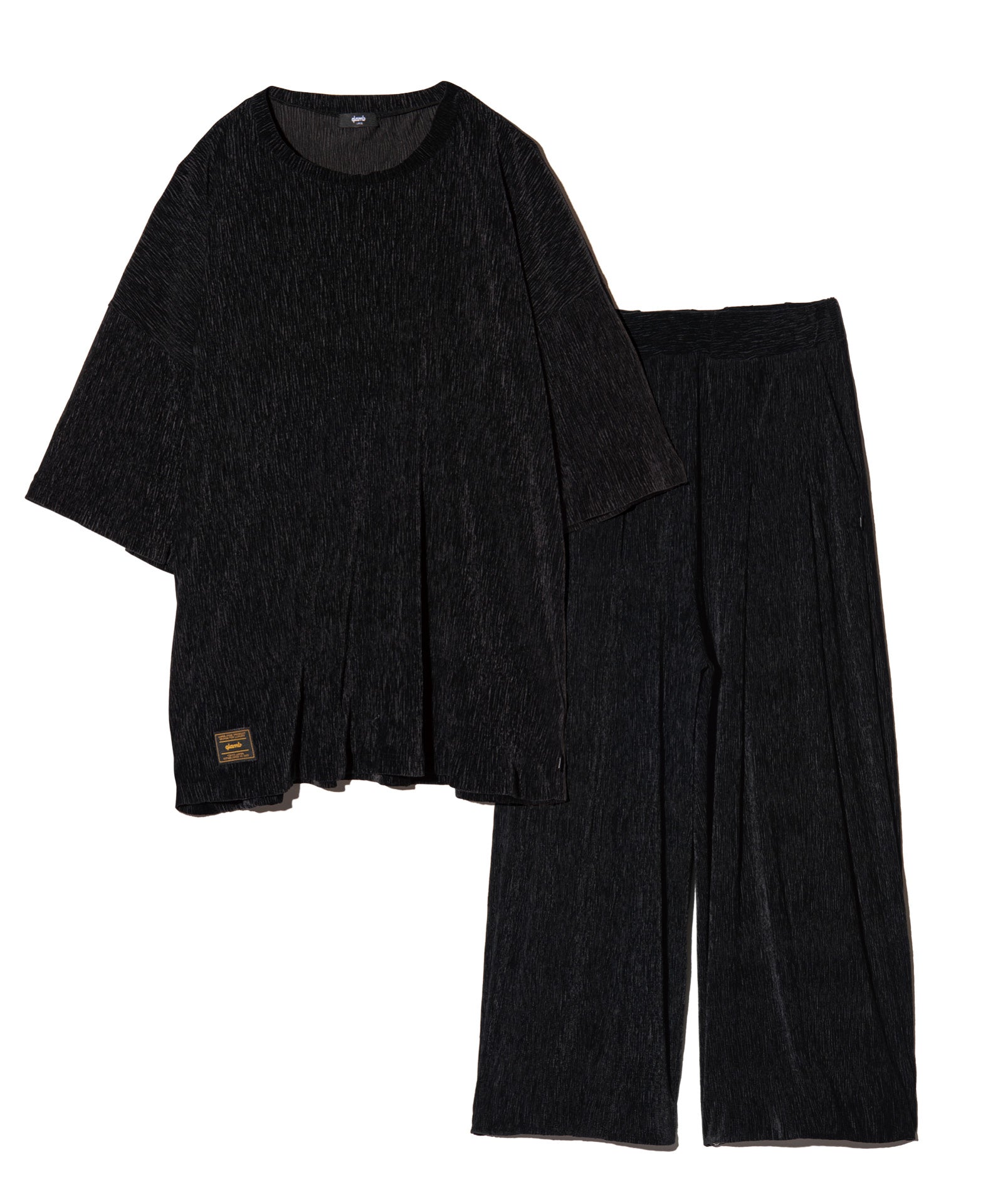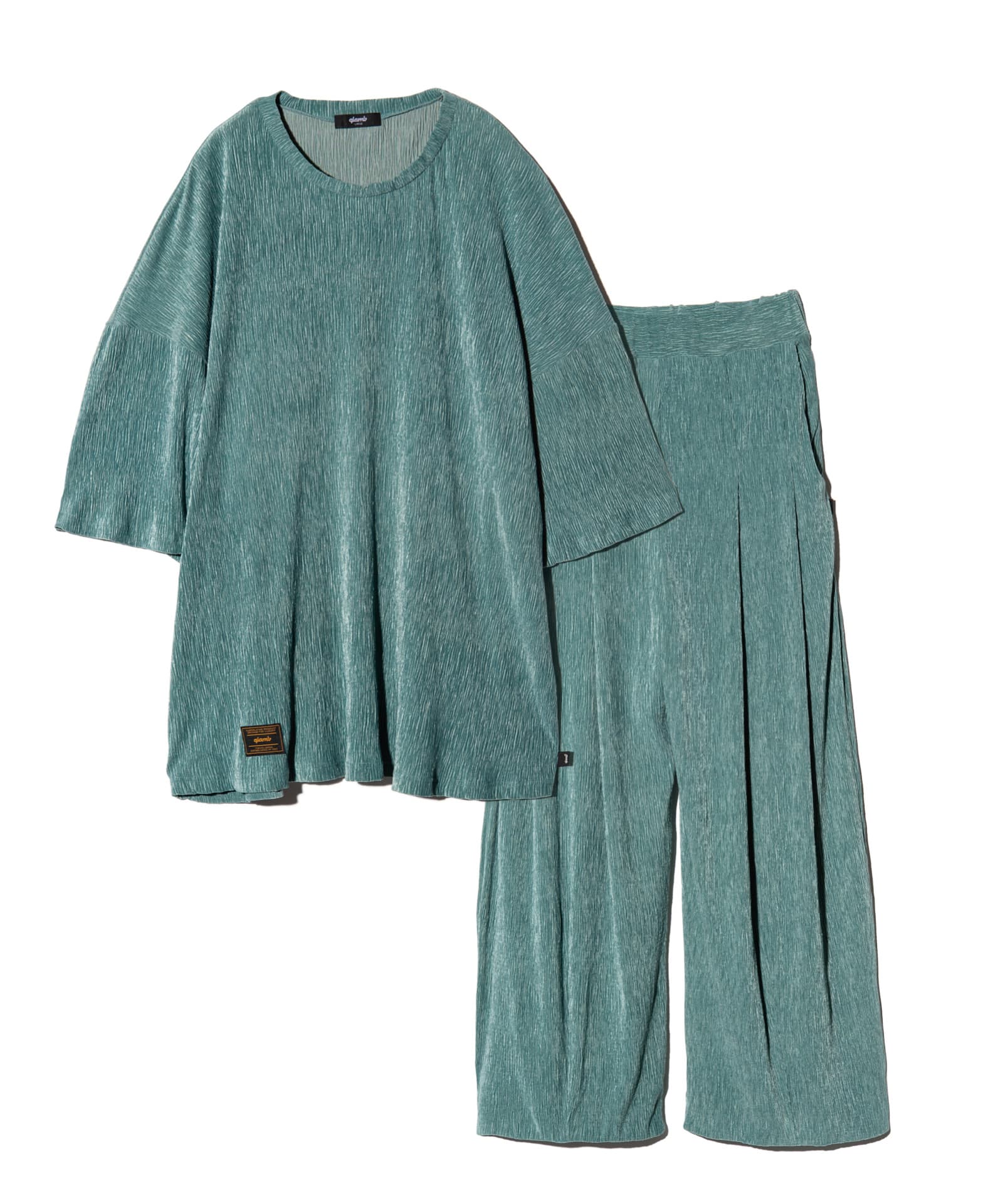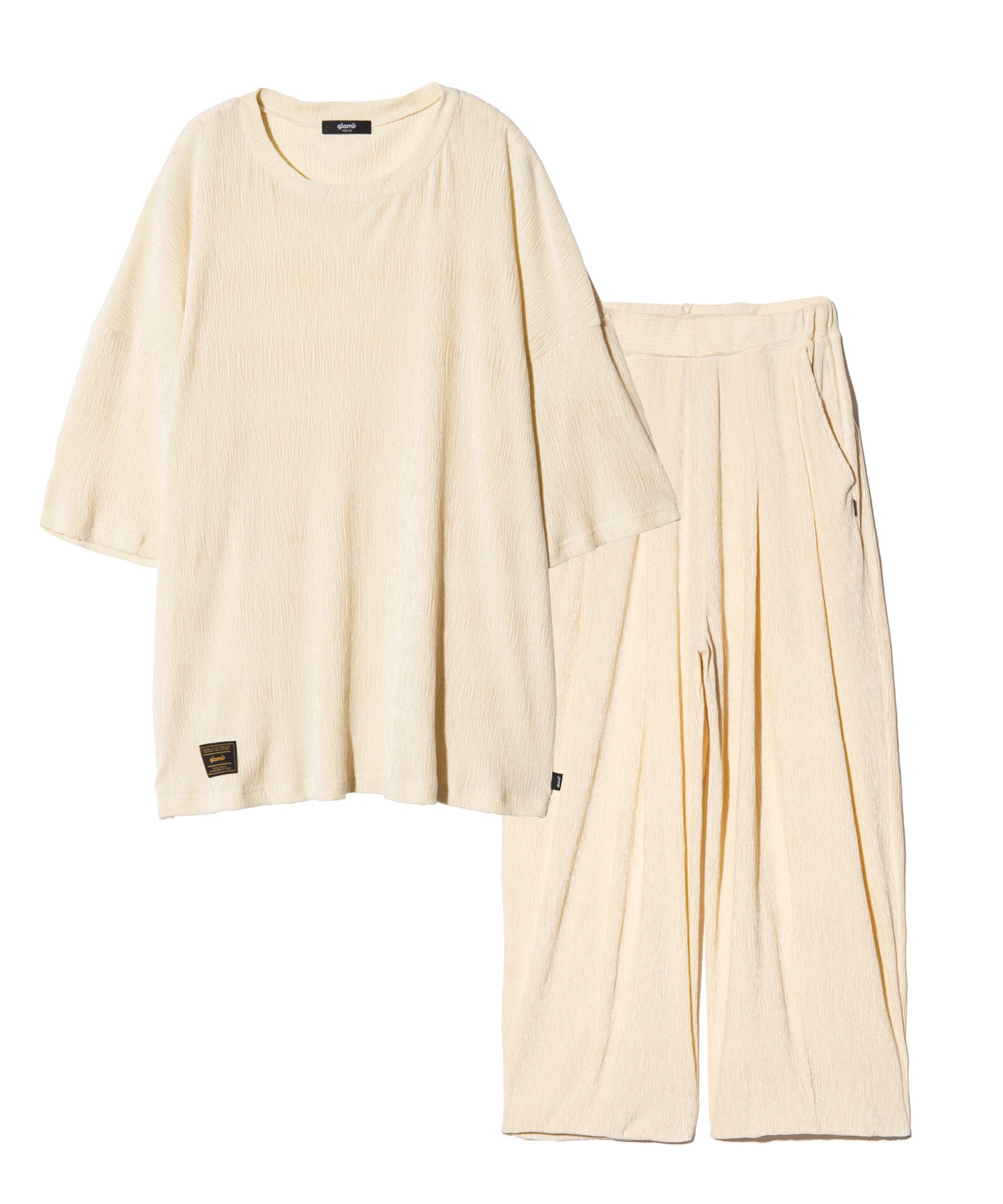 Glamour Crepe T-Shirt Set Up offers elegant summer look with luxurious textiles. The textile shows off the elegant vertical ridges, and features a soft texture and glossy shading created by the unevenness of the fabric. The fabric is finished using a careful method of picking each of the ridges, applying heat, and then tightening the convexities to fix them by shrinking the fabric. The body has a loose fitting with an oversized body width combined with drop shoulders. The bottoms are accented with two tucks at the waist, not under the typical belt, but with details placed on the thighs. The waist is compact and creates a unique buggy silhouette that gives the thighs roomy.