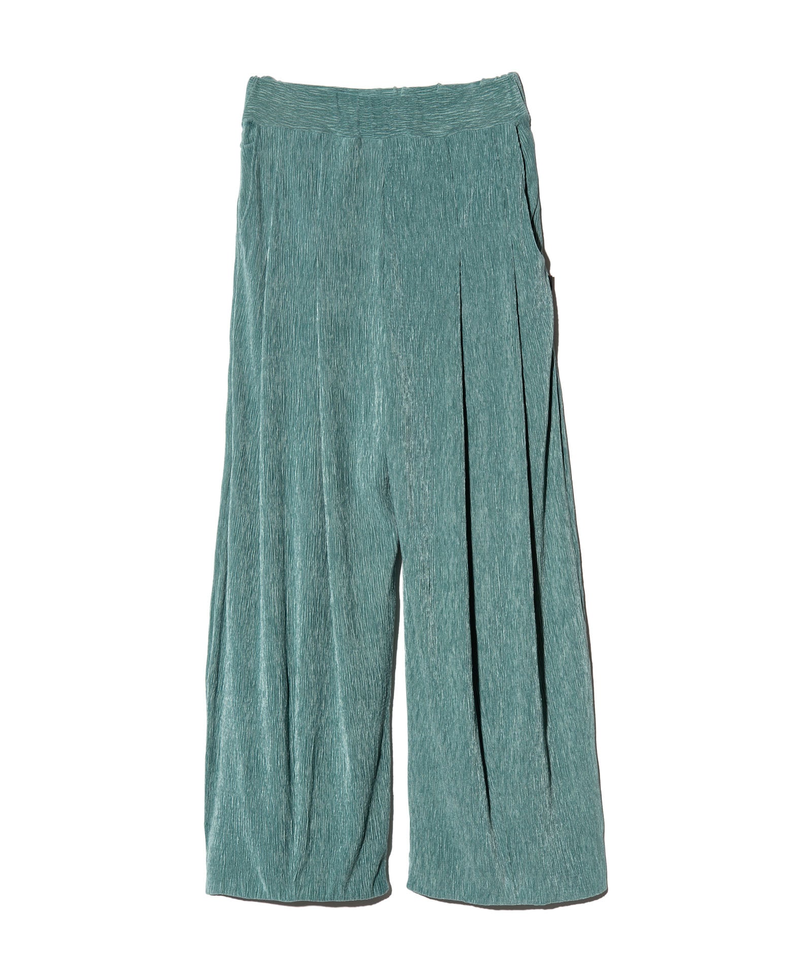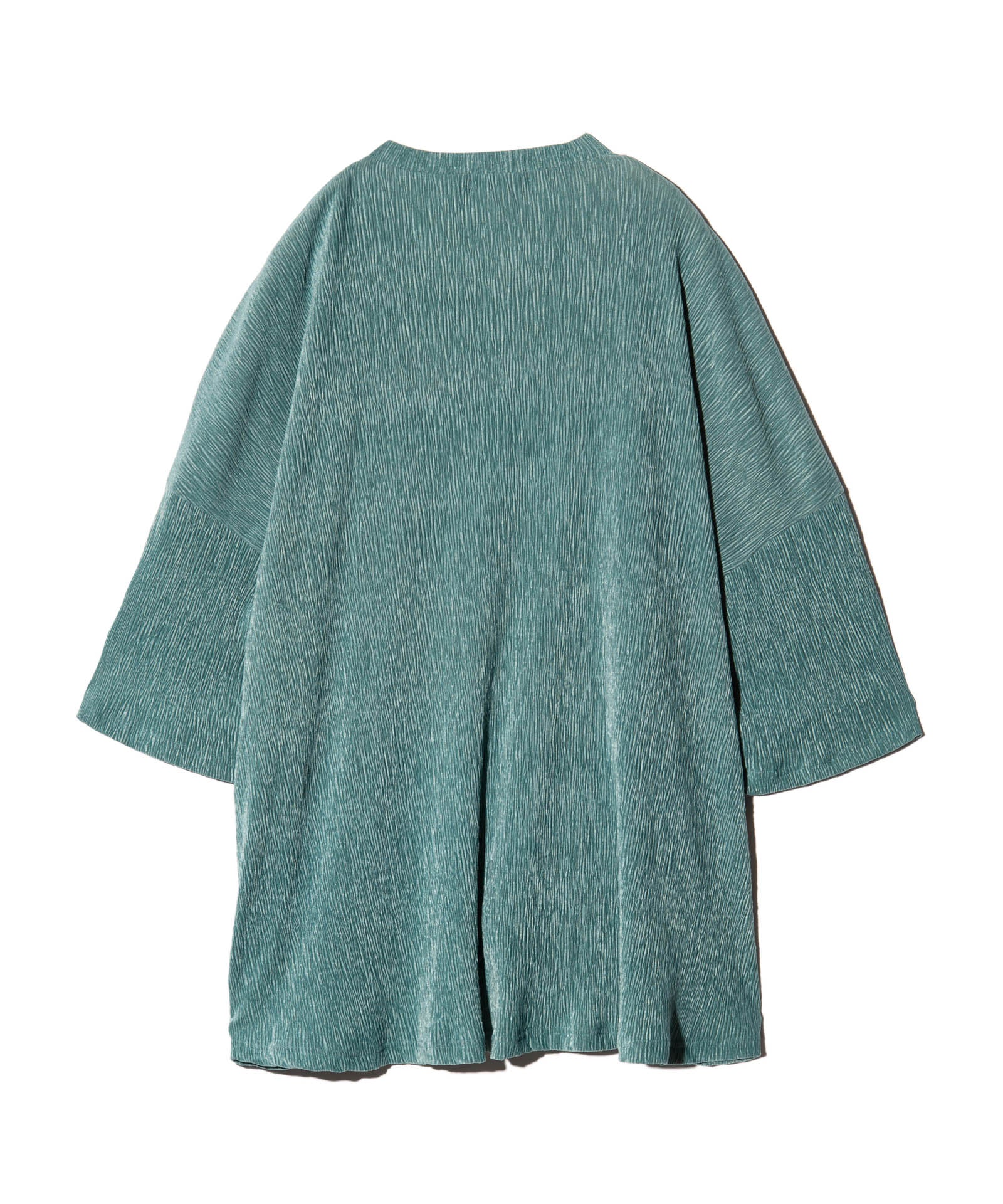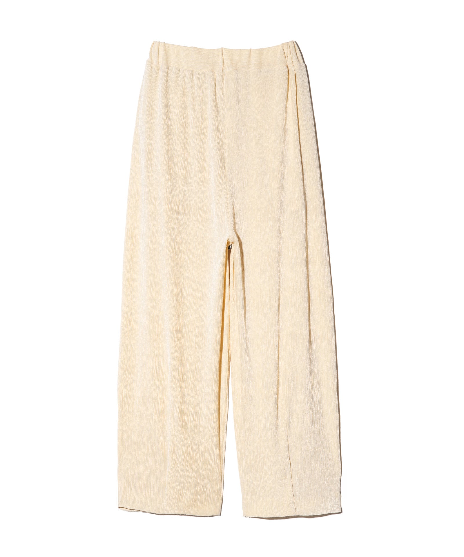Glamour Crepe T-Shirt Set Up offers elegant summer look with luxurious textiles. The textile shows off the elegant vertical ridges, and features a soft texture and glossy shading created by the unevenness of the fabric. The fabric is finished using a careful method of picking each of the ridges, applying heat, and then tightening the convexities to fix them by shrinking the fabric. The body has a loose fitting with an oversized body width combined with drop shoulders. The bottoms are accented with two tucks at the waist, not under the typical belt, but with details placed on the thighs. The waist is compact and creates a unique buggy silhouette that gives the thighs roomy.