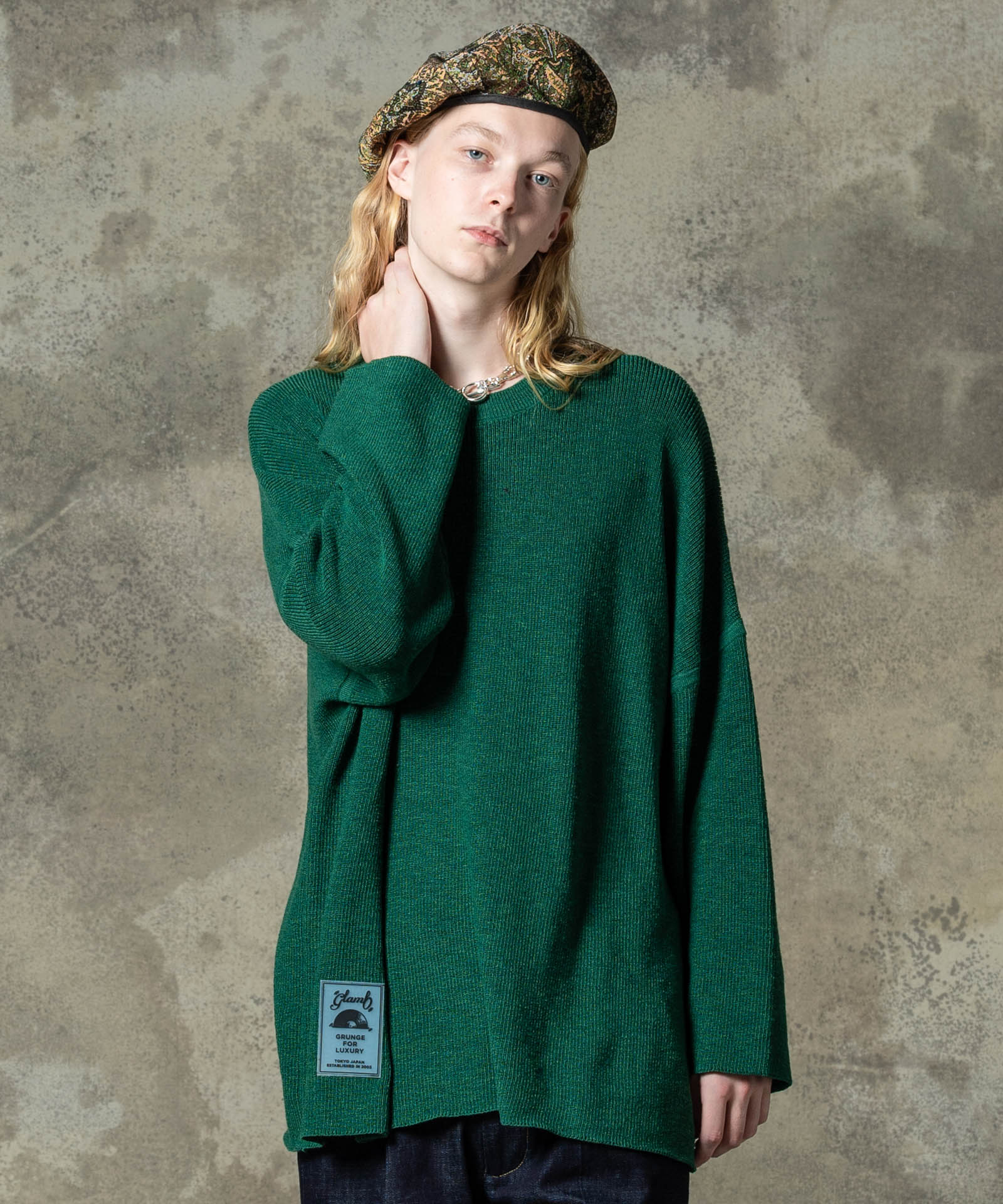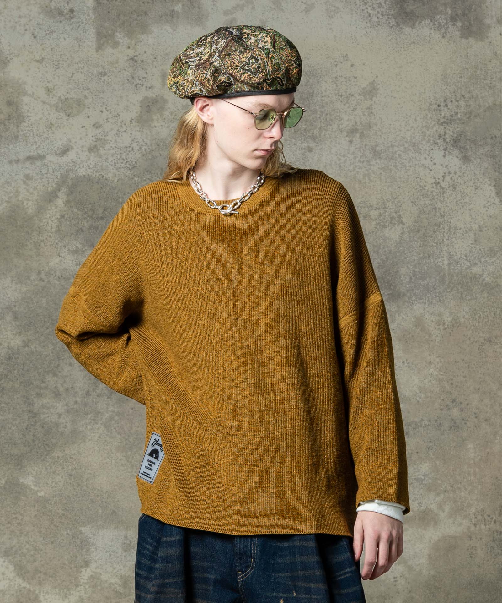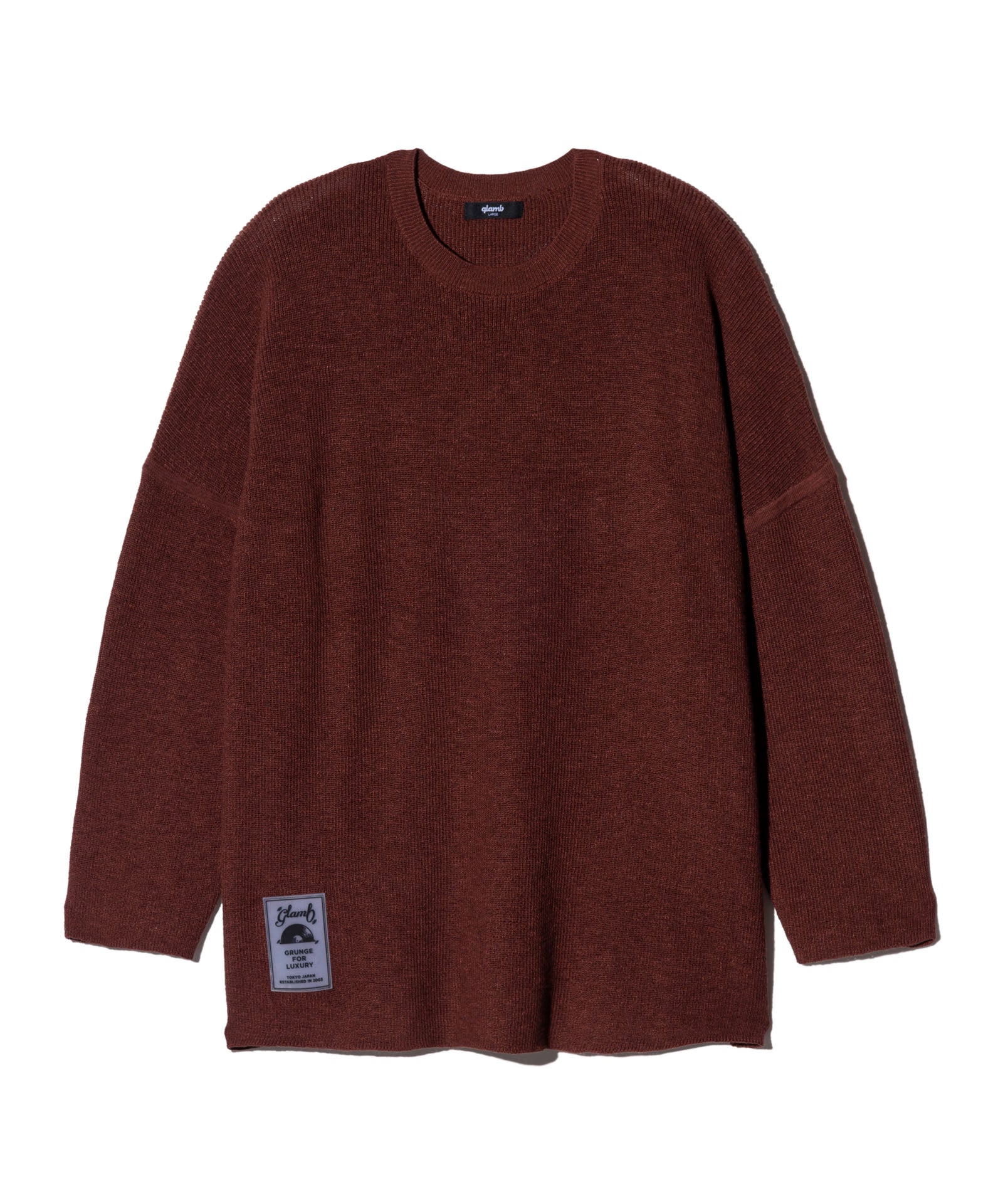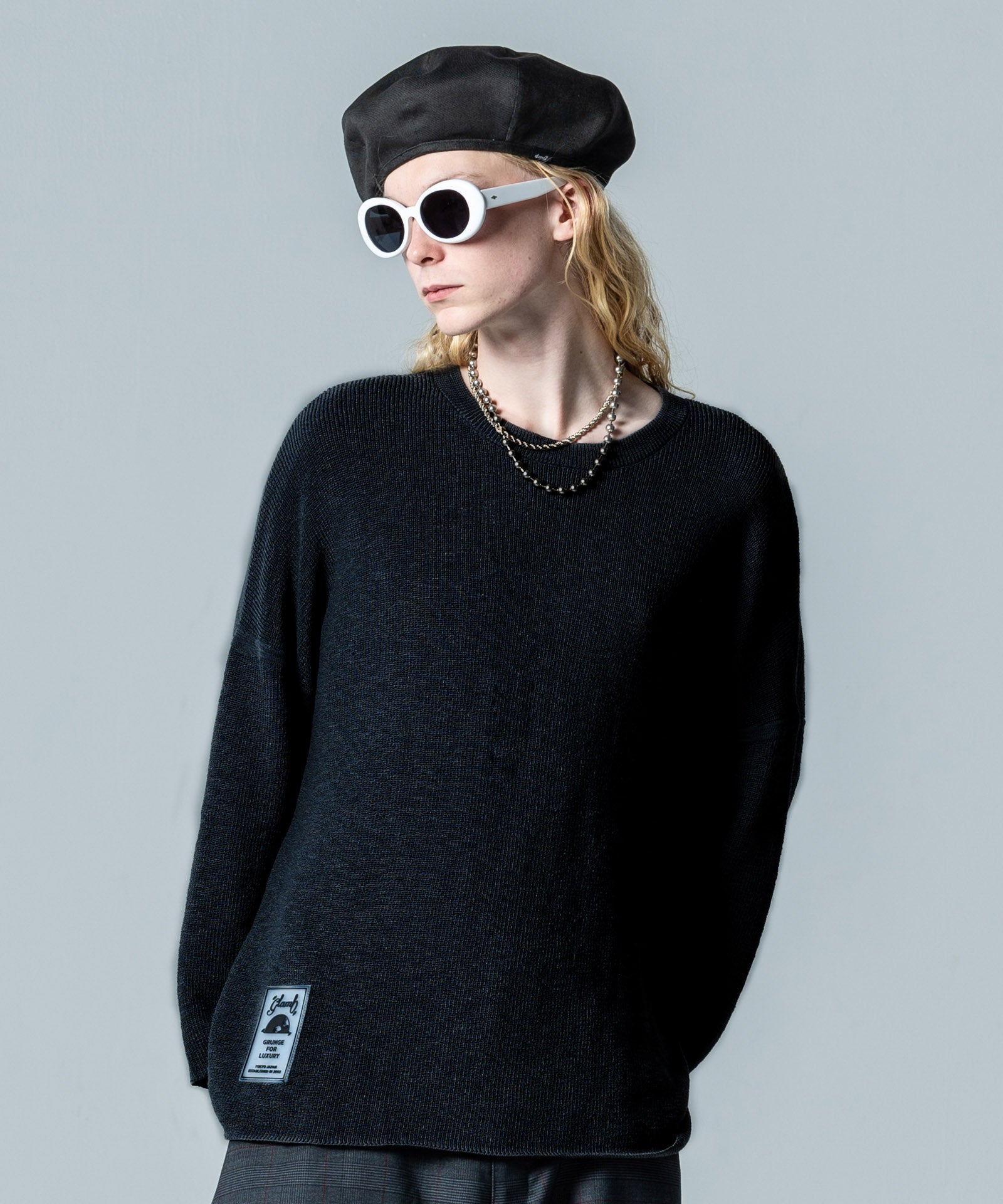 Rubber Tag Knit pursues the standard for daily knits. The knitted fabric may look plain at first glance, but it features a deep texture with unevenness added by knitting slab yarn on one side. The shoulder line is added with linking, highlighting the loose pattern of the drop shoulder. A rubber tag made from clear material adds a more contemporary nuance to its minimal look. Each detail and an oversized silhouette combine to create an intelligent, urban style.