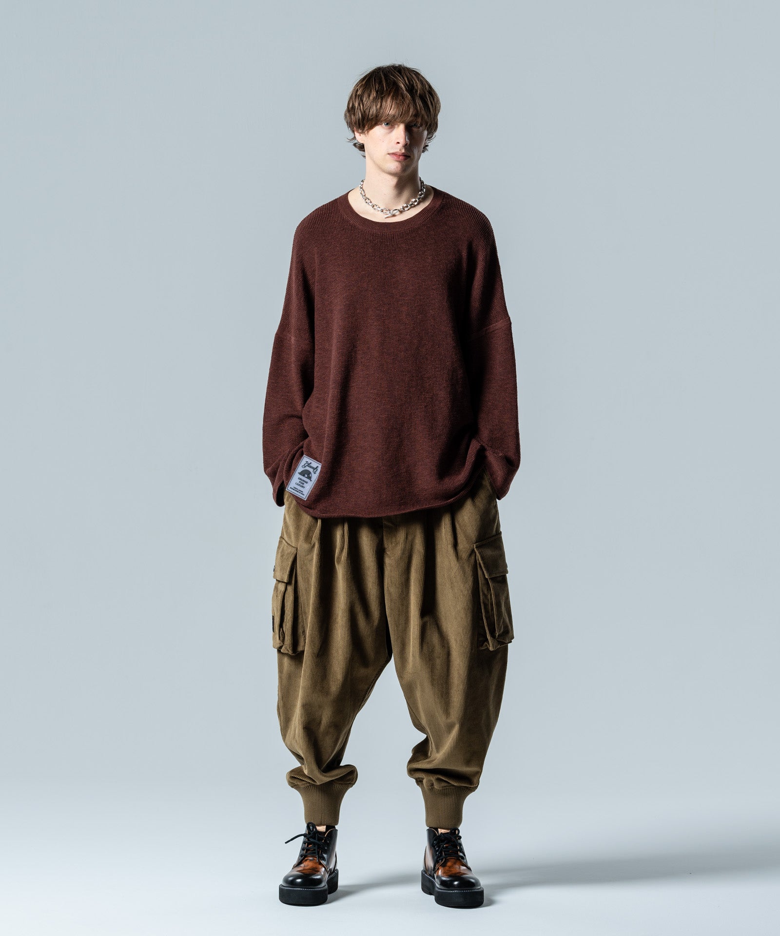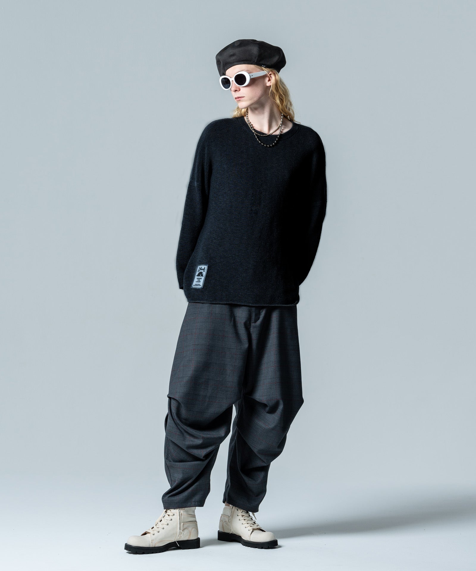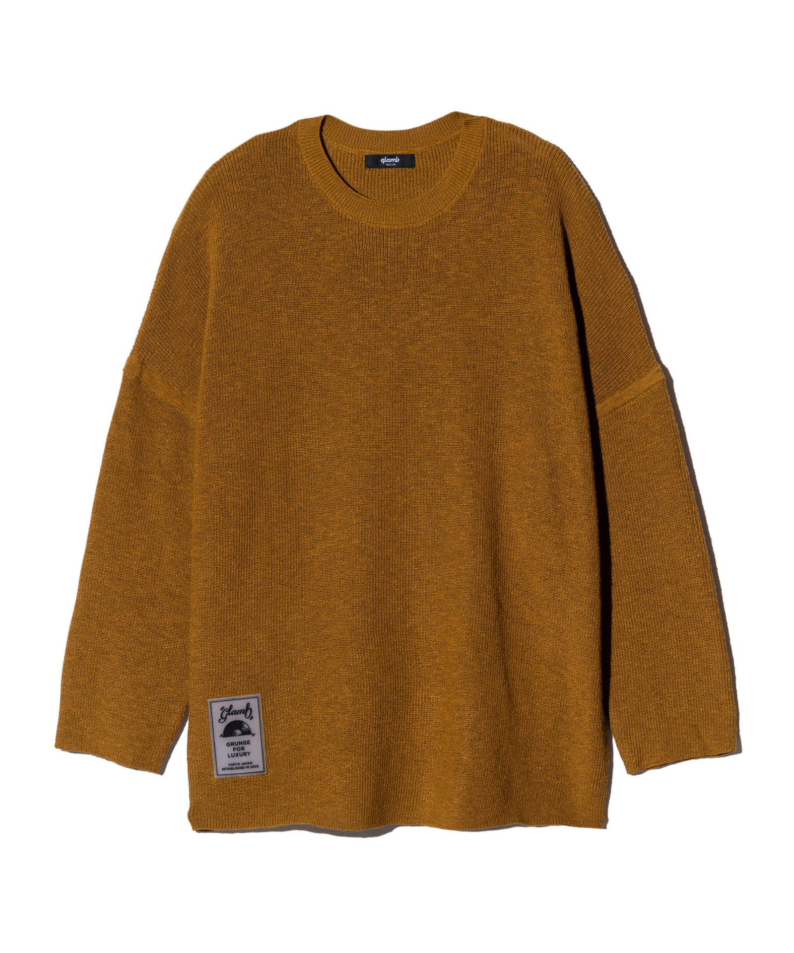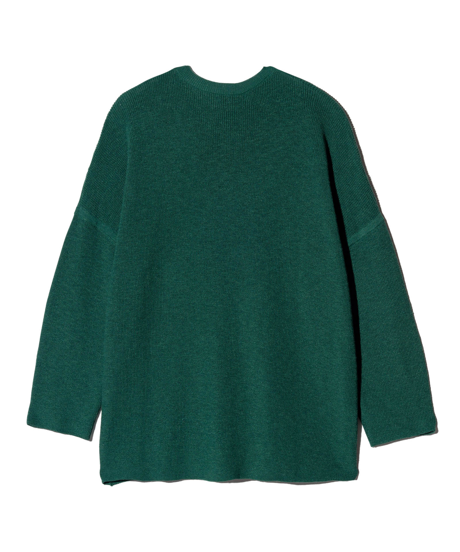 Rubber Tag Knit pursues the standard for daily knits. The knitted fabric may look plain at first glance, but it features a deep texture with unevenness added by knitting slab yarn on one side. The shoulder line is added with linking, highlighting the loose pattern of the drop shoulder. A rubber tag made from clear material adds a more contemporary nuance to its minimal look. Each detail and an oversized silhouette combine to create an intelligent, urban style.