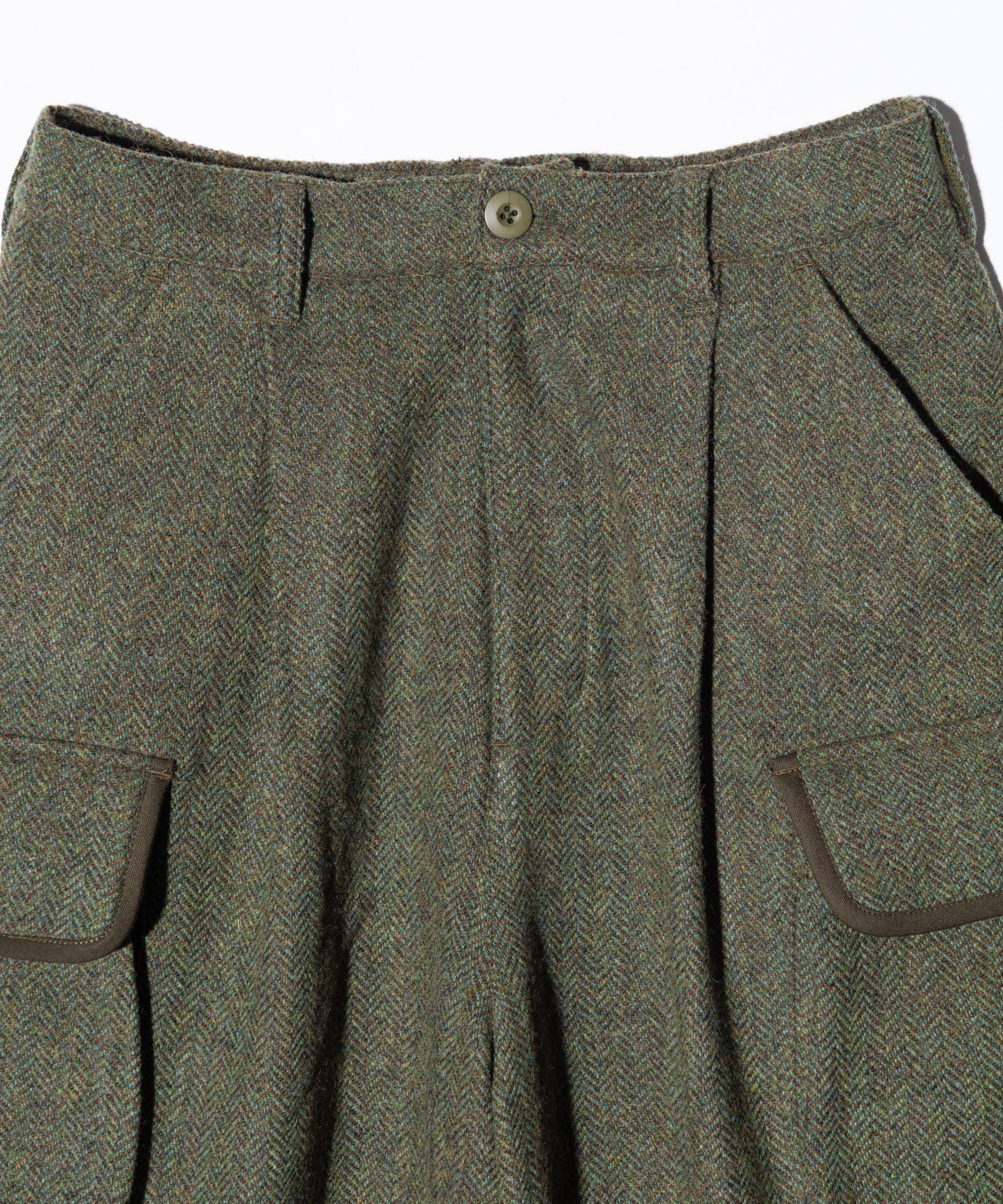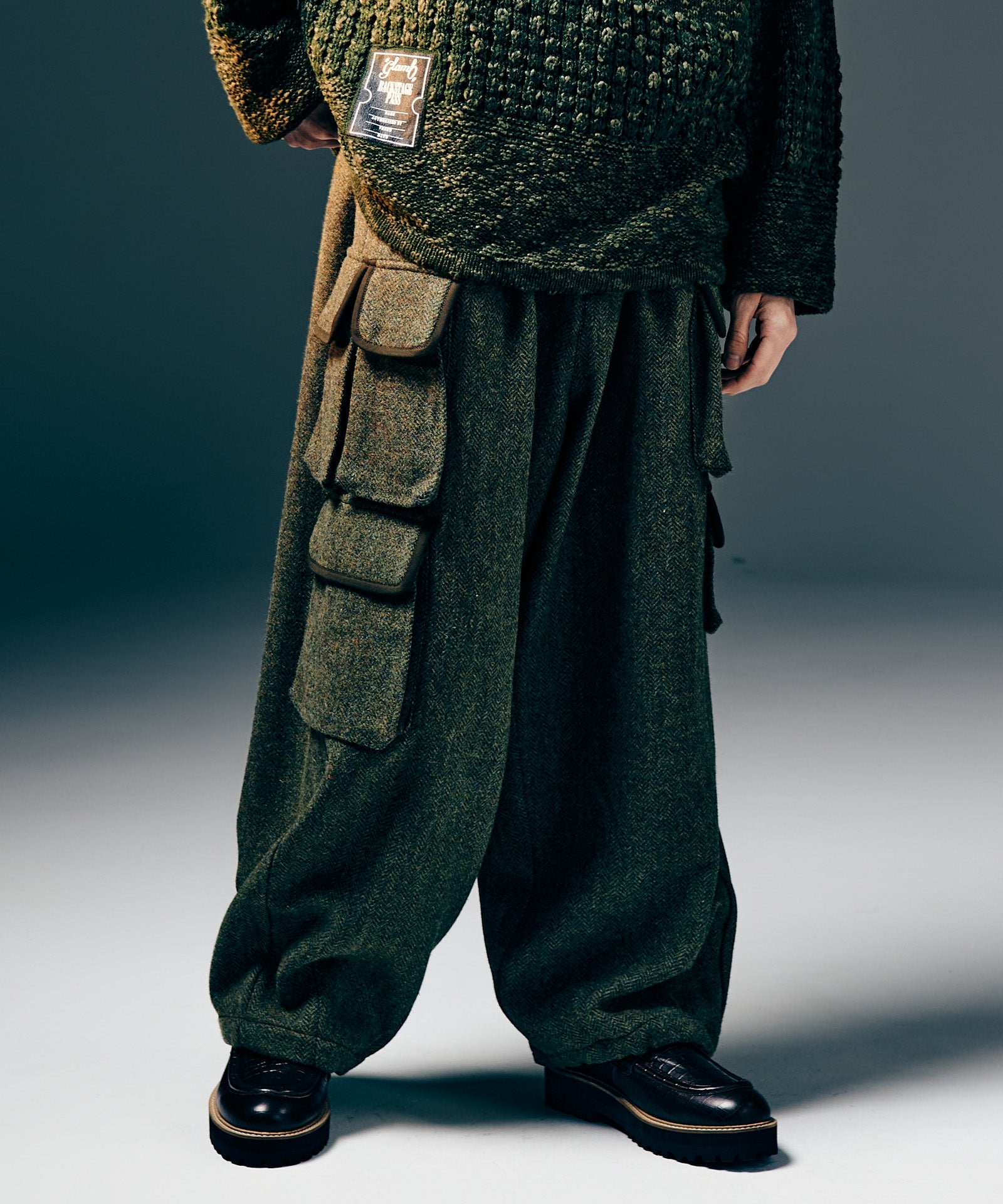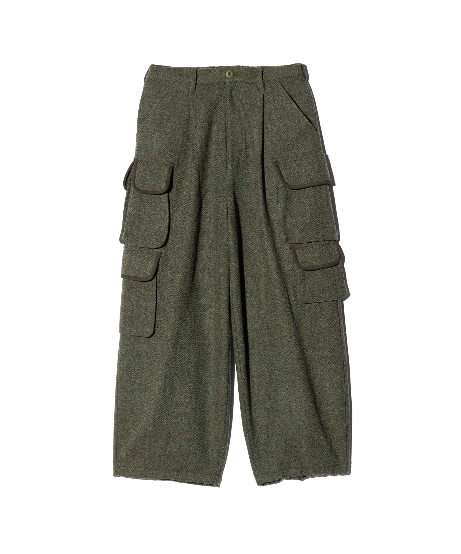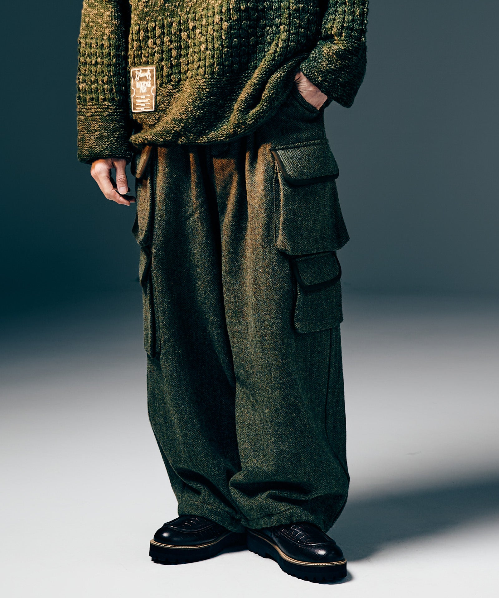 The Asymmetry Cargo Tweed Pants combine tweed users reminiscent of British traditional styles with military details to create a nostalgic yet new style of bottoms. The body has one tuck at the waist and darts at the hem, and has a wide silhouette with balloon-like volume below the knees. The asymmetrical cargo pockets accented with piping on the edges, creating an intellectual balance that doesn't tilt too hard to the rugged side. The hem is made of drawstring and the back waist is elastic, making it easy to wear. The lineup includes two colour variations: Khaki, herringbone, and Navy, dark tone.