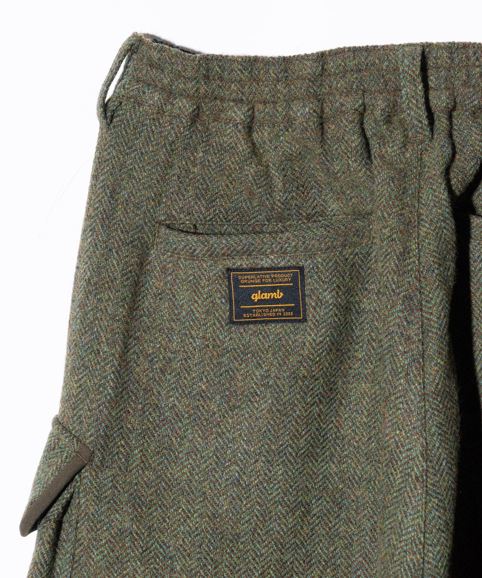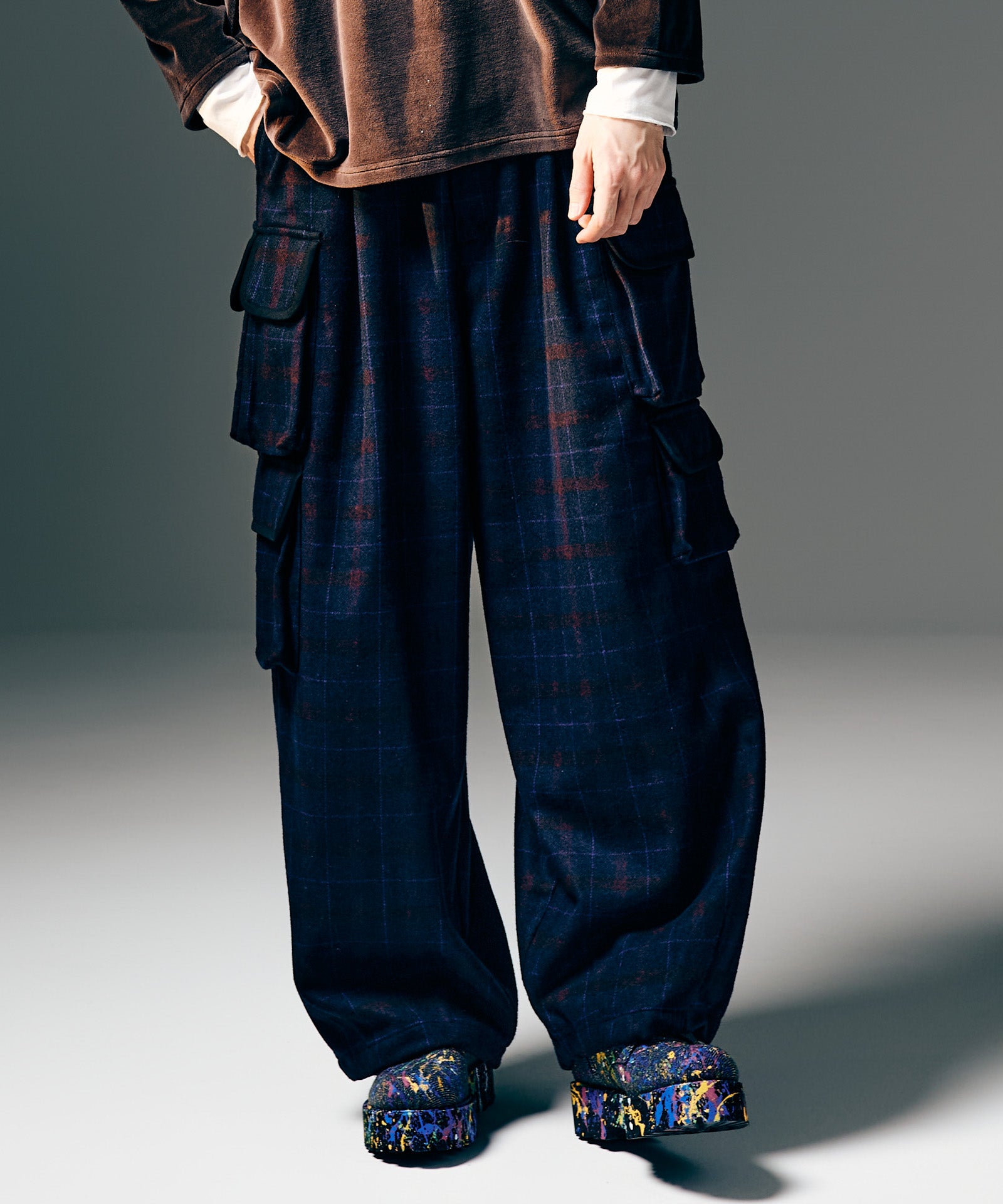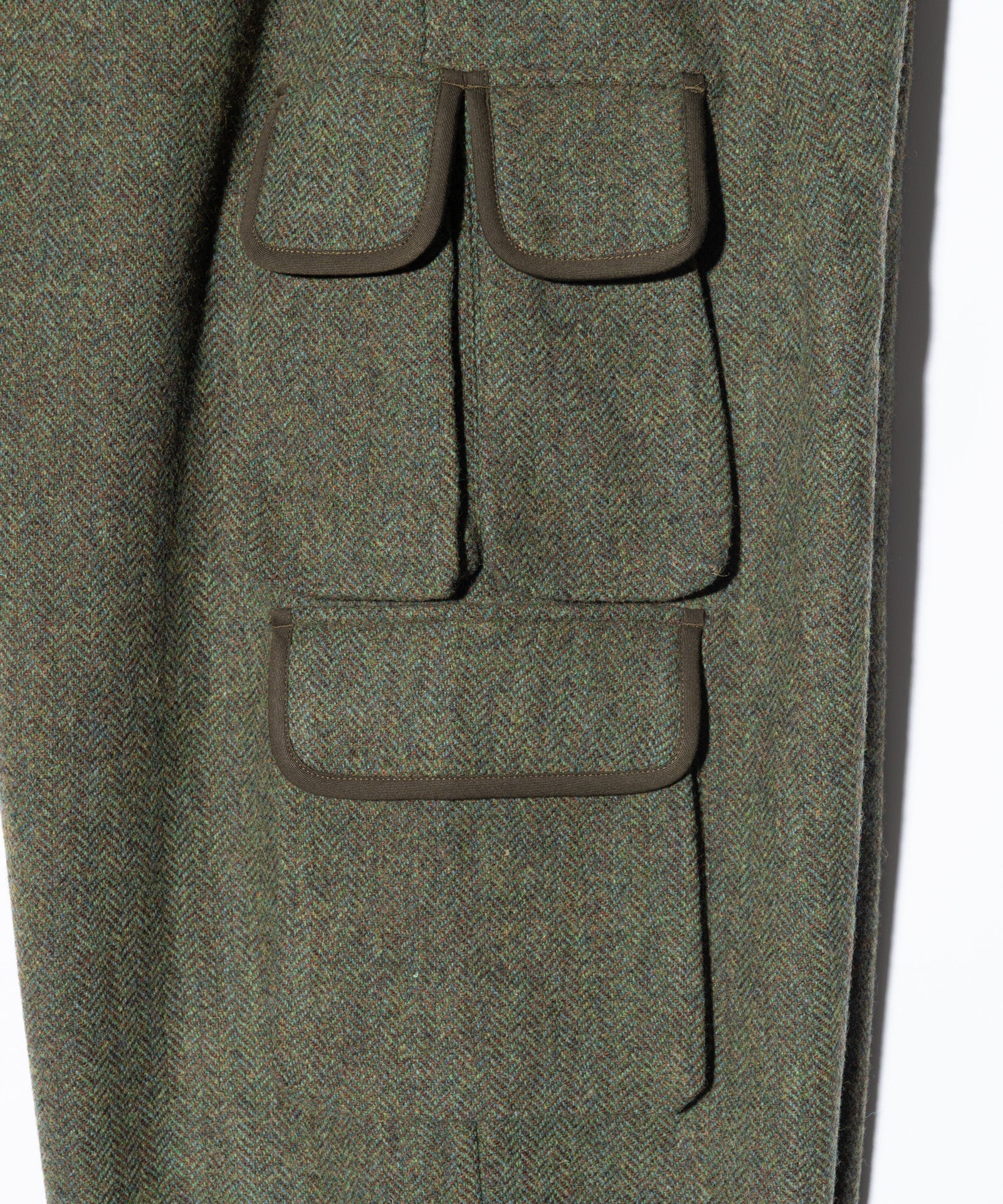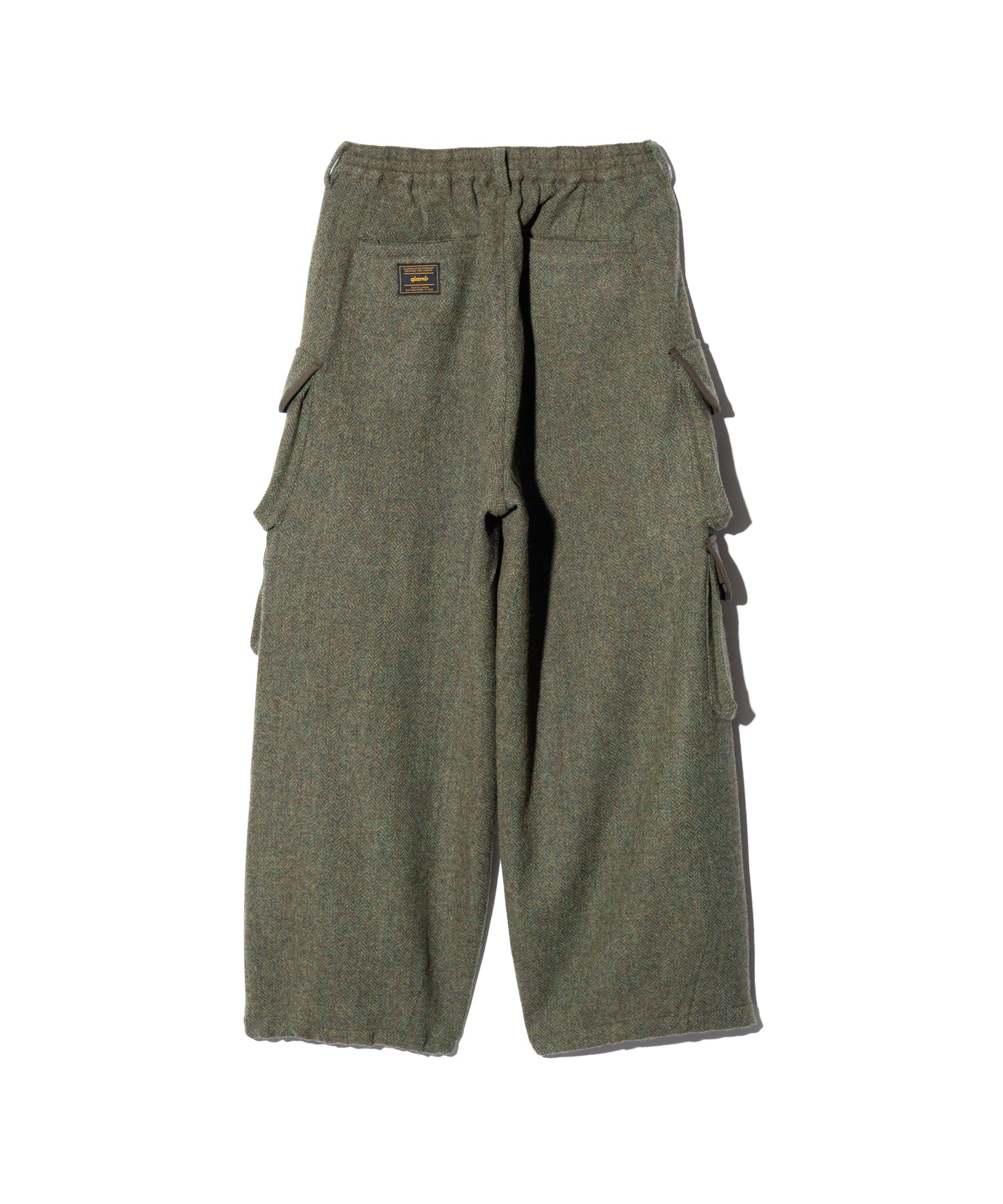 The Asymmetry Cargo Tweed Pants combine tweed users reminiscent of British traditional styles with military details to create a nostalgic yet new style of bottoms. The body has one tuck at the waist and darts at the hem, and has a wide silhouette with balloon-like volume below the knees. The asymmetrical cargo pockets accented with piping on the edges, creating an intellectual balance that doesn't tilt too hard to the rugged side. The hem is made of drawstring and the back waist is elastic, making it easy to wear. The lineup includes two colour variations: Khaki, herringbone, and Navy, dark tone.