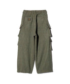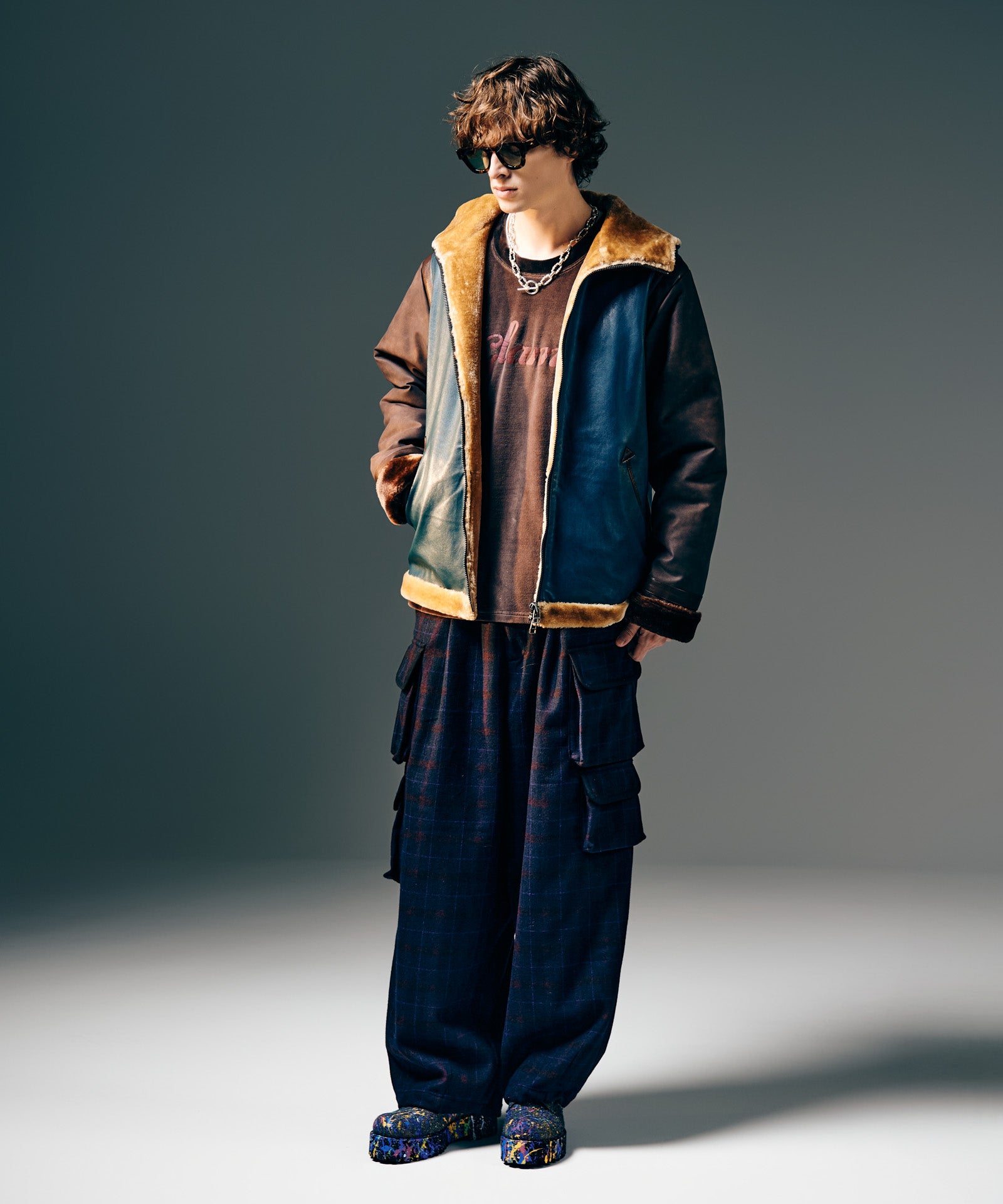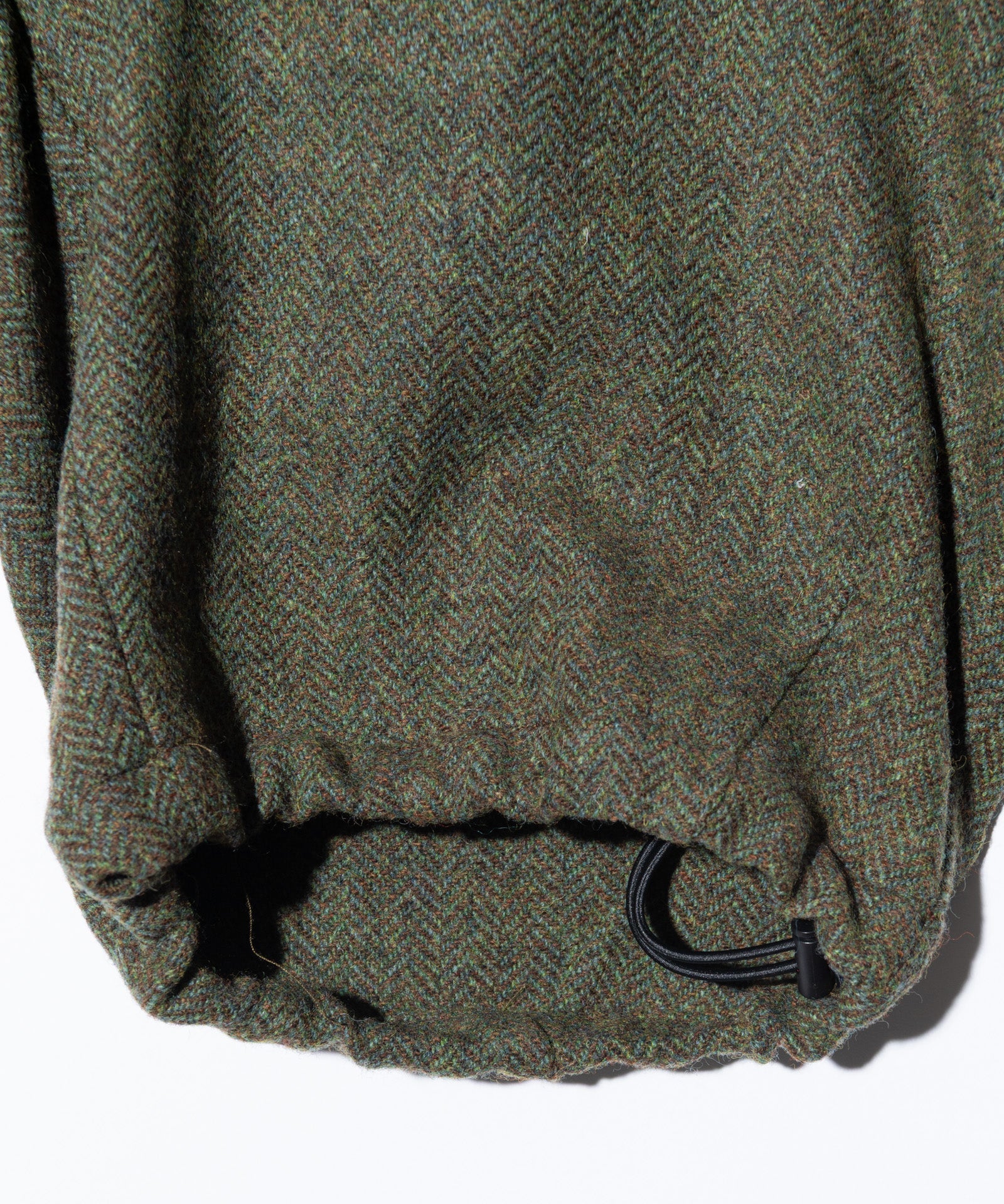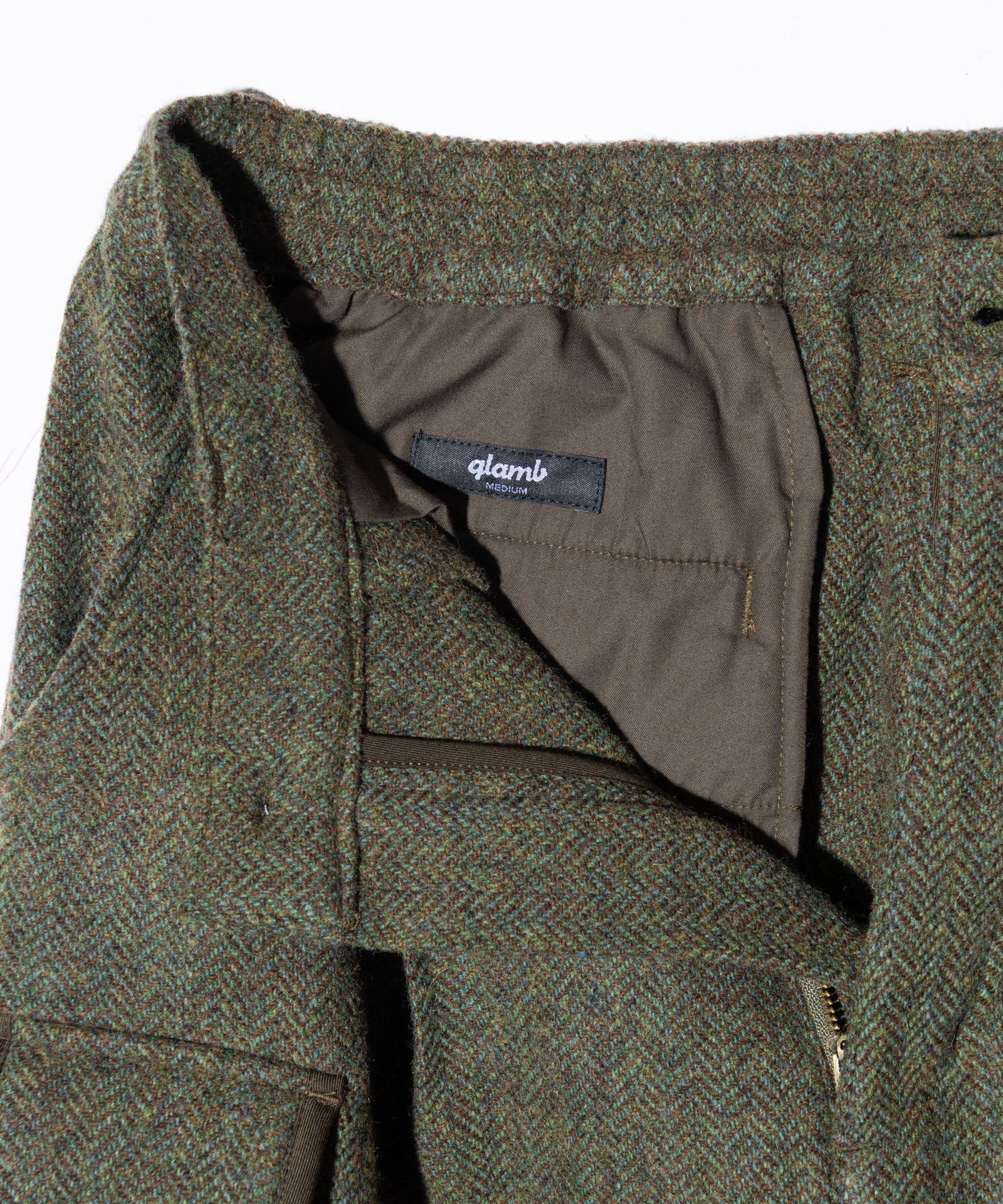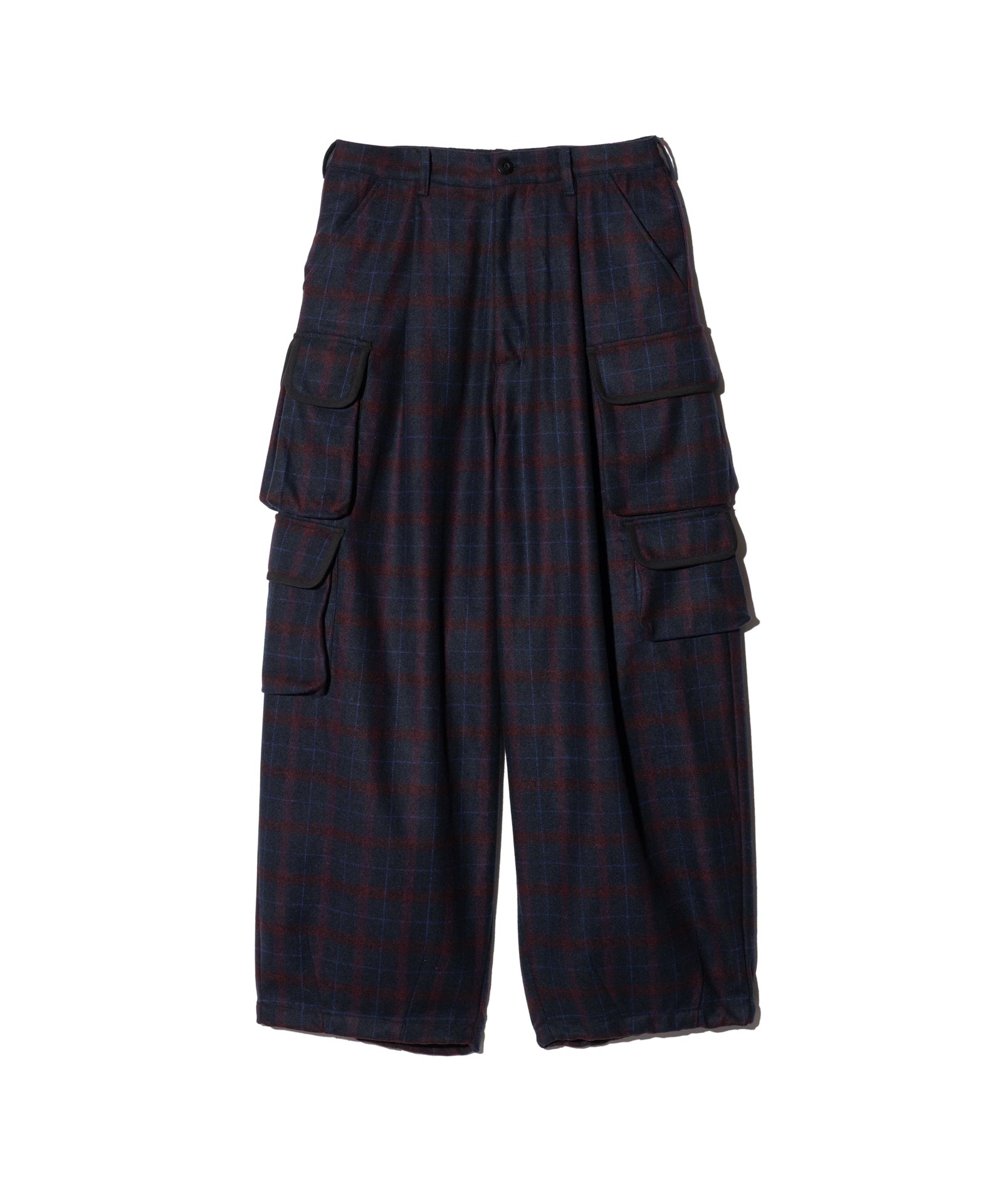 The Asymmetry Cargo Tweed Pants combine tweed users reminiscent of British traditional styles with military details to create a nostalgic yet new style of bottoms. The body has one tuck at the waist and darts at the hem, and has a wide silhouette with balloon-like volume below the knees. The asymmetrical cargo pockets accented with piping on the edges, creating an intellectual balance that doesn't tilt too hard to the rugged side. The hem is made of drawstring and the back waist is elastic, making it easy to wear. The lineup includes two colour variations: Khaki, herringbone, and Navy, dark tone.