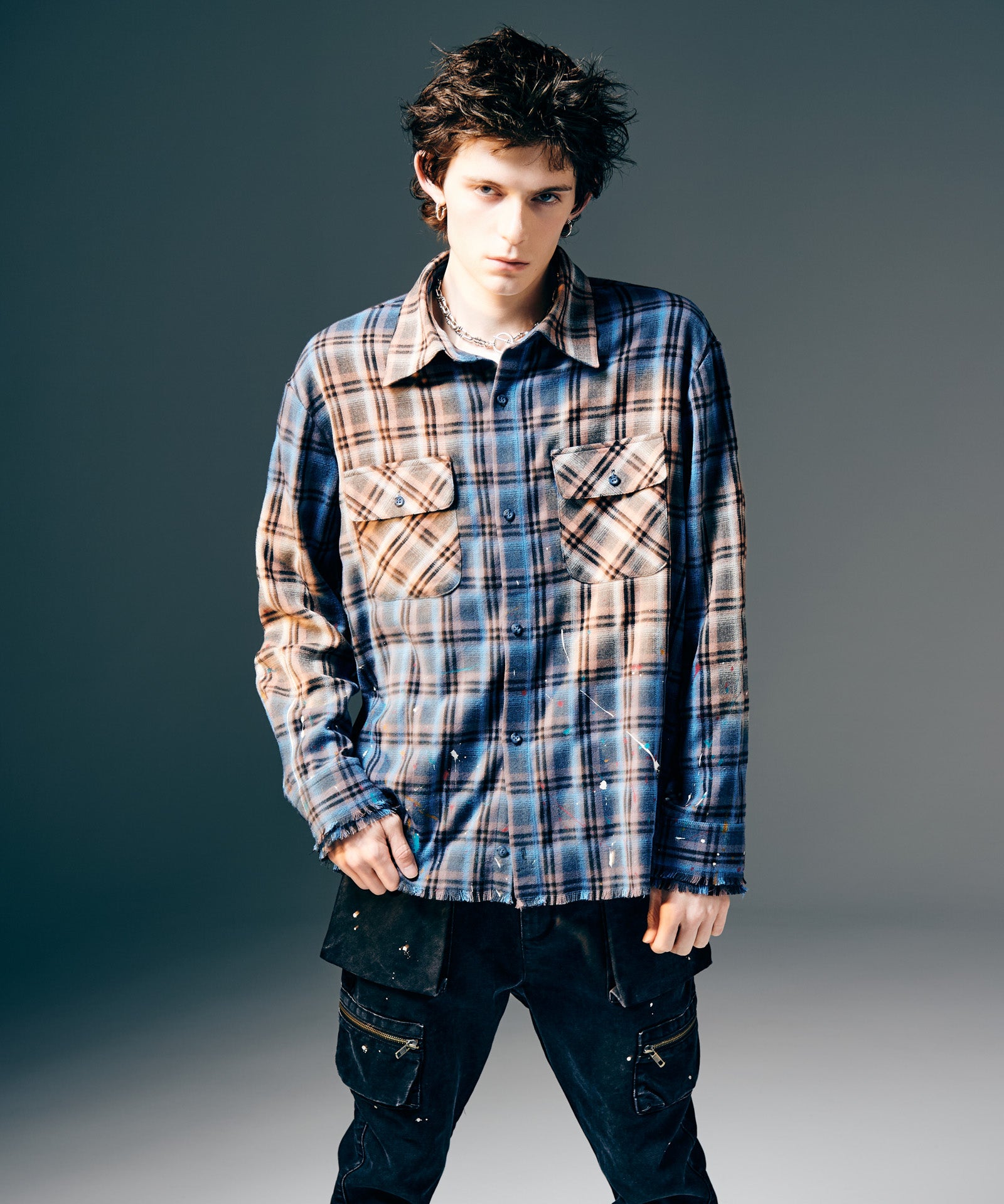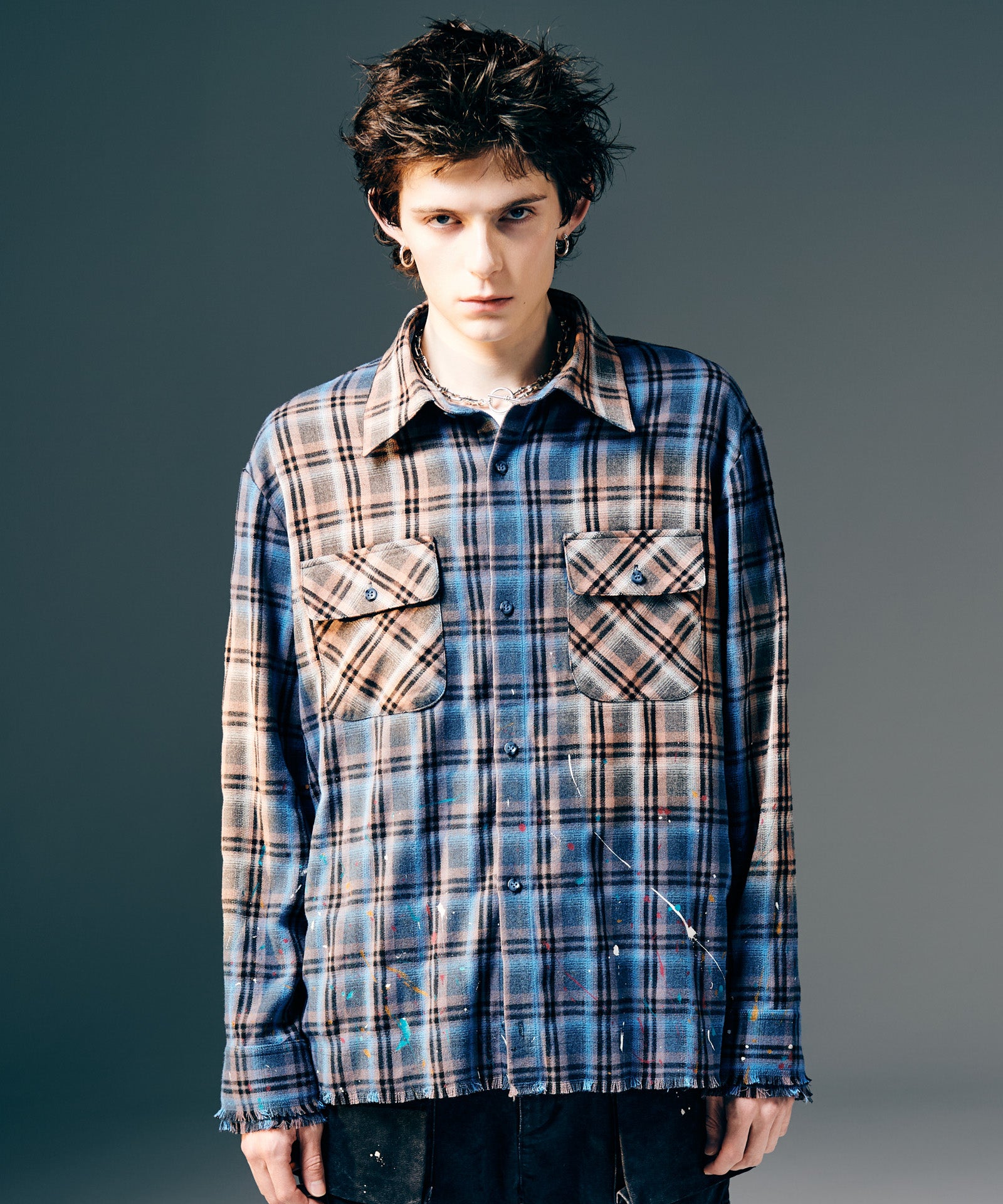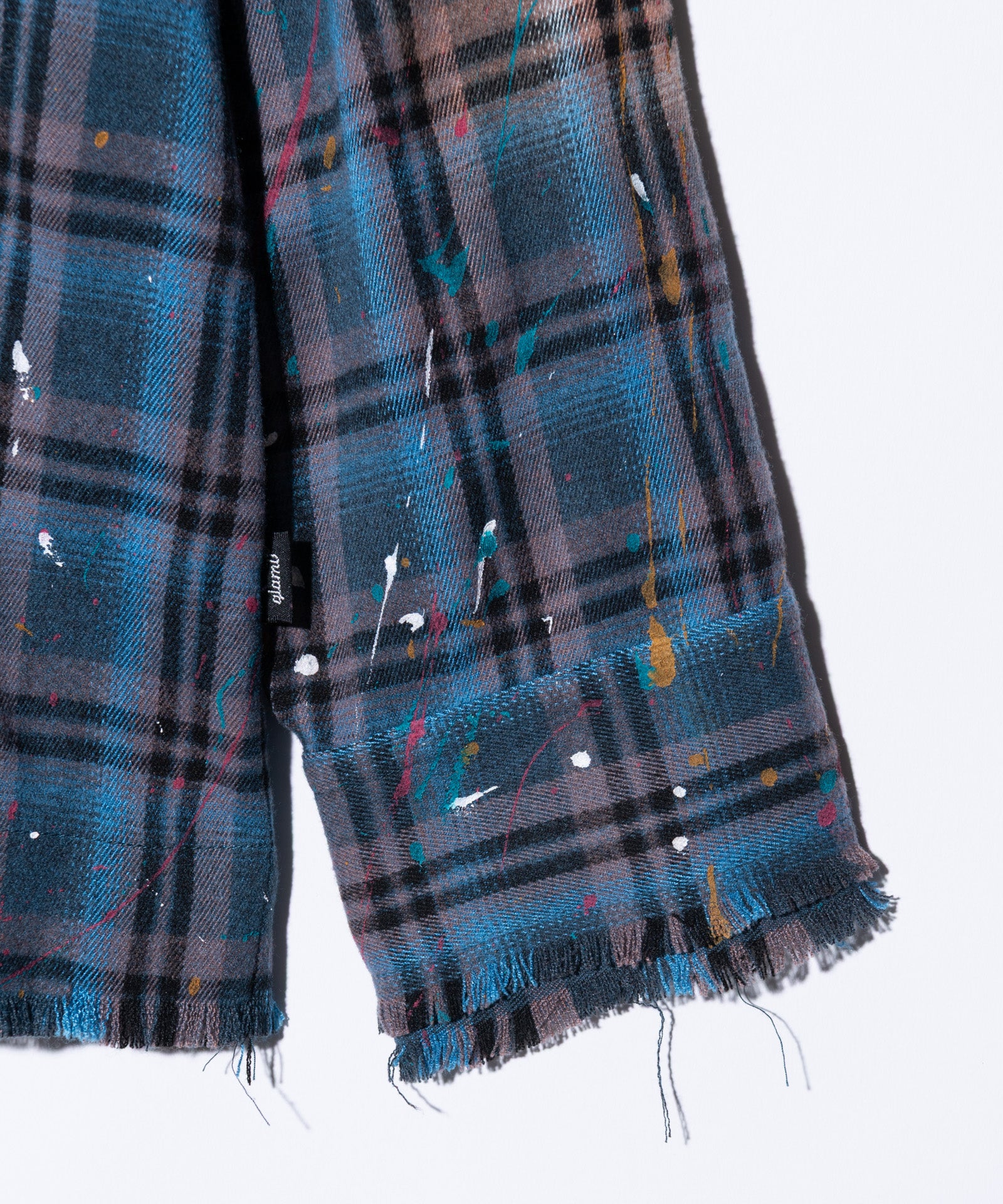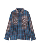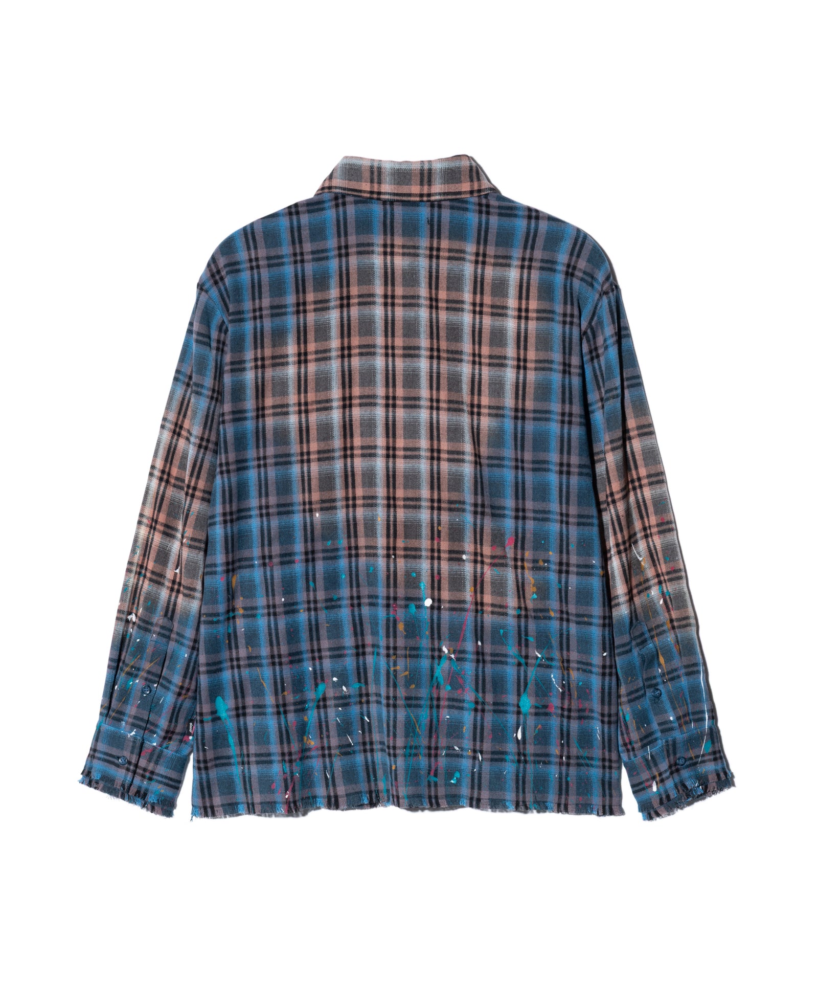 The Splash Damage Flannel Shirt is a concept that glamb has set up since its founding the brand, and its image is brought to fruition into a single shirt through craftsmanship that spans many processes. The textile was made of medium-thick flannel fabric. After sewing, bleaching is applied to the body everywhere to sublimate the grunge worldview into a design. In addition, cut-offs are added to the hem and cuffs to create damage by fraying the fabric. By casually splashing splash paint to finish off, we added a sense of tension that looks like an artwork on the streetwear.