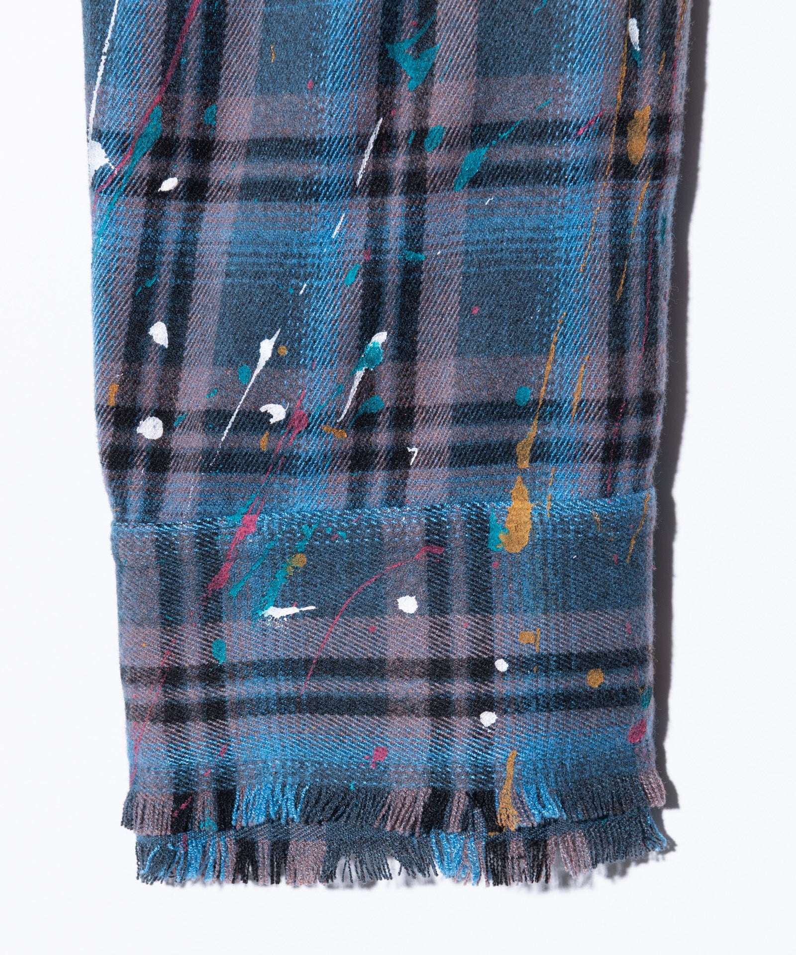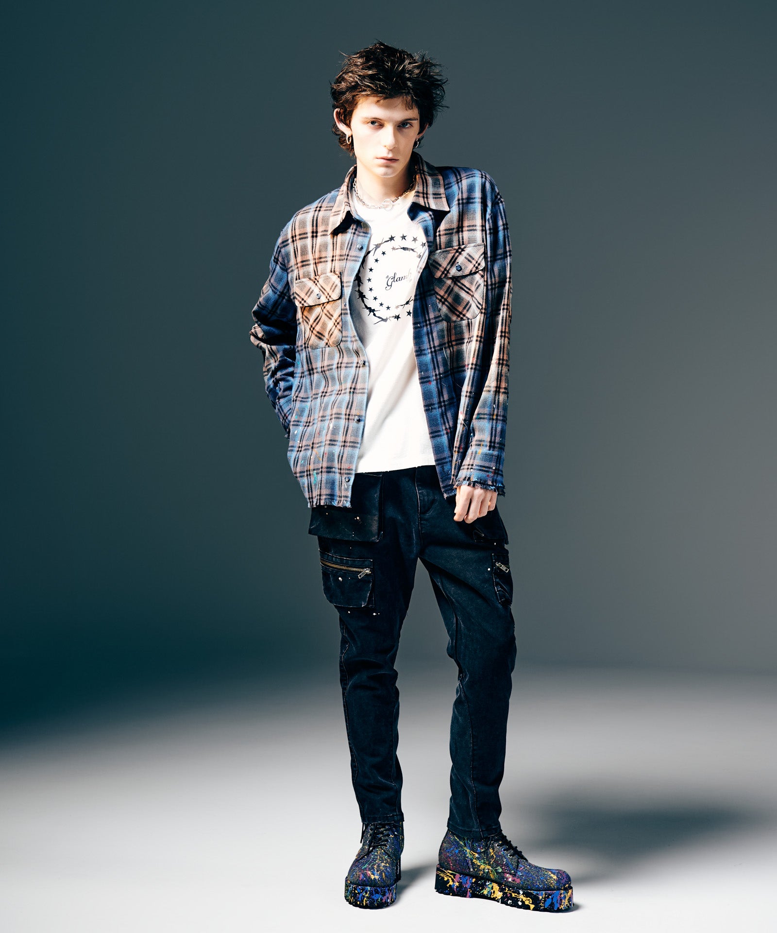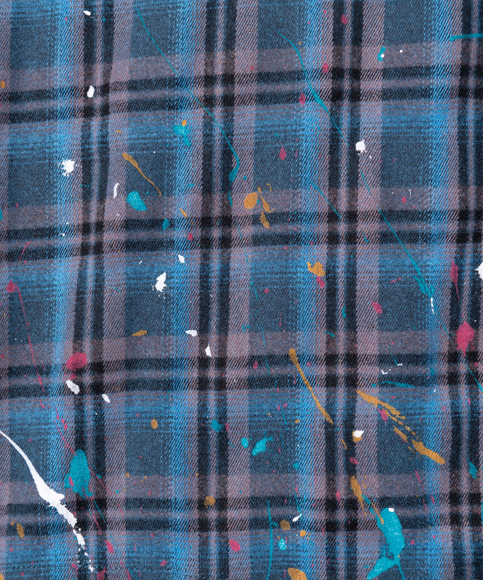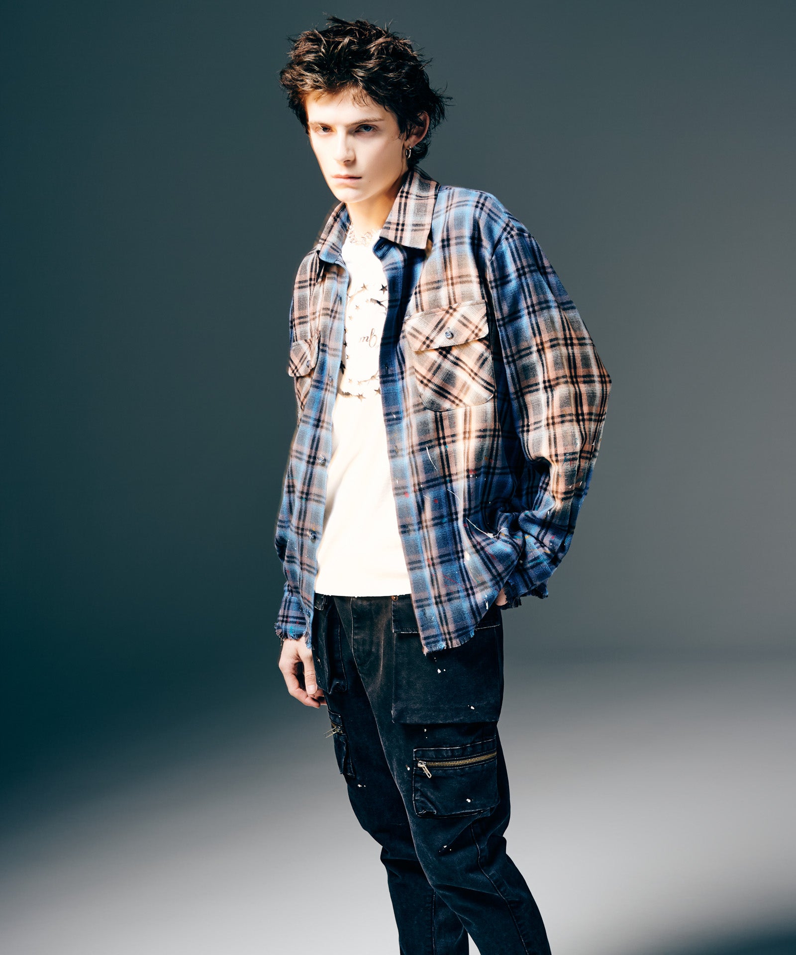 The Splash Damage Flannel Shirt is a concept that glamb has set up since its founding the brand, and its image is brought to fruition into a single shirt through craftsmanship that spans many processes. The textile was made of medium-thick flannel fabric. After sewing, bleaching is applied to the body everywhere to sublimate the grunge worldview into a design. In addition, cut-offs are added to the hem and cuffs to create damage by fraying the fabric. By casually splashing splash paint to finish off, we added a sense of tension that looks like an artwork on the streetwear.