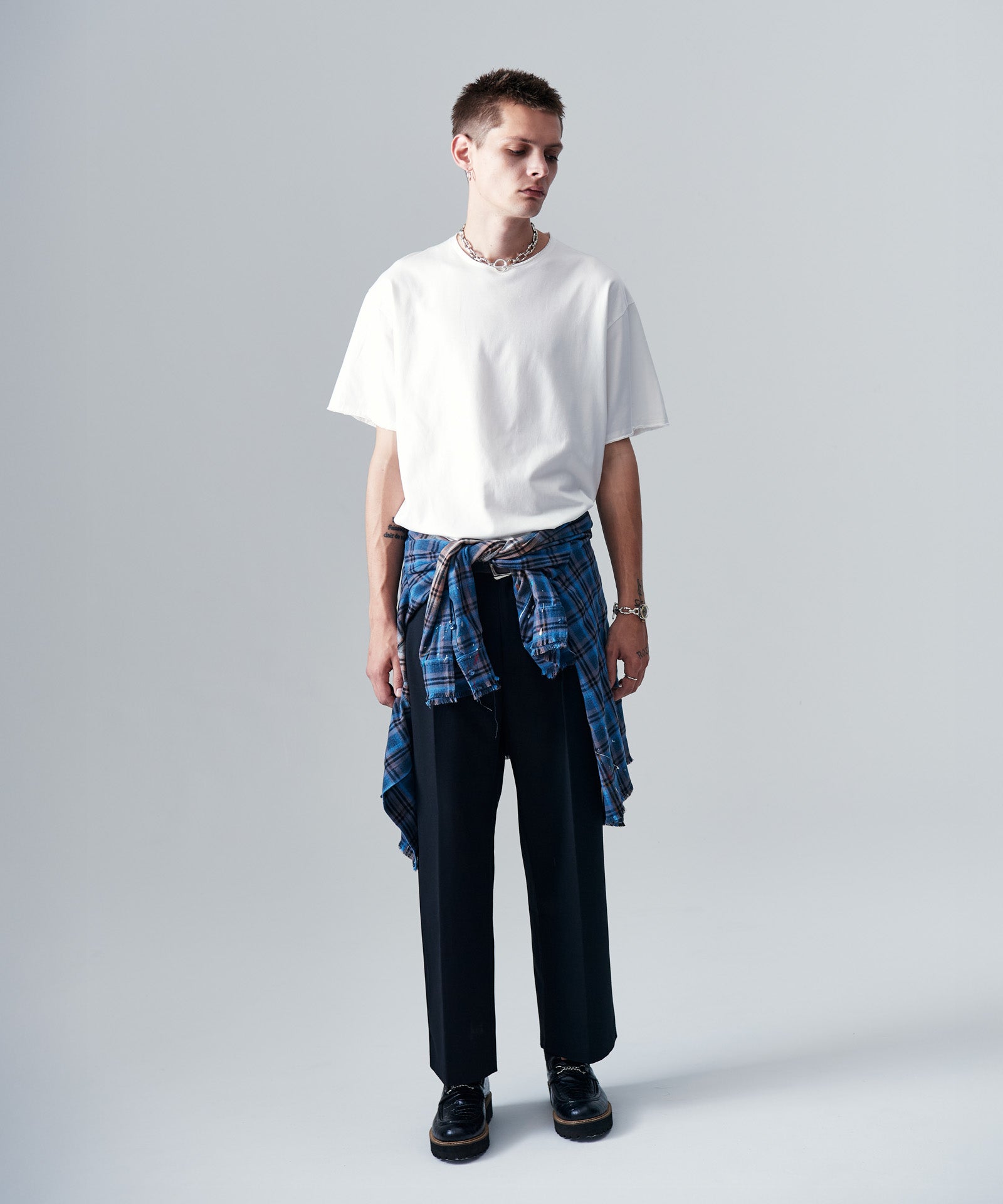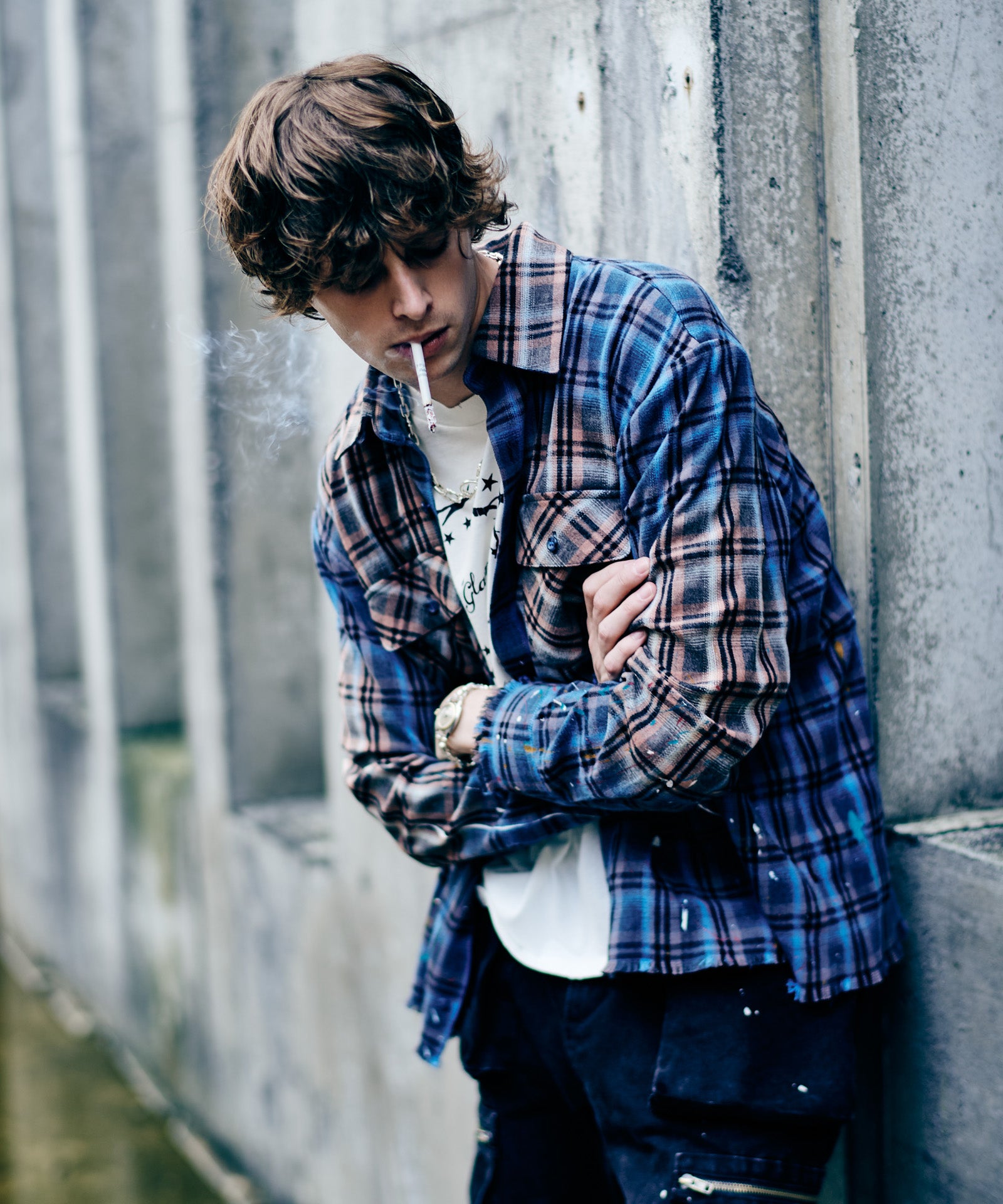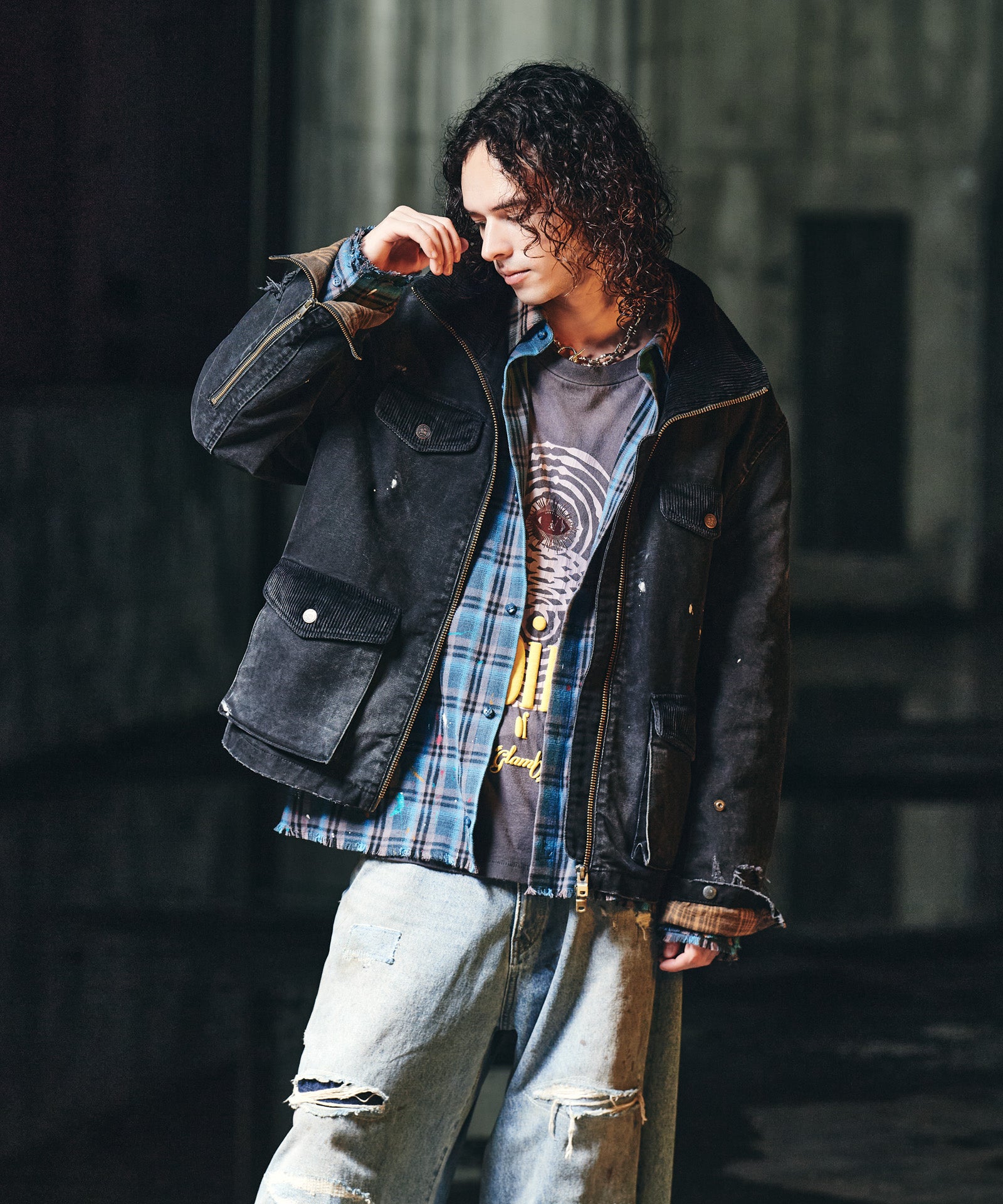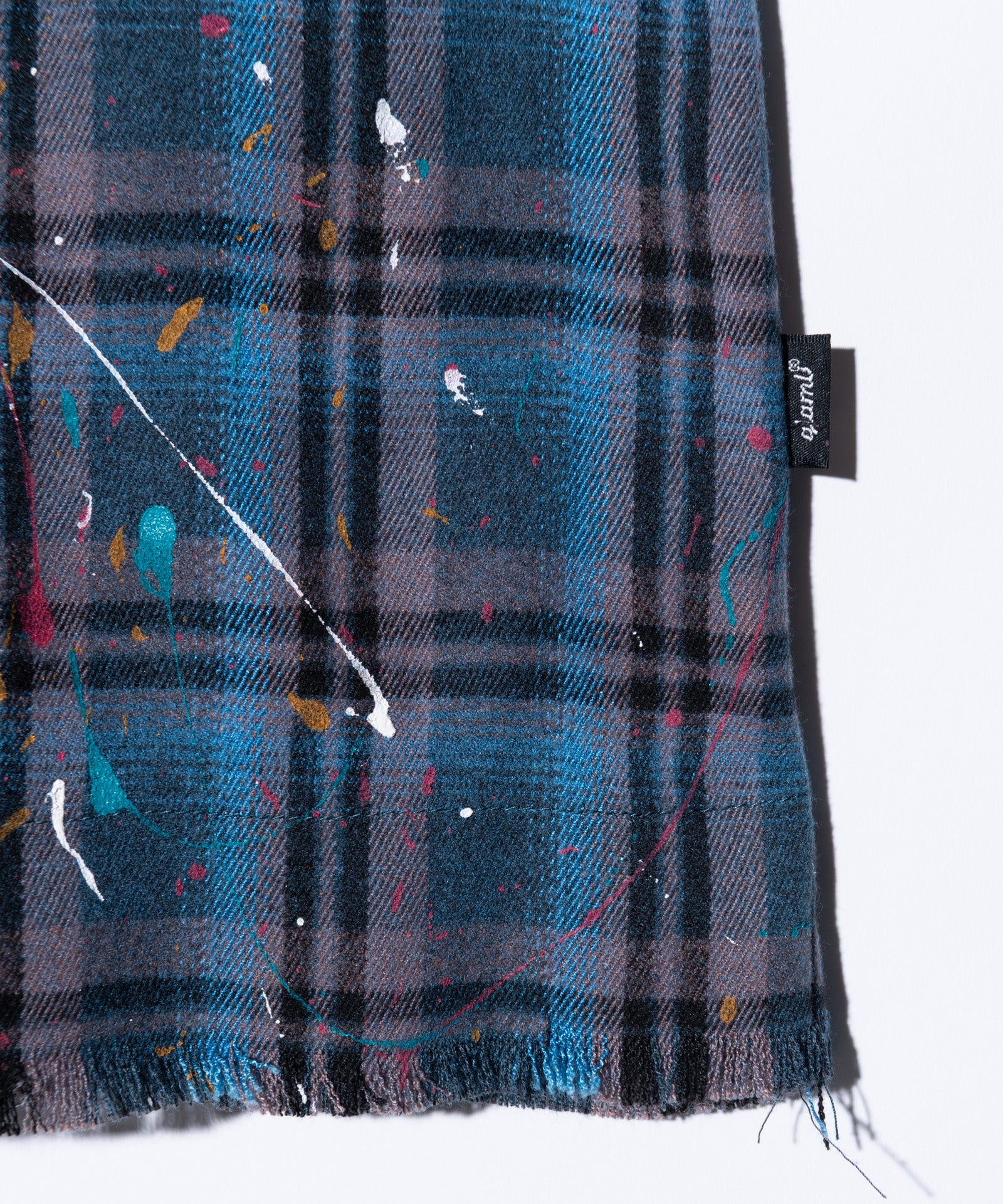 The Splash Damage Flannel Shirt is a concept that glamb has set up since its founding the brand, and its image is brought to fruition into a single shirt through craftsmanship that spans many processes. The textile was made of medium-thick flannel fabric. After sewing, bleaching is applied to the body everywhere to sublimate the grunge worldview into a design. In addition, cut-offs are added to the hem and cuffs to create damage by fraying the fabric. By casually splashing splash paint to finish off, we added a sense of tension that looks like an artwork on the streetwear.