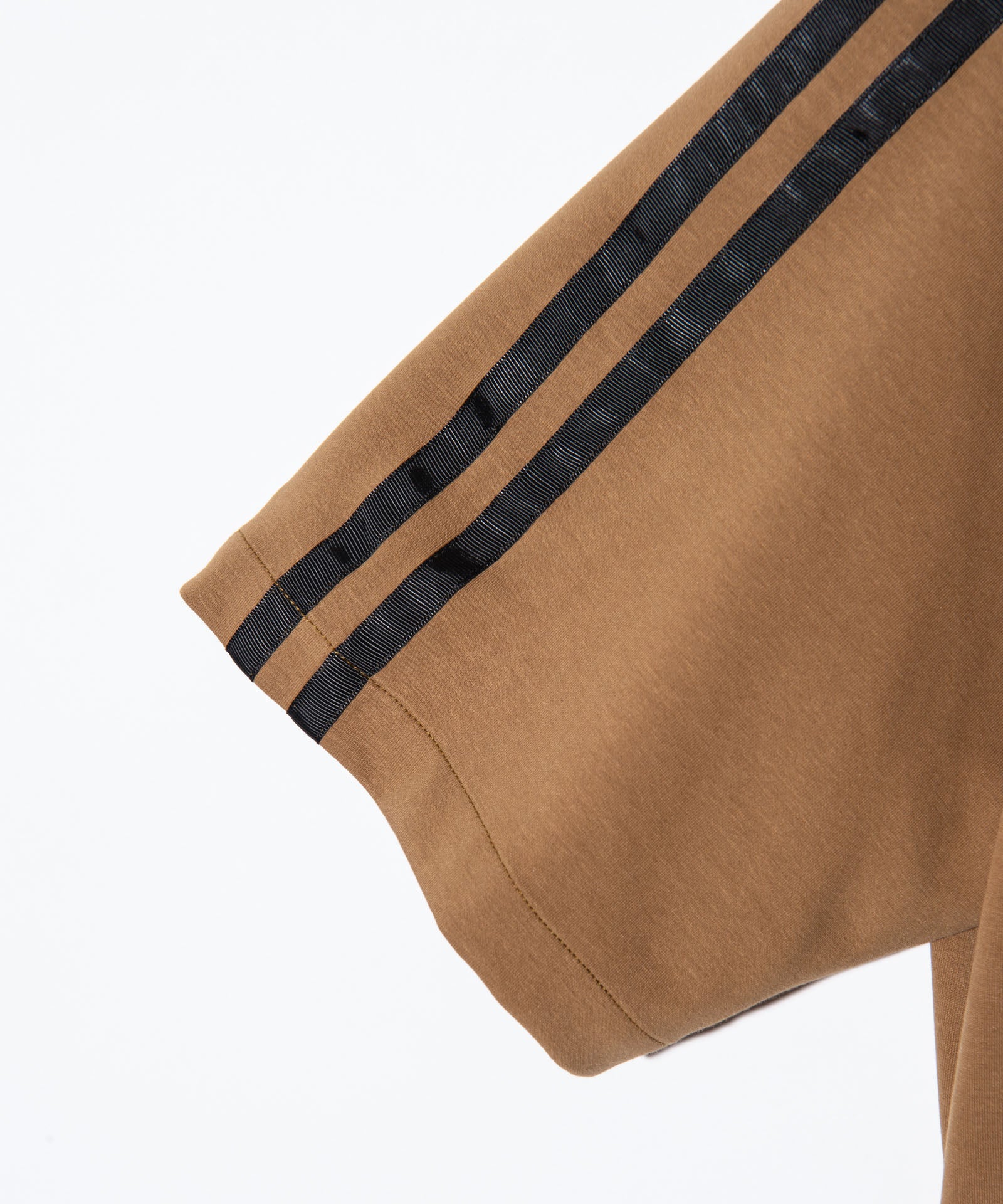 라인 테이프 트랙 셔츠는 라인 유니폼을 결합하여 열린 칼라 셔츠를 결합하여 Rude Street를 제안합니다. 라글란 슬리브 스타일 바디는 칼라에서 실행되는 두 줄의 그로 그레인 테이프가있는 스포티 한 모양을 가지고 있습니다. 섬유에 사용되는 저지 직물은 부드러운 느낌을 가지고 있으며 직물 자체는 적당한 장력을 가지므로 깔끔한 대형 실루엣을 만듭니다. 이번 시즌, 우리는 또한 같은 직물로 만든 라인 테이프 트랙 팬츠를 제공 할 것입니다. 짧은 슬리브 탑을 결합한 설정은 고급 여름 스타일을 만듭니다.