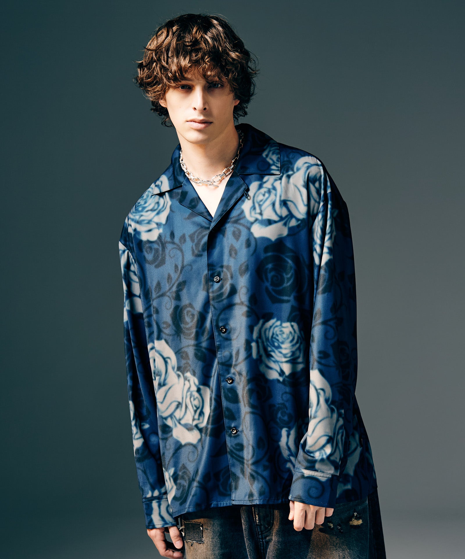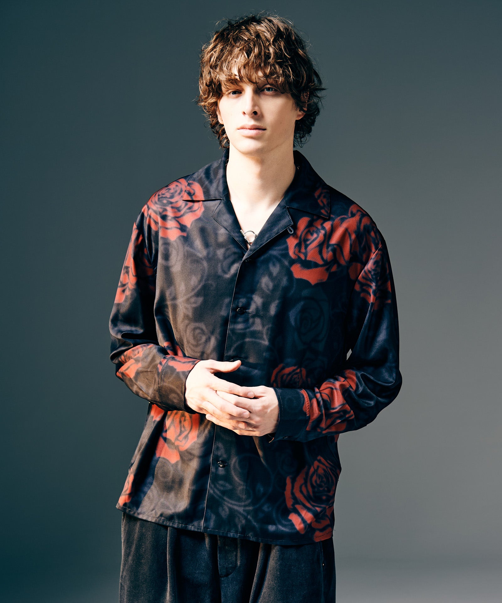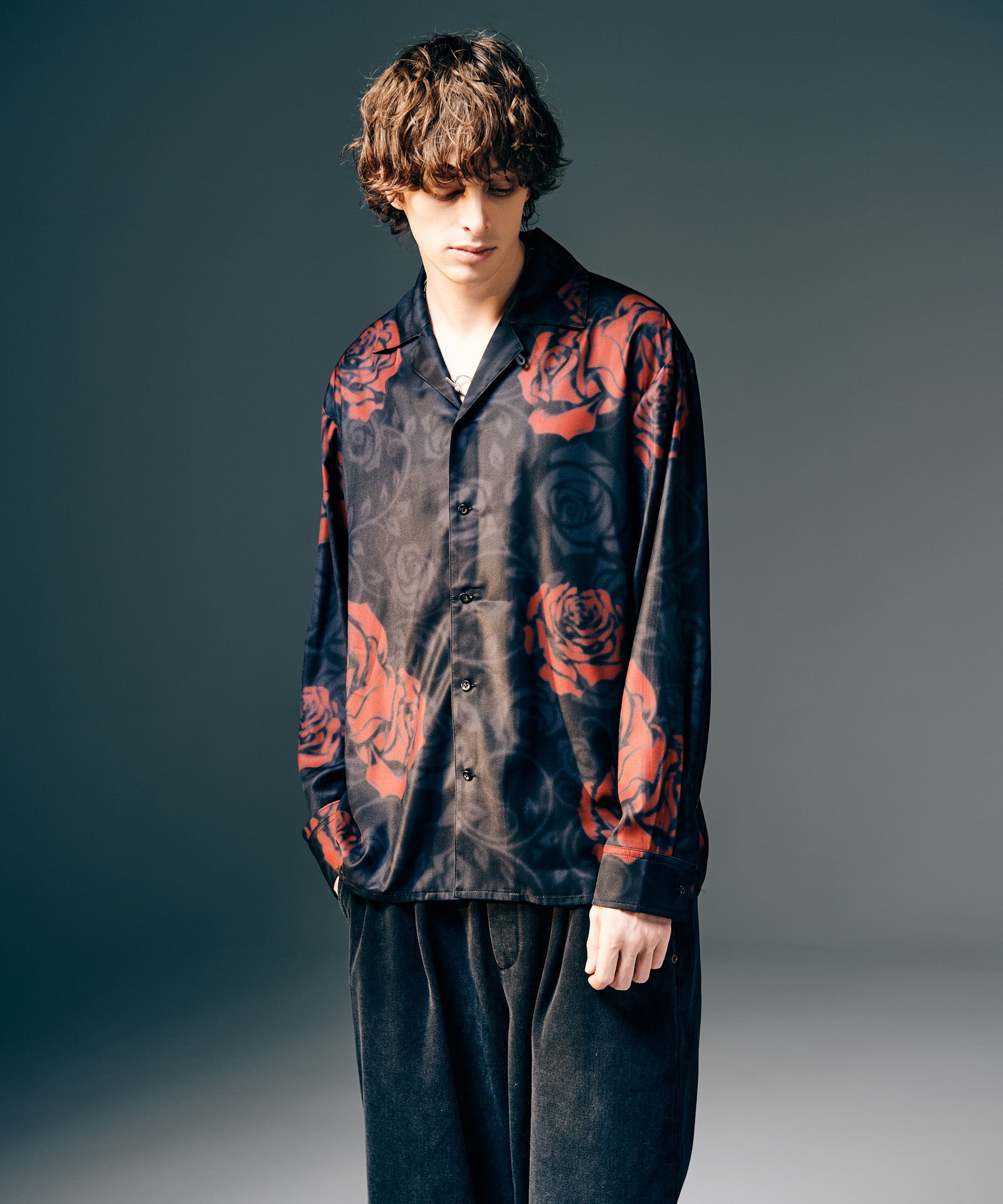 オープンカラーシャツにアイコニックな柄使いを掛け合わせたRose Blur Shirt。ゆとりある身幅にドロップショルダーを組み合わせたルーズフィッティングのボディにあしらったのは、退廃的なダークカラーで描き出されたバラの花弁。大小様々に散りばめられた柄は揺らぎを加えるブラーエフェクトを施すことで輪郭を曖昧に。ミステリアスな奥行きを持ったルックスは秋冬のレイヤードにリリカルな表情を落とすでしょう。