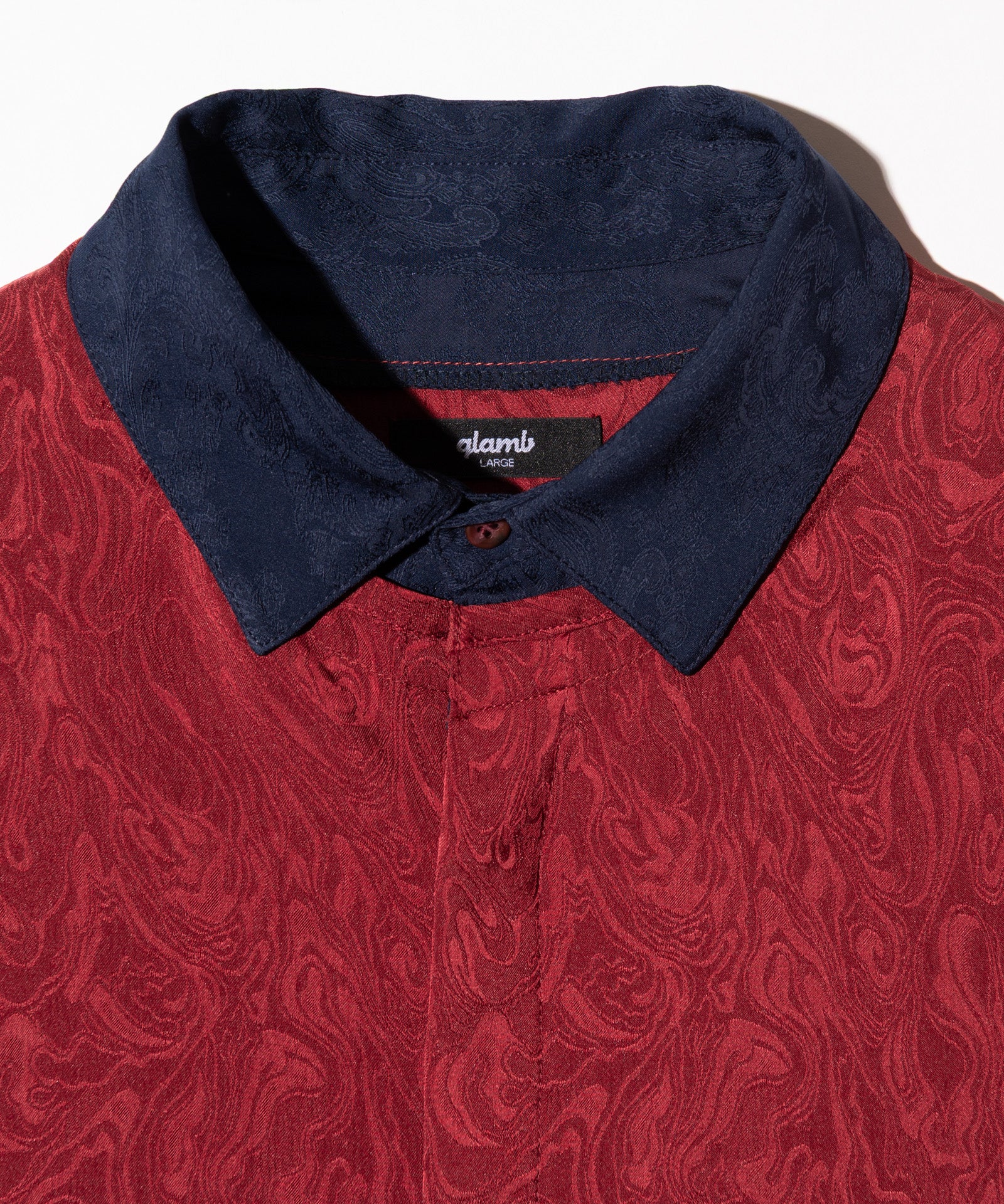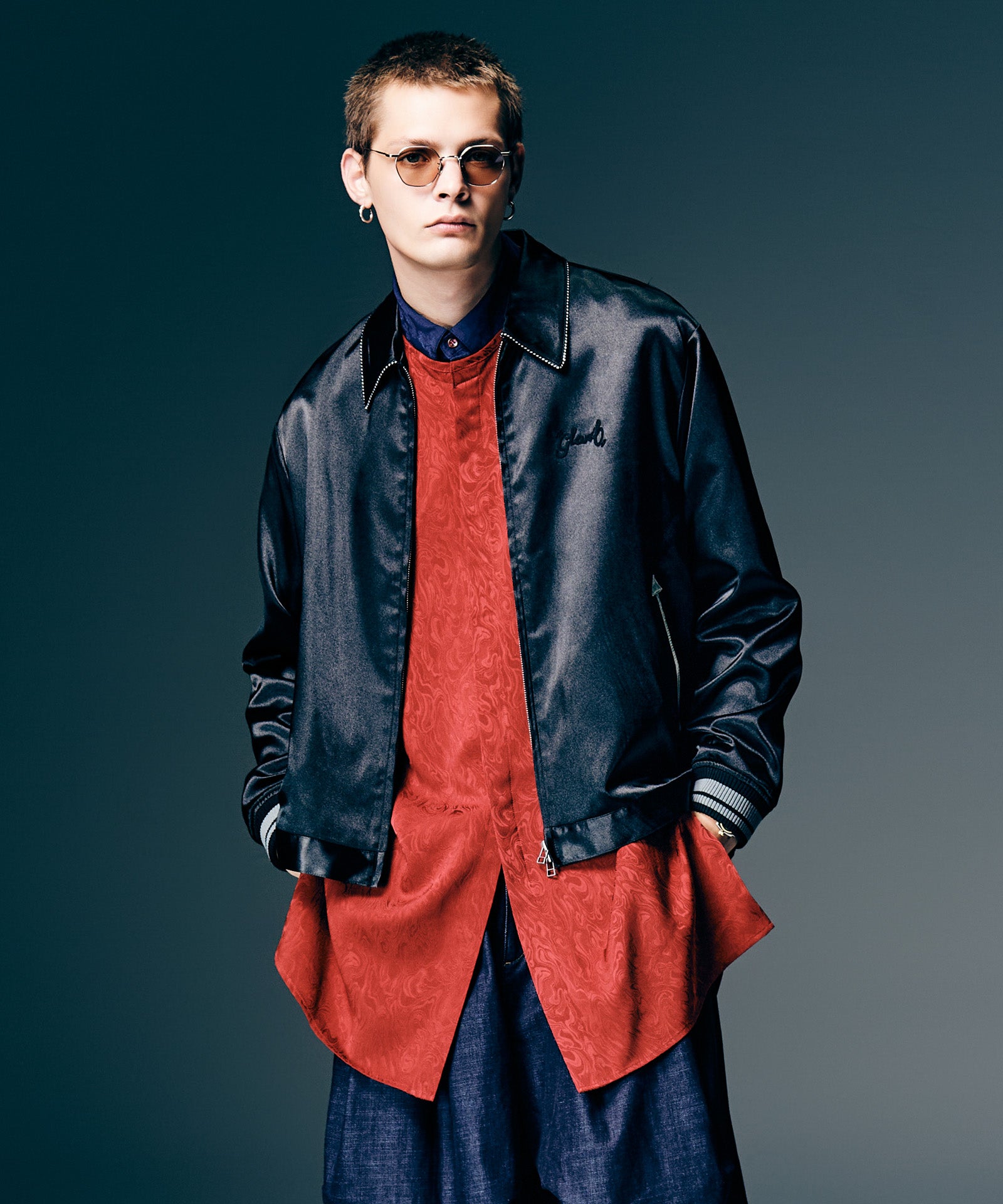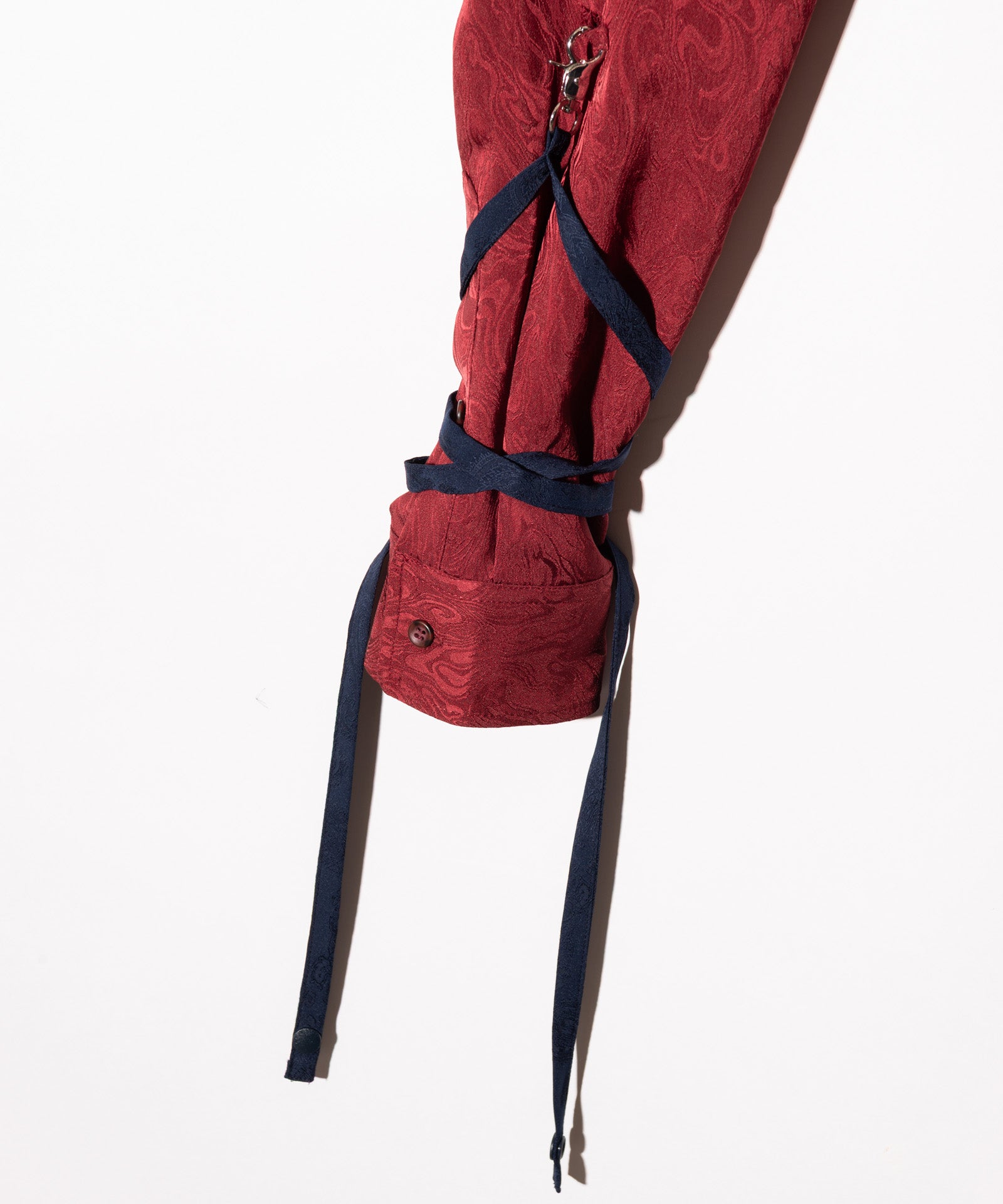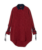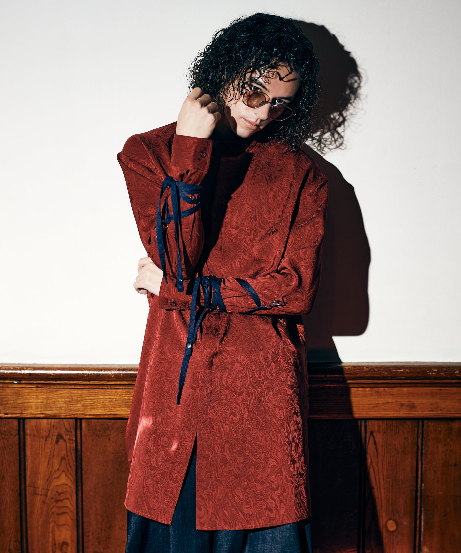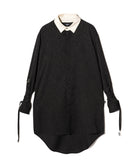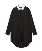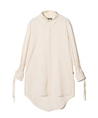 이번 시즌 글램 컬렉션의 주제는 '바람의 그림자'입니다. 블로우 롱 셔츠는 소재, 디테일, 실루엣의 삼위일체를 통해 이러한 세계관을 표현합니다. 바디는 앞면과 뒷면의 길이가 다르고 옆면 슬릿이 있는 롱한 실루엣이 특징입니다. 본체 원단은 섀도우 마블 패턴의 텍스타일을 사용하여 어른스러운 색상을 연출합니다. 이번 작품의 콘셉트를 더욱 강조하는 것은 양쪽 소매에 붙은 70cm 길이의 테이프다. 바람에 흔들리는 경쾌한 움직임을 시각적으로 표현합니다. 인조 레이어드 네크라인은 이러한 디자인에 해당합니다. 라운드 넥과 스탠드 칼라를 조합한 넥라인이 신비로운 자태를 연출해줍니다.