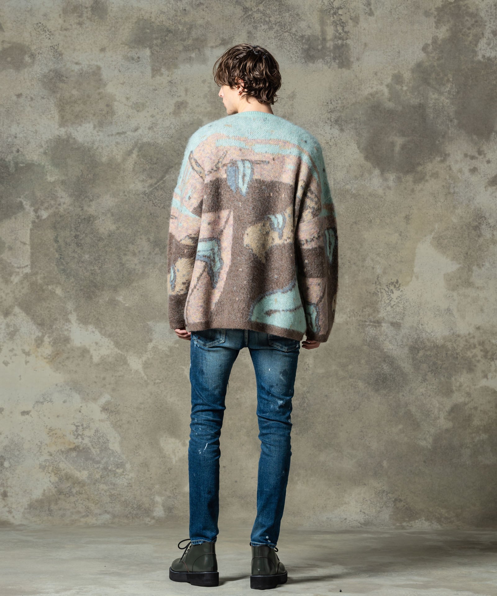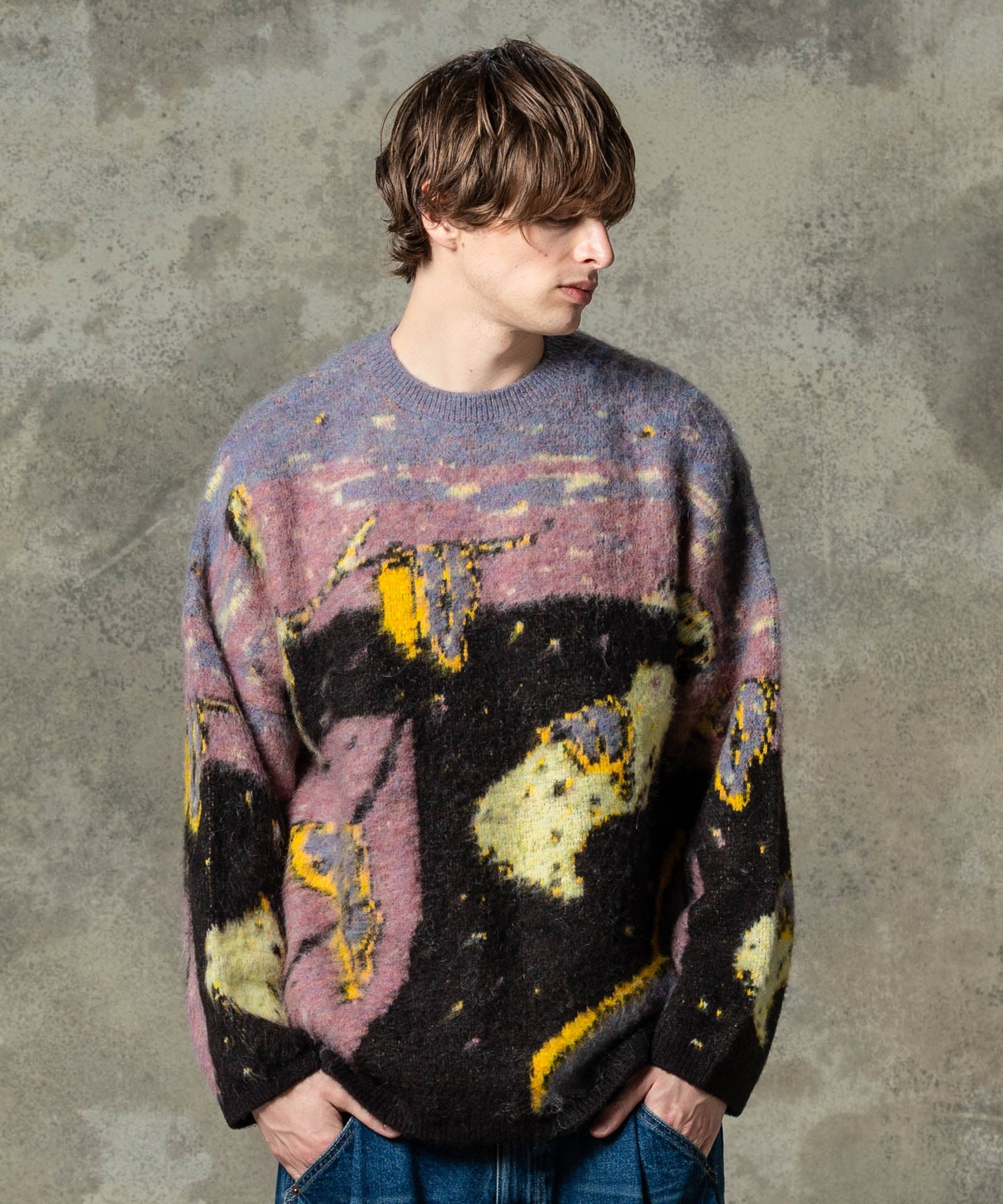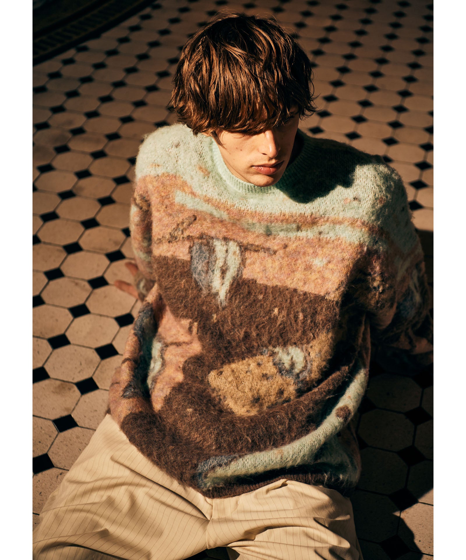 Twist Clocks Pullover Knit은 디자이너가 프랑스 파리에서 방문한 그림 모음으로 이번 시즌 컬렉션에 영감을주기 위해 방문했습니다. Jacquard가 바디로 짠 것은 브랜드가 그린 그래픽으로 초현실주의 예술의 일반적인 묘사를 모방합니다. 이것은 대형 실루엣으로 바디의 앞뒤에 동일한 배열로 동일한 패턴이 나타나는 개념적 조각입니다. 뜨개질 원사는 묘사에 오일 같은 변동을 추가하기 위해 고르지 않은 색상의 혼합형 원사로 만들어집니다. 깊고 컬러 니트 패브릭은 모헤어 브러시 마감 처리로 완성되어 예술의 대기에 초초 록 스타일을 추가합니다.