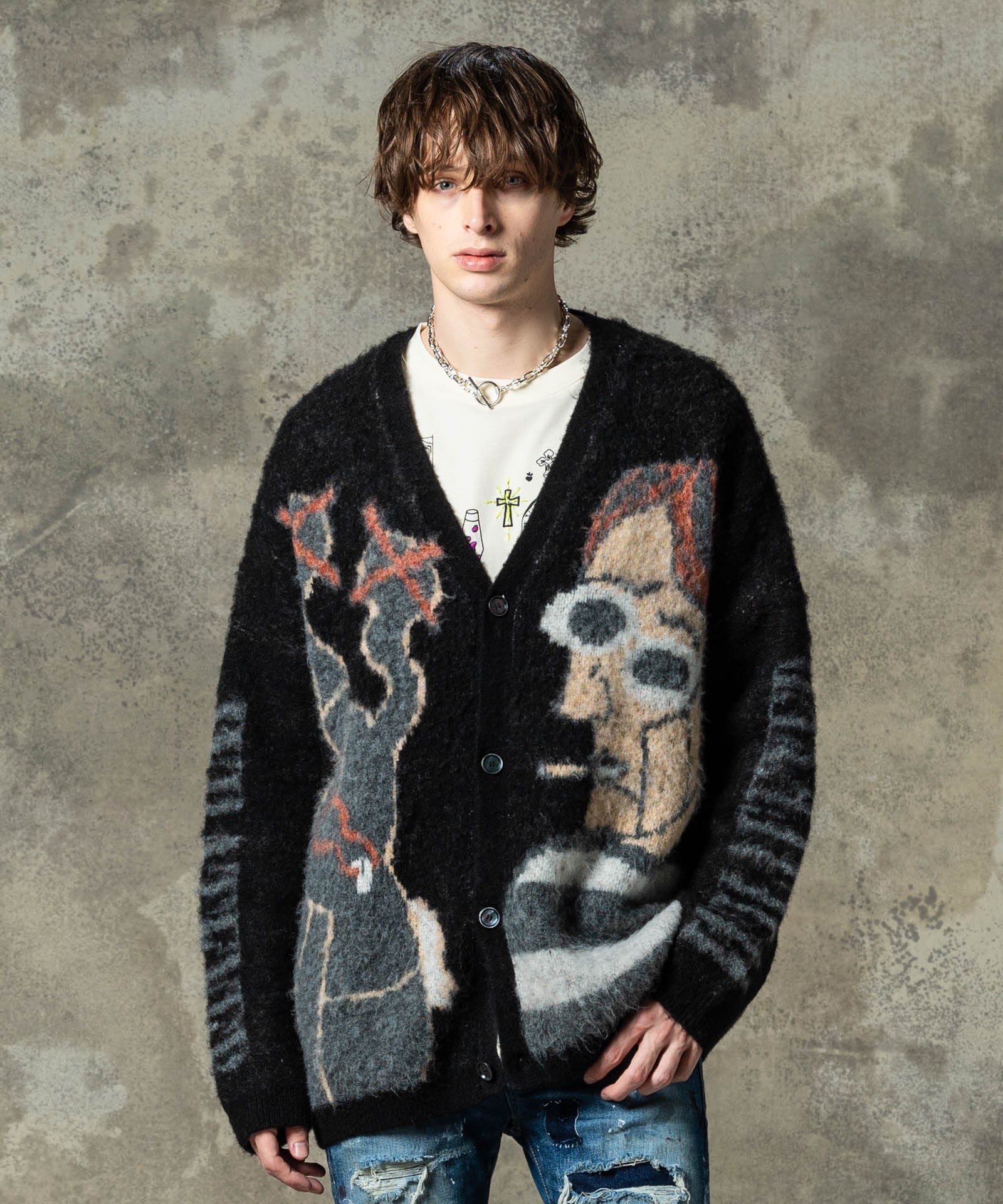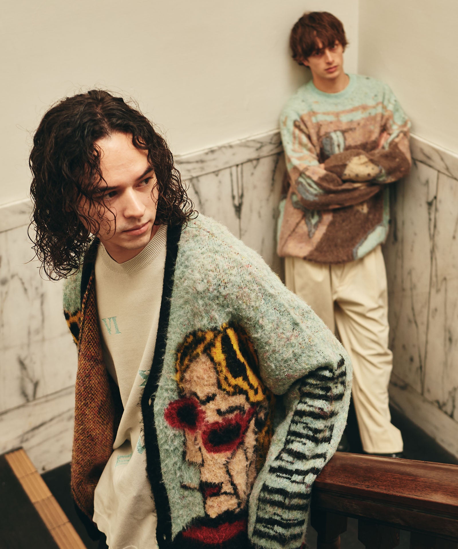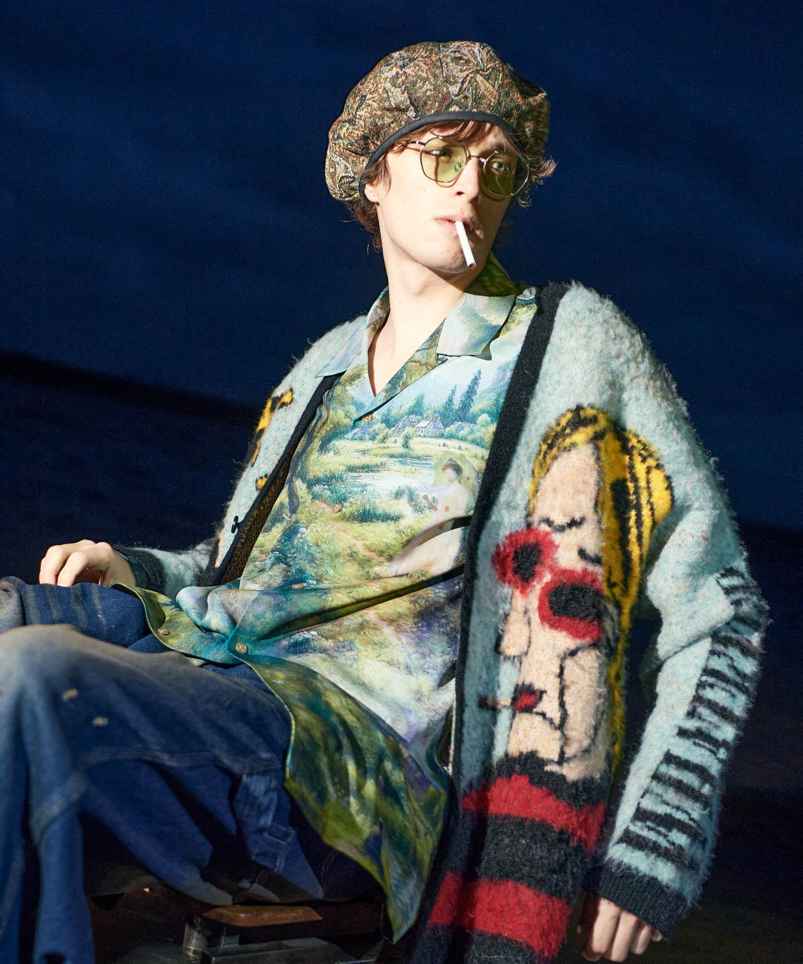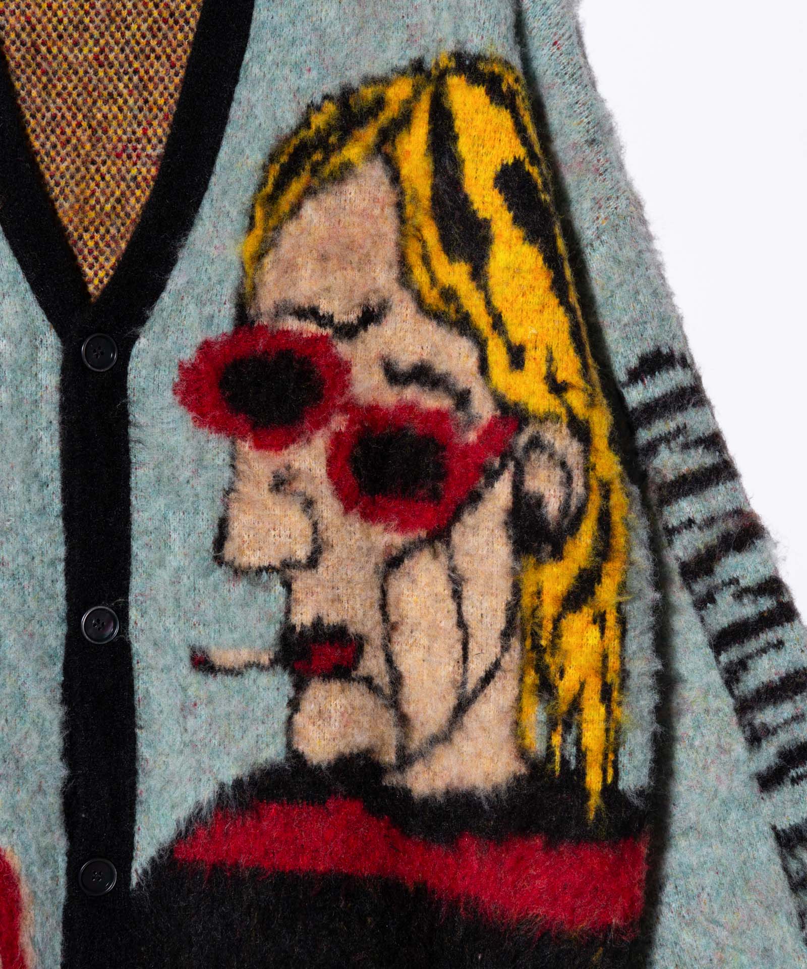 Weeping Man Cardigan은 Grunge Culture의 열망과 프랑스 추상 그림의 본질을 결합하여 Esprit와 같은 외관을 만듭니다. Jacquard는 그런지 방식으로 옷을 입은 금발 남자의 몸과 신비한 캐릭터를 묘사합니다. 입체파적인 터치가 있으며, 레이아웃은 같은 방식으로 몸의 앞뒤에 동일한 패턴으로 대담합니다. 섬유는 Tom Yarn으로 만들어졌으며 브러시 마감 처리가 추가되어 Mohair와 같은 브러시 느낌을 만듭니다. 바디는 방울 어깨를 몸이 느슨한 몸 너비와 결합하여 거리와 그런지 스타일링으로 착용 할 수있는 실루엣을 만듭니다.