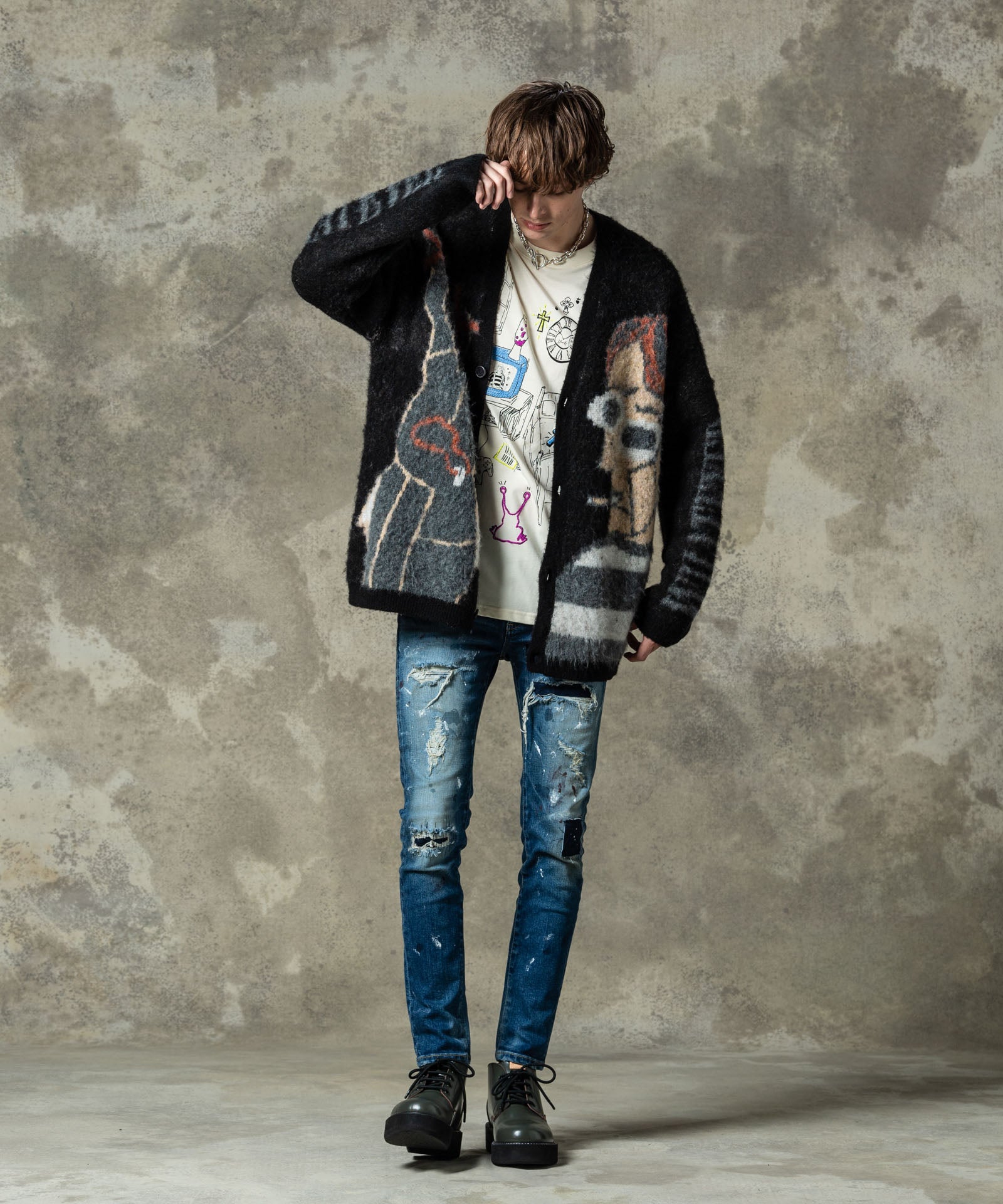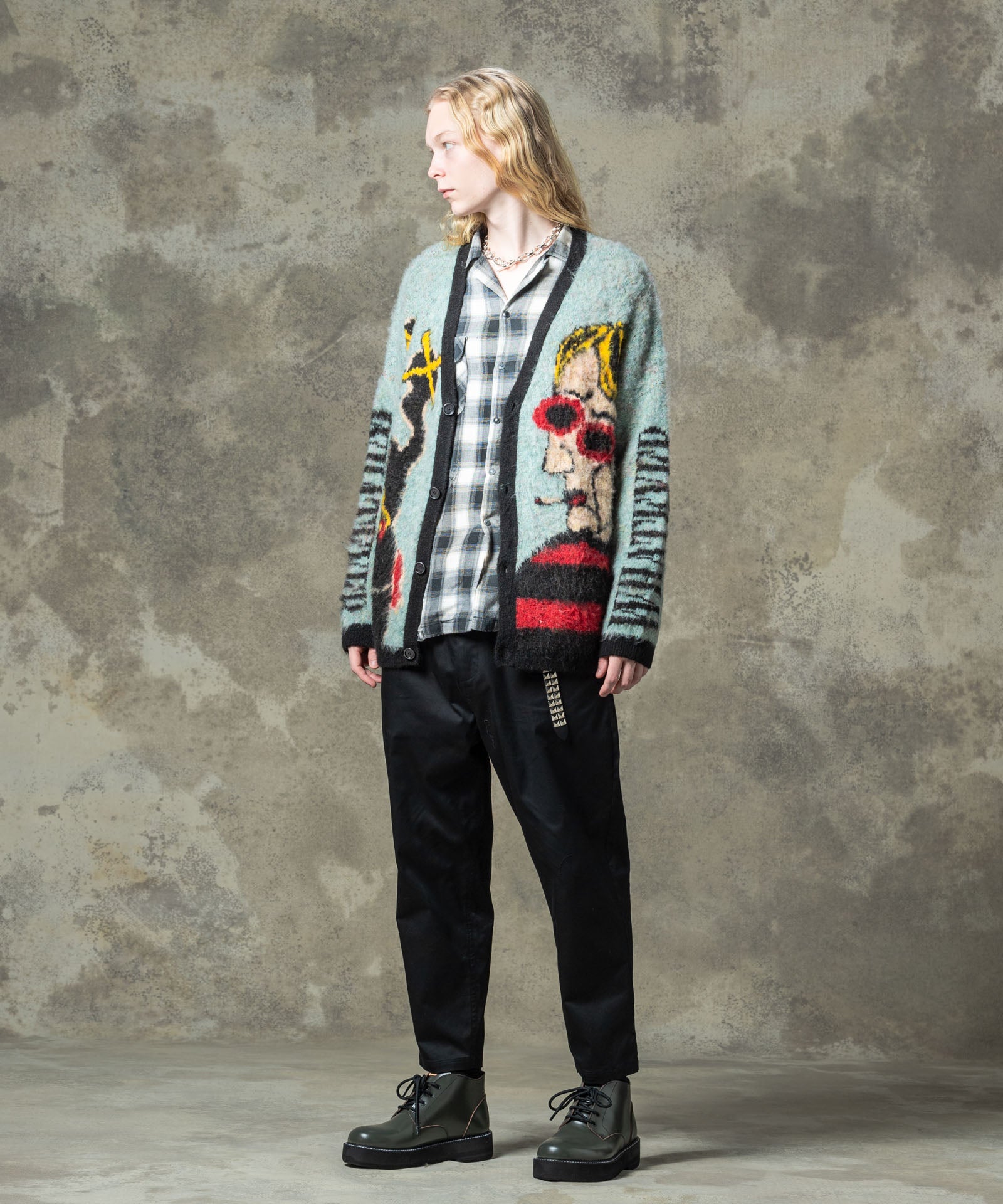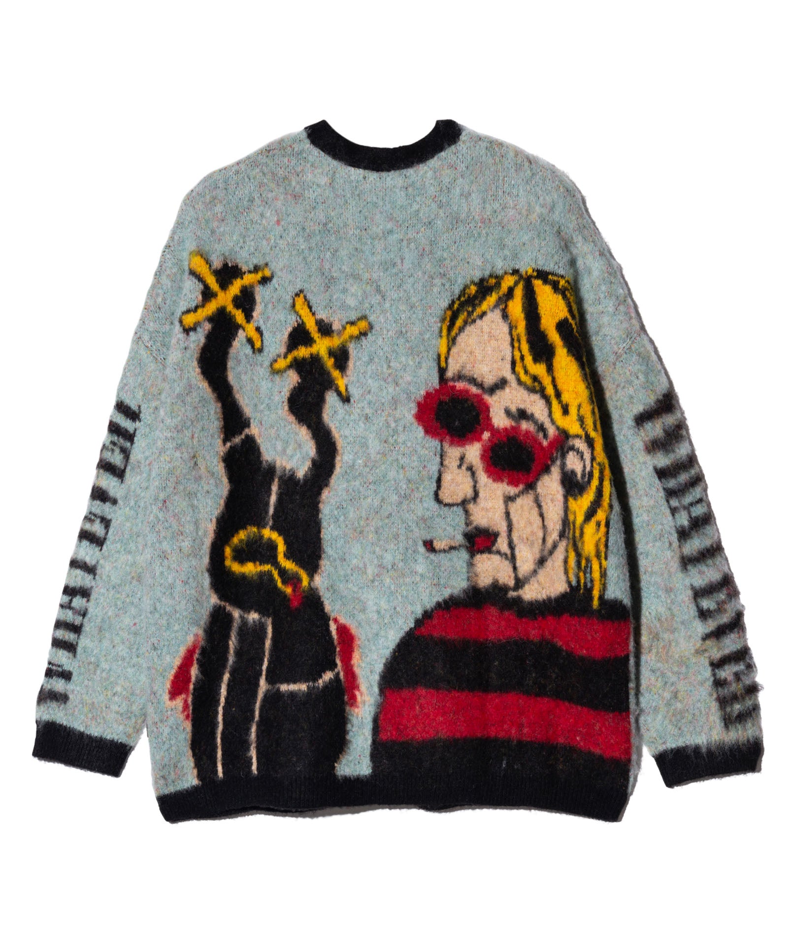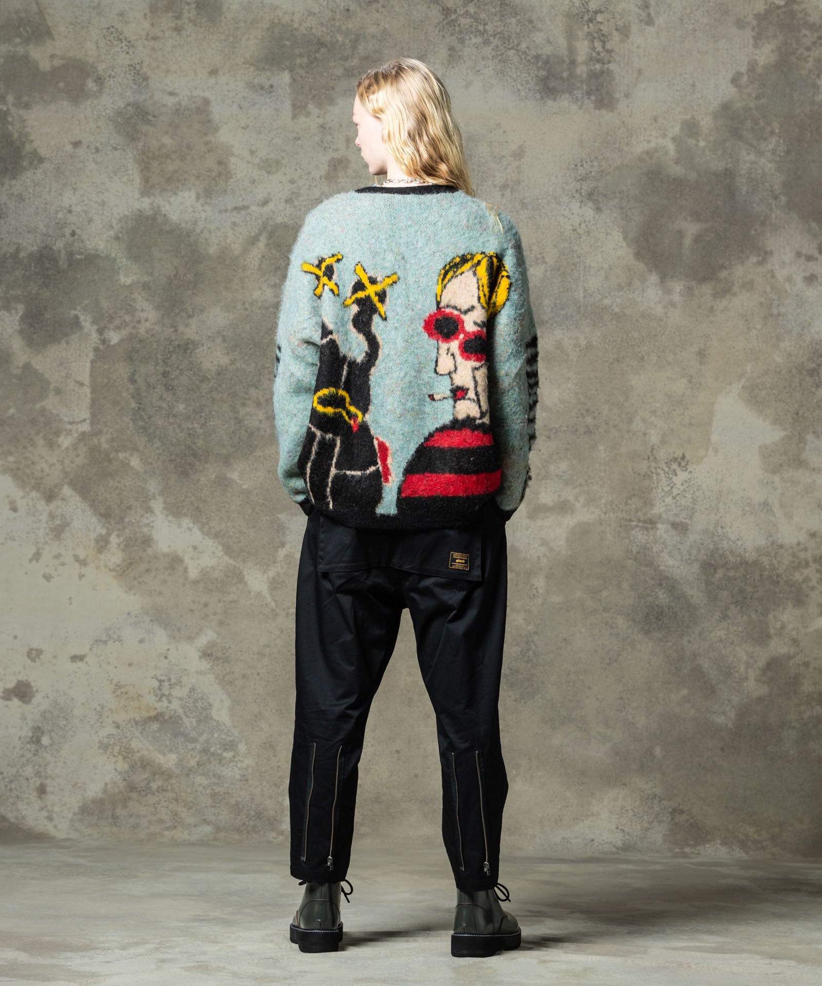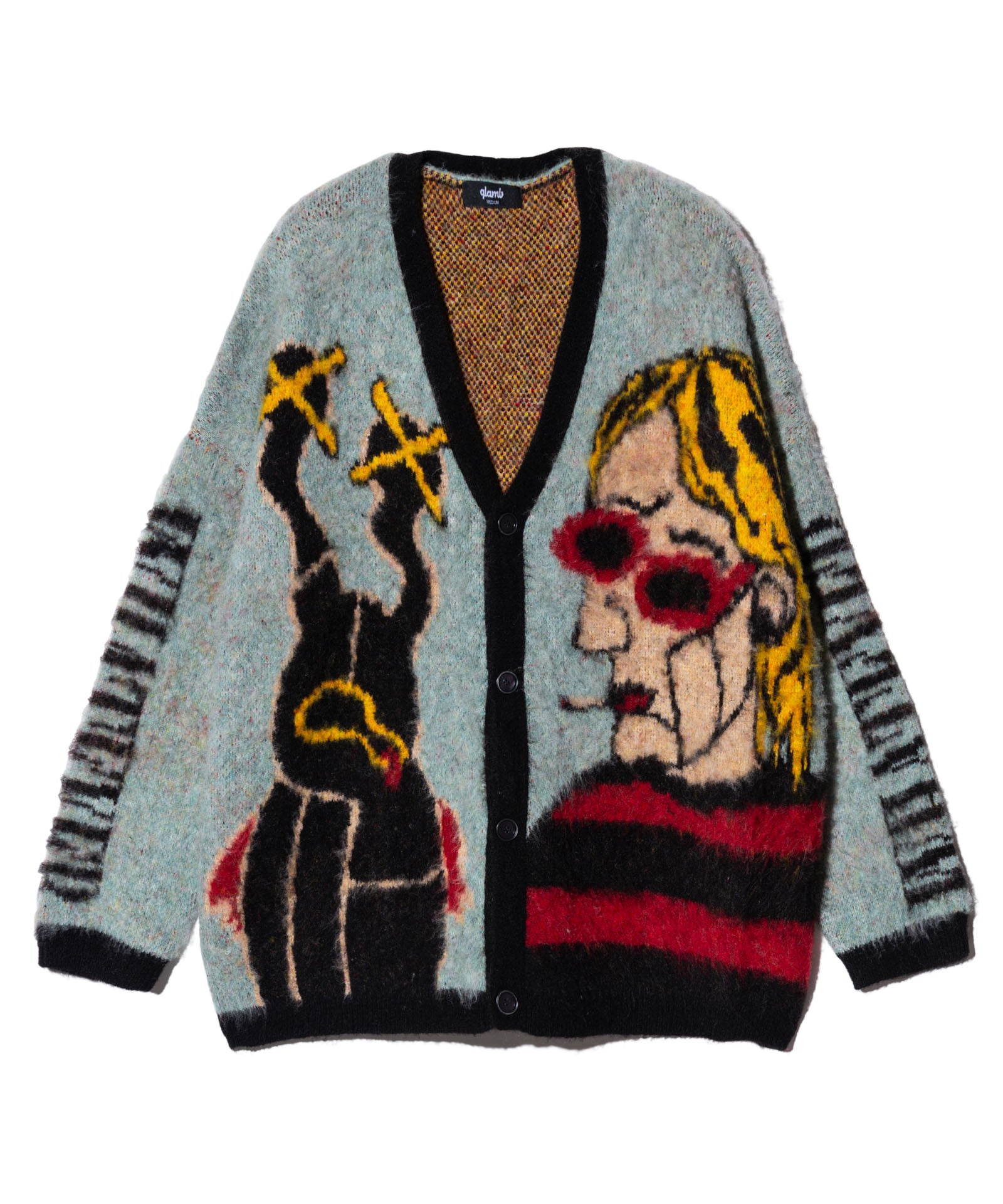 Weeping Man Cardigan은 Grunge Culture의 열망과 프랑스 추상 그림의 본질을 결합하여 Esprit와 같은 외관을 만듭니다. Jacquard는 그런지 방식으로 옷을 입은 금발 남자의 몸과 신비한 캐릭터를 묘사합니다. 입체파적인 터치가 있으며, 레이아웃은 같은 방식으로 몸의 앞뒤에 동일한 패턴으로 대담합니다. 섬유는 Tom Yarn으로 만들어졌으며 브러시 마감 처리가 추가되어 Mohair와 같은 브러시 느낌을 만듭니다. 바디는 방울 어깨를 몸이 느슨한 몸 너비와 결합하여 거리와 그런지 스타일링으로 착용 할 수있는 실루엣을 만듭니다.