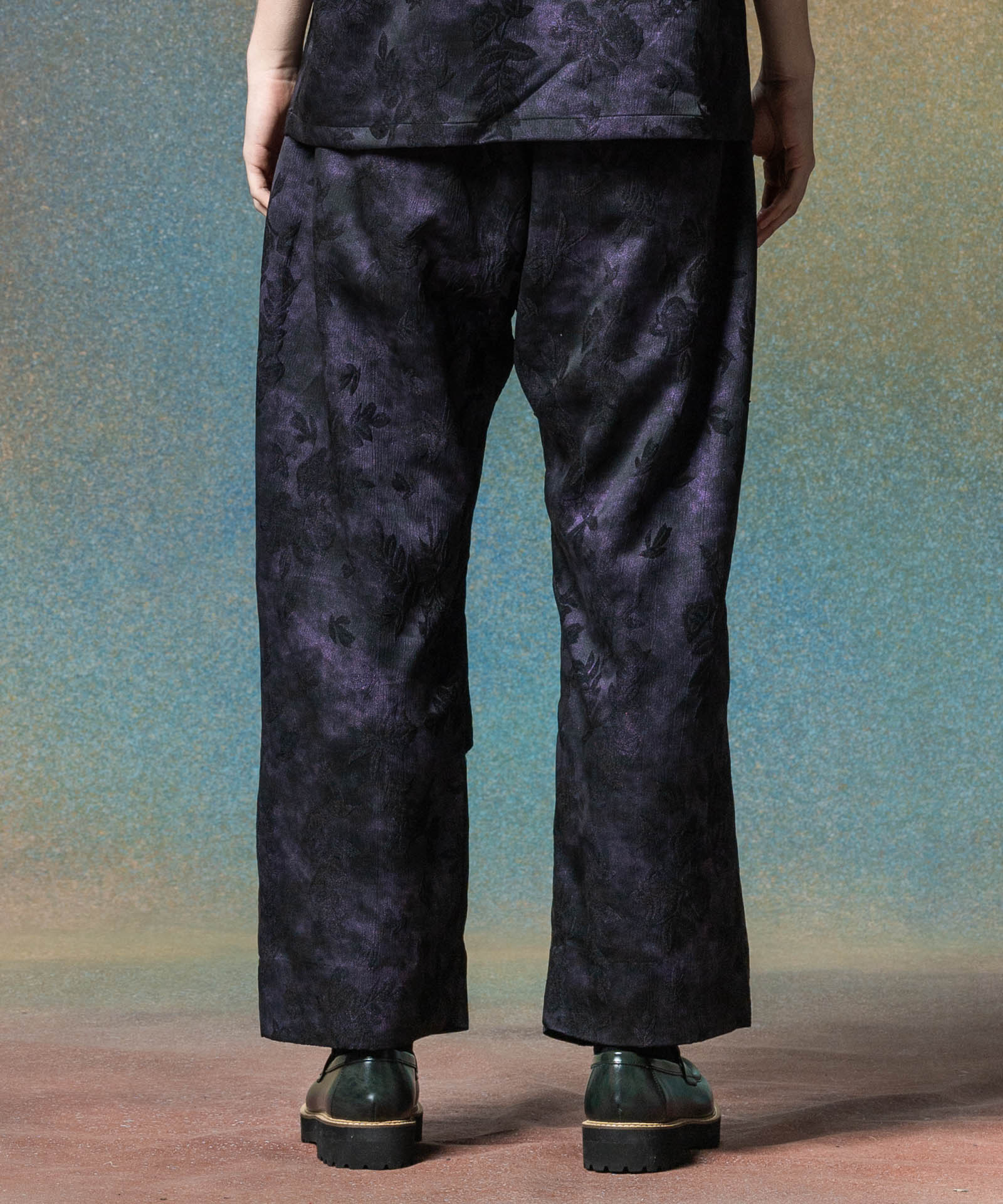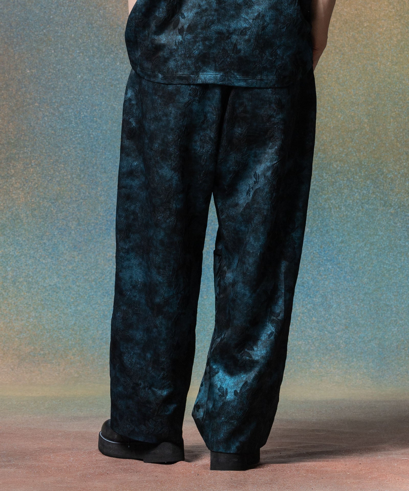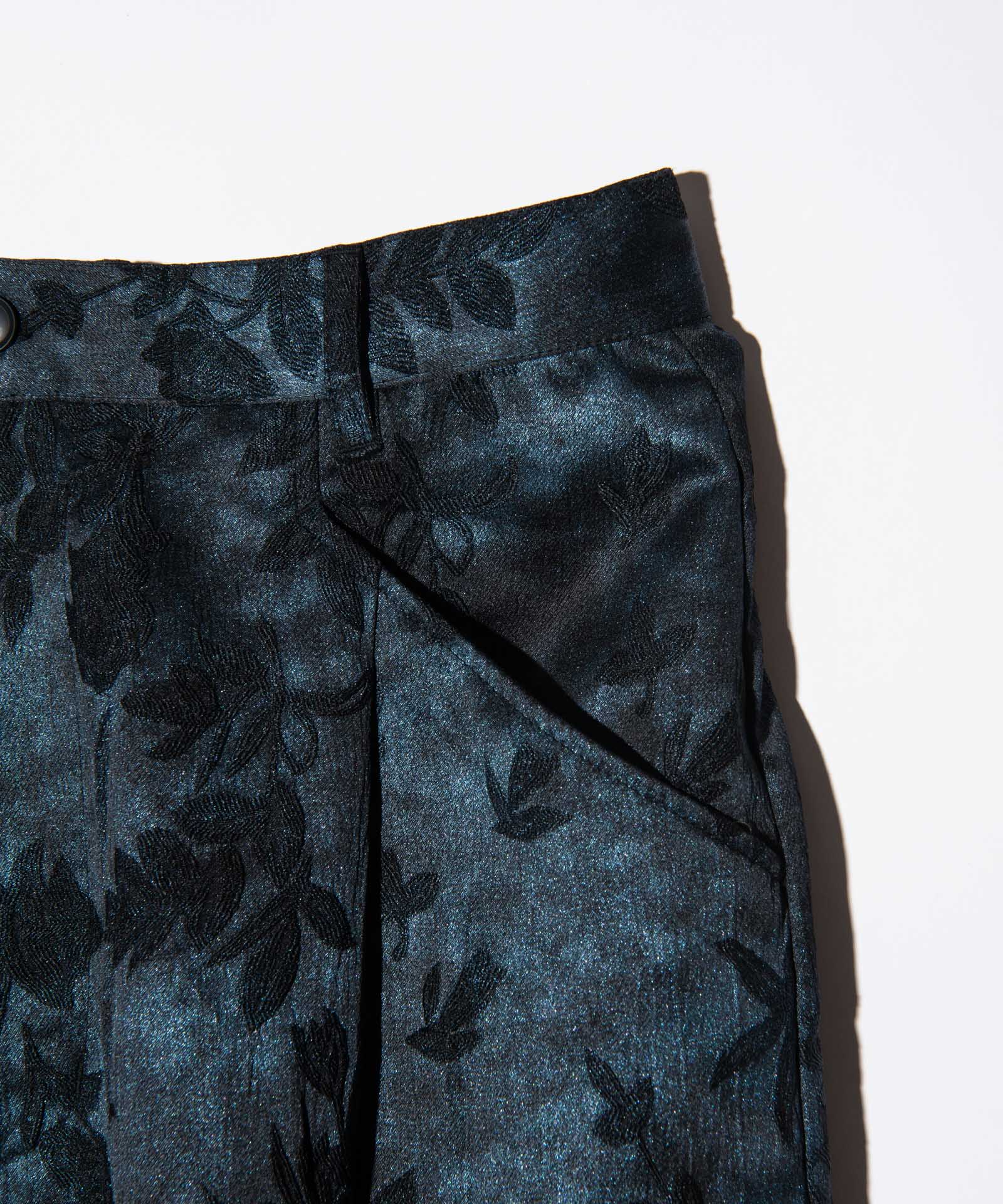 반짝이는 식물 바지는 계절을 화려한 직물로 포착하는 식물 패턴을 결합하여 글램 바위 느낌을주는 고급스러운 바닥 스타일을 만듭니다. 섬유에 사용 된 직물은 가공 된 직물이었으며,이 패턴은 신체 직물에 패턴을 꿰매고 페인트를 무작위로 뿌려서 광택 마감 처리했습니다. 착용자의 움직임에 따라 반짝이는 질감을 즐기십시오. 실루엣은 허리에 1 개의 턱과 무릎에 두 개의 턱이있는 3 차원 버기 스타일입니다. 이번 시즌, 우리는 또한 같은 직물로 만든 반짝이는 식물 알로하 셔츠를 가지고 있으며 세트로 착용 할 수 있습니다.