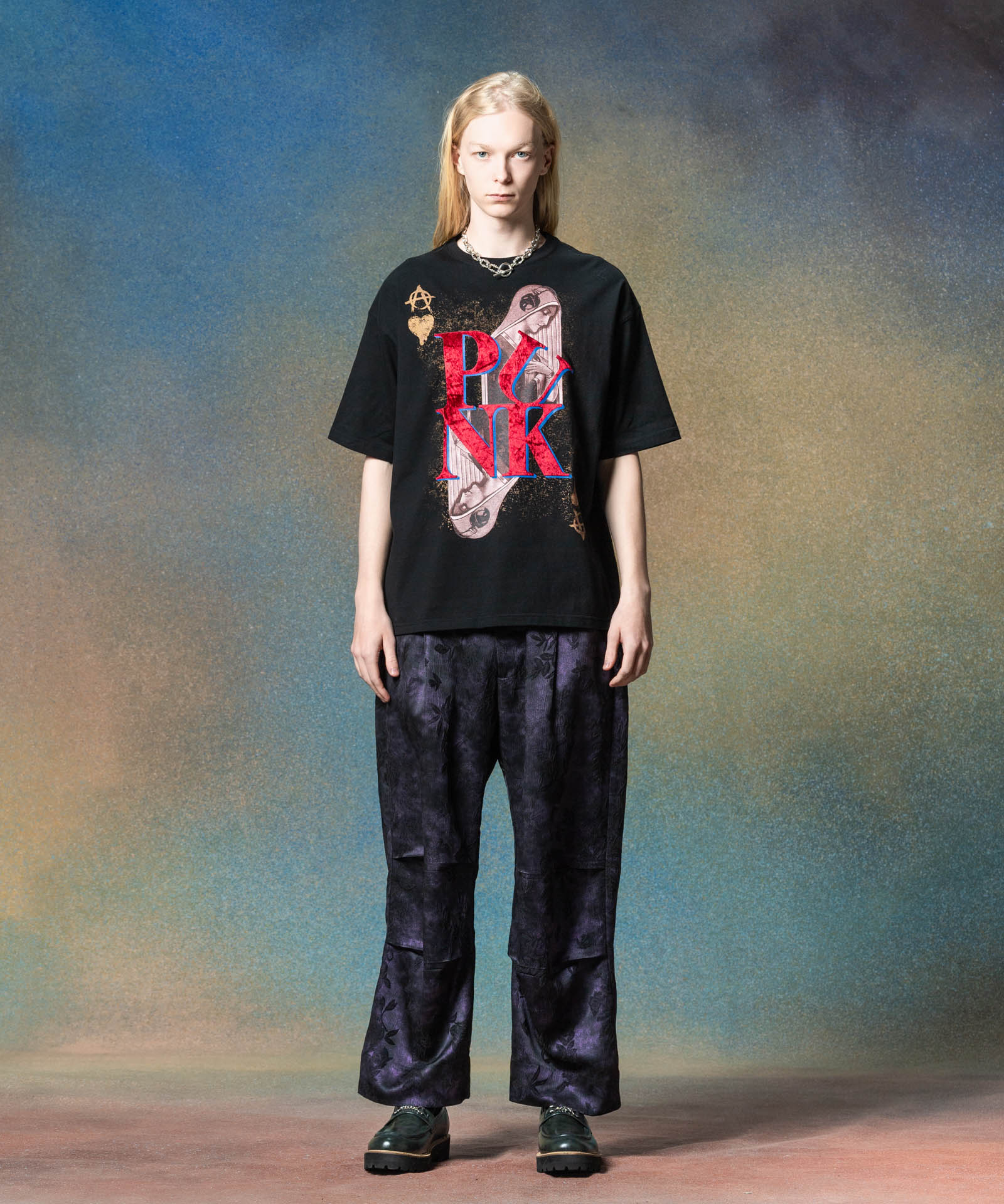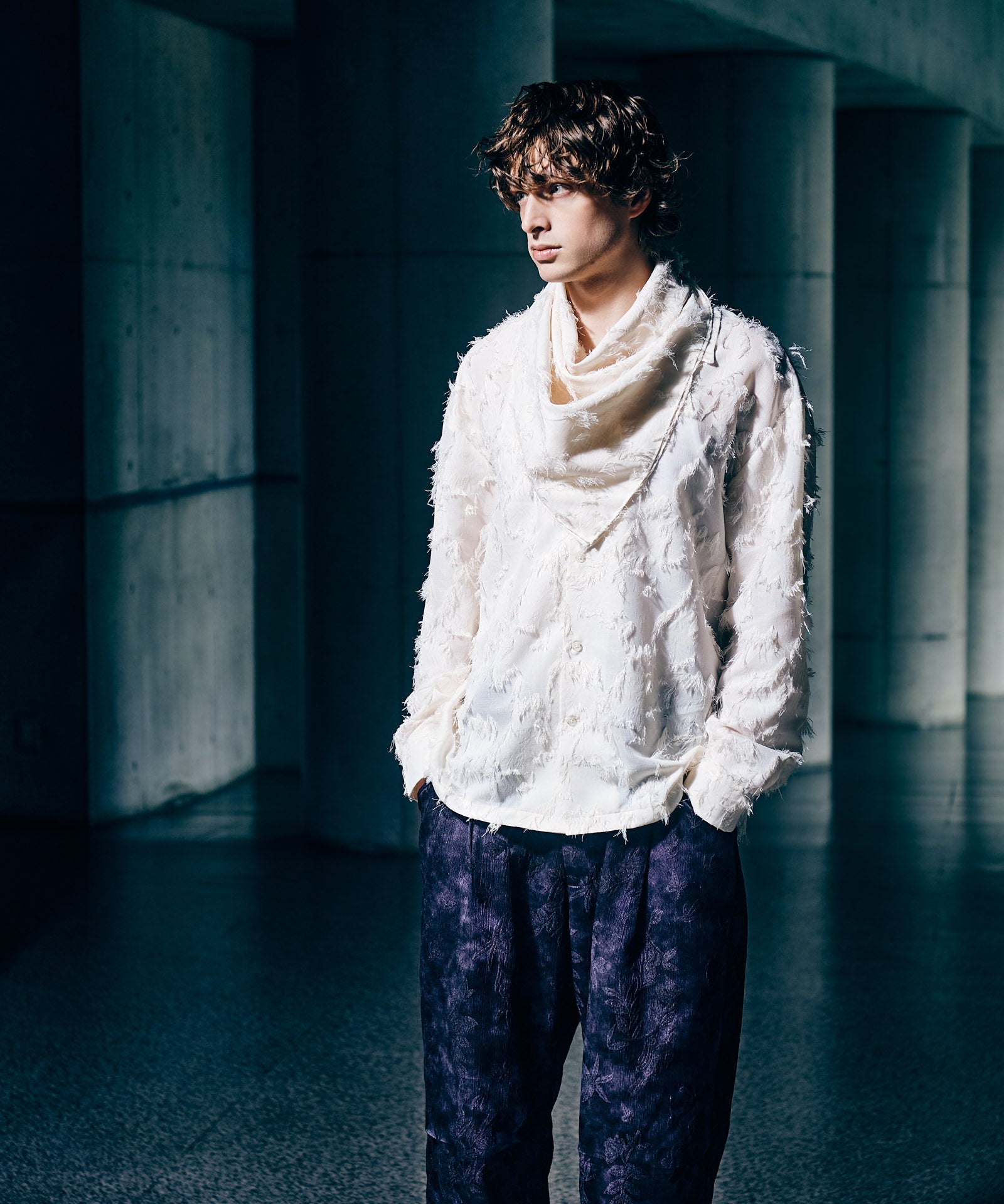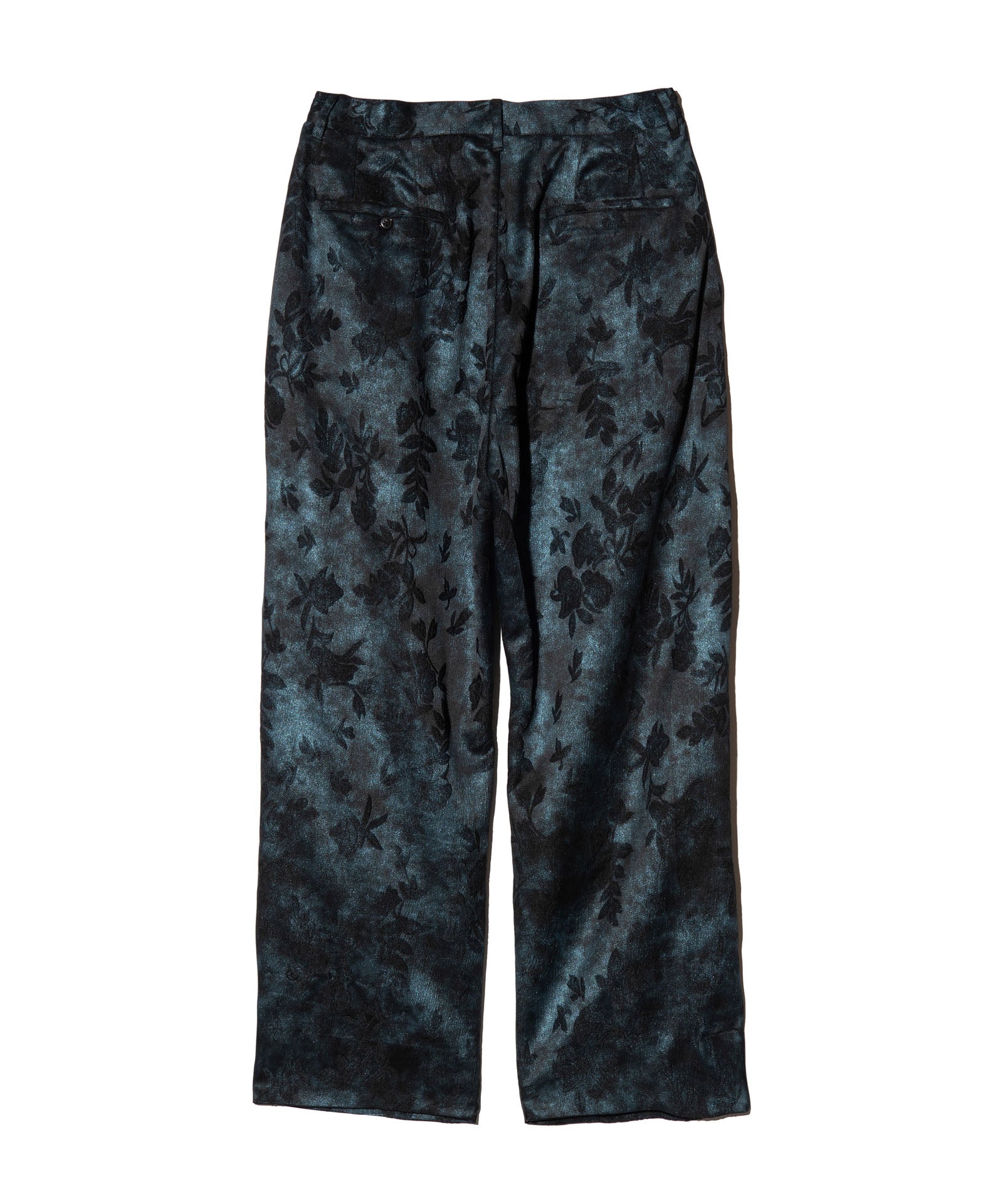 반짝이는 식물 바지는 계절을 화려한 직물로 포착하는 식물 패턴을 결합하여 글램 바위 느낌을주는 고급스러운 바닥 스타일을 만듭니다. 섬유에 사용 된 직물은 가공 된 직물이었으며,이 패턴은 신체 직물에 패턴을 꿰매고 페인트를 무작위로 뿌려서 광택 마감 처리했습니다. 착용자의 움직임에 따라 반짝이는 질감을 즐기십시오. 실루엣은 허리에 1 개의 턱과 무릎에 두 개의 턱이있는 3 차원 버기 스타일입니다. 이번 시즌, 우리는 또한 같은 직물로 만든 반짝이는 식물 알로하 셔츠를 가지고 있으며 세트로 착용 할 수 있습니다.