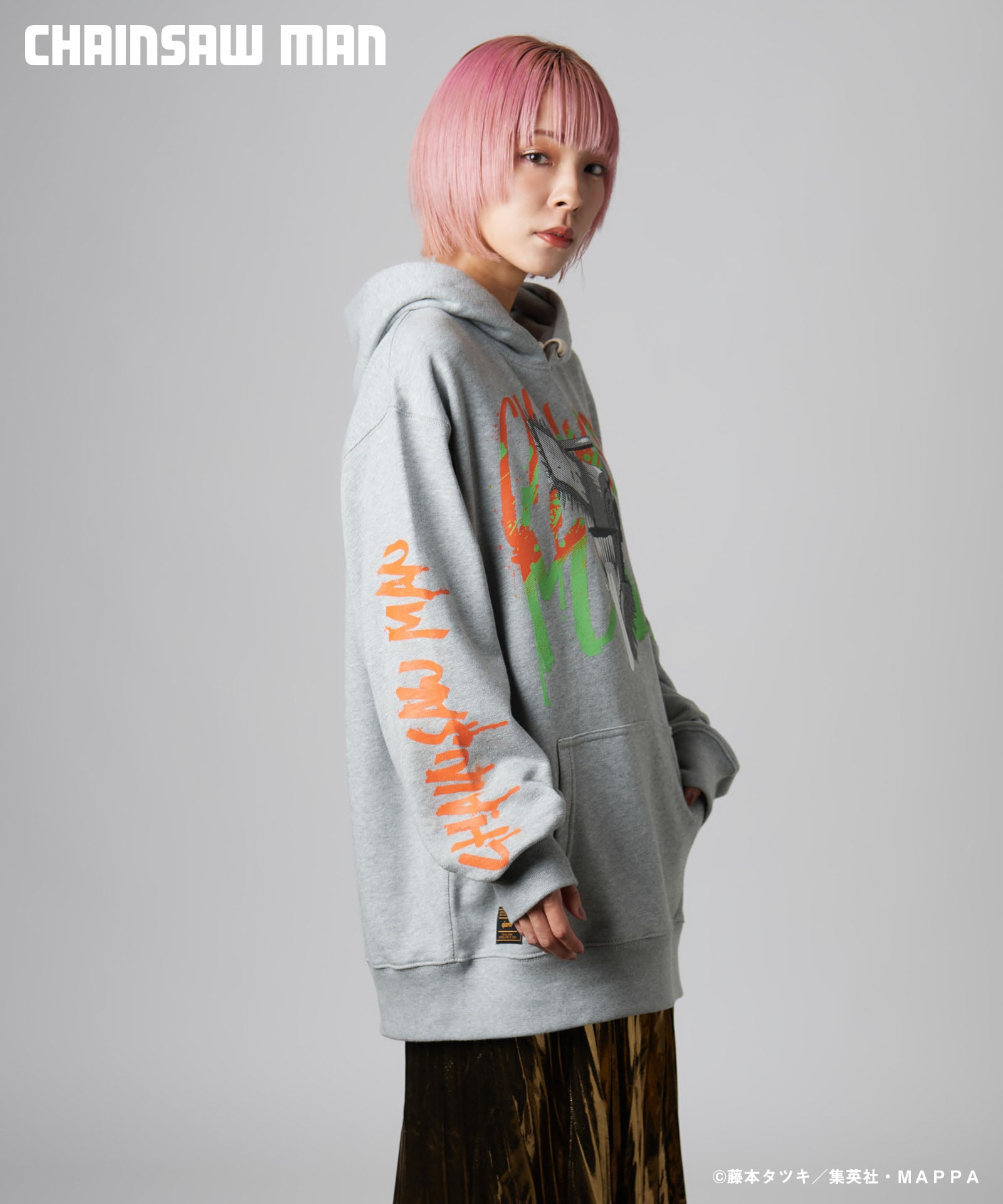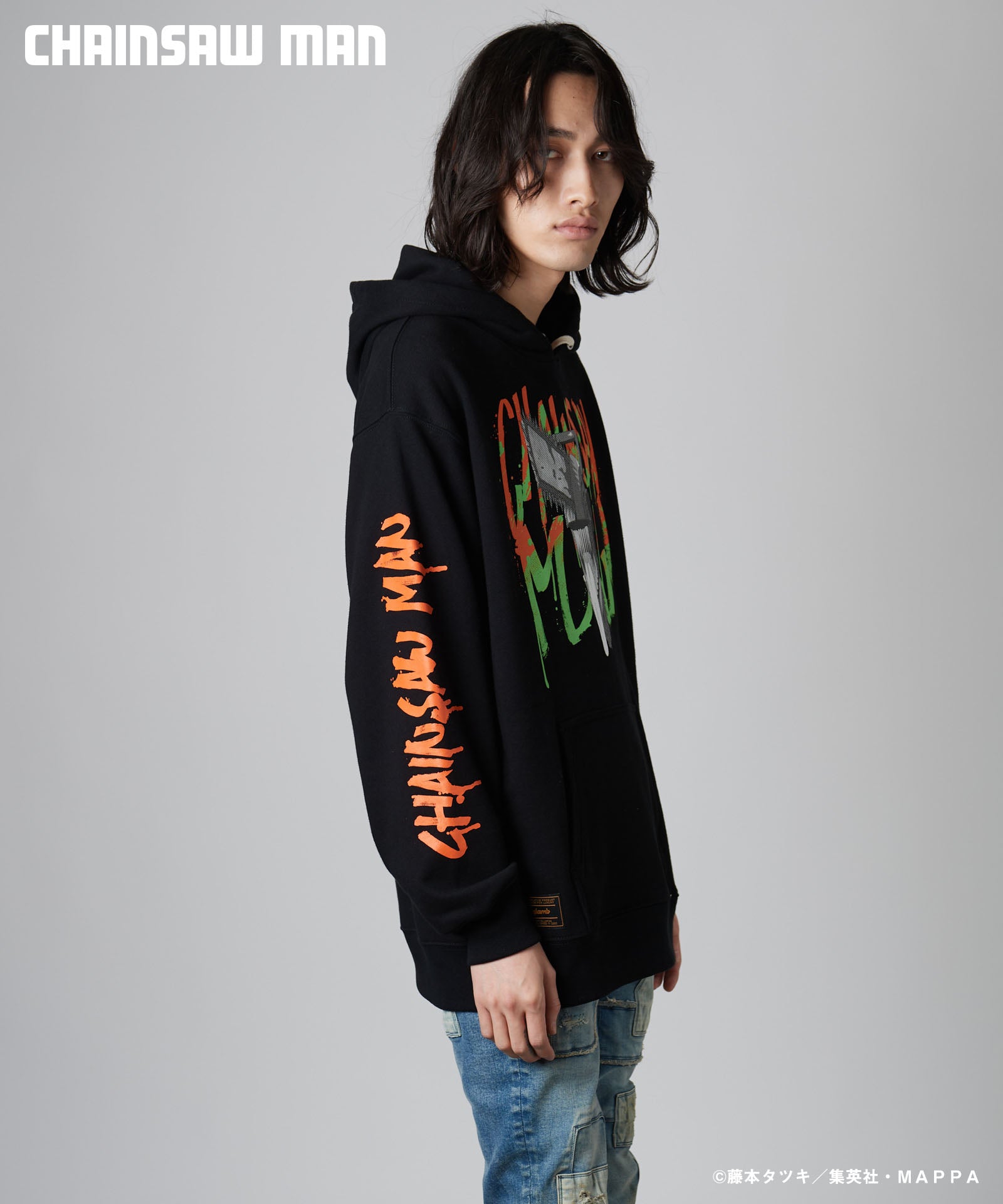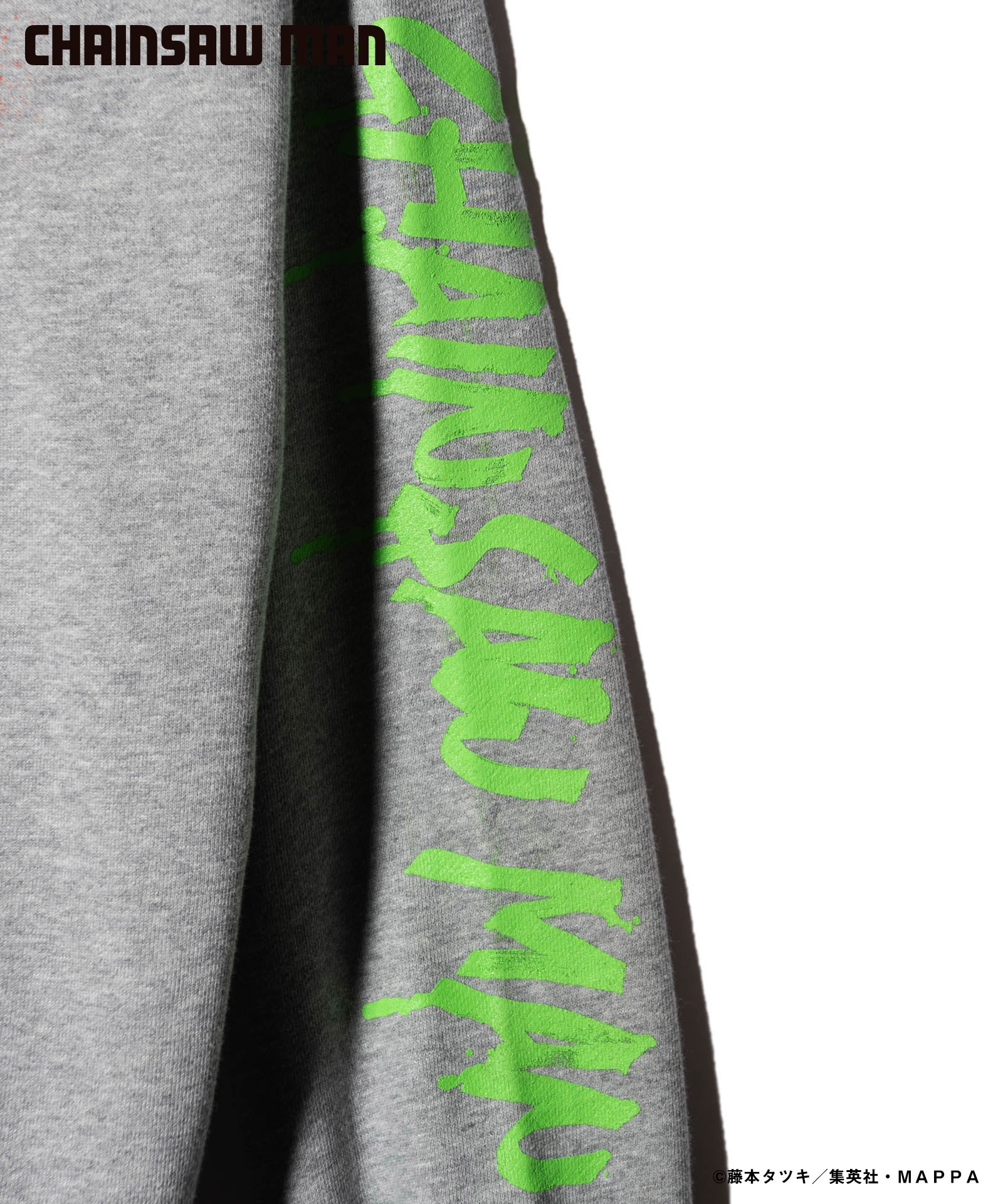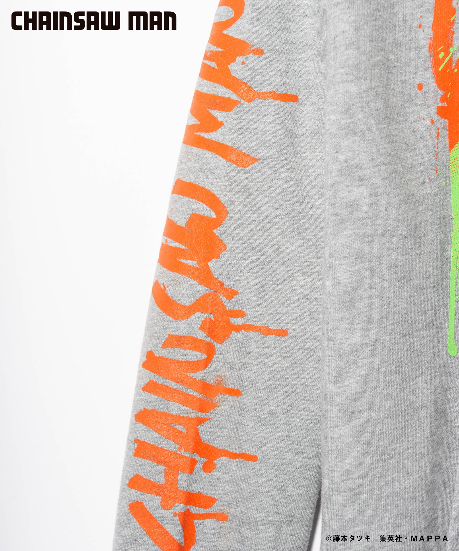 ボディ中央に配されたのはハードコアな造形を持つキャラクターの頭部。作中におけるチェンソーマンのダイナミクスを表現すべく、キャラクター名をヴィヴィッドな2色カラーリングでハンドペイント風にプリント。同プリントはアームにも2色それぞれをアシンメトリックに施しており、身頃全体でストリートアートをまとうかの佇まいを生み出します。