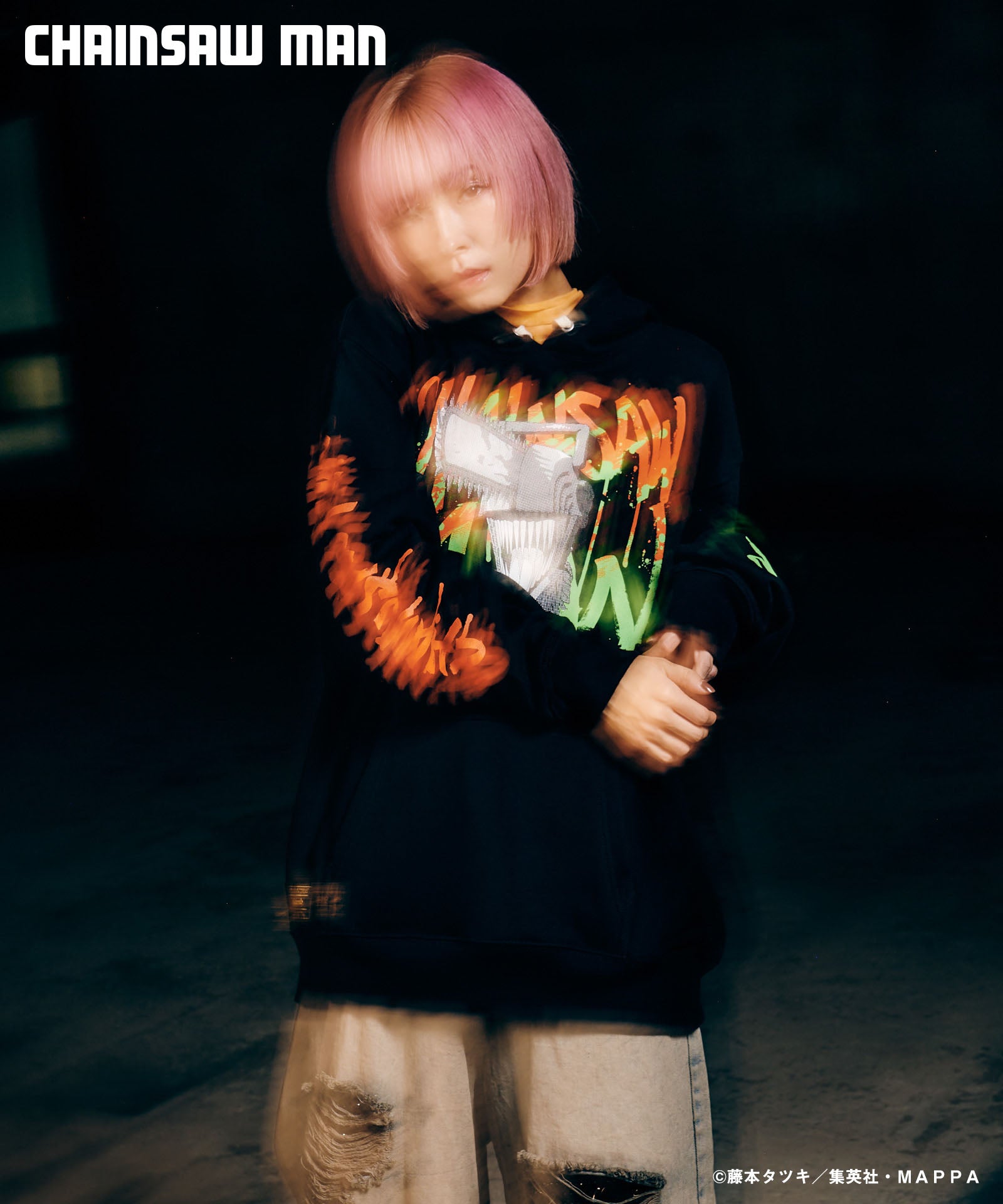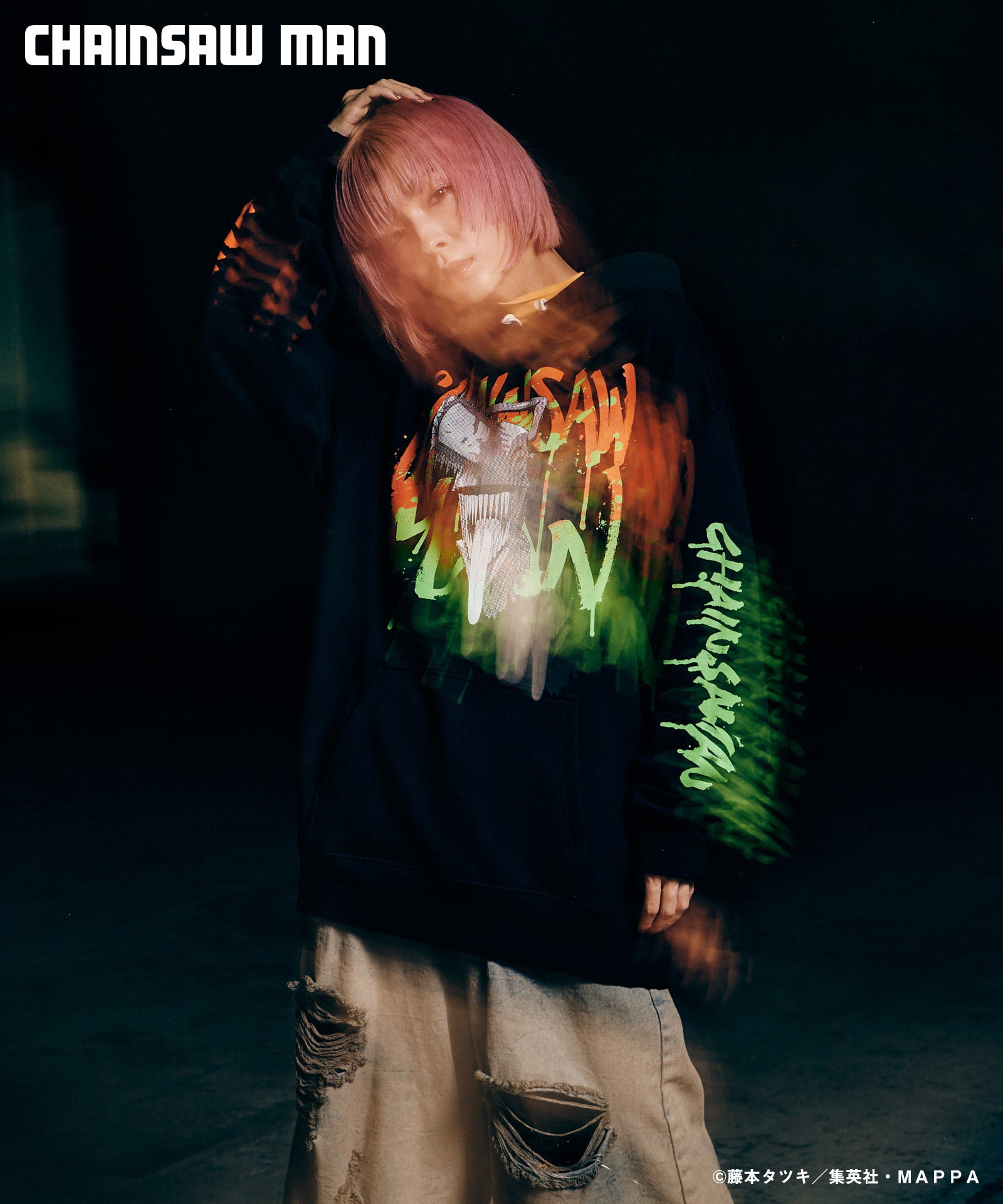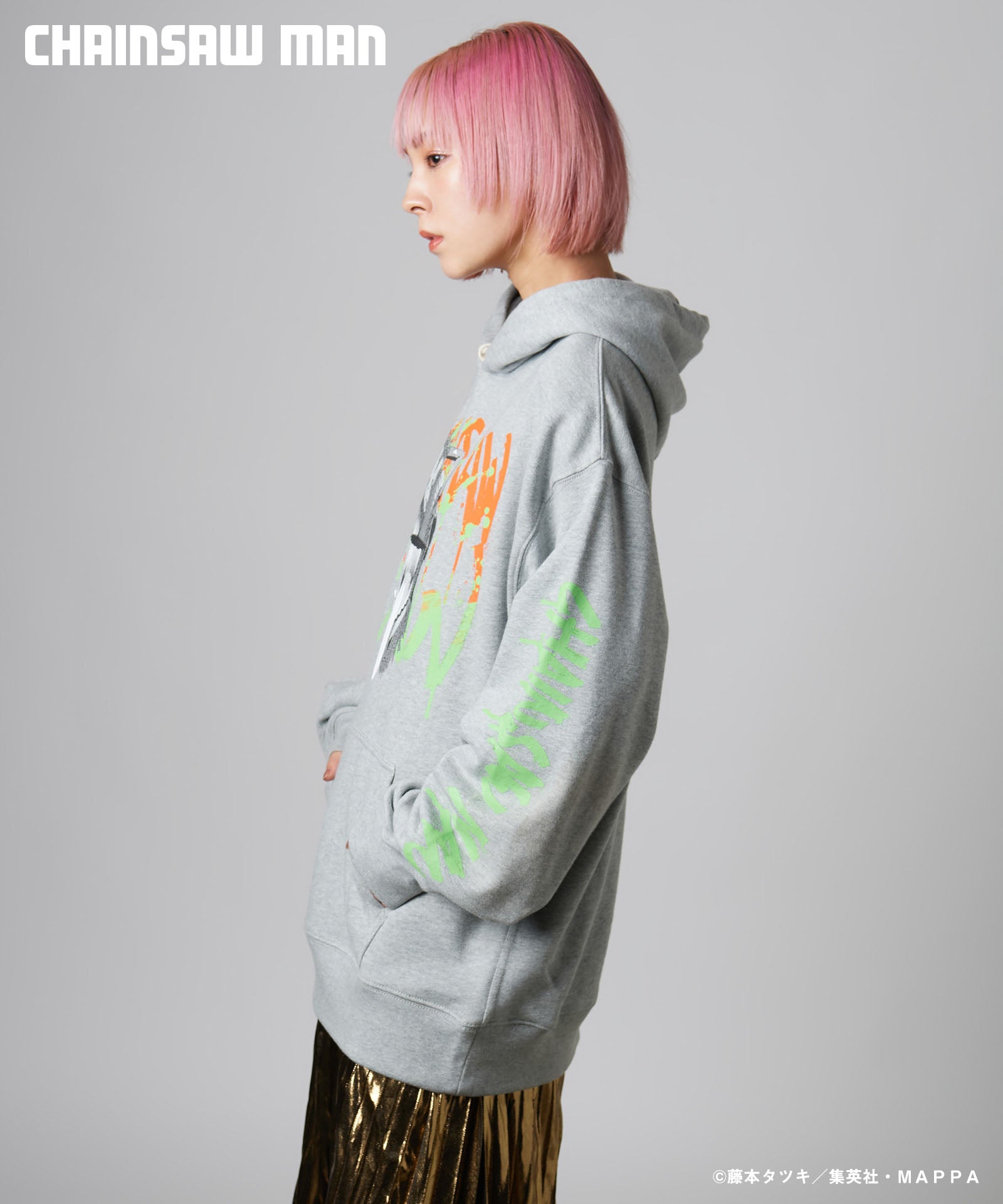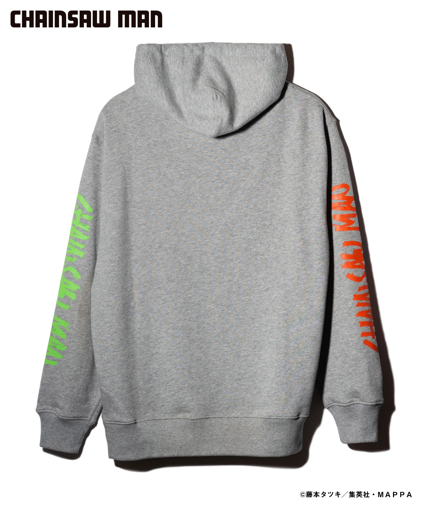 ボディ中央に配されたのはハードコアな造形を持つキャラクターの頭部。作中におけるチェンソーマンのダイナミクスを表現すべく、キャラクター名をヴィヴィッドな2色カラーリングでハンドペイント風にプリント。同プリントはアームにも2色それぞれをアシンメトリックに施しており、身頃全体でストリートアートをまとうかの佇まいを生み出します。