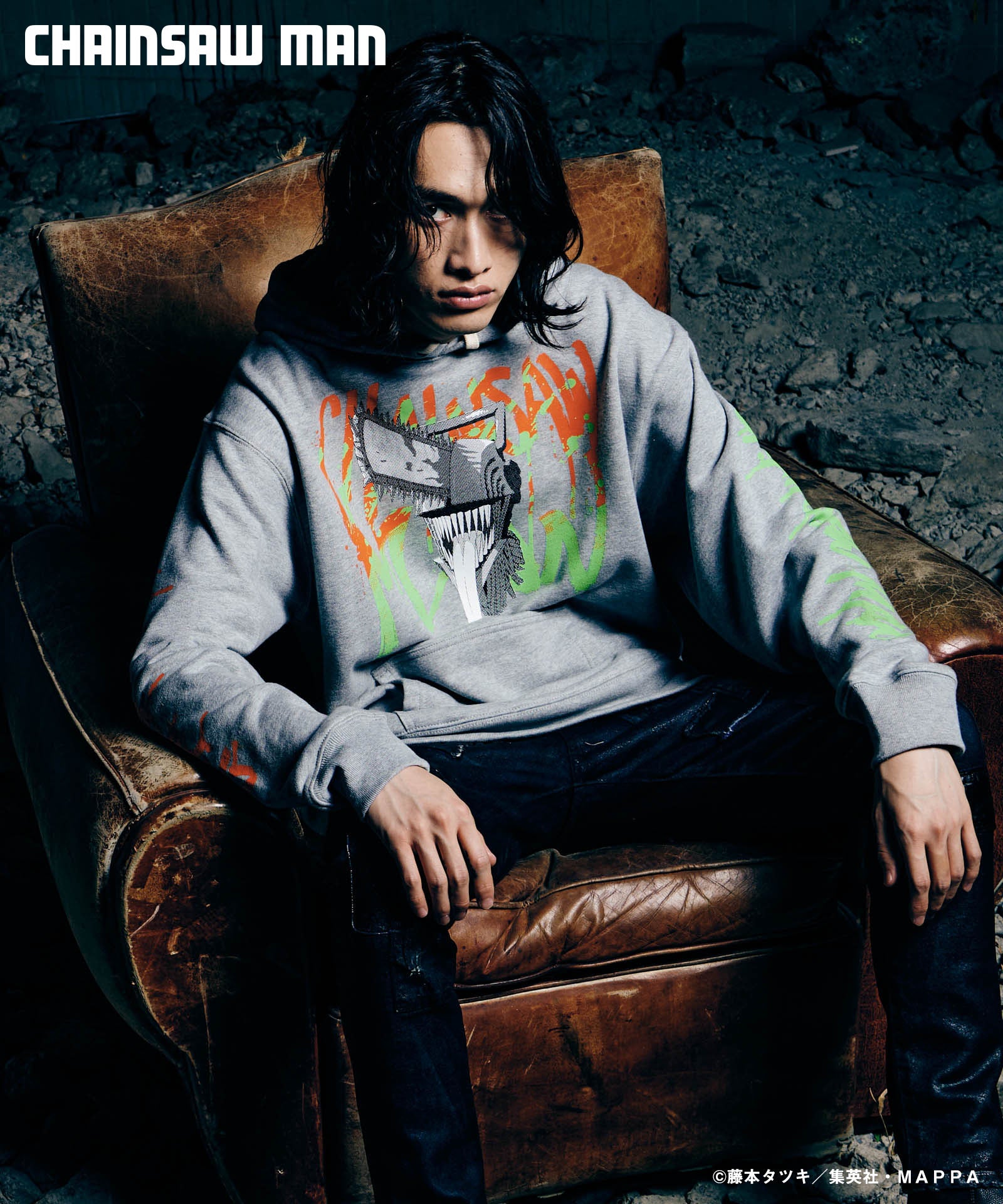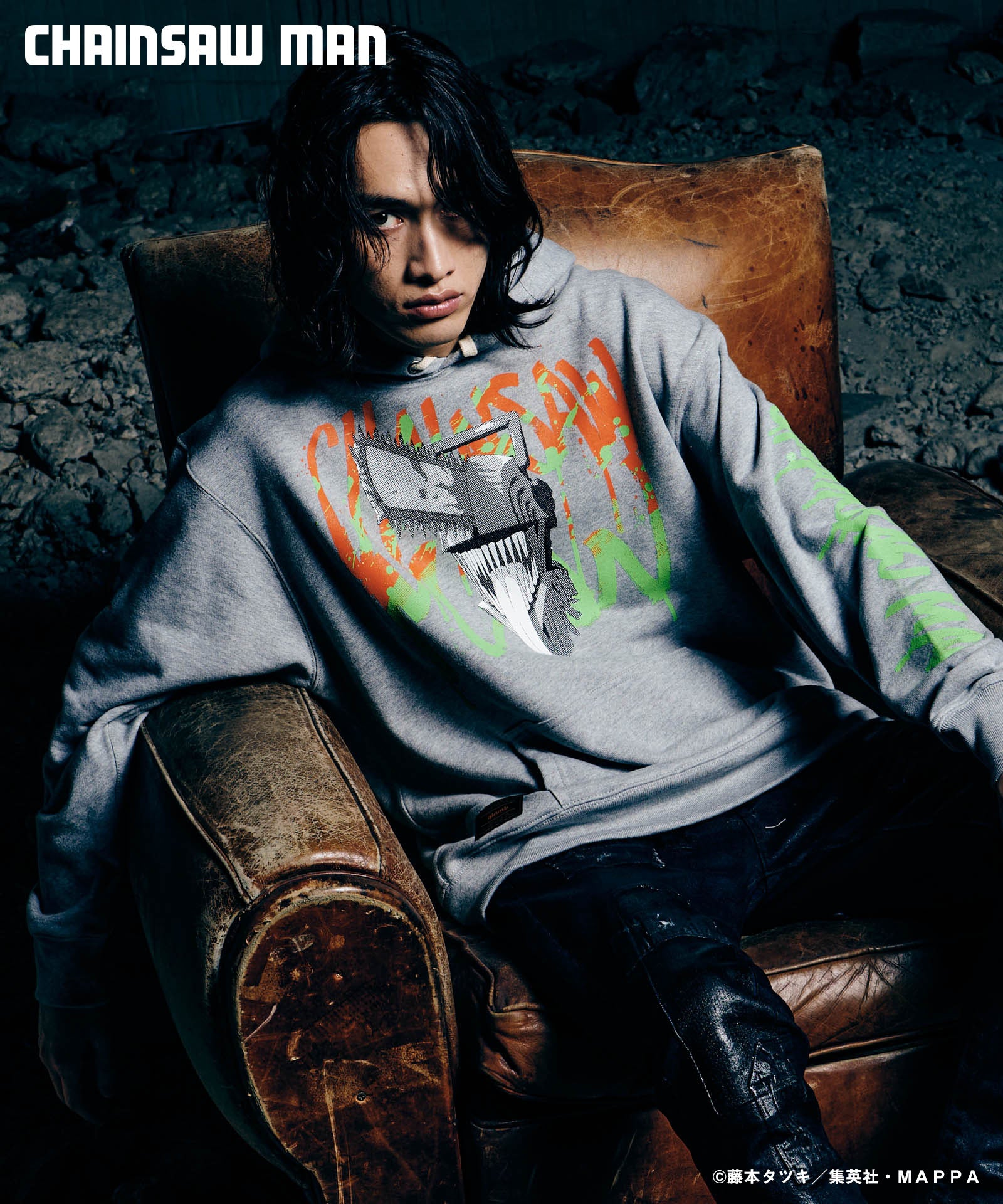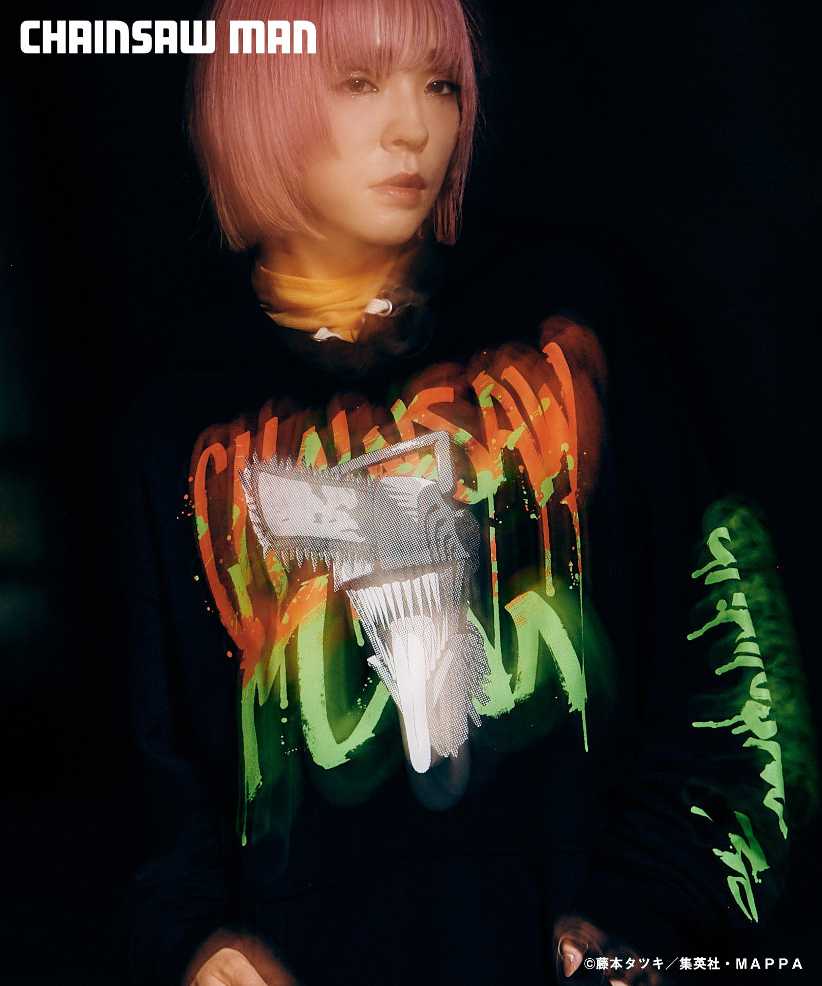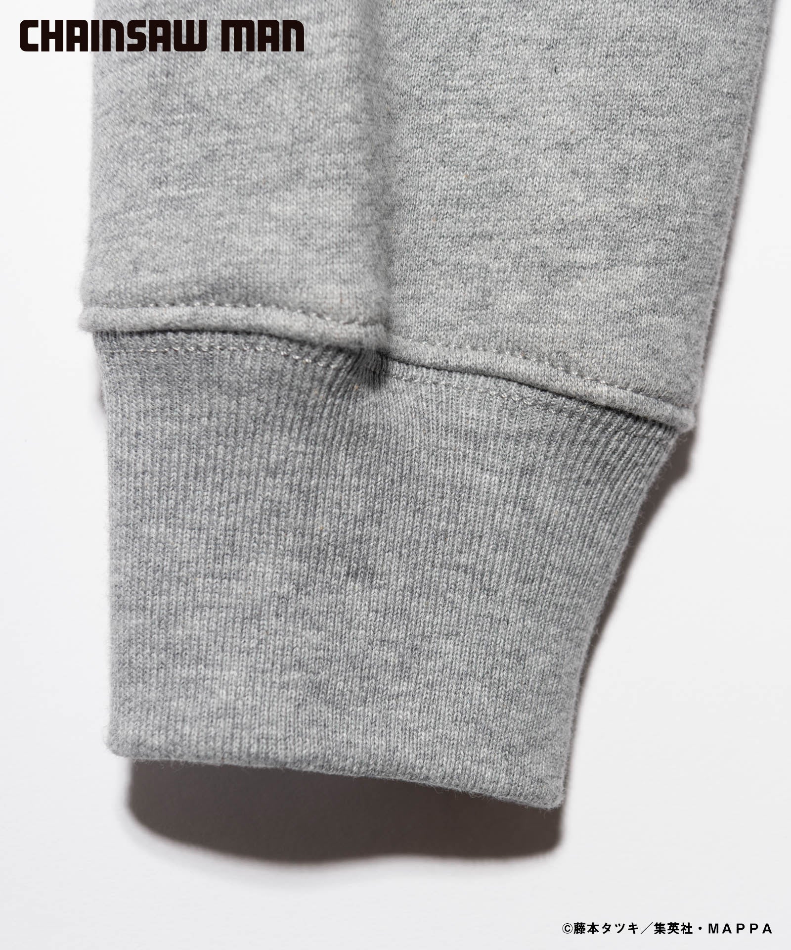ボディ中央に配されたのはハードコアな造形を持つキャラクターの頭部。作中におけるチェンソーマンのダイナミクスを表現すべく、キャラクター名をヴィヴィッドな2色カラーリングでハンドペイント風にプリント。同プリントはアームにも2色それぞれをアシンメトリックに施しており、身頃全体でストリートアートをまとうかの佇まいを生み出します。