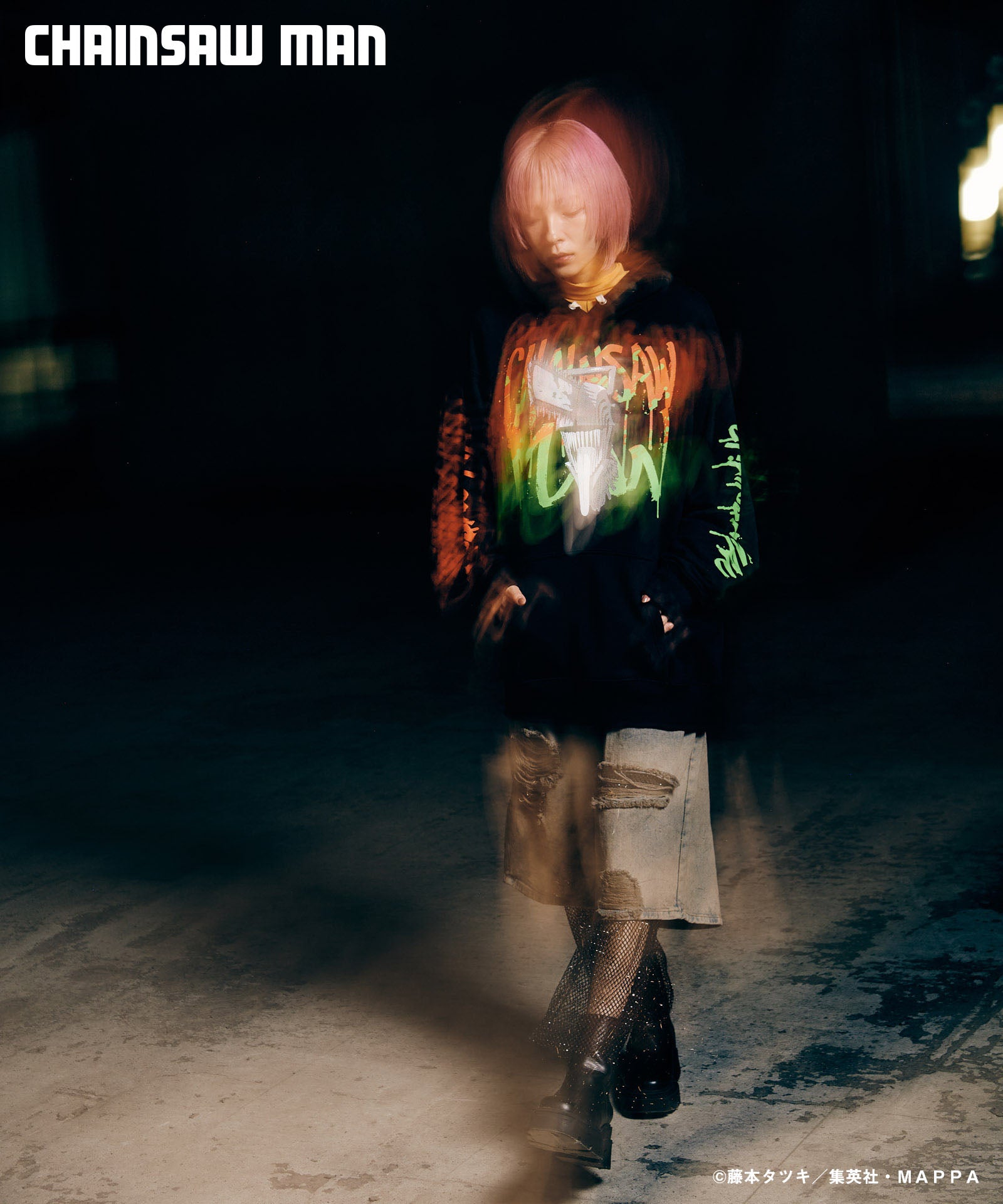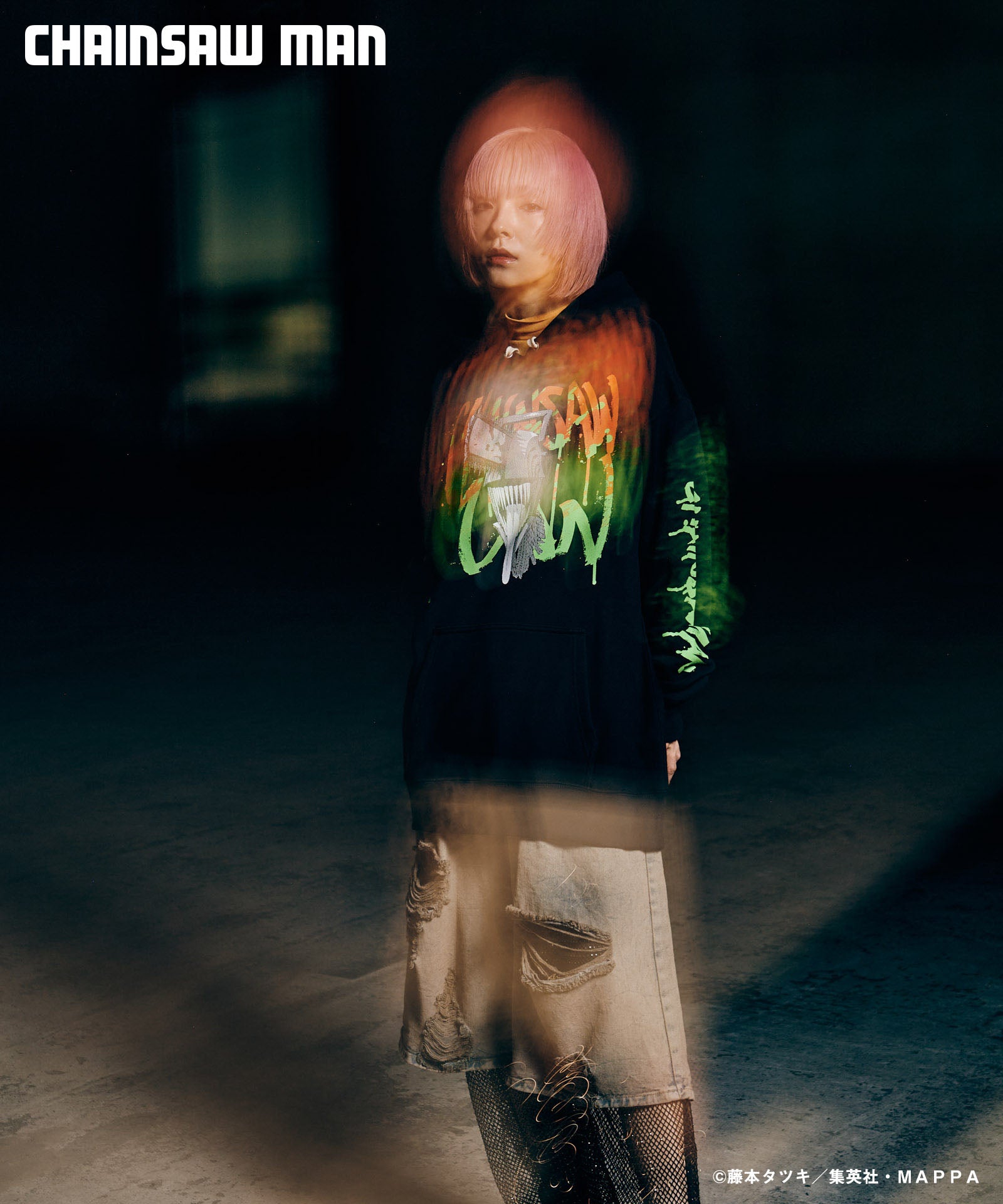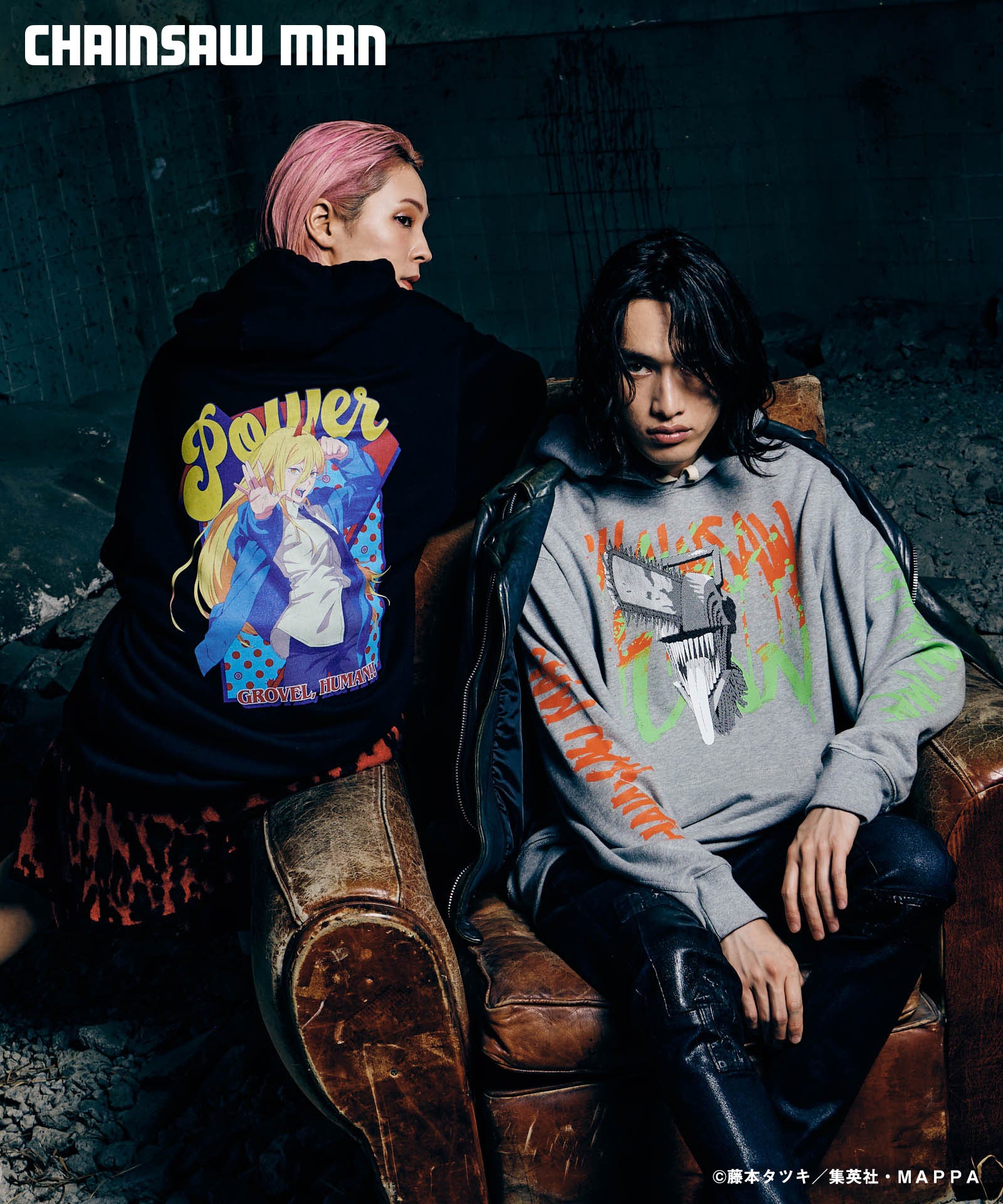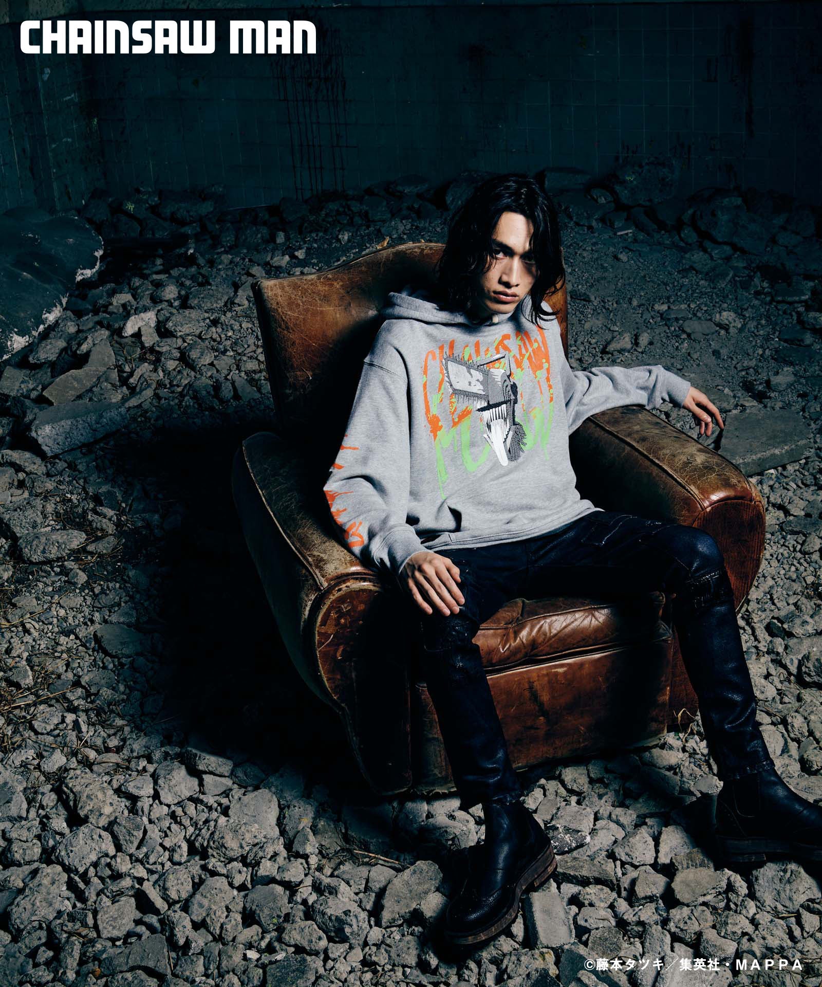ボディ中央に配されたのはハードコアな造形を持つキャラクターの頭部。作中におけるチェンソーマンのダイナミクスを表現すべく、キャラクター名をヴィヴィッドな2色カラーリングでハンドペイント風にプリント。同プリントはアームにも2色それぞれをアシンメトリックに施しており、身頃全体でストリートアートをまとうかの佇まいを生み出します。