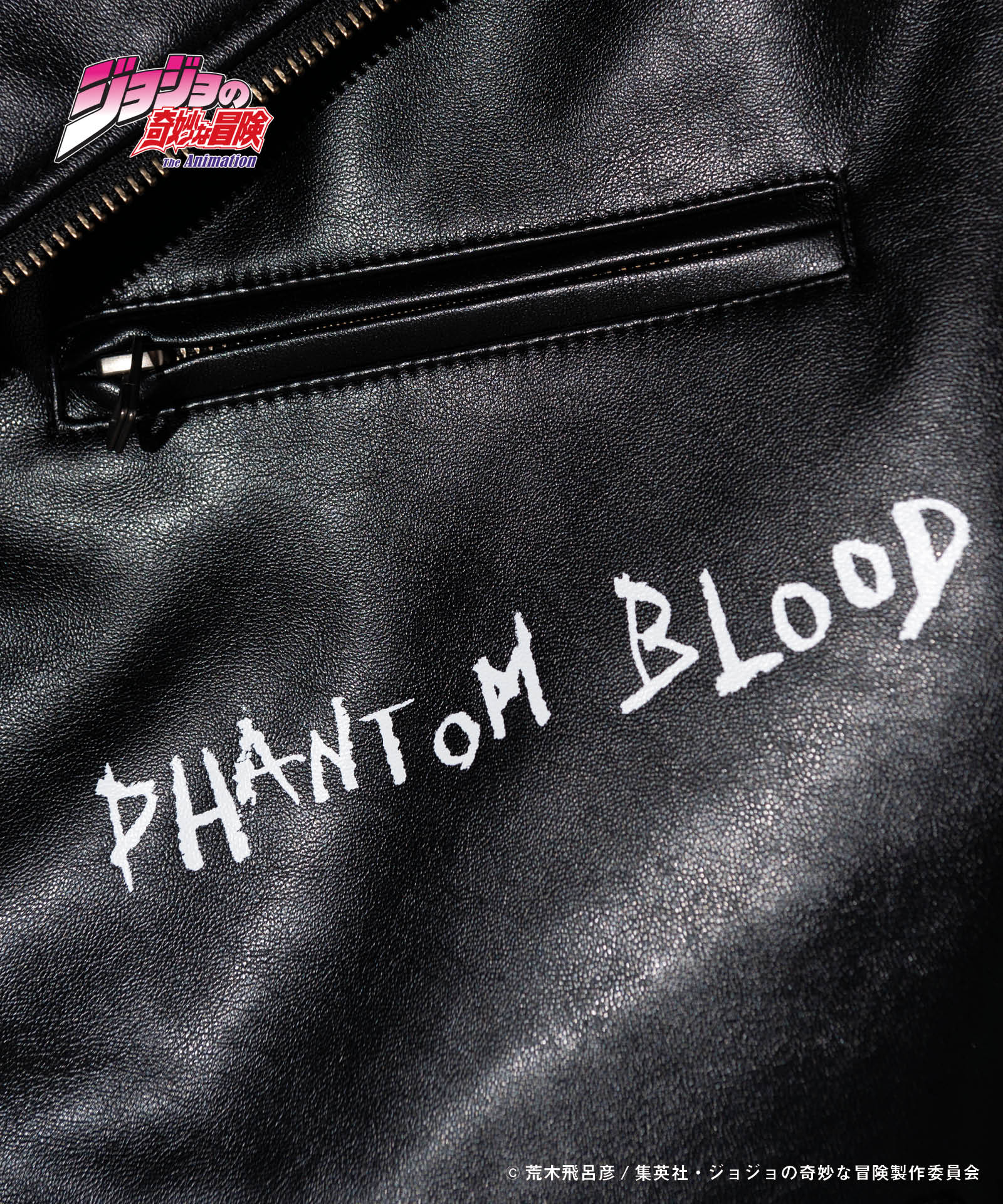 バックスタイルにあしらったのは怪文書風の書体でコラージュされた石仮面のモチーフ。使用法の図解にはニューペインティングを思わせるプリミティブなタッチの意匠やタイポグラフィを用いて、石仮面のまとう神秘的なムードを表現しました。フロントではバックスタイルと同様の文字使いで『PHANTOM BLOOD』のテキストを配して身頃全体で作品の世界観をデザイン。ボディには艶やかなシンセティックレザーを用いて、古代的なモチーフと現代的な素材使いを掛け合わせたハイブリッドな佇まいにまとめています。