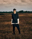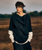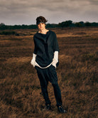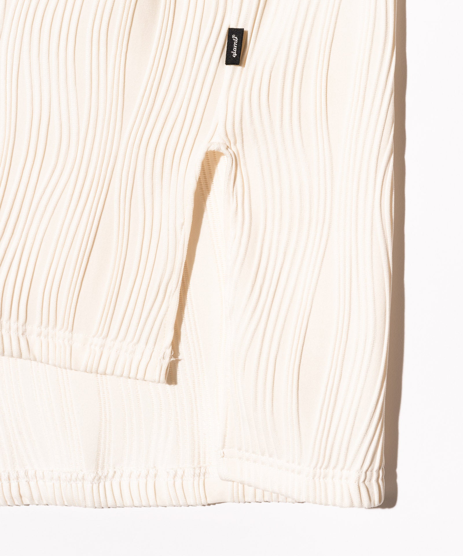 glambのコレクションで人気を博してきたパターンワークとテキスタイルを融合しスプリングスタイルに提案するSTUNN Willow Crepe Cutsew。胸位置に生まれるドレープは、前身頃をワイドに設定しながら後ろ身頃に寄せることで構築したもの。シルエットは着丈を長めに、身幅を広めに設けたリラックスフィットとなっており、ボトムスを選ばずスタイリングを整えてくれます。テキスタイルに用いたのは凹凸のある流線形のタックが刻まれた生地。編み針で網目を作り、さらに編み地に結び付けるという丹念な工程によって奥行のある畝を形作っています。