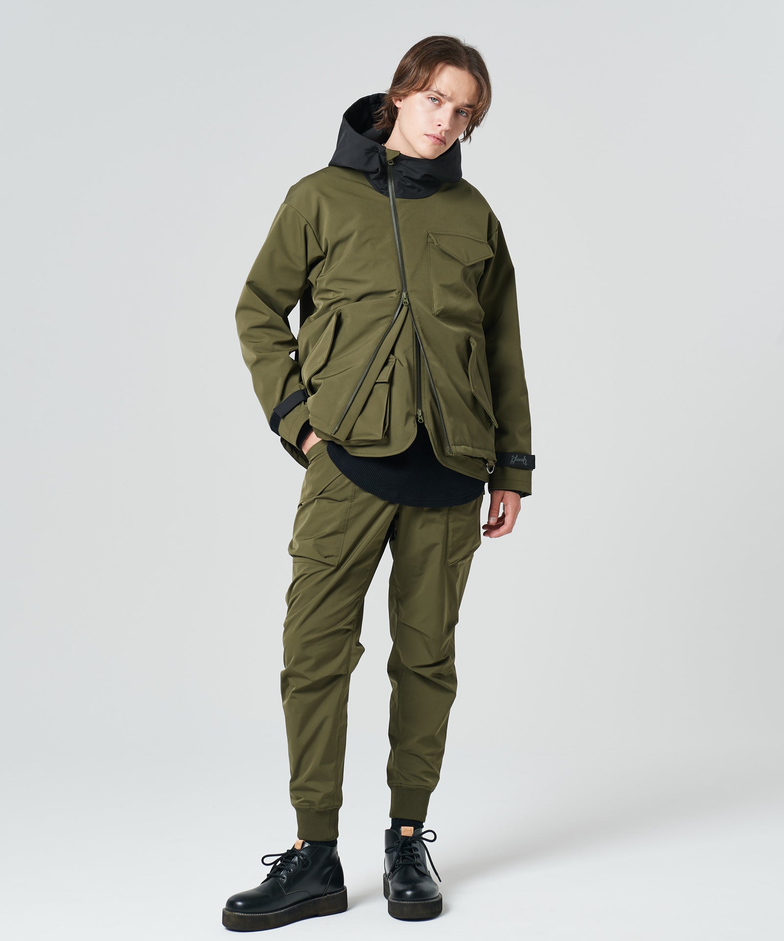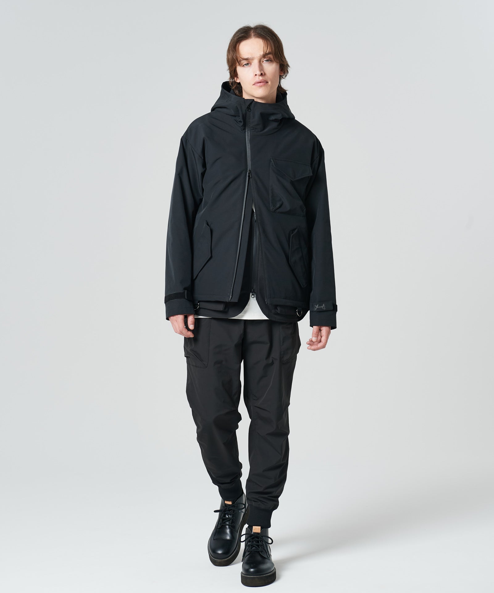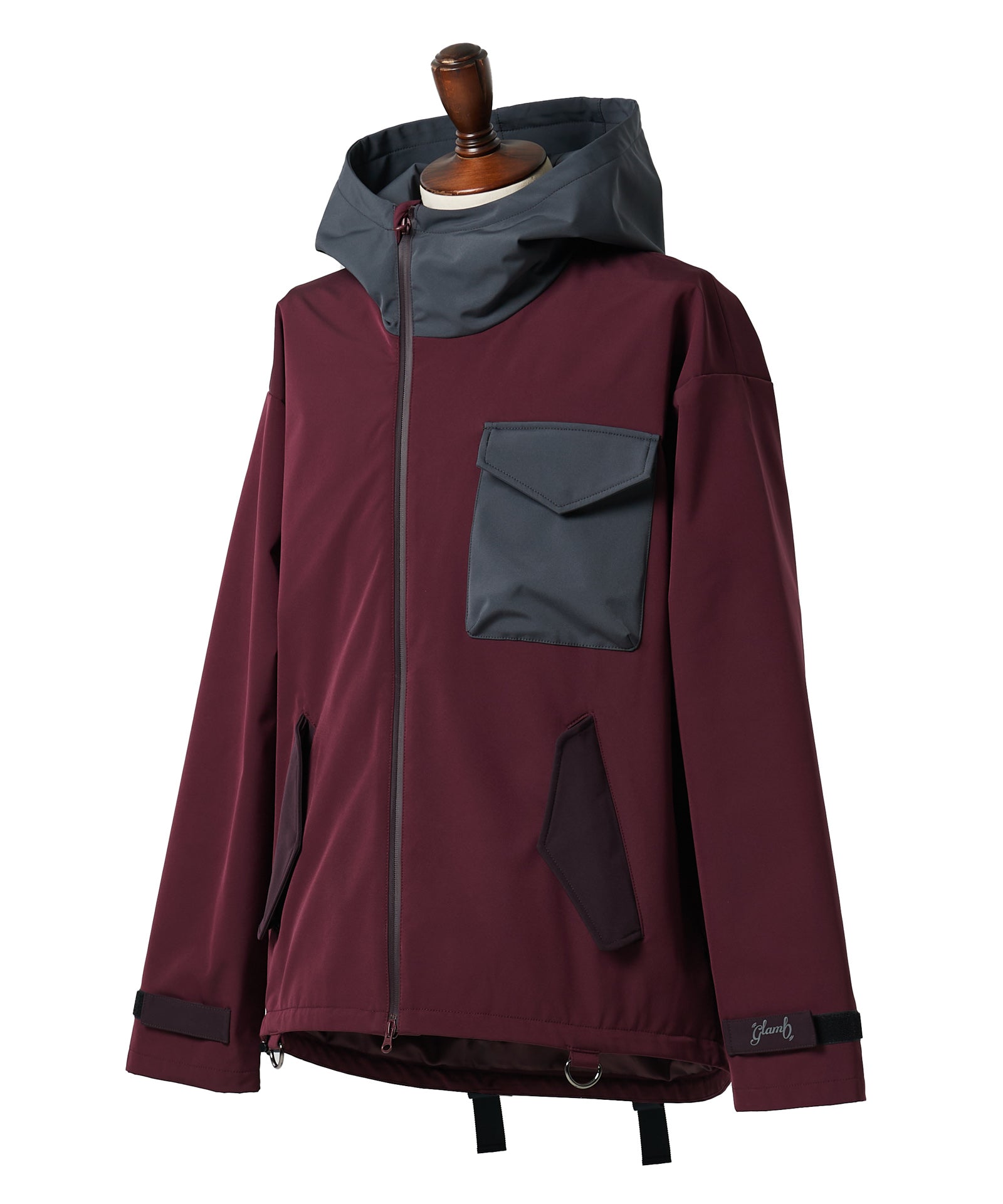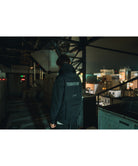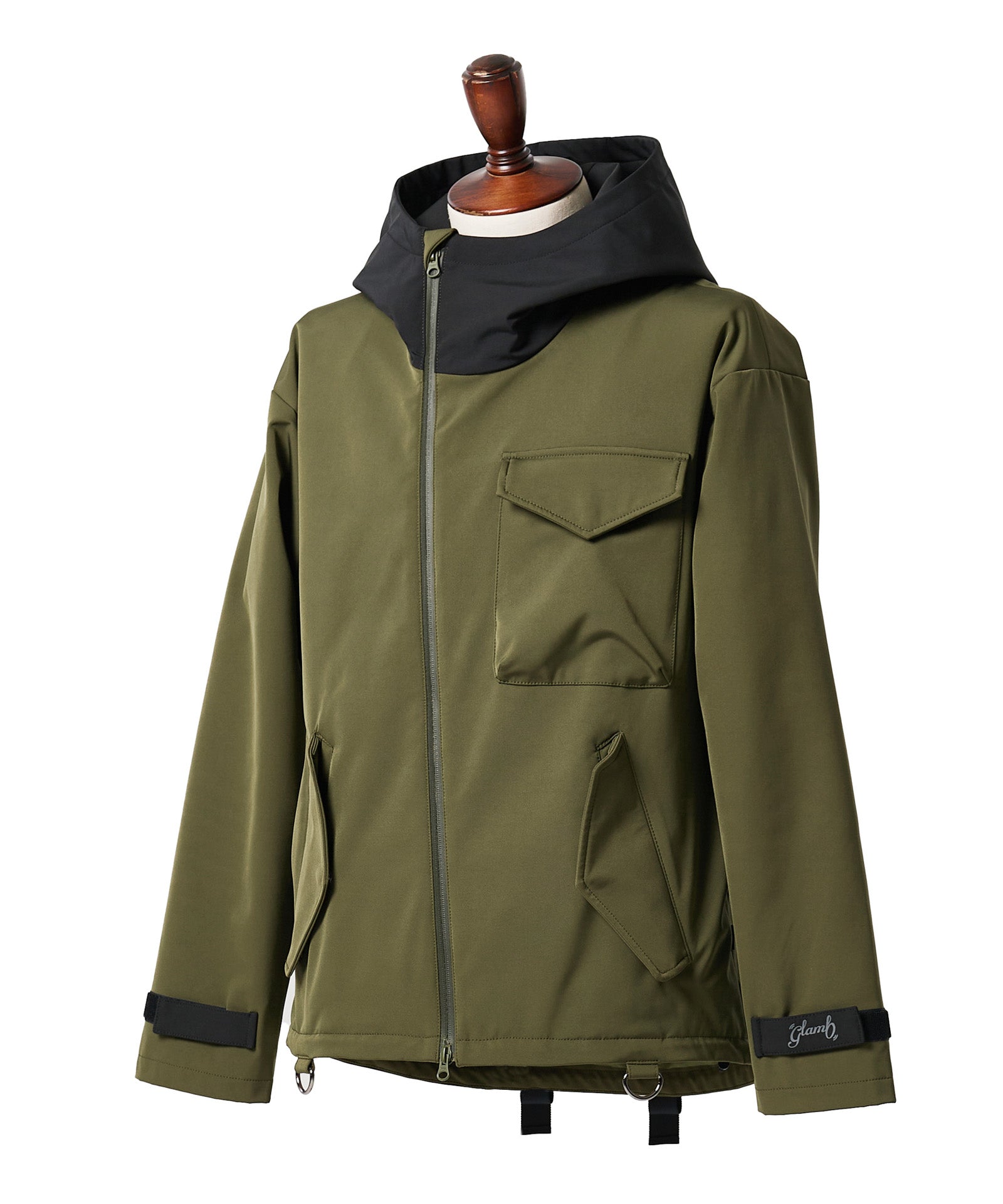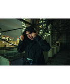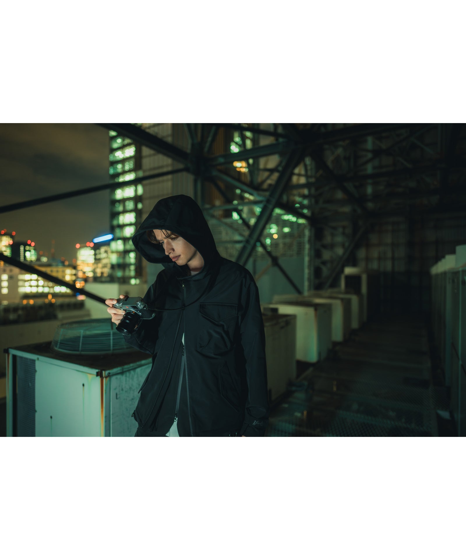 東京の夜を撮り続ける写真家JUNYA WATANABEとのコラボレーションとなるJW Hooded Field Jacketはアウトドアユースのユーティリティをモードデザインに散りばめた一着。撥水加工を施したボディはエステルテキスタイルを2重にボンディングしたタフな仕上がり。フードを備えたハイネックまで止水ジップがアシンメトリーに分割し、エッジィなヴィジュアルを作り上げてます。フロントには撮影中に小物を収納する3つのポケットに加え、裾にはDカンも付属。バックスタイルには3ポケット仕様のハンティングポケットと傘などを留められるベルトも備え、クイックな機材の出し入れが求められるフォトグラファーのスタイルに応える仕上がりとなりました。雨風の侵入を防ぐ袖口のベルクロにはglambスピンロゴをリフレクタープリントしてアクセントに。気温の変化に応じた背中掛けを可能にするバックルベルトも内蔵しており、いかなるシーンにおいてもカメラを持つ手を塞ぐことはありません。