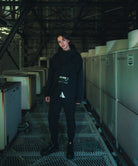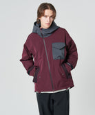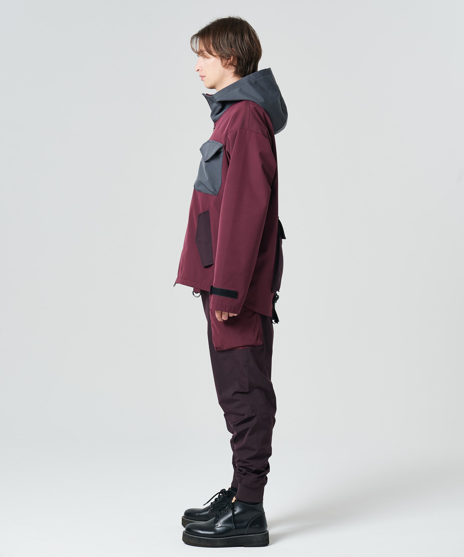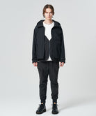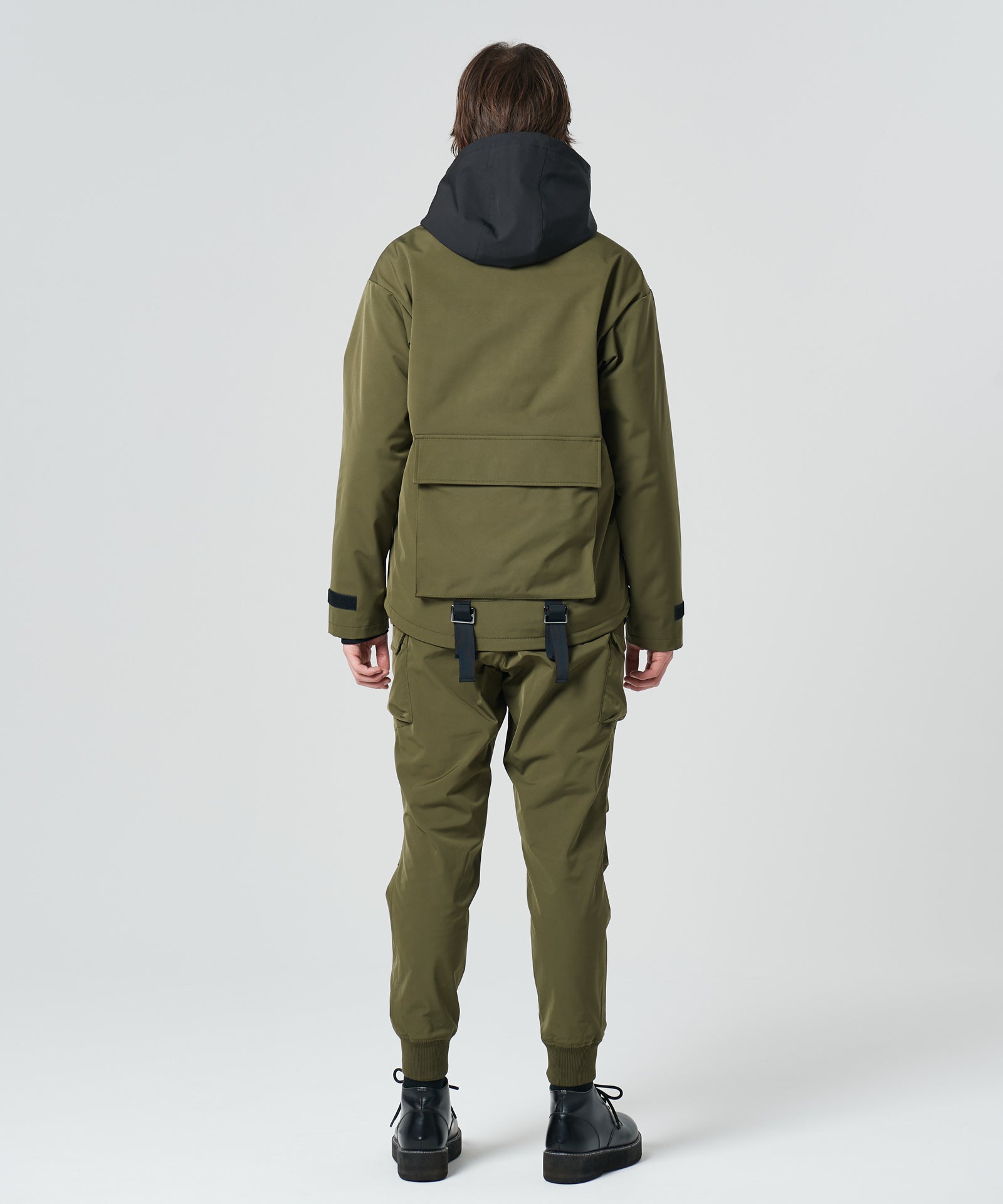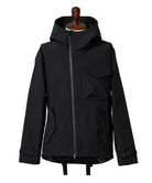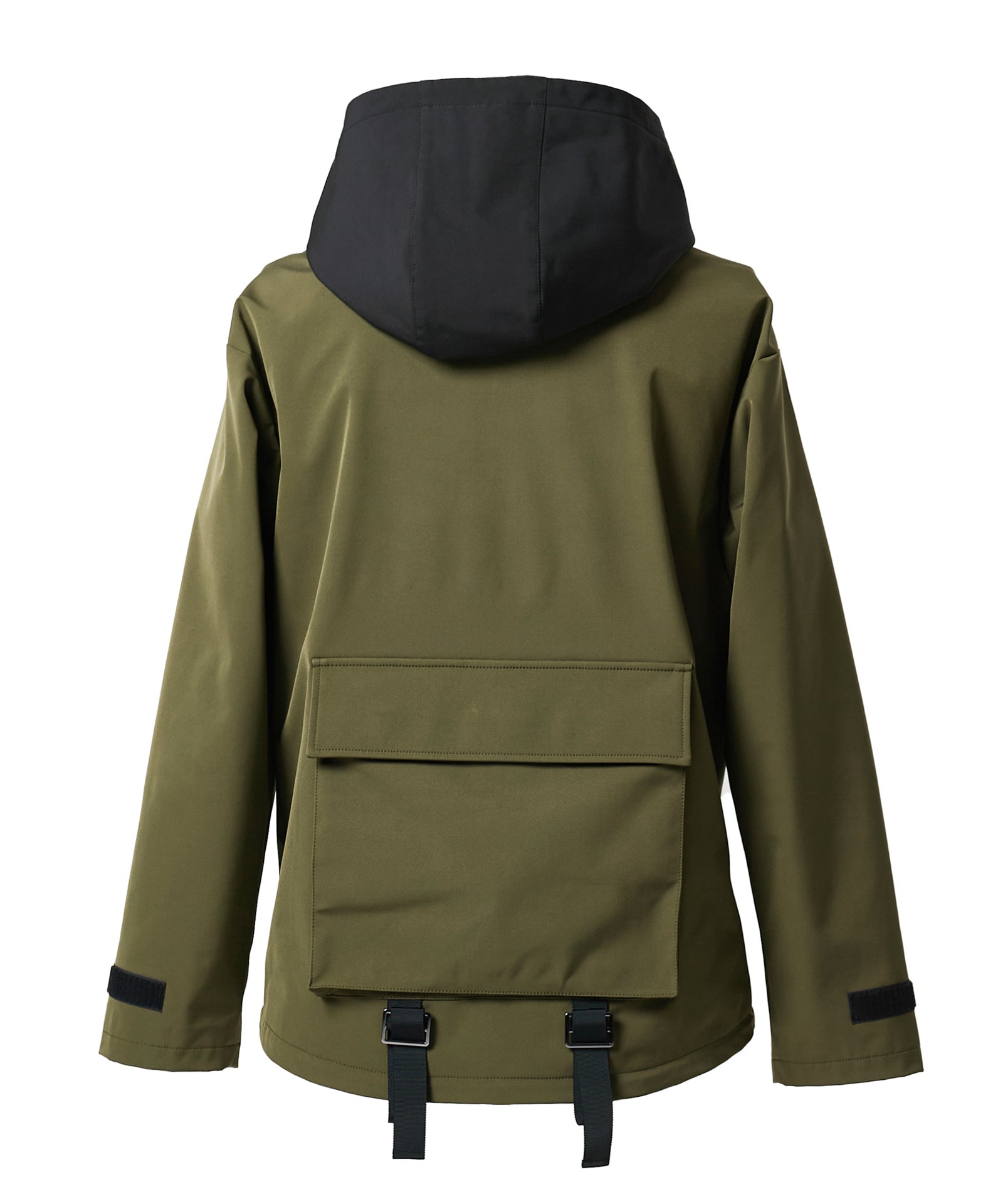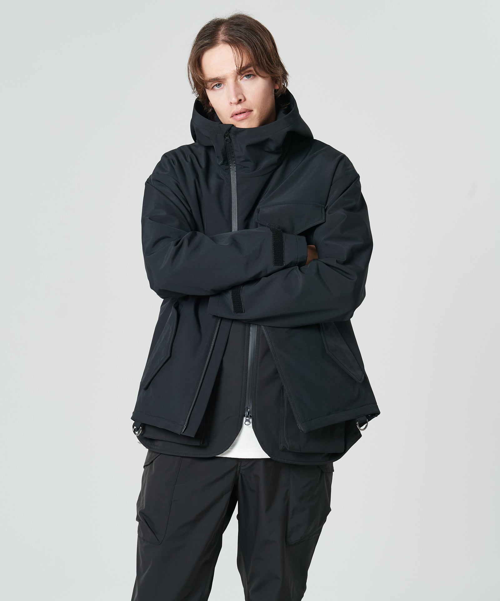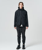 東京の夜を撮り続ける写真家JUNYA WATANABEとのコラボレーションとなるJW Hooded Field Jacketはアウトドアユースのユーティリティをモードデザインに散りばめた一着。撥水加工を施したボディはエステルテキスタイルを2重にボンディングしたタフな仕上がり。フードを備えたハイネックまで止水ジップがアシンメトリーに分割し、エッジィなヴィジュアルを作り上げてます。フロントには撮影中に小物を収納する3つのポケットに加え、裾にはDカンも付属。バックスタイルには3ポケット仕様のハンティングポケットと傘などを留められるベルトも備え、クイックな機材の出し入れが求められるフォトグラファーのスタイルに応える仕上がりとなりました。雨風の侵入を防ぐ袖口のベルクロにはglambスピンロゴをリフレクタープリントしてアクセントに。気温の変化に応じた背中掛けを可能にするバックルベルトも内蔵しており、いかなるシーンにおいてもカメラを持つ手を塞ぐことはありません。