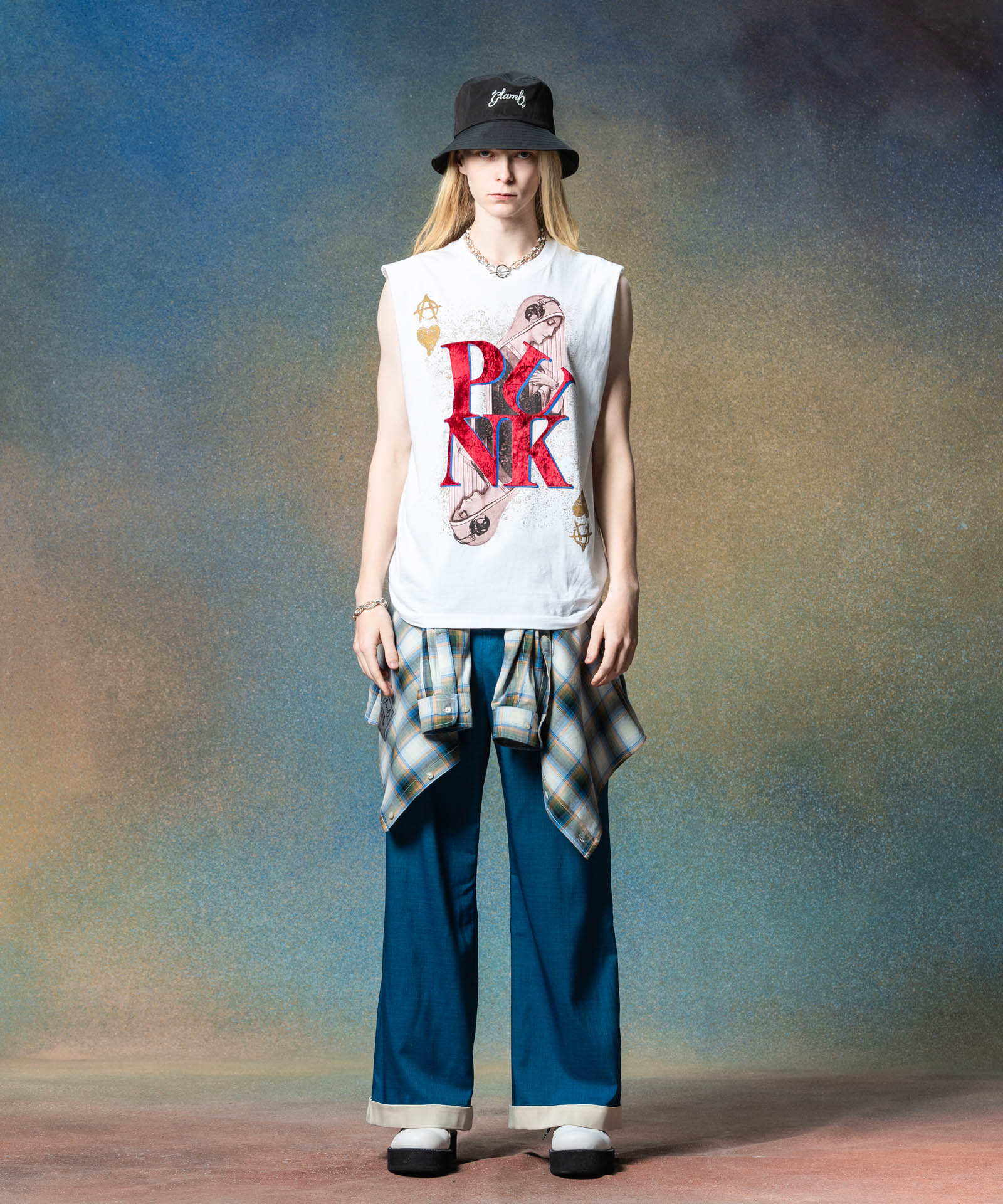 サマーシーズンを象徴するスリーブレスTシャツにglambのフィロソフィーを体現するPunk Prayer Tank Top。トランプの構図になぞらえてあしらわれたのはヘッドフォンを装着して祈る女性。その周囲にはラバーインクとベロアボンディングの2層であしらった“PUNK”ロゴ、金泥インクを用いたモチーフ柄をあしらって、ラグジュアリーなテクスチャを作り上げました。テキスタイルにはコットン100%の5.6オンス天竺を使用。ルーズなフィッティングに設定しており、単体でもスタイルある佇まいにまとめてくれます。
