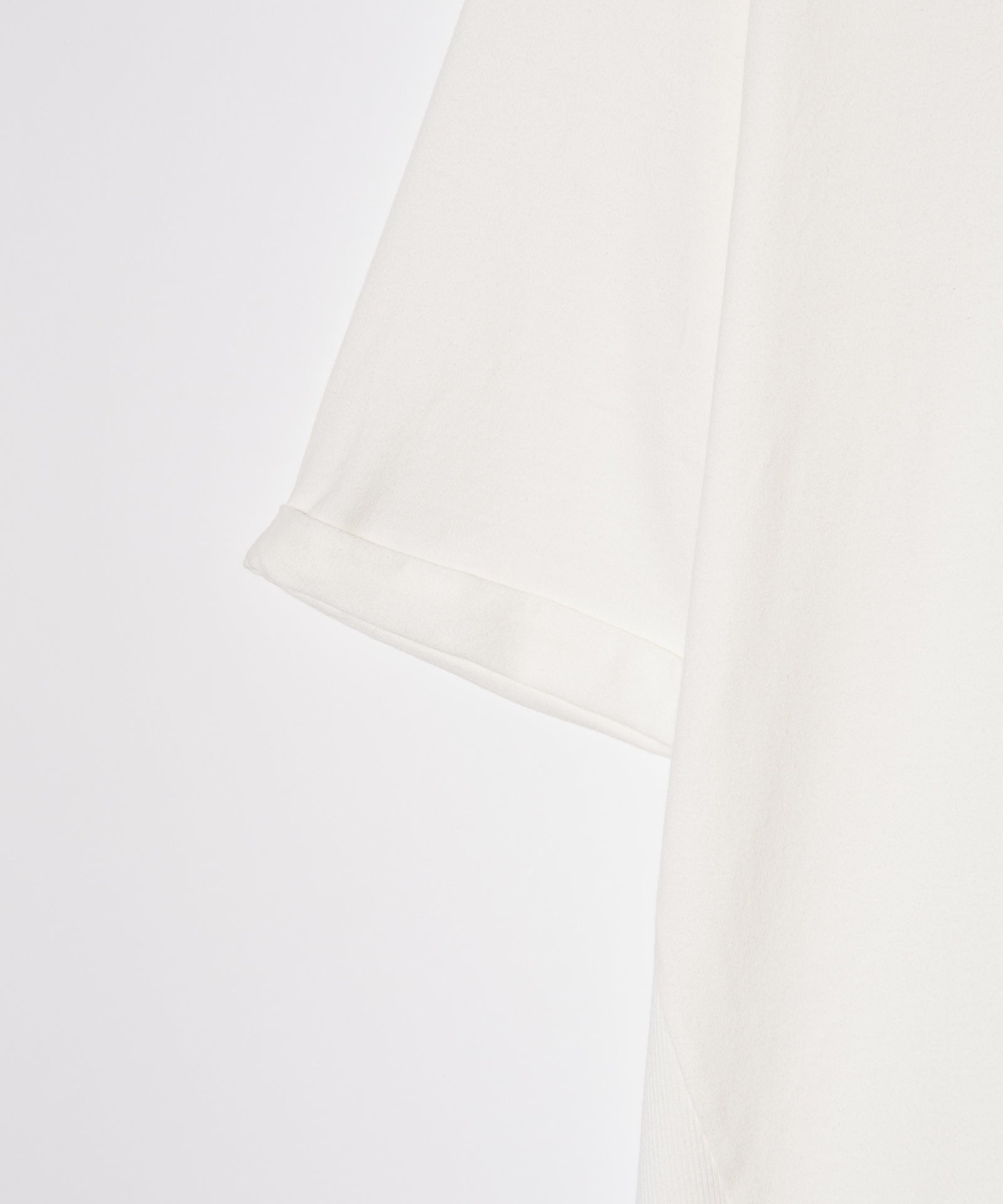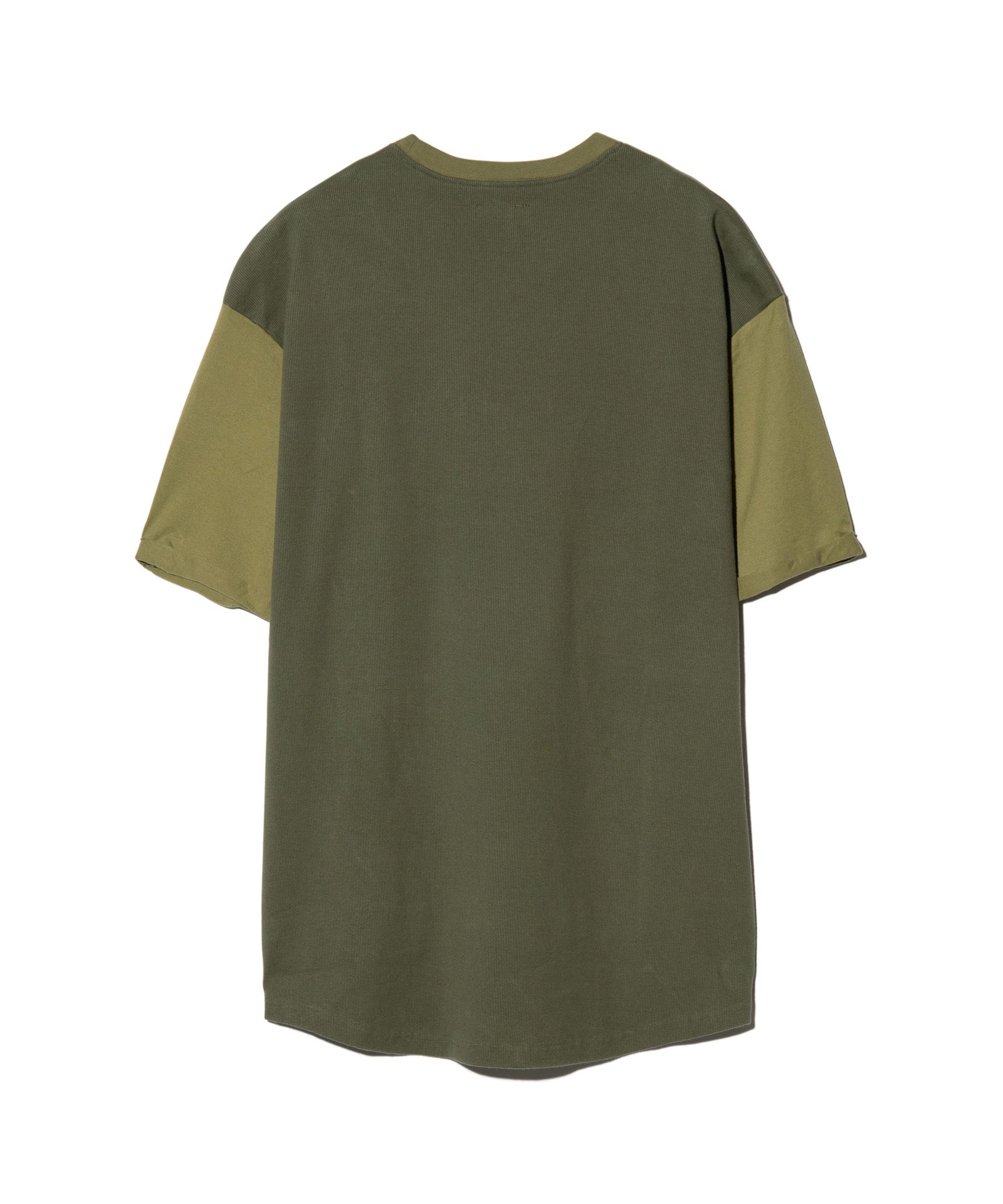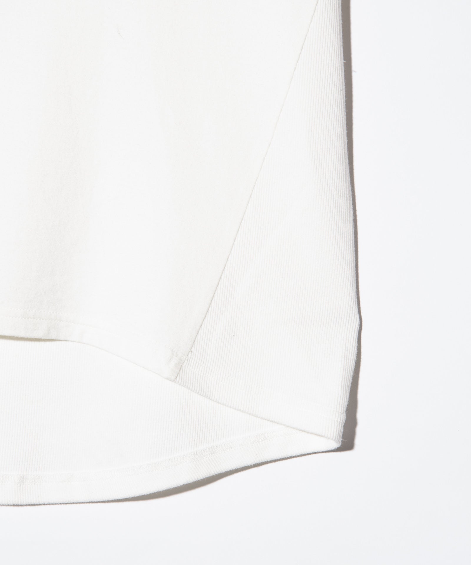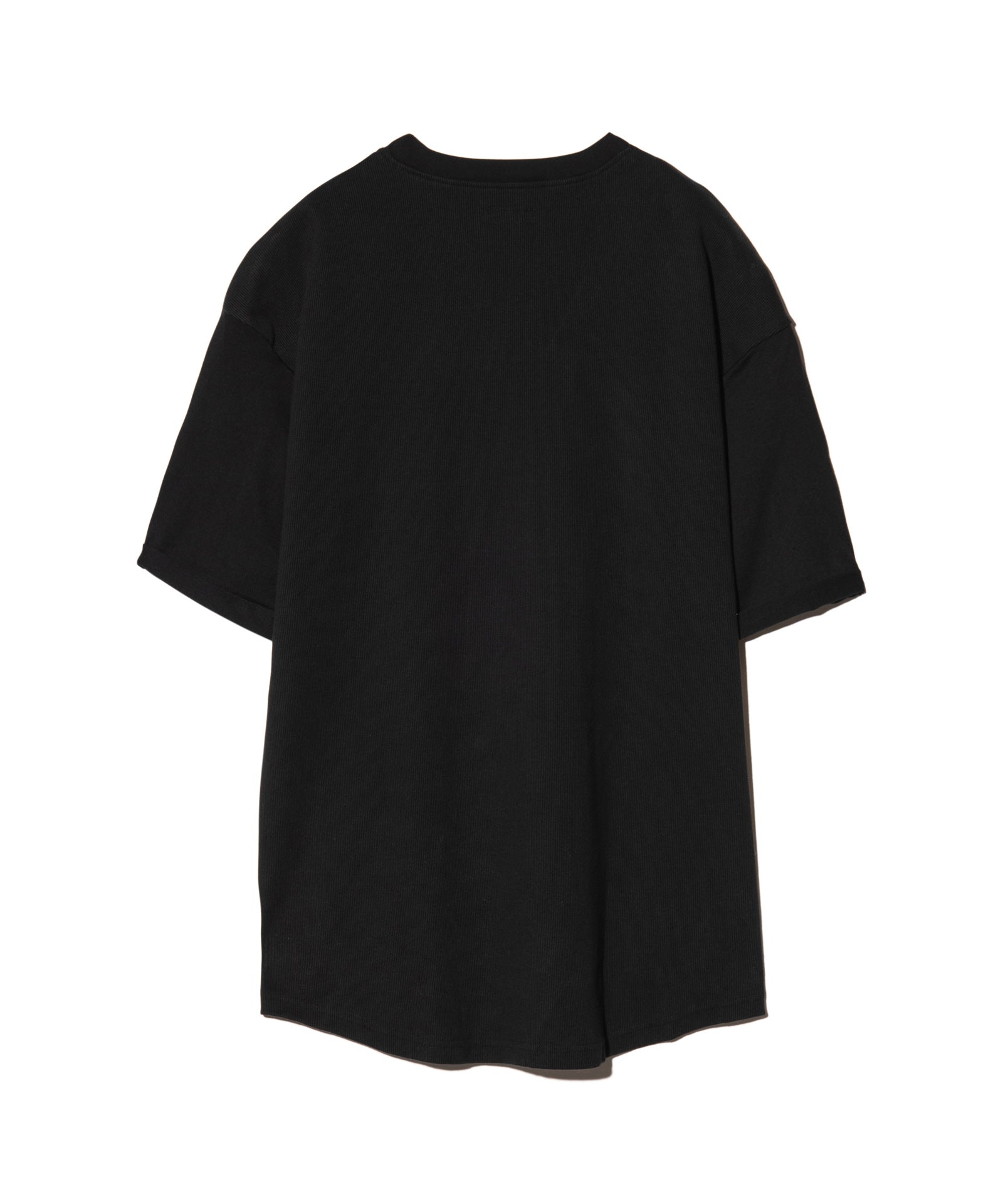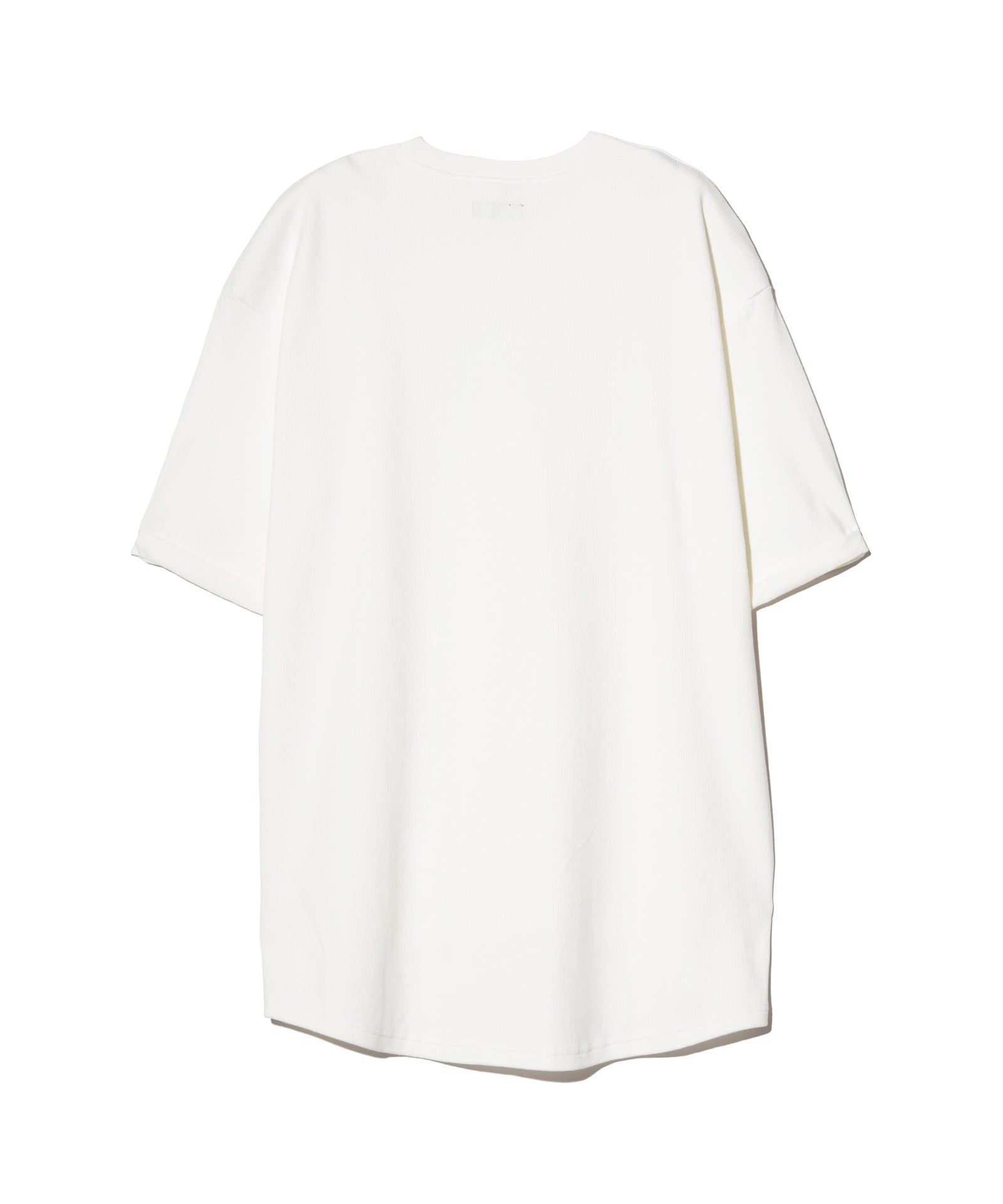ストリートスタイルのスタンダードであるロゴTシャツをパターンと異素材使いで再構築したCocoon Logo T-Shirt。ボディは裾部分で後ろ身頃が前身頃へと食い込む独自のアイデアによるもの。さらに裾は前後差を付けてラウンドカットさせることで、360度で見え方の変わるコクーンシルエットを構成しました。そのシルエットを強調するようテキスタイルは前身頃に40/2天竺 、後ろ身頃にリブ状のスパンテレコ生地を使用し変化あるテクスチャに。袖口のロールアップはステッチで留めており、スタイリング性をさらに高めています。フィッティングは着丈と身幅にゆとりを持たせたオーバーサイズに設定、アーバンな着こなしをお楽しみください。