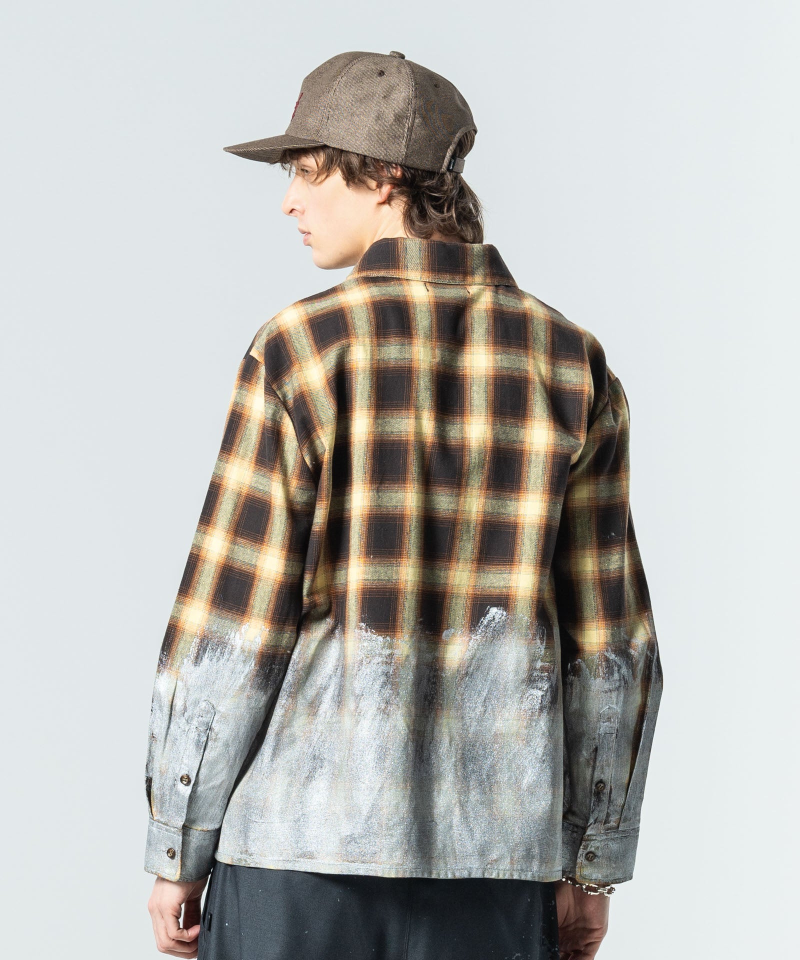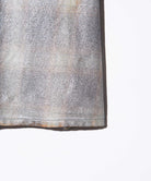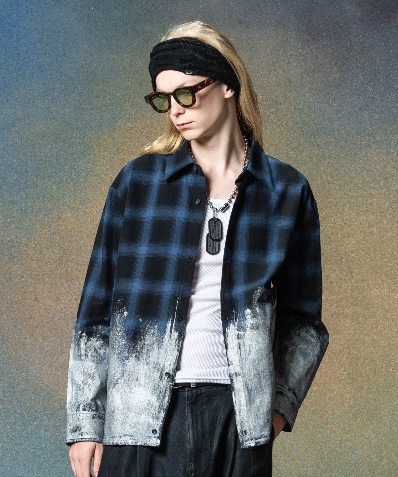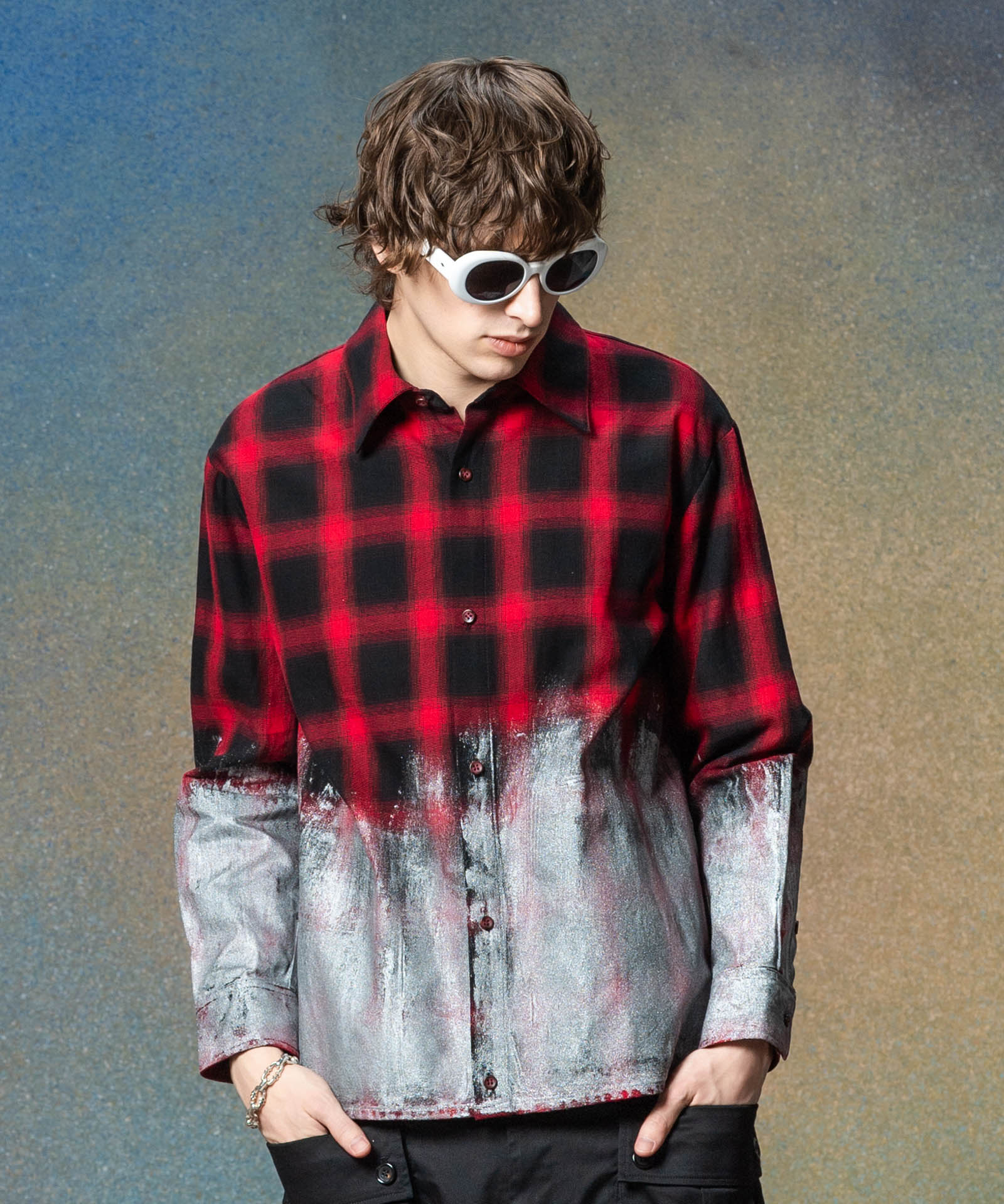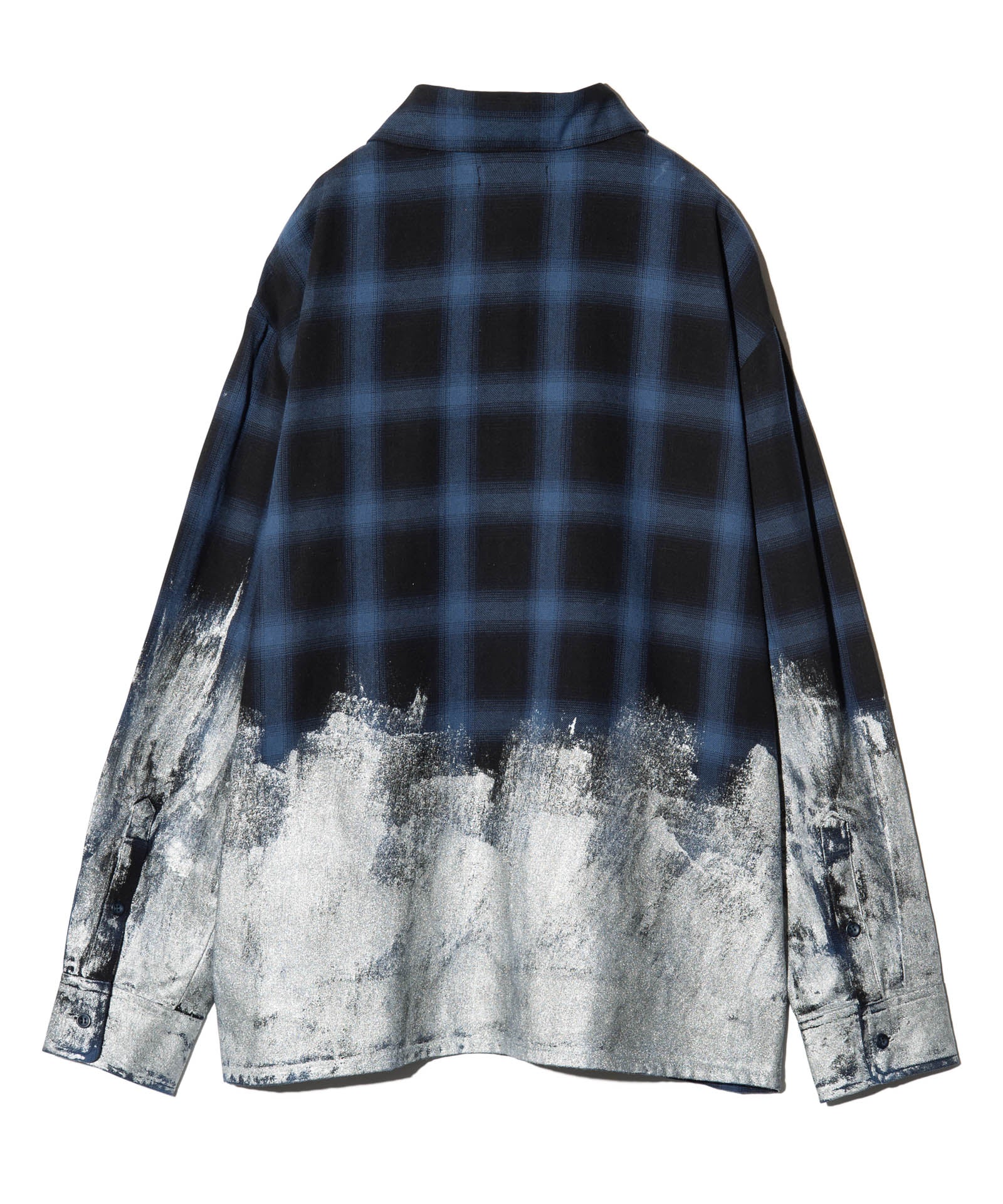 ロックからストリートまで、スタイリングを問わないマストハブであるチェックシャツにメタリックなアレンジを施したGlitter Check Shirt。テキスタイルはグランジムーヴメント時代にも多用されたオンブレーチェック生地を使用。シルエットは身幅にゆとりを持たせながら着丈は短めに設けた、オントレンドなオーバーサイズに仕立てています。本作の何よりの特徴は裾や袖口へ大胆に塗り付けられた銀箔。通常の着用はもちろん、アクセサリー感覚で腰巻きにしても存在感あるこちらの1枚がサマーコーディネートをさらに盛り上げます。