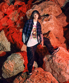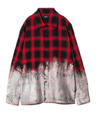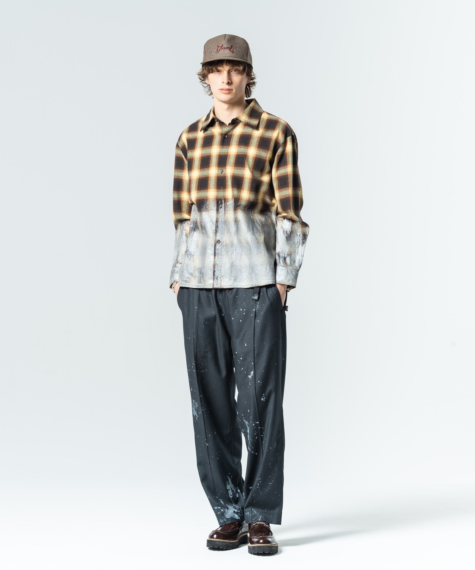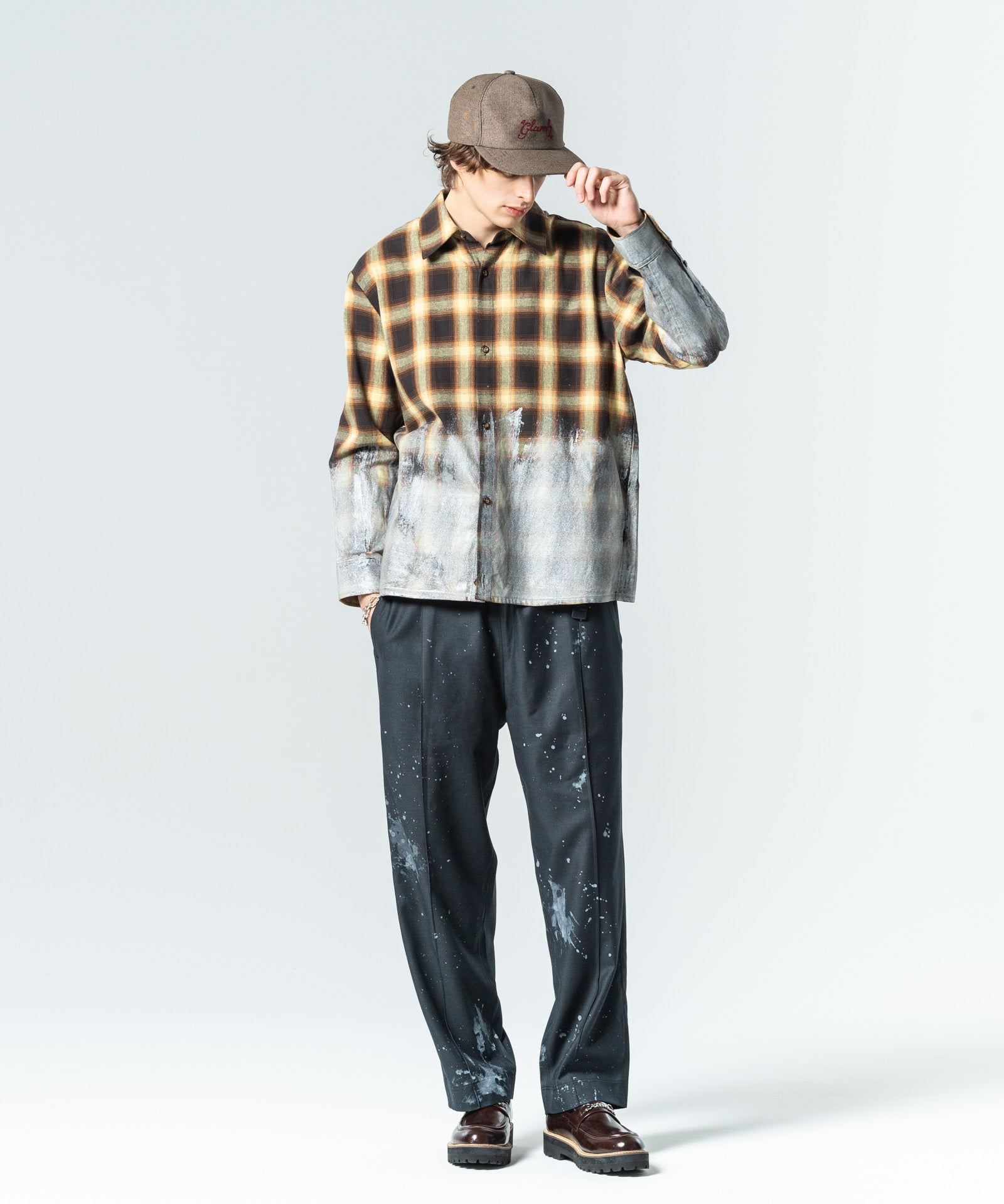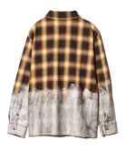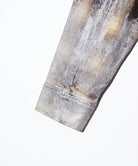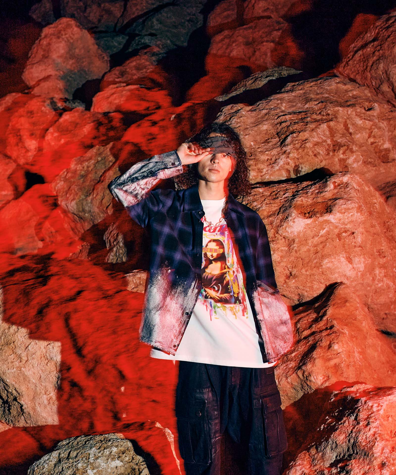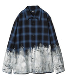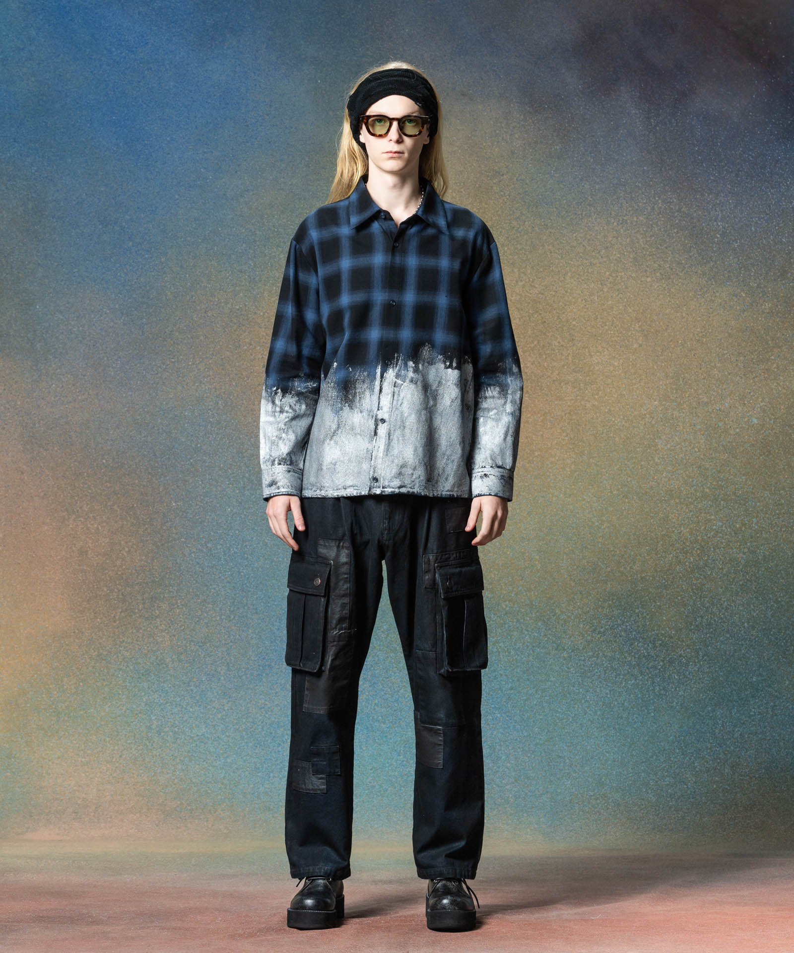 ロックからストリートまで、スタイリングを問わないマストハブであるチェックシャツにメタリックなアレンジを施したGlitter Check Shirt。テキスタイルはグランジムーヴメント時代にも多用されたオンブレーチェック生地を使用。シルエットは身幅にゆとりを持たせながら着丈は短めに設けた、オントレンドなオーバーサイズに仕立てています。本作の何よりの特徴は裾や袖口へ大胆に塗り付けられた銀箔。通常の着用はもちろん、アクセサリー感覚で腰巻きにしても存在感あるこちらの1枚がサマーコーディネートをさらに盛り上げます。