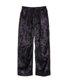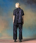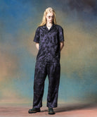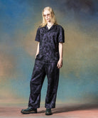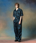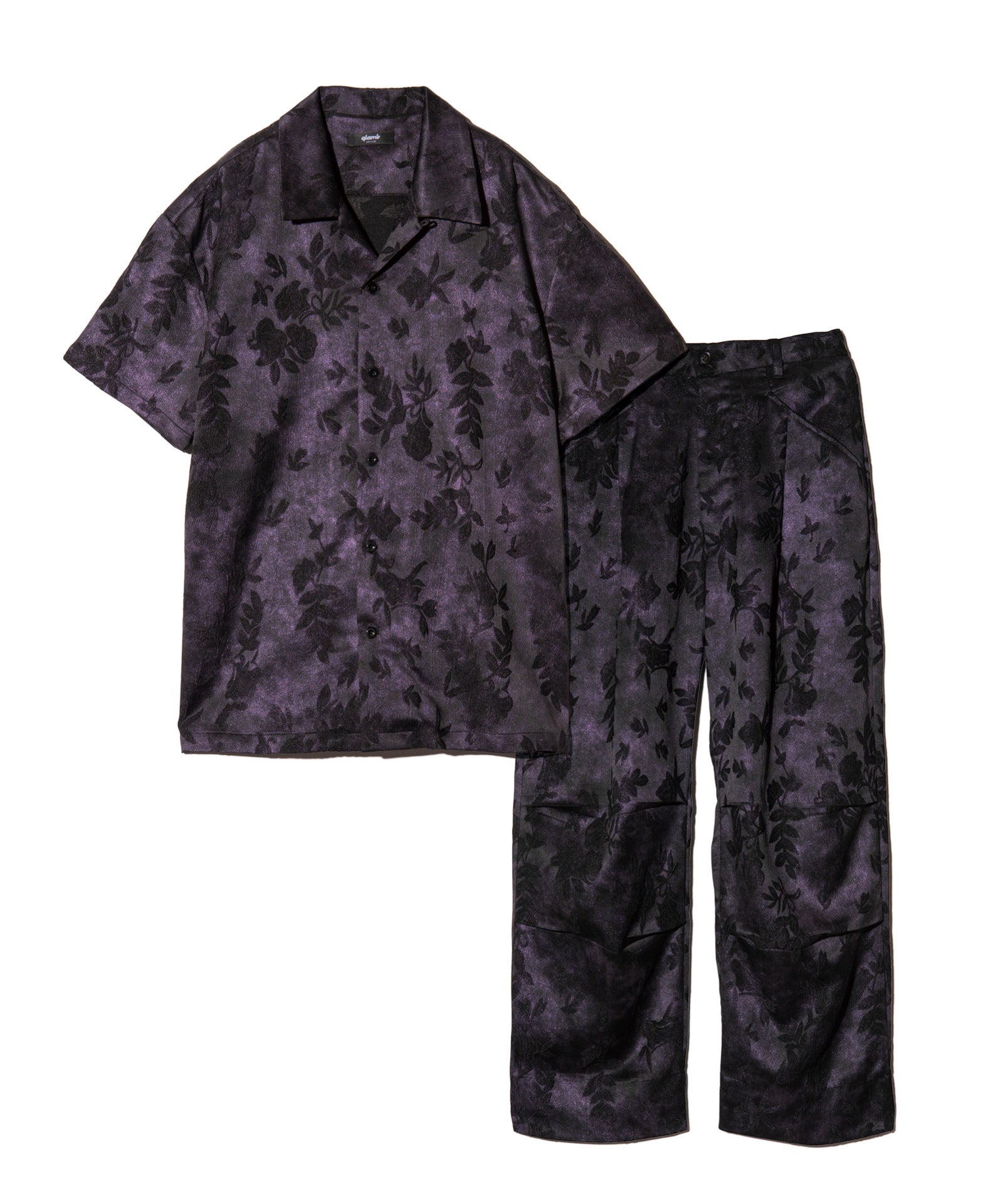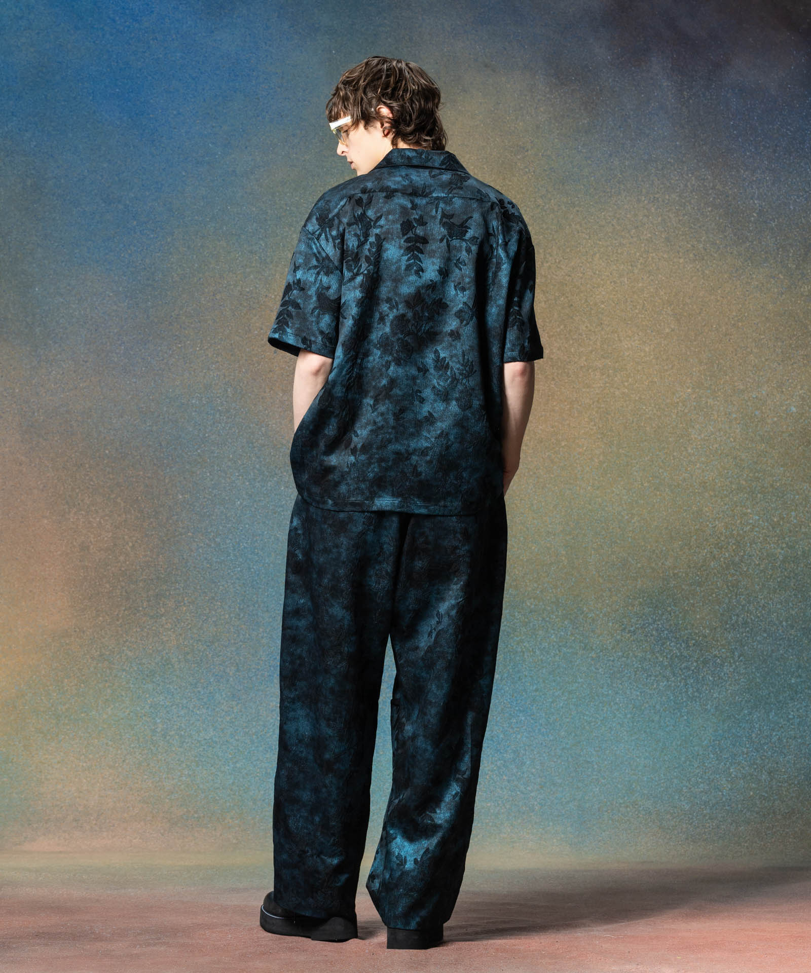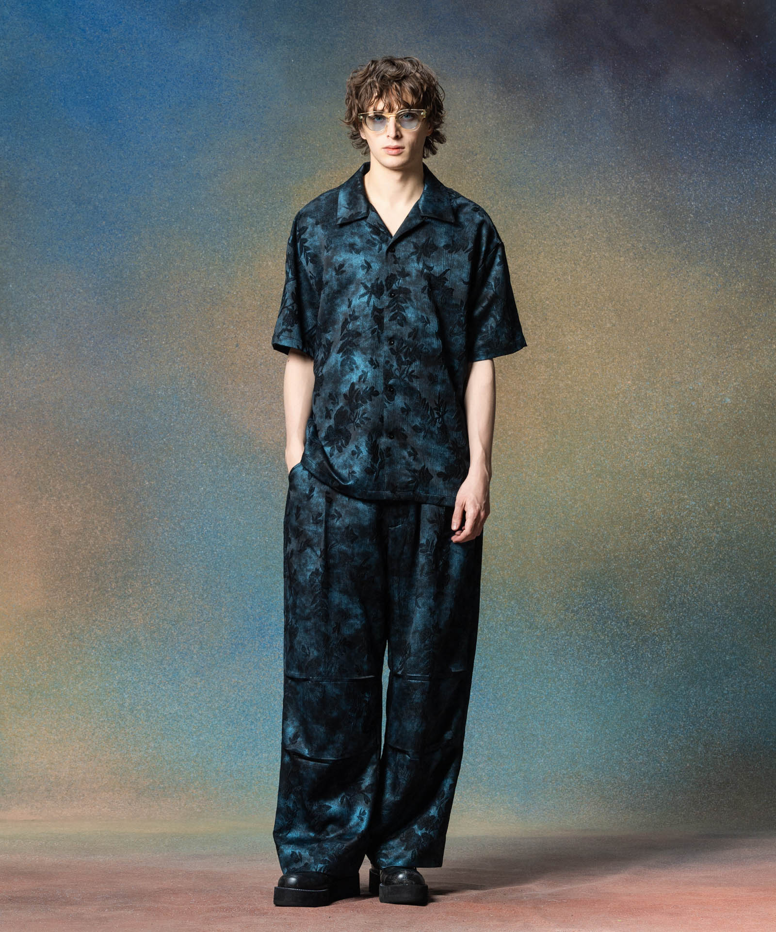 季節感を捉えたボタニカル柄にグラムロックを感じさせる光沢生地を掛け合わせ、リュクスなセットアップスタイルを形作ったGlitter Botanic Set Up。オープンカラーシャツとなるトップスは、ワイドな身幅にドロップショルダーを組み合わせたオーバーサイズ。着丈もゆとりを持たせて設定しており、裾をボトムスにインしてもアウトにしても収まりよくスタイリングいただけます。ボトムスは腰元に1タック、膝に2タックを設けて立体的に構成したバギー仕立て。セットアップで着用すればグラマラスなルードスタイルを形作ります。
