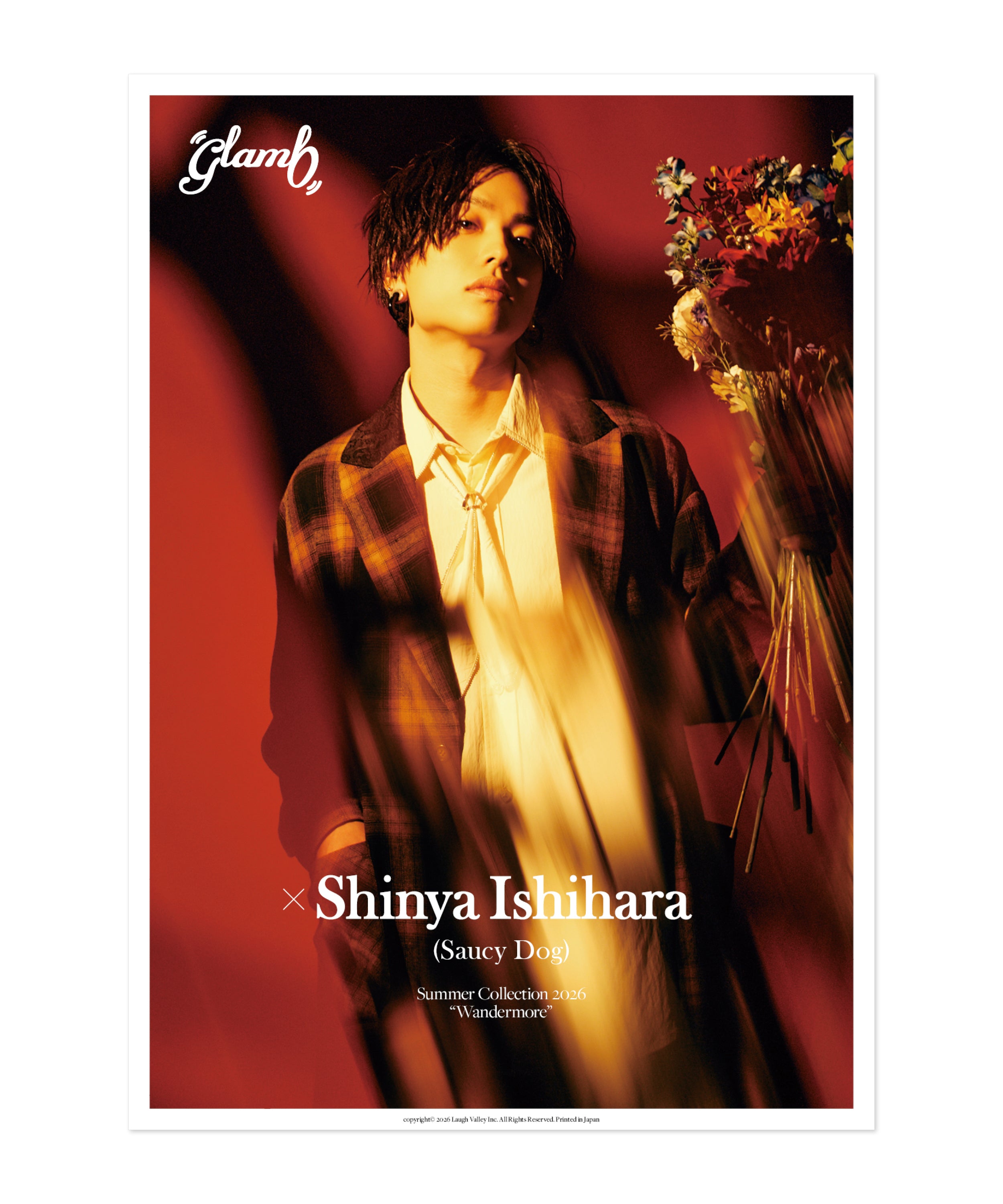 石原慎也(Saucy Dog)のモデル登場を記念し、「glamb Collection Look Book Vol.79」を数量限定でオンライン販売。Summer Collection 2026の先行予約で使える2,200円分のバウチャーとステッカー2点をセットしてお届けとなります。