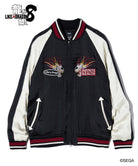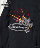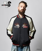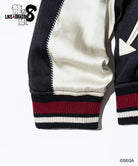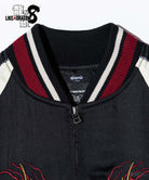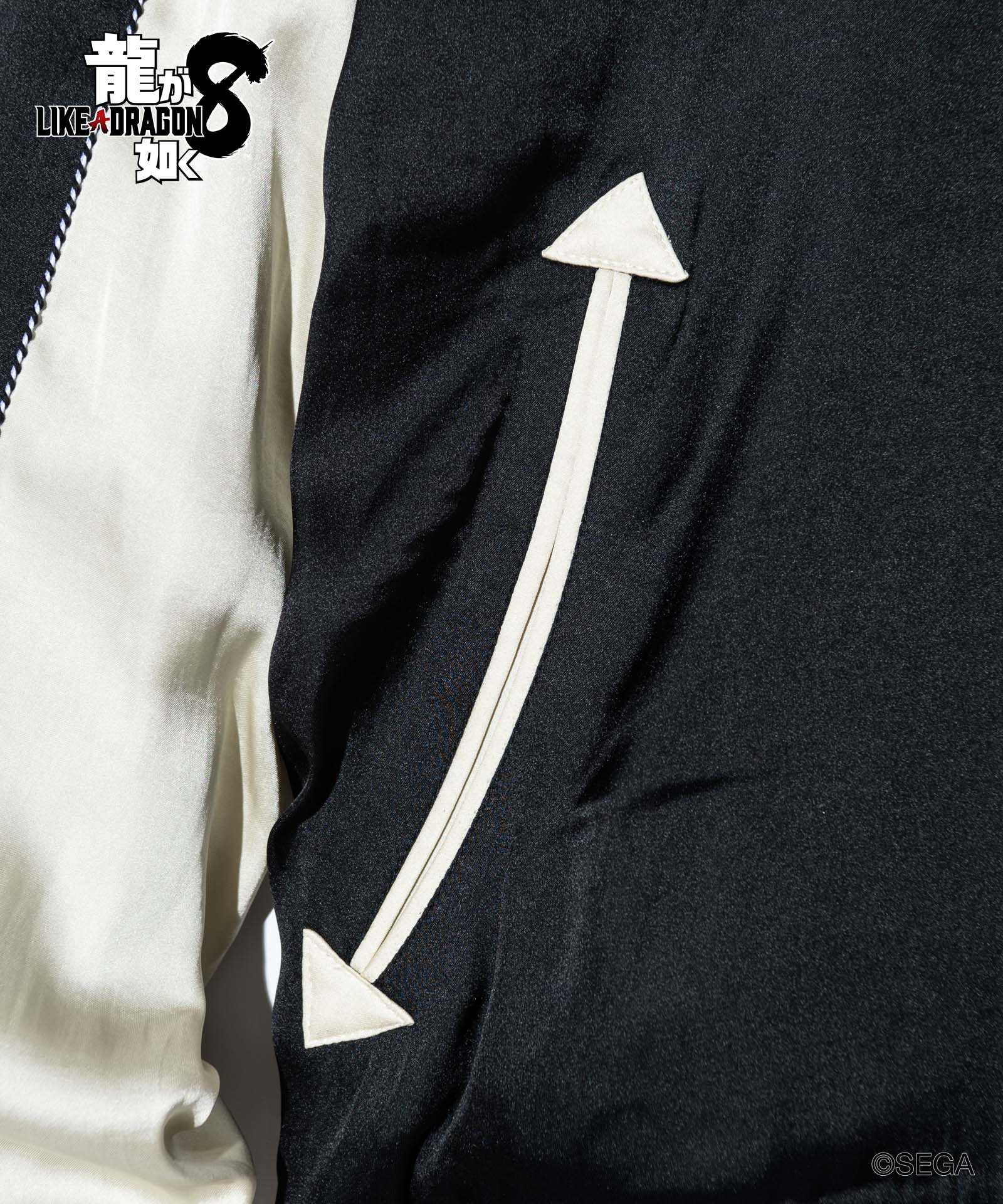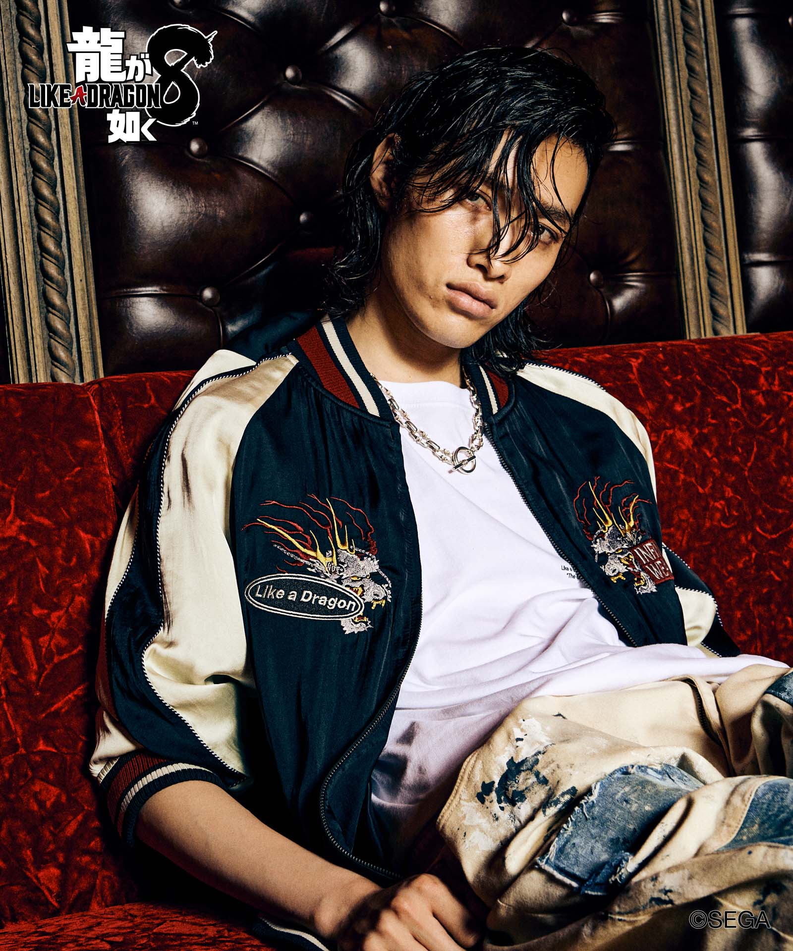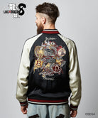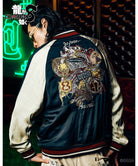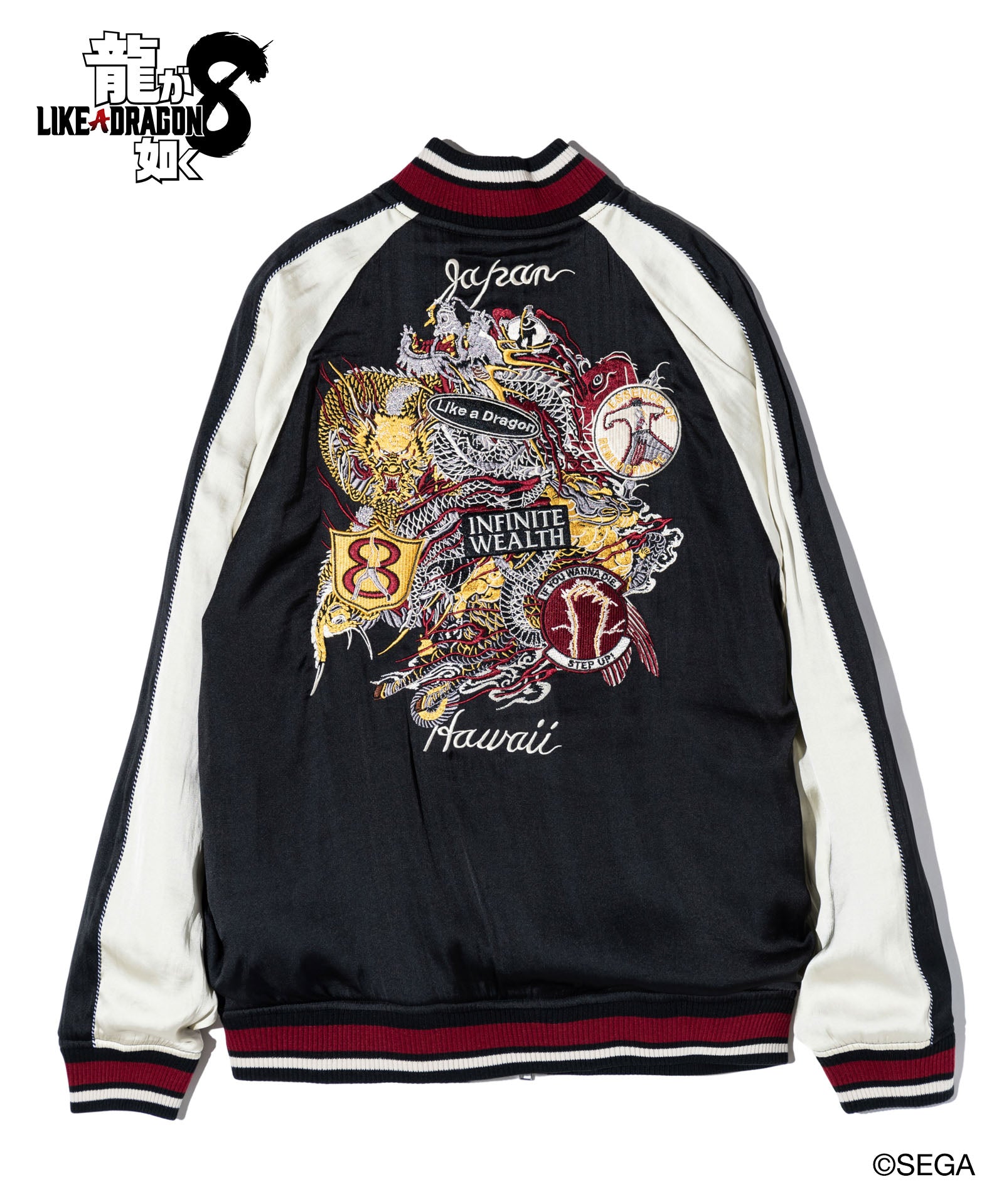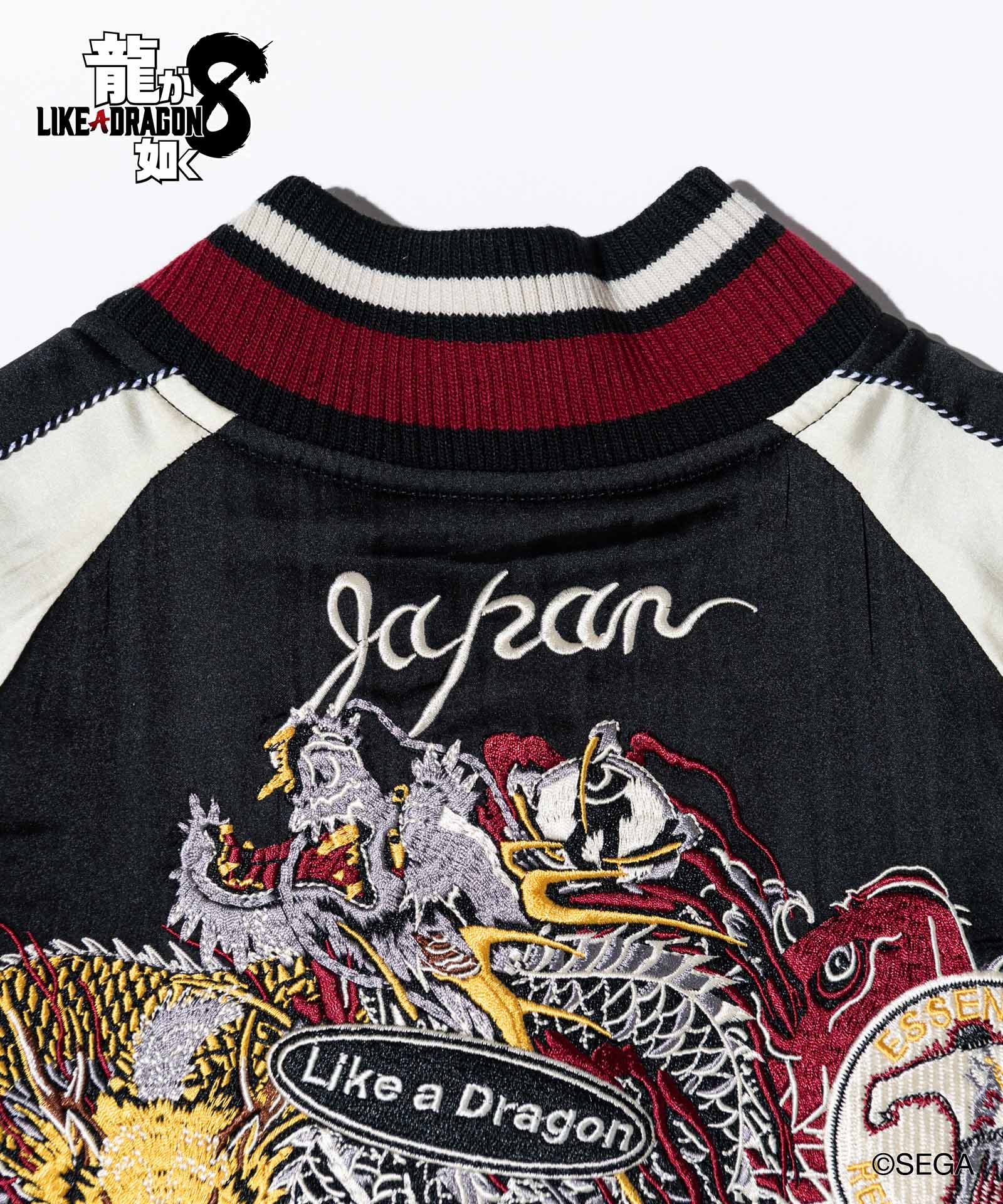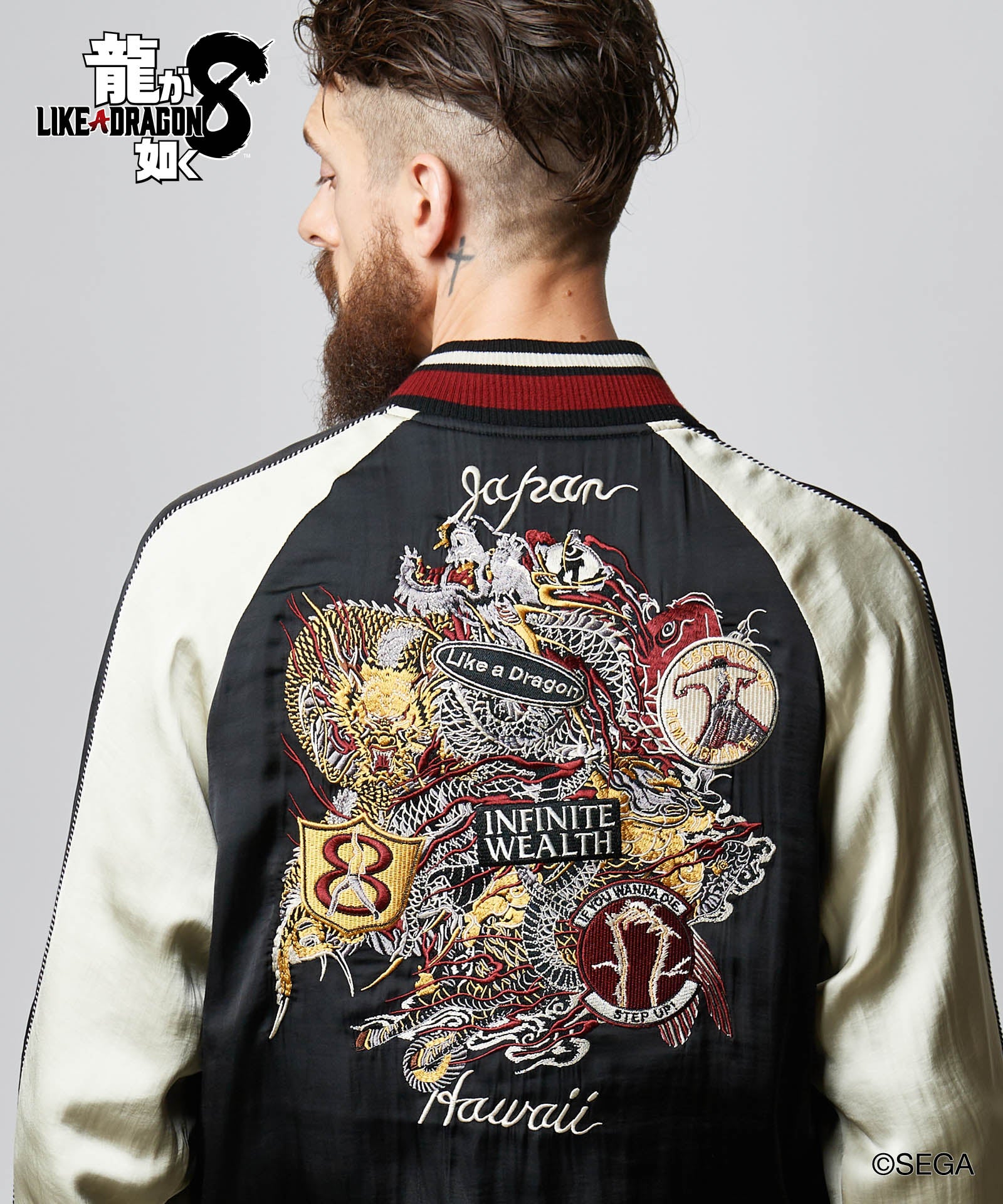 バックスタイルに重厚な存在感を見せるのは極技「真・追憶の極み」で現れる桐生の応龍と、ライバルたちが背負った緋鯉・黄龍・麒麟の刺青の刺繍。さらには作品にまつわるテキストや絵柄をワッペン風にあしらって、ストリートとロックのテイストをミックスしたハイブリッドな一着を作り上げました。