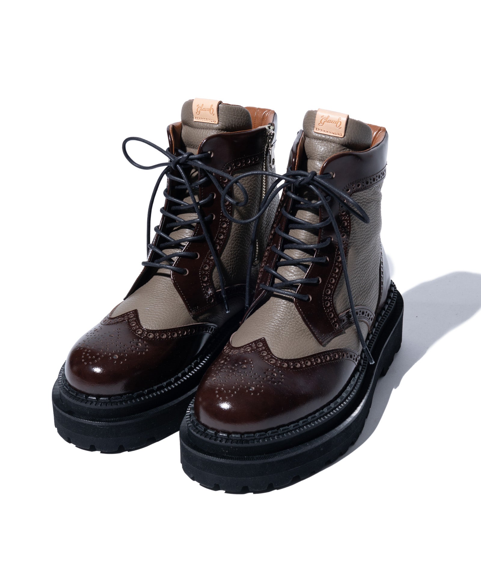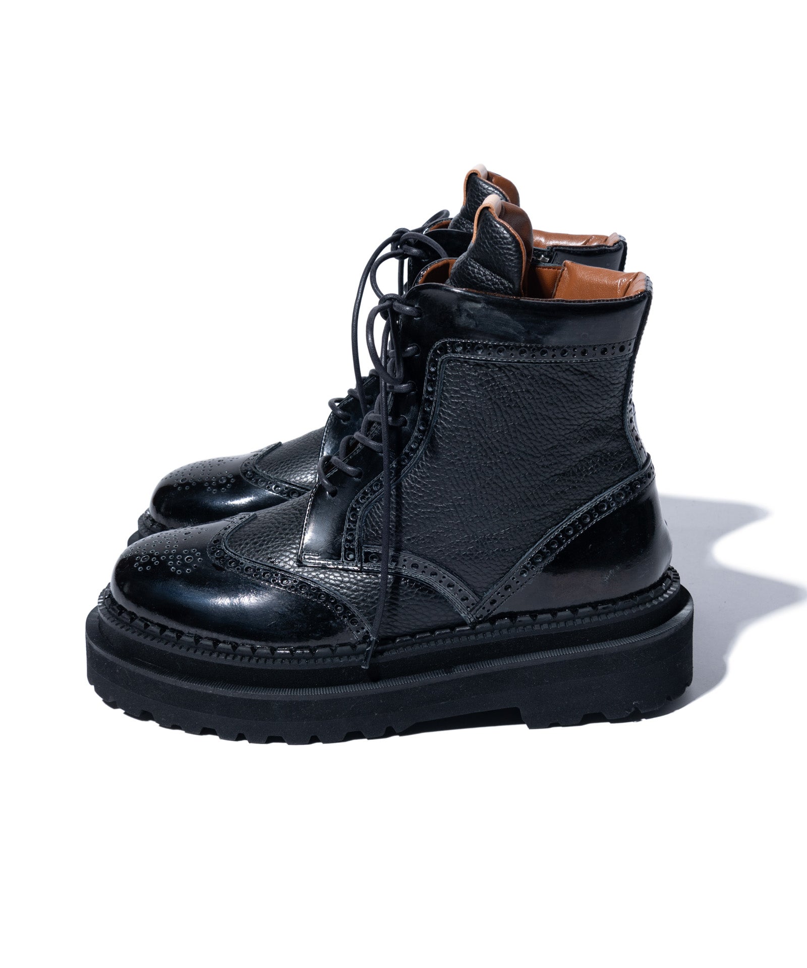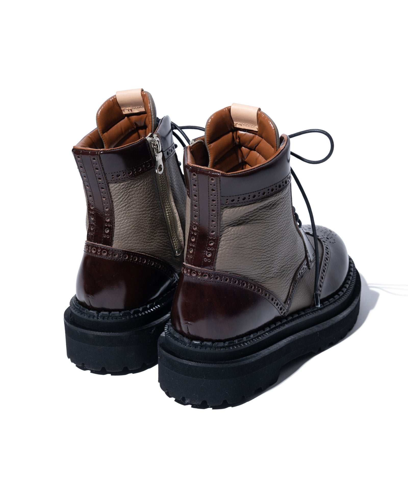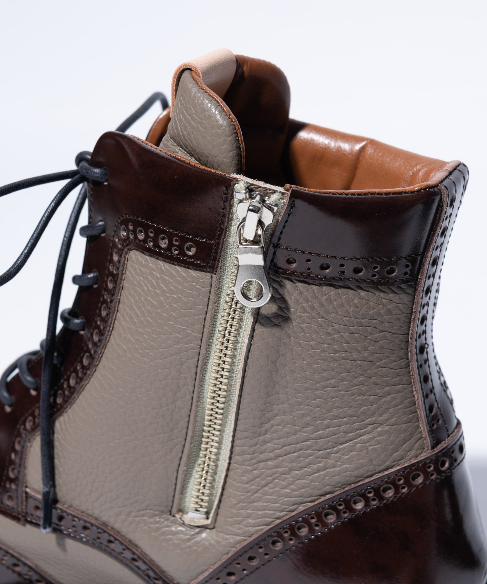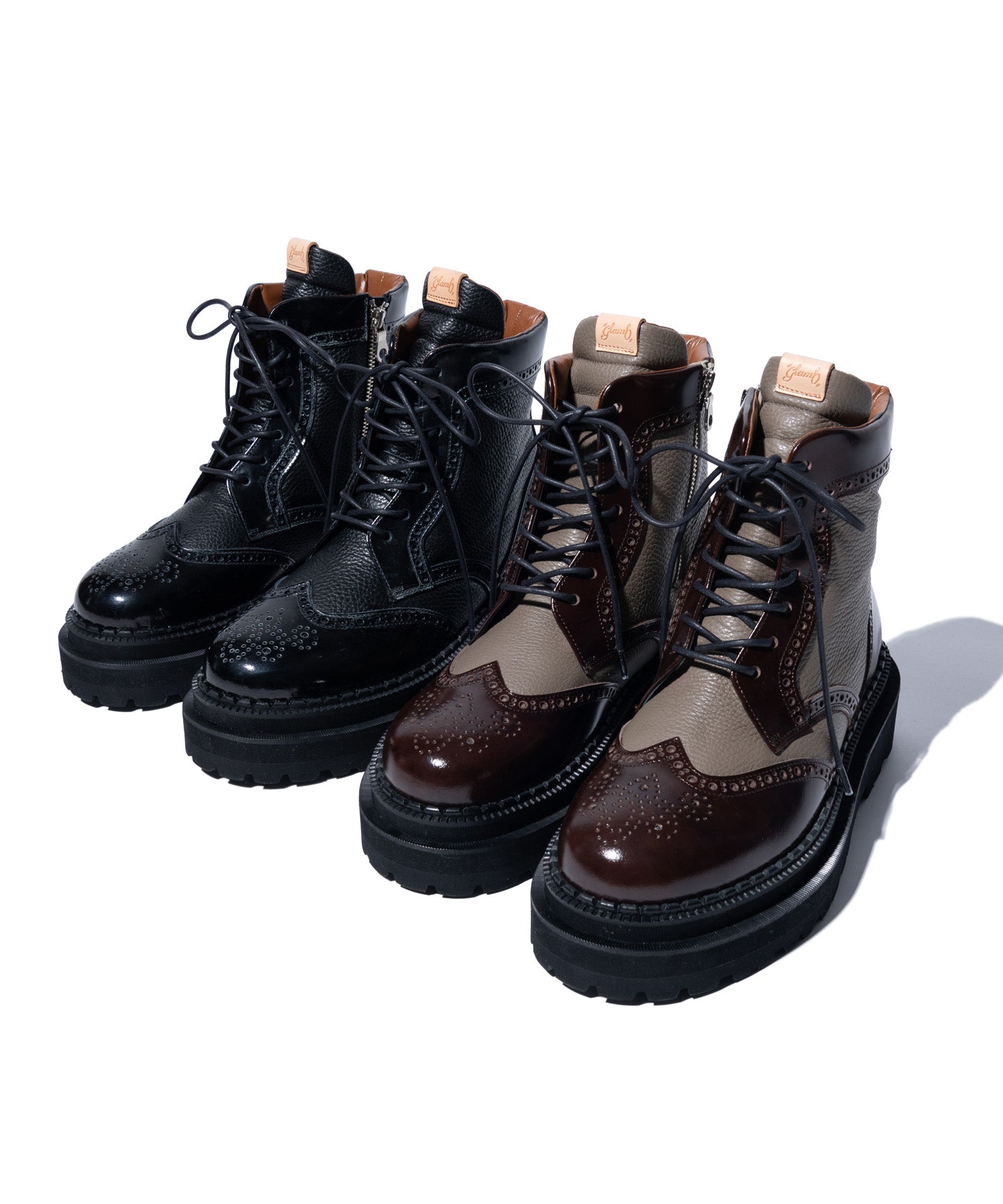 英国のトラディショナルスタイルを代表するカントリーブーツにブランドのフィルターを通し、MADE IN JAPANの確かなクオリティと共に提案するPlatform Country Boots。重厚なフルブローグを施したアッパーは光沢のあるスムースレザーとタフなテクスチャのグレインレザーをコンビネーション使いして一層ワイルドなルックスに。軽量でクッション性のあるEVAソールにタンクソールを組み上げたダブルソールをあしらうことでパンクテイストあるプラットフォームスタイルを生み出すとともに5cmのスタイルアップも実現します。さらにアッパー内側には着脱用のジップ、シュータンと履き口には中綿をあしらって、機能性を向上すると共にトラッドにはない新たなデザイン性をプラス。ロックスタイリングの足元にも絶好のBlackに加え、カントリーブーツ本来の佇まいを感じさせるBrownの2色をラインナップします。