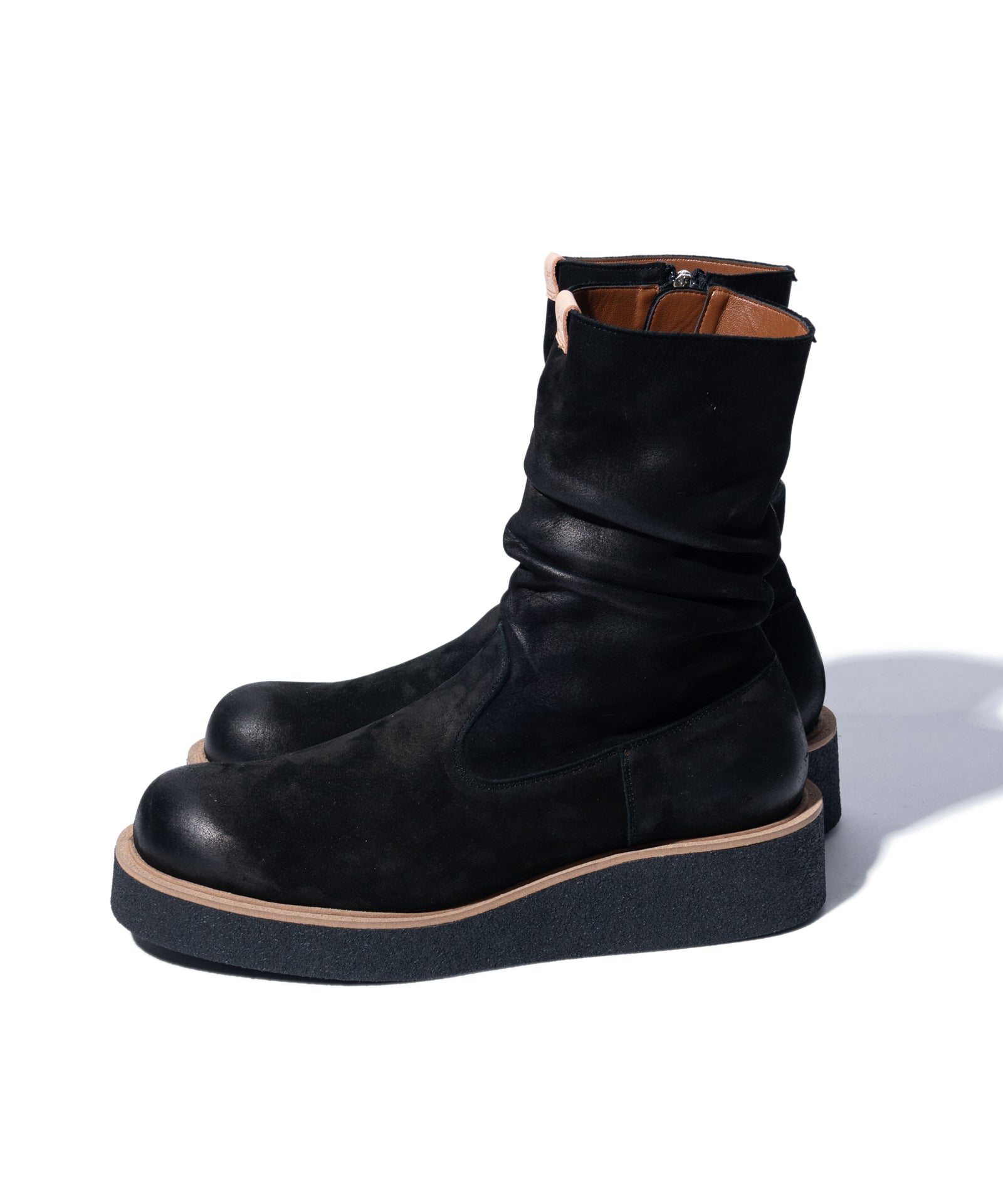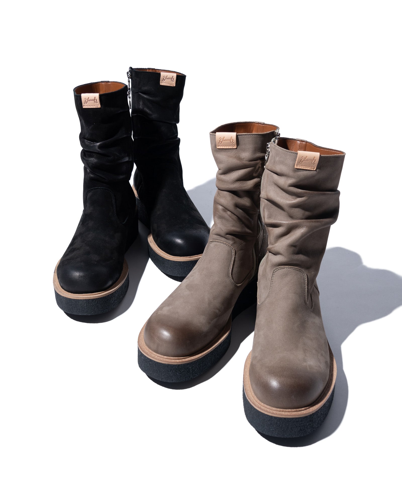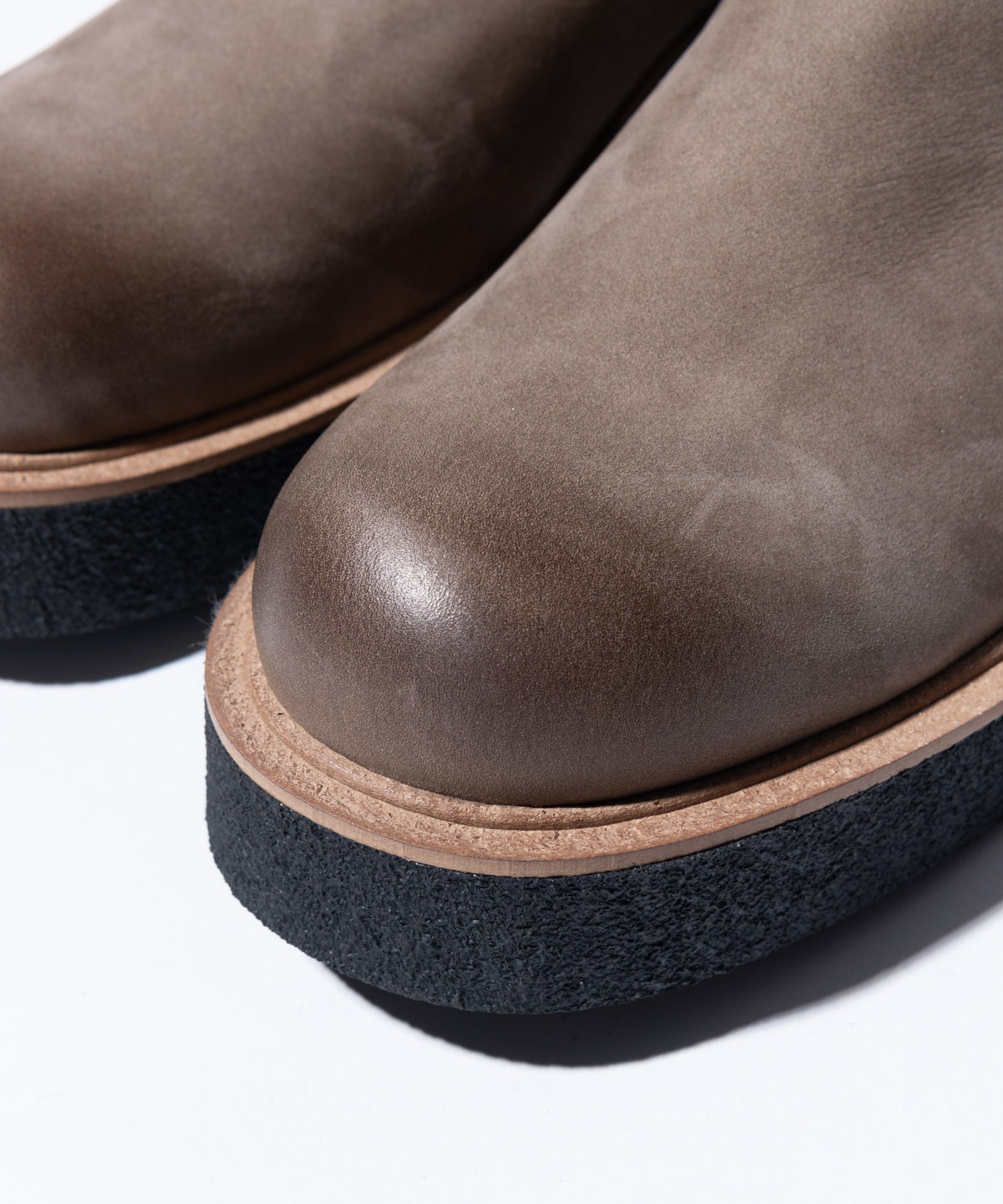 ウエスタンブーツを起源に持ち、アメリカのオーセンティックなワークブーツの一つとなっている長靴タイプのスタイルに造形的な再解釈を施したDrape Work Boots。つま先から踵にかけて革を2枚重ねにした補強使いやロングシルエットは往年のディテールを踏襲しながら、そのシャフト部分に遊びを持たせてアッパーを縫製することによってドレープを表現。シャフト自体の太さも細身に設けることで洗練されたコンテンポラリーな佇まいへと作り変えました。ソールの4.5cmの高さを備えたボリュームソールを使用。素材に軽量でクッション性のあるEVAを使用し、仕上げに側面に合成クレープを施すことで重厚なビジュアルに反して軽やかな履き心地となっています。アッパー内側にはサイドジップをあしらって着脱を容易に。レザーは牛ヌバックを使用しており、起毛感ある革表面は迫力ある経年変化へのポテンシャルも十分。靴作りは東京にあるブランドのシューズファクトリーが担当しております。