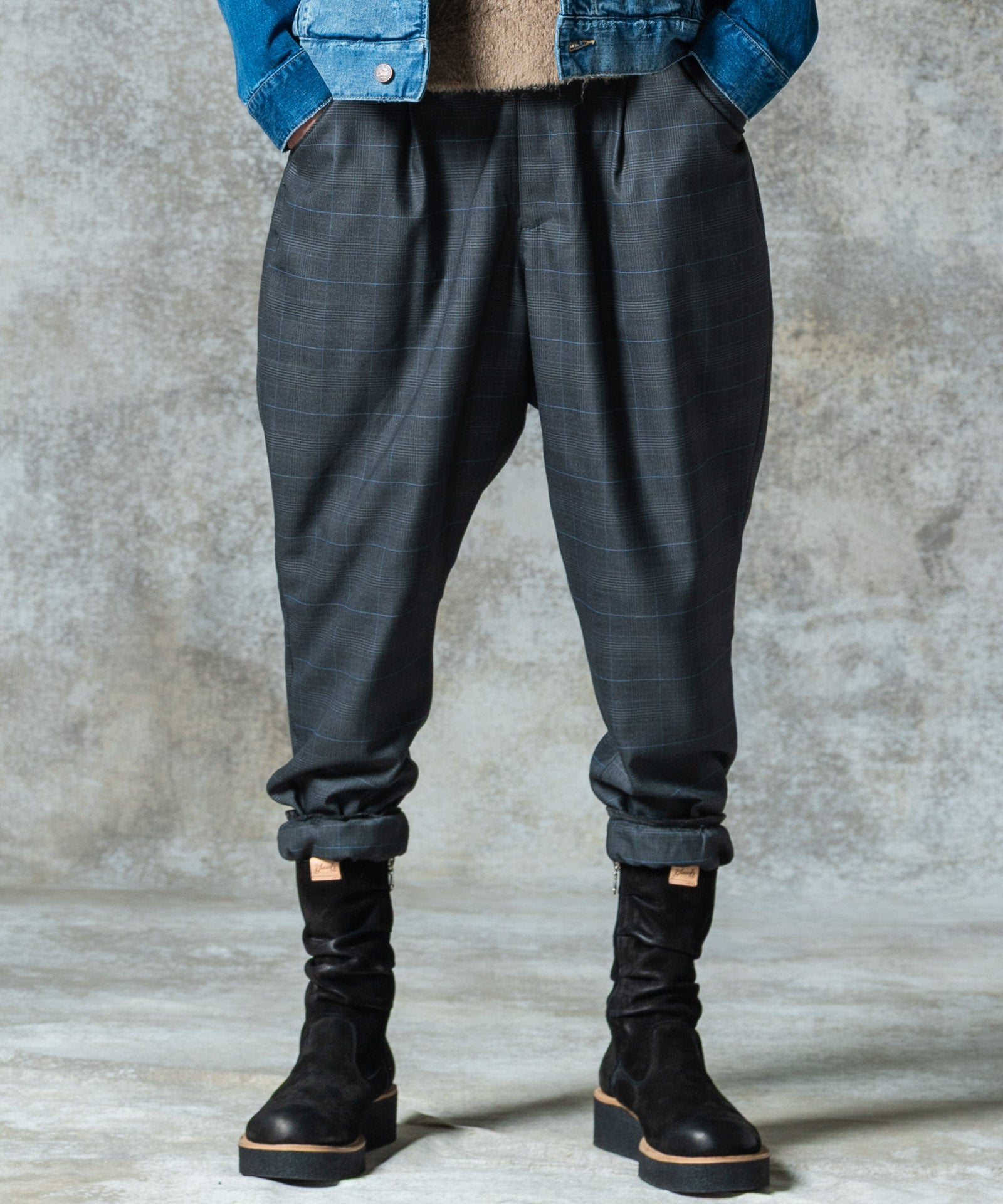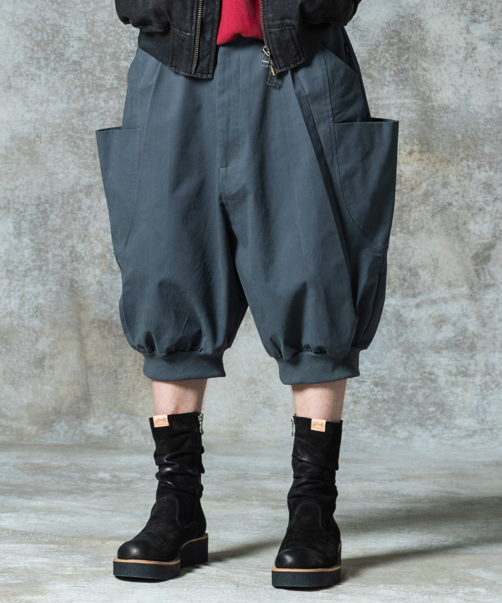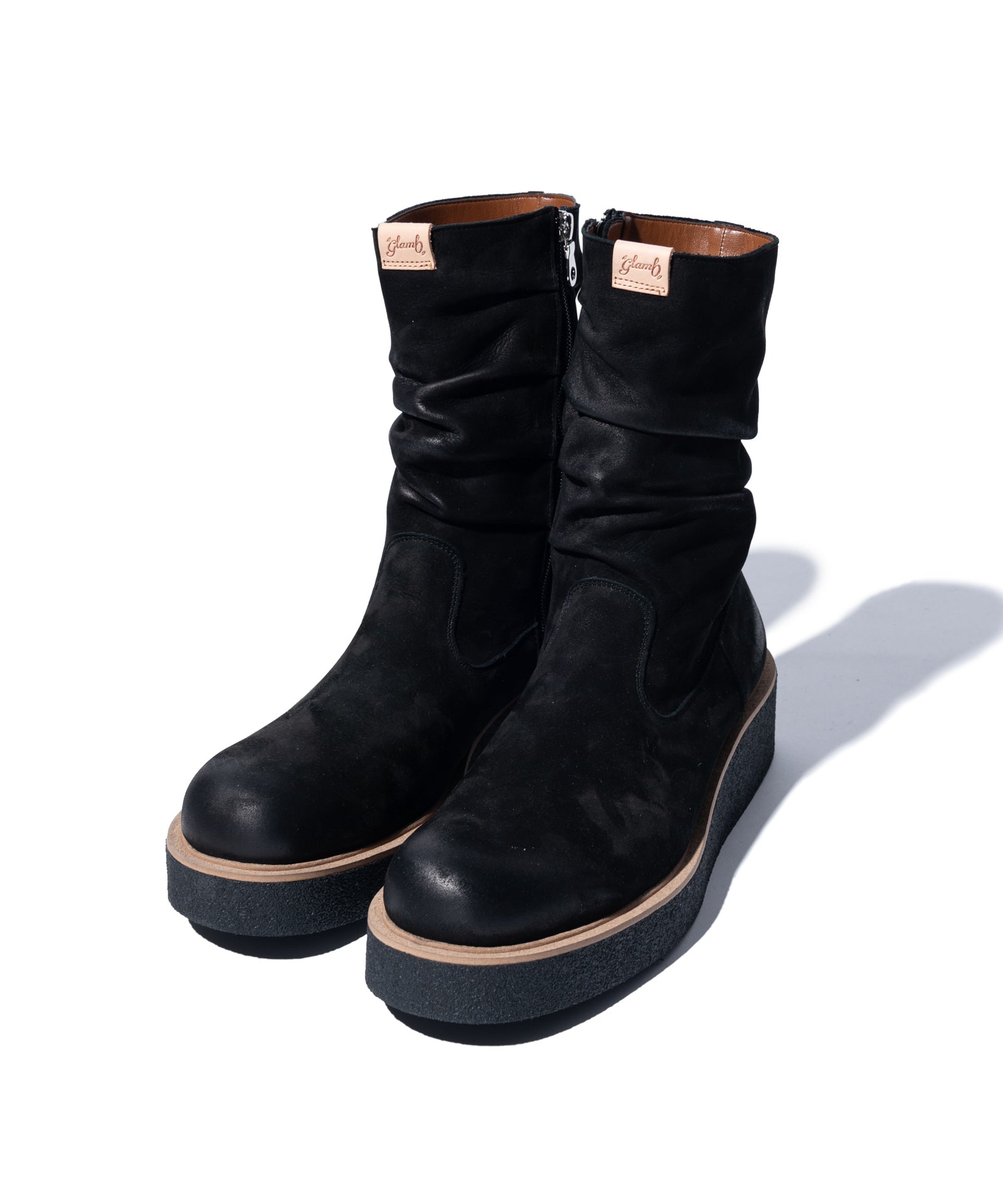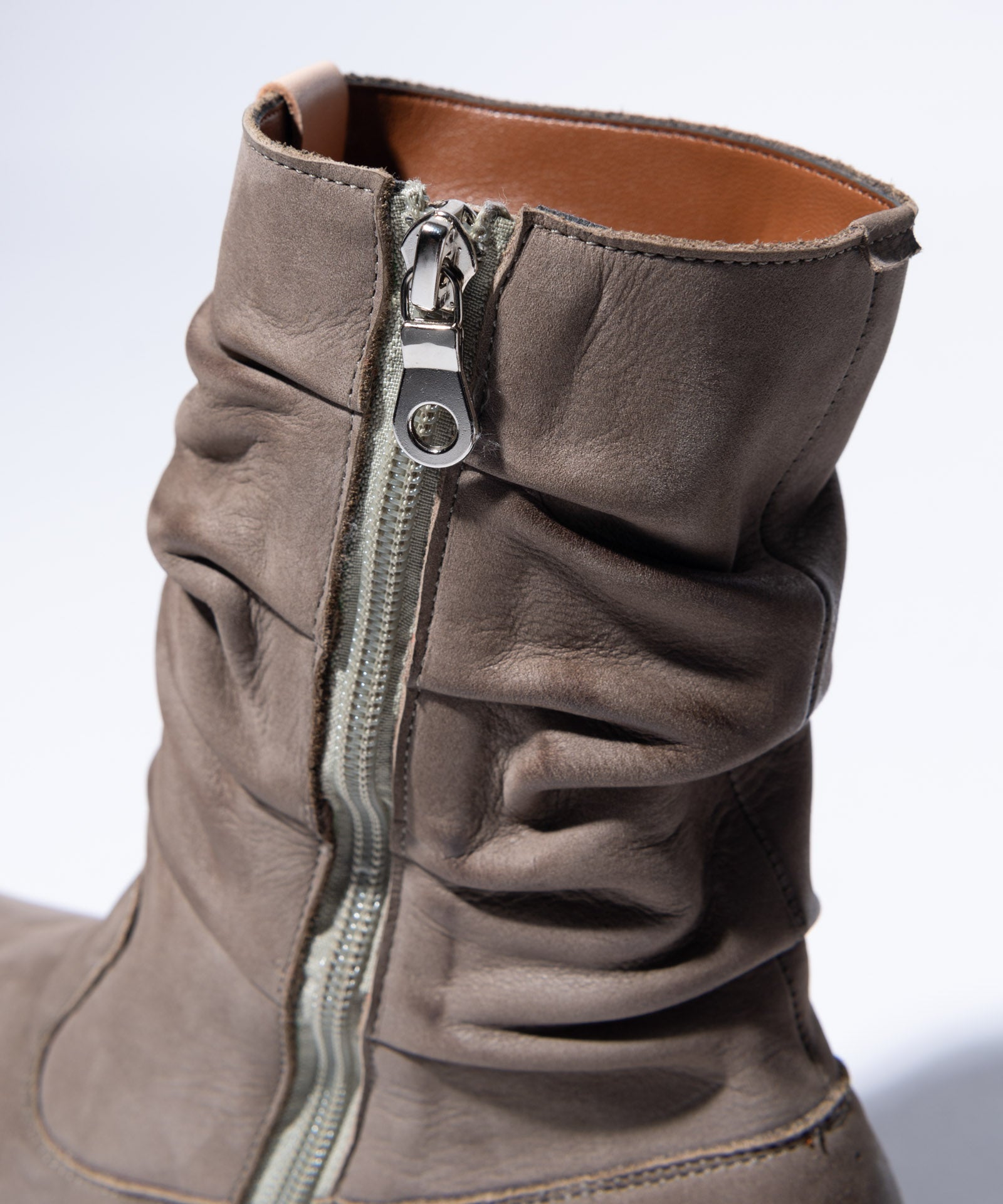 ウエスタンブーツを起源に持ち、アメリカのオーセンティックなワークブーツの一つとなっている長靴タイプのスタイルに造形的な再解釈を施したDrape Work Boots。つま先から踵にかけて革を2枚重ねにした補強使いやロングシルエットは往年のディテールを踏襲しながら、そのシャフト部分に遊びを持たせてアッパーを縫製することによってドレープを表現。シャフト自体の太さも細身に設けることで洗練されたコンテンポラリーな佇まいへと作り変えました。ソールの4.5cmの高さを備えたボリュームソールを使用。素材に軽量でクッション性のあるEVAを使用し、仕上げに側面に合成クレープを施すことで重厚なビジュアルに反して軽やかな履き心地となっています。アッパー内側にはサイドジップをあしらって着脱を容易に。レザーは牛ヌバックを使用しており、起毛感ある革表面は迫力ある経年変化へのポテンシャルも十分。靴作りは東京にあるブランドのシューズファクトリーが担当しております。