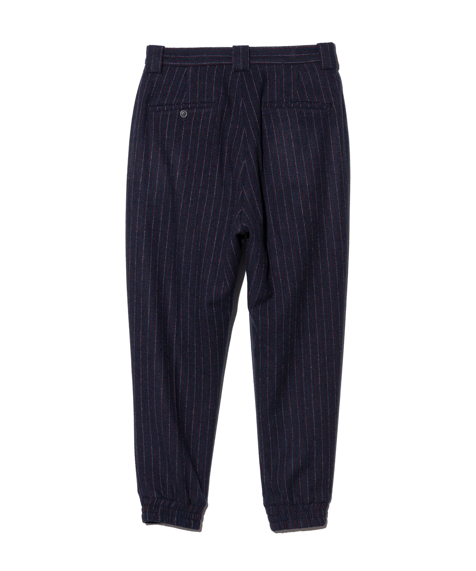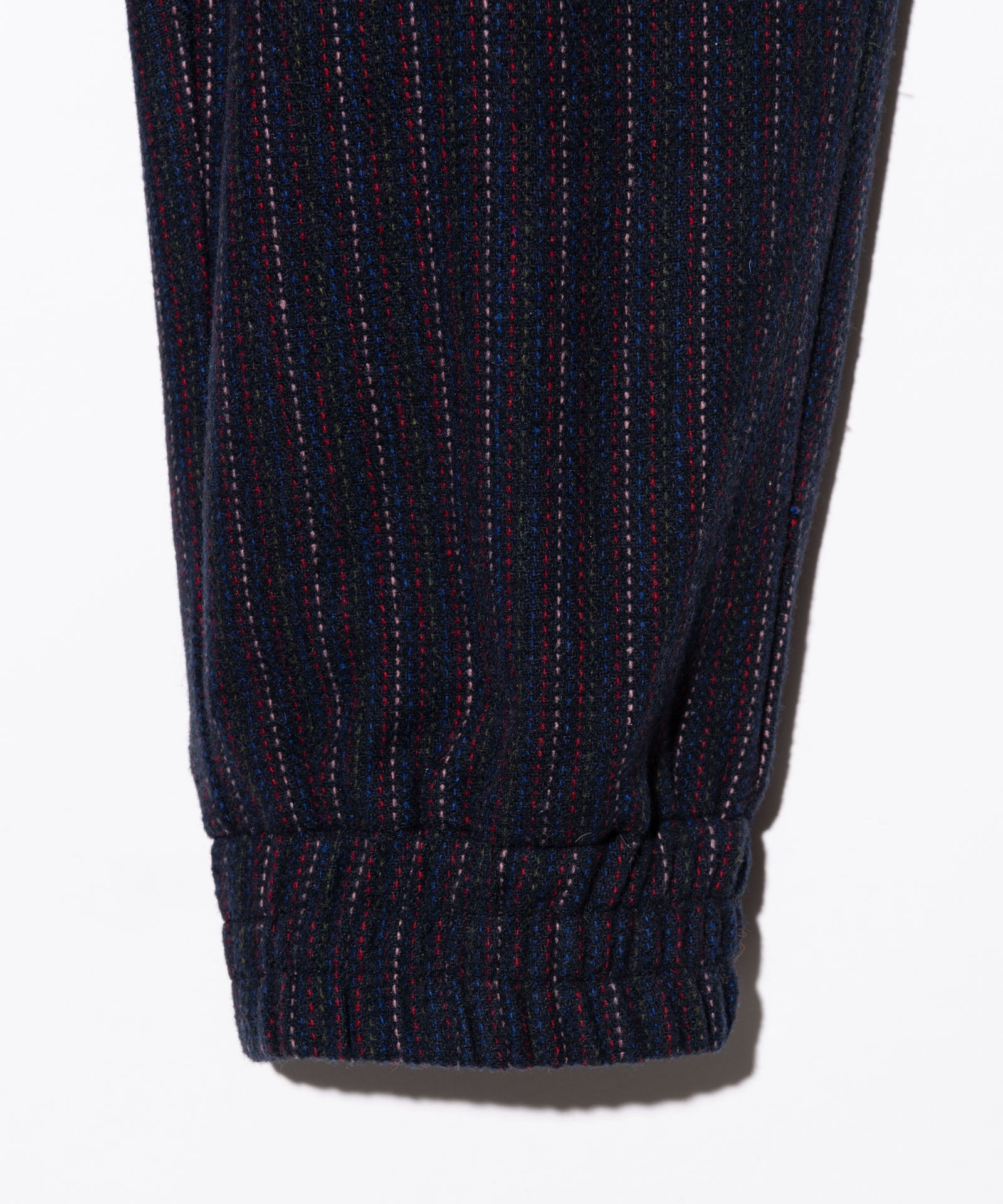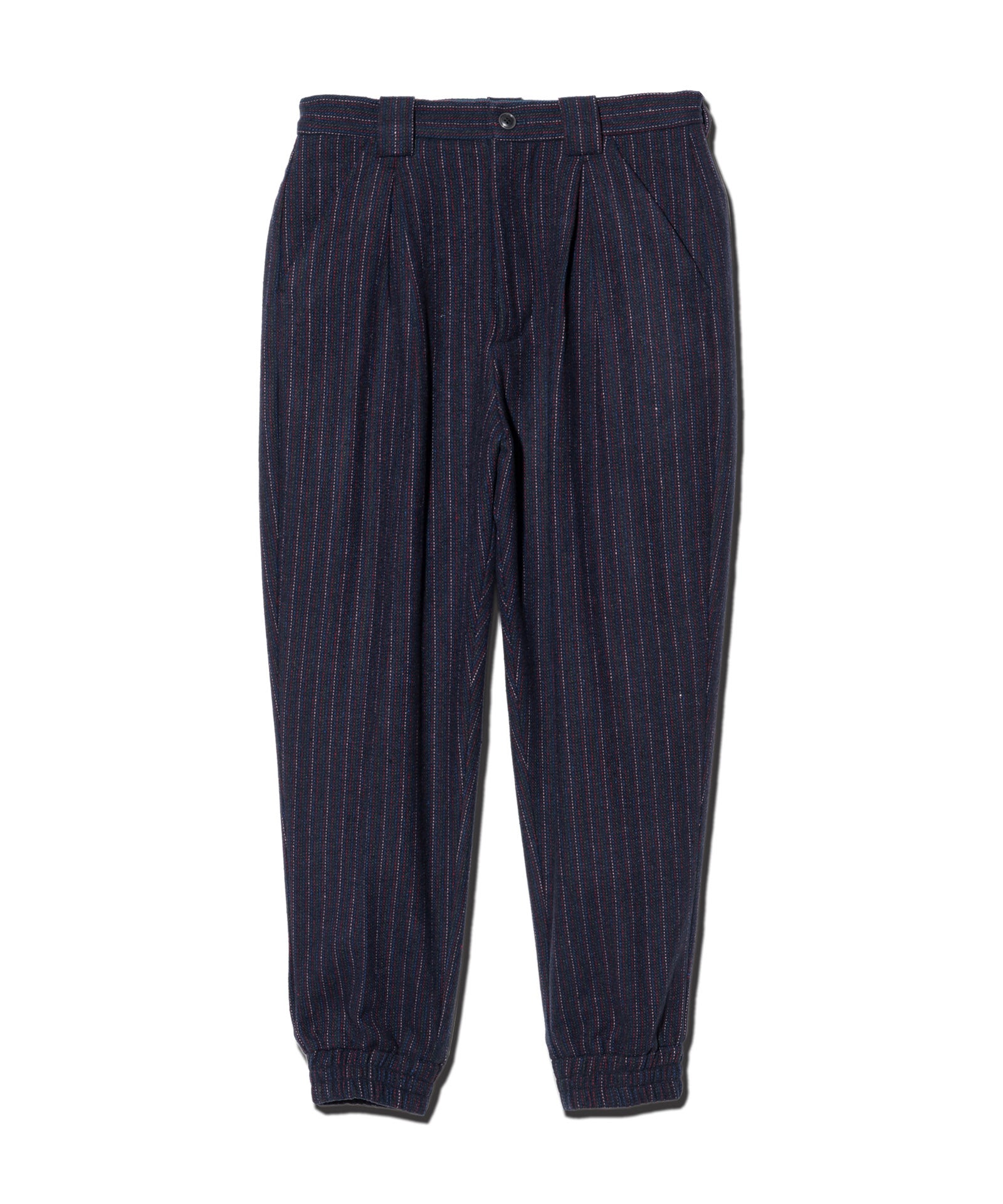 ヨーロピアンテイスト溢れる素材使いをシルエットとディテールのアレンジでストリートに呼応させたDeformed Tweed Slacks。ボディに用いたのは複数の色糸で織り上げた肉厚なストライプツイード。腰元に1タック取ることで、上品なテーパードシルエットを形成します。裾ゴムで絞りを加えたニュアンスある足元はトラッドの中にスポーツテイストをさりげなく演出。スラックス感覚でもジャージ感覚でもスタイリングできるレンジのあるヴィジュアルとなっています。