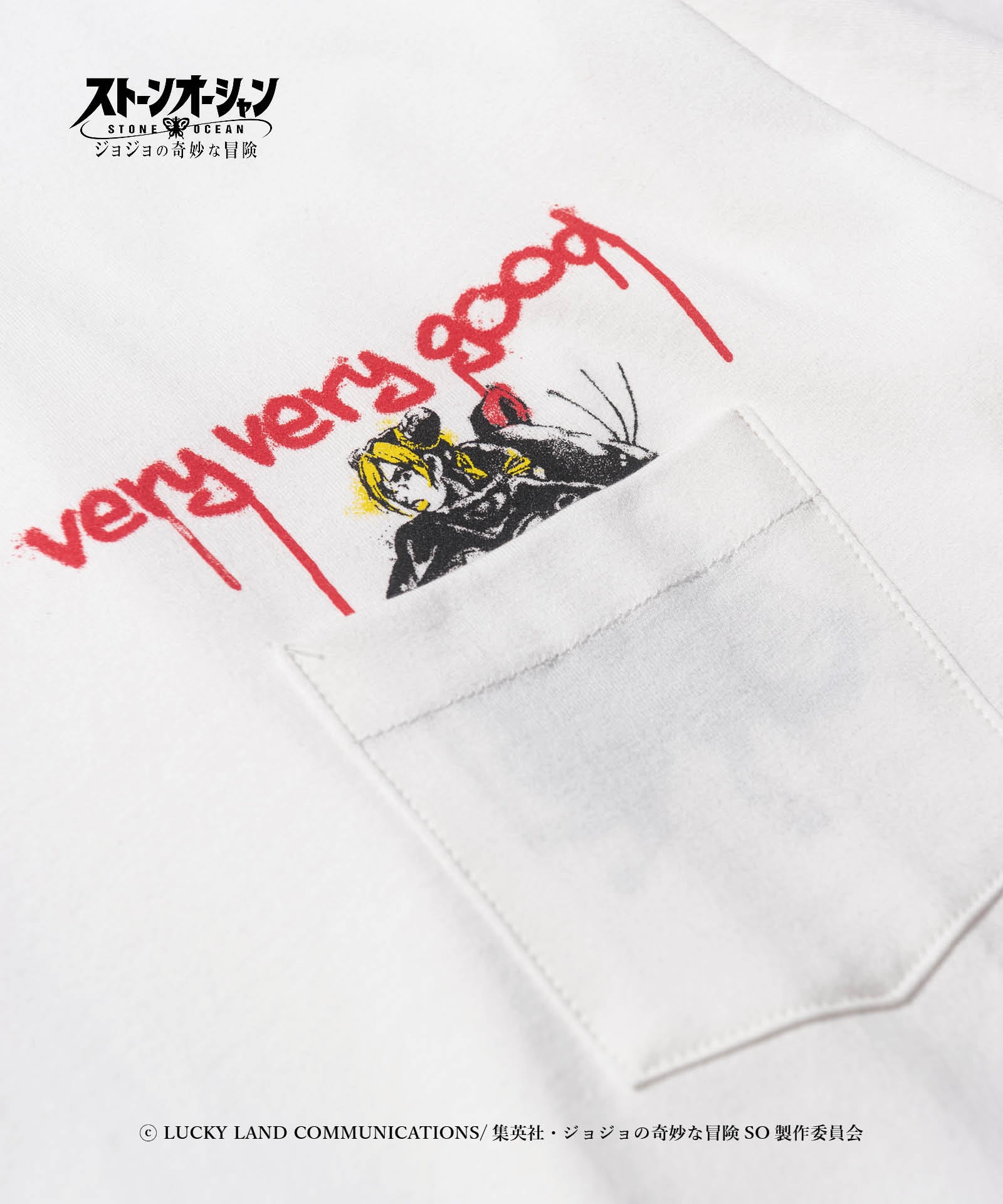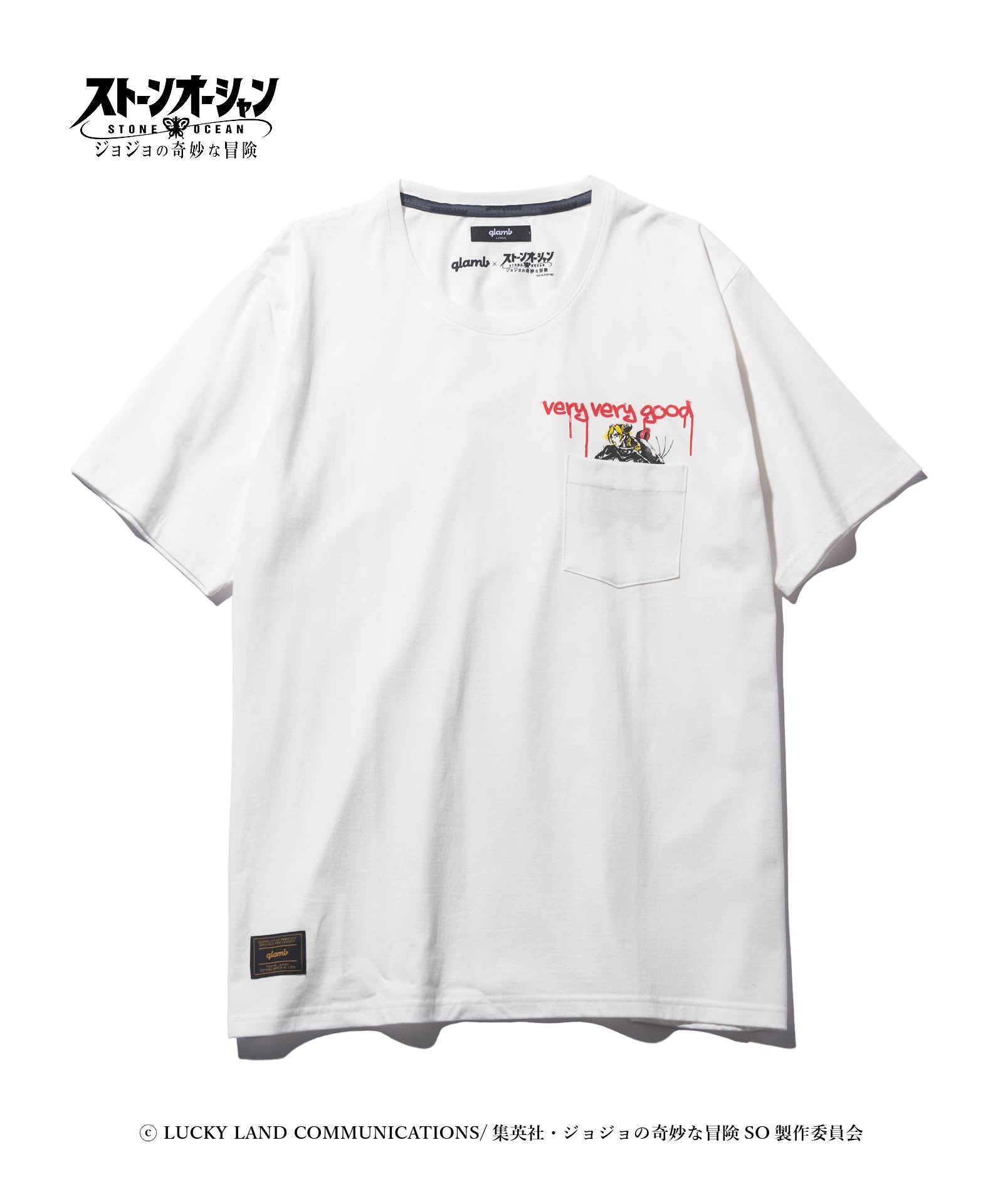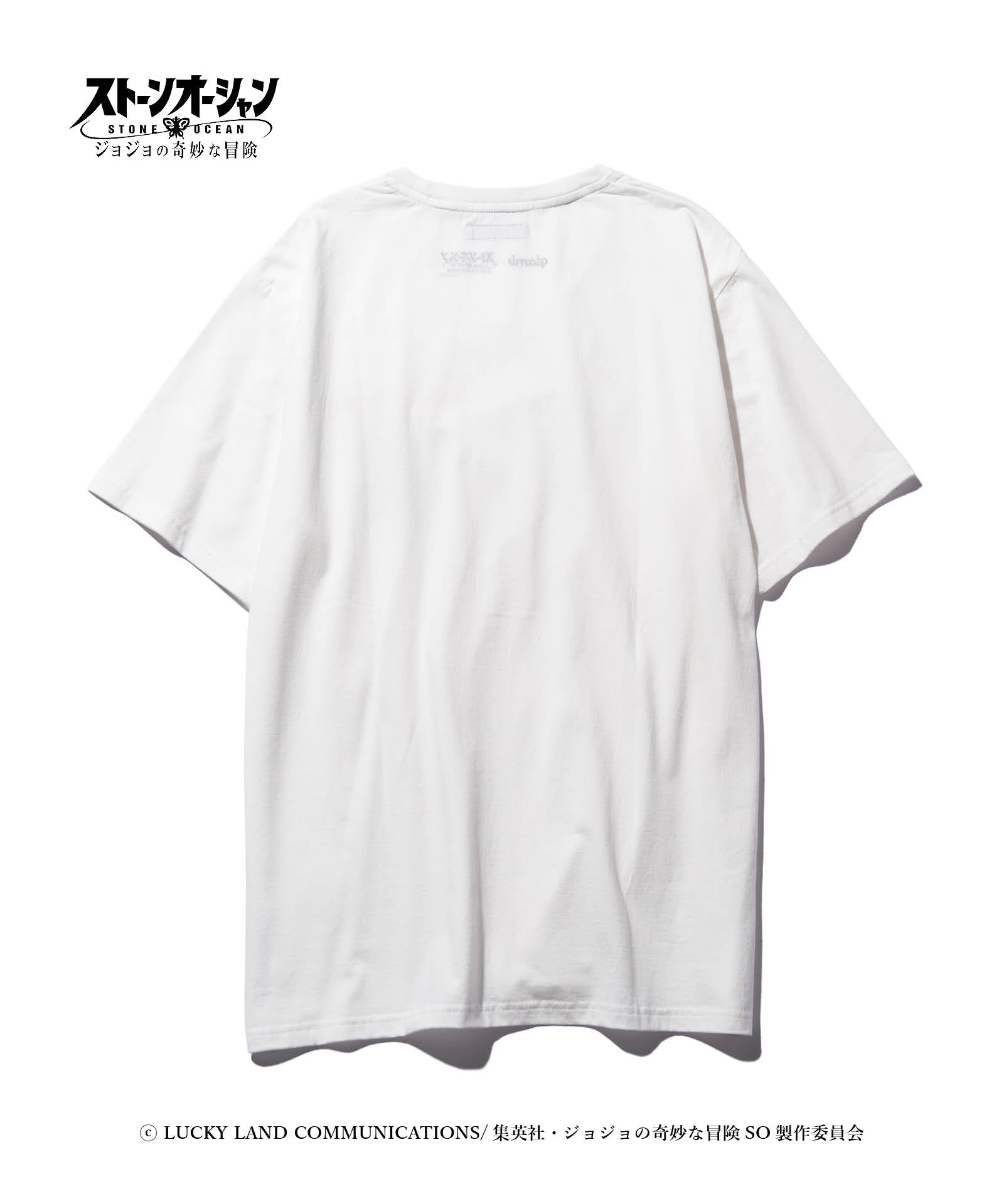 作中、敵の攻撃を受けて身体が縮んだ空条徐倫、通称“チョロ吉”をウィットを込めて表現したJolyne Pocket T。左胸に覗く徐倫はステンシル版画を模したタッチで街のグラフィティ(落書き)のように描写。ポケットの中まで続くギミック感のある柄配置や、同シーンに登場する台詞にちなんだメッセージプリントなど、同シーンの躍動が蘇る仕上がりとなっています。