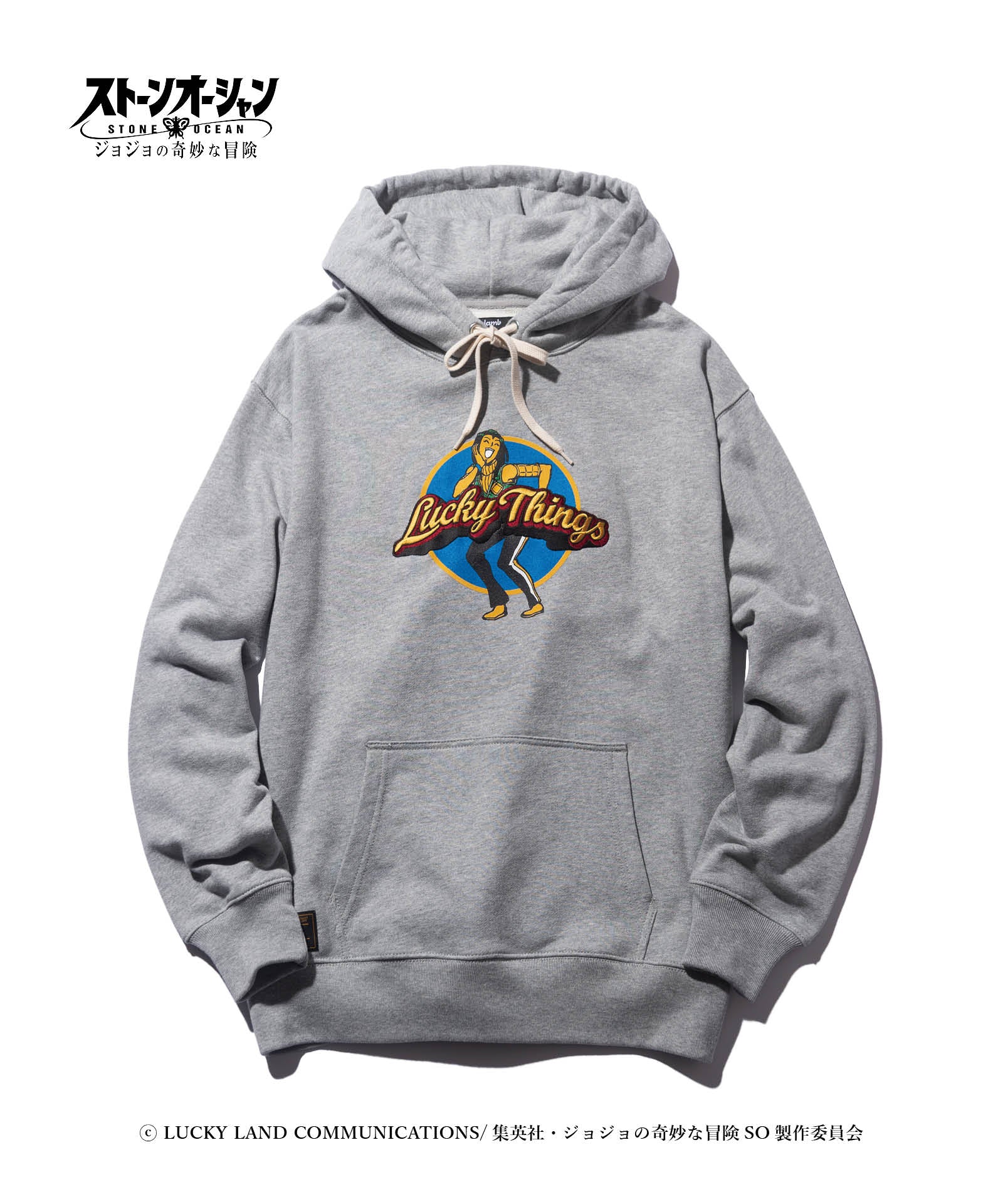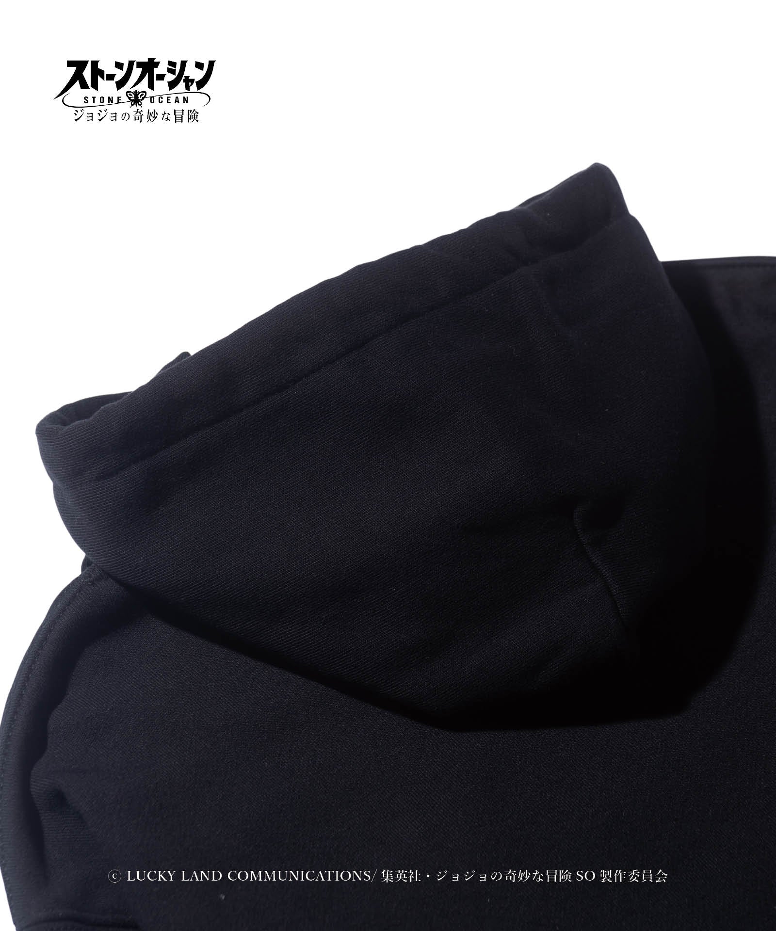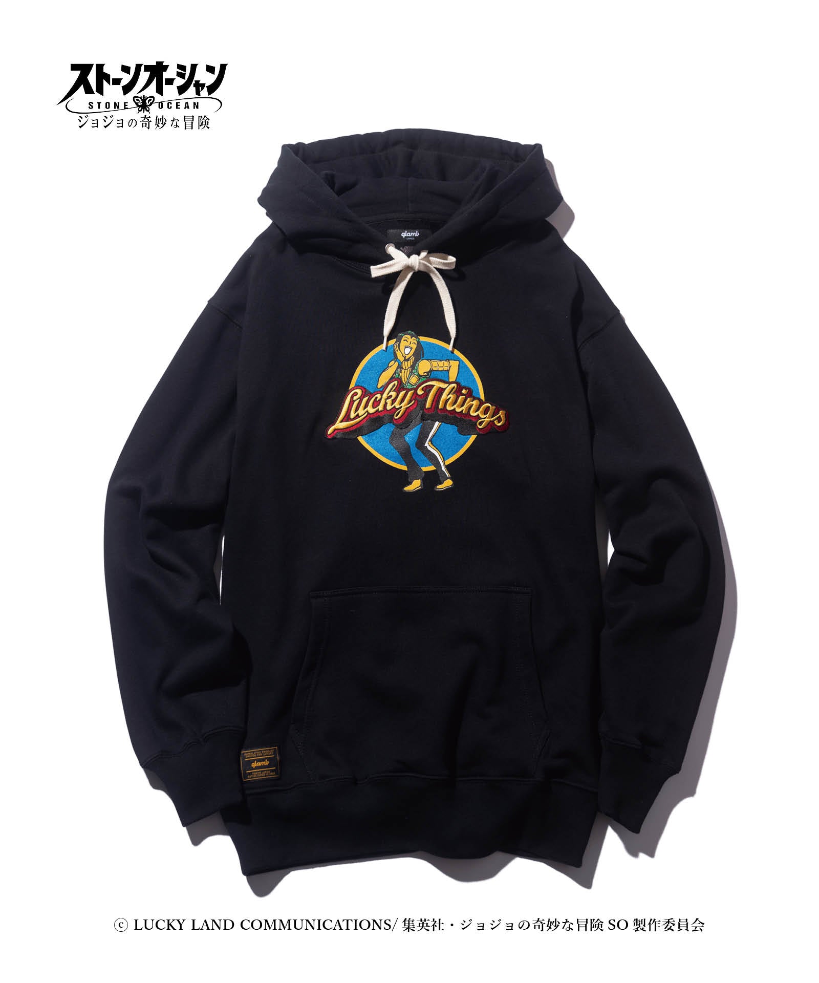 アニメ『ジョジョの奇妙な冒険』シリーズとのコラボレーションにより数多くのアイテムを発表してきたglambが『ジョジョの奇妙な冒険 ストーンオーシャン』と二度目のコラボレーションを発表。 主人公、空条徐倫の相棒エルメェス・コステロを載せたE・Costello Hoodie。彼女の人気のワンシーンを、glambは20世紀の軍用機に数多く描かれたノーズアートのアイデアでグラフィックとして再構築。「Lucky Things」は刺繍によって施しており、オールドアメリカンなムードに洋服ならではの立体表現を交えています。 ボディはテキスタイルに12.7オンスのヘヴィウェイト裏毛生地を使用。身幅とアーム幅にゆとりを設けたルーズシルエットと相まって、重厚でクラシカルな佇まいを楽しませます。