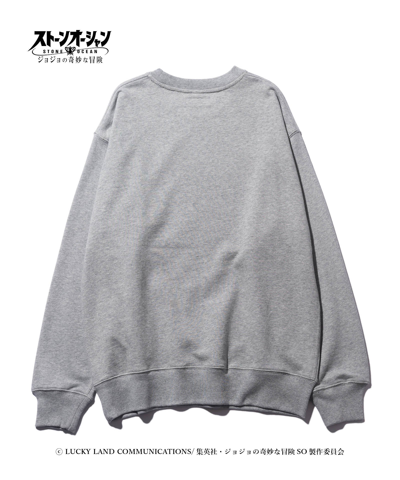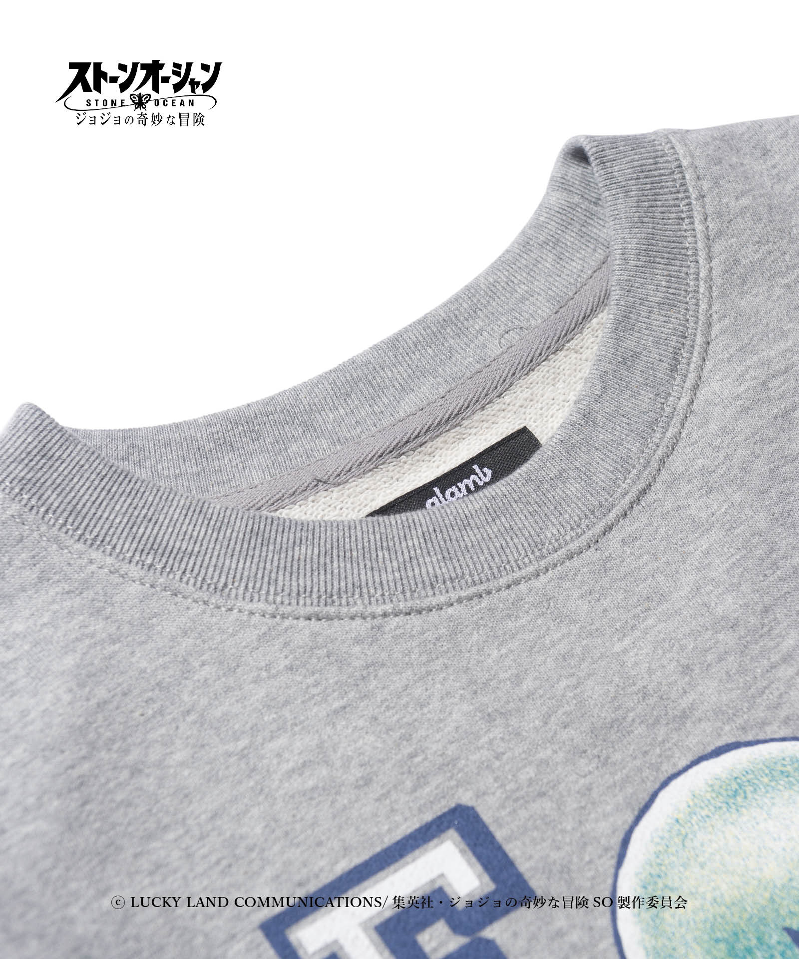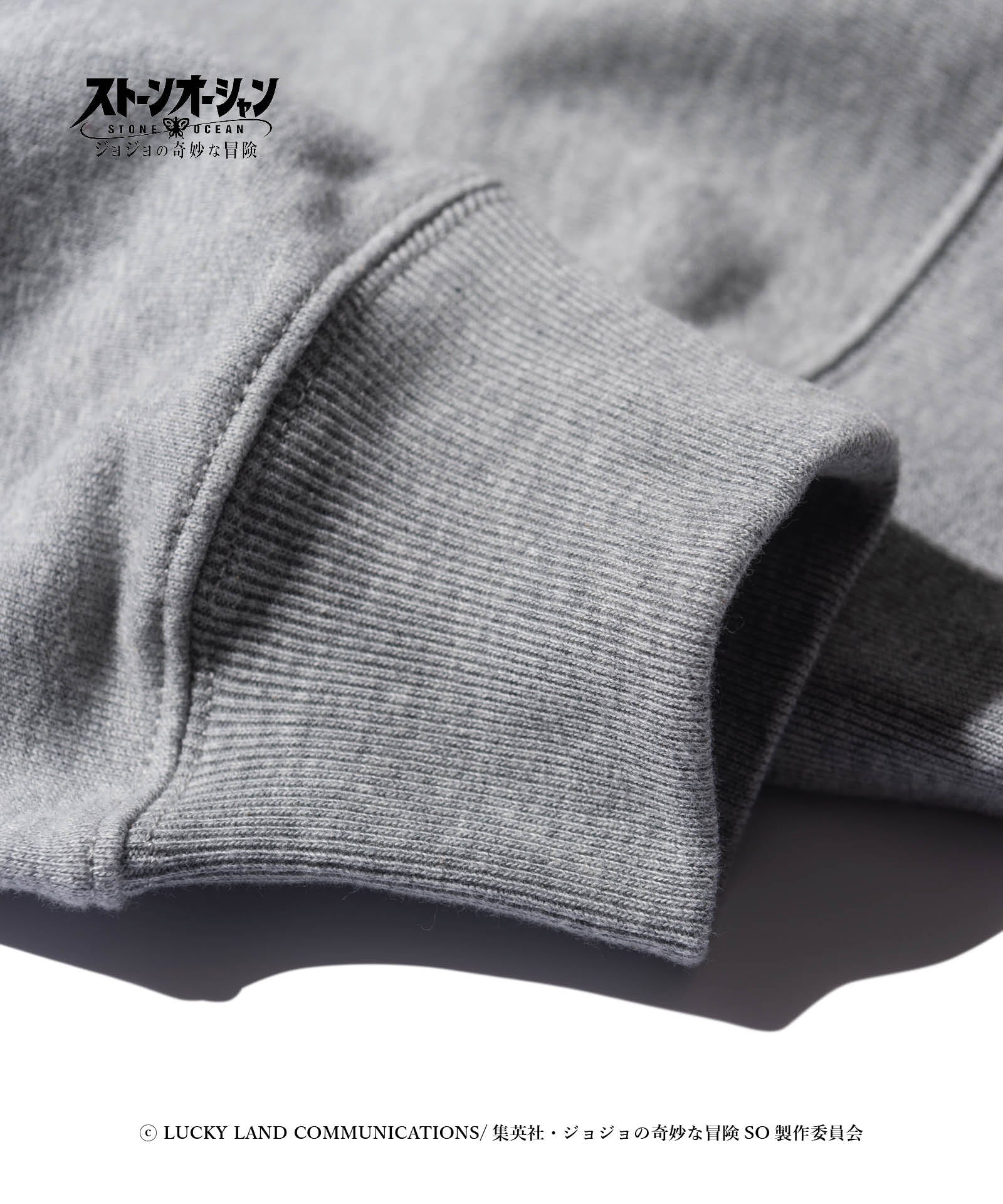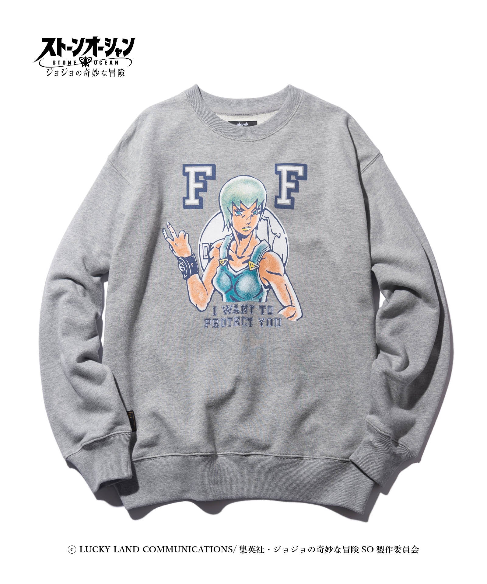 アニメ『ジョジョの奇妙な冒険』シリーズとのコラボレーションにより数多くのアイテムを発表してきたglambが『ジョジョの奇妙な冒険 ストーンオーシャン』と二度目のコラボレーションを発表。 “知性”がキーワードとなるキャラクター、フー・ファイターズのポートレイトをカレッジスウェットという“知的”なアイテムに乗せたF・F Sweat。キャラクターのポートレイトの周囲にはヴィンテージフォントを使用したロゴ。敢えてやり過ぎないオーセンティックなデザインによってフー・ファイターズの姿を重厚に表現しました。 身幅とアーム幅を広めに設けたルーズシルエットのボディは、アームや袖など稼働量の多い箇所には堅牢なステッチを施した立体感ある輪郭が特徴。テキスタイルには12.7オンスのヘヴィウェイト裏毛生地を使用し、ヴィンテージライクなタフな素材感となっております。