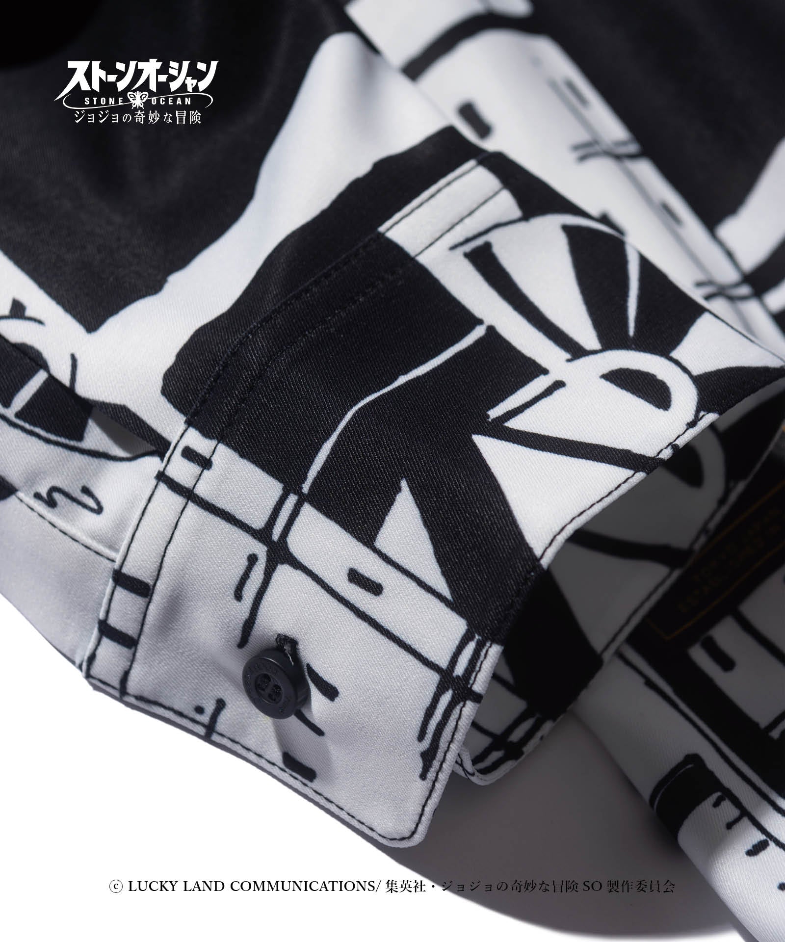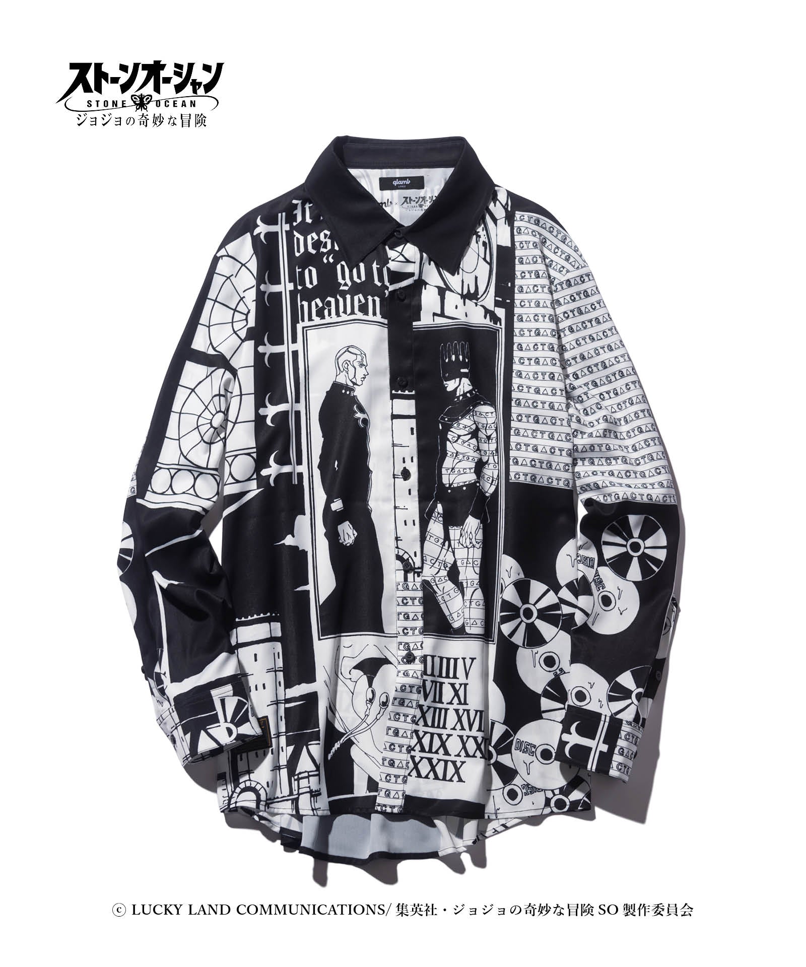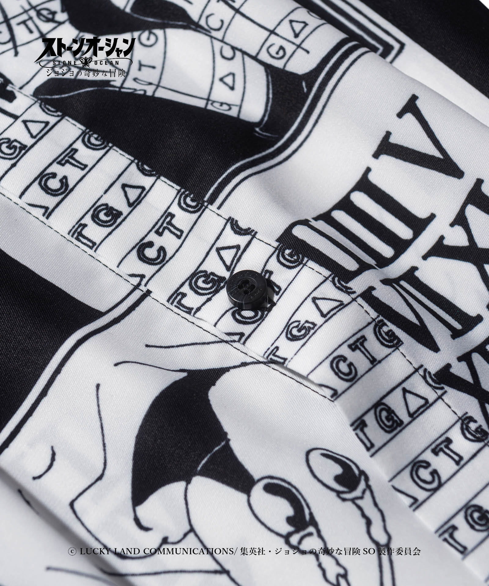 作中の宿敵として登場するエンリコ・プッチの佇まいをボディ全体で荘厳に表現したEnrico・P SH。描画技法には優雅で装飾的なアール・ヌーヴォーの様式を取り入れながら、総柄の隅々に描かれたのはディスクや文字列といった無機質的なモチーフ。どこか不穏なそのバランスは作中におけるプッチの恐ろしさを思い起こさせます。