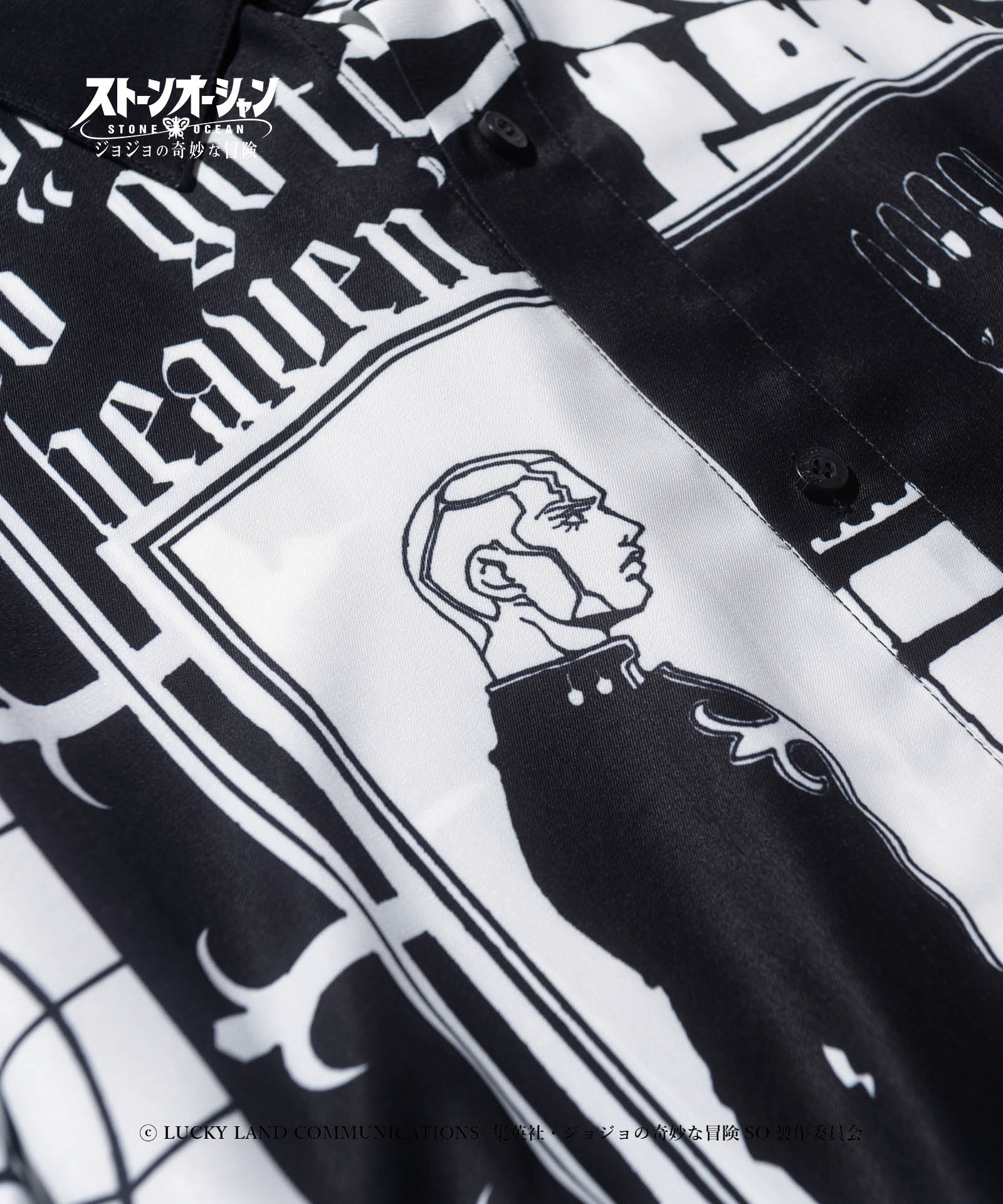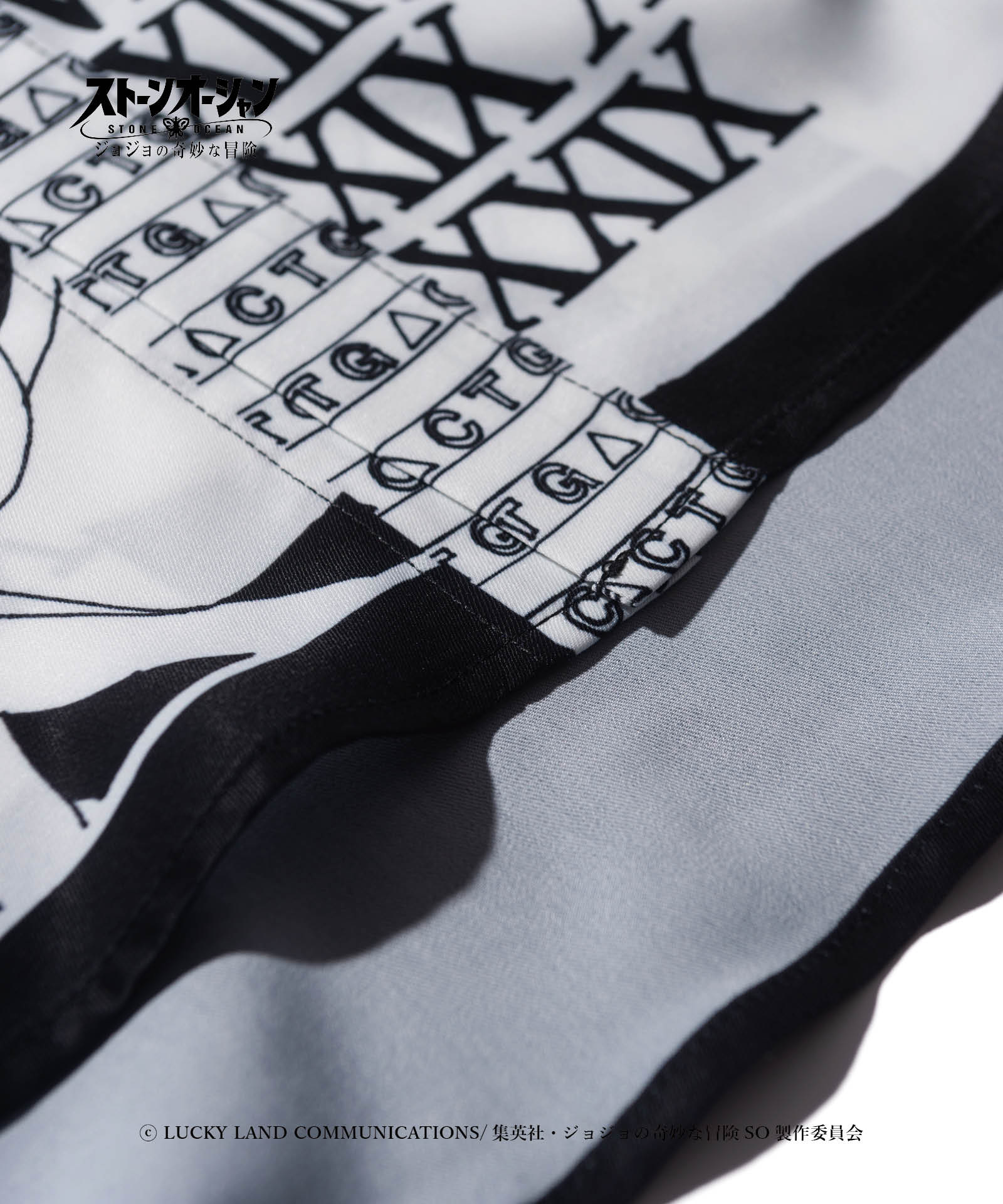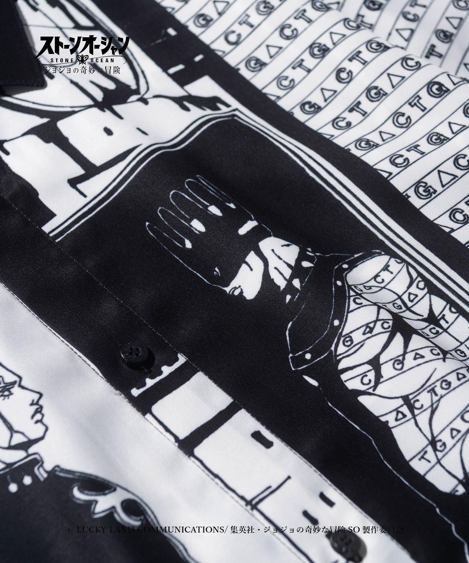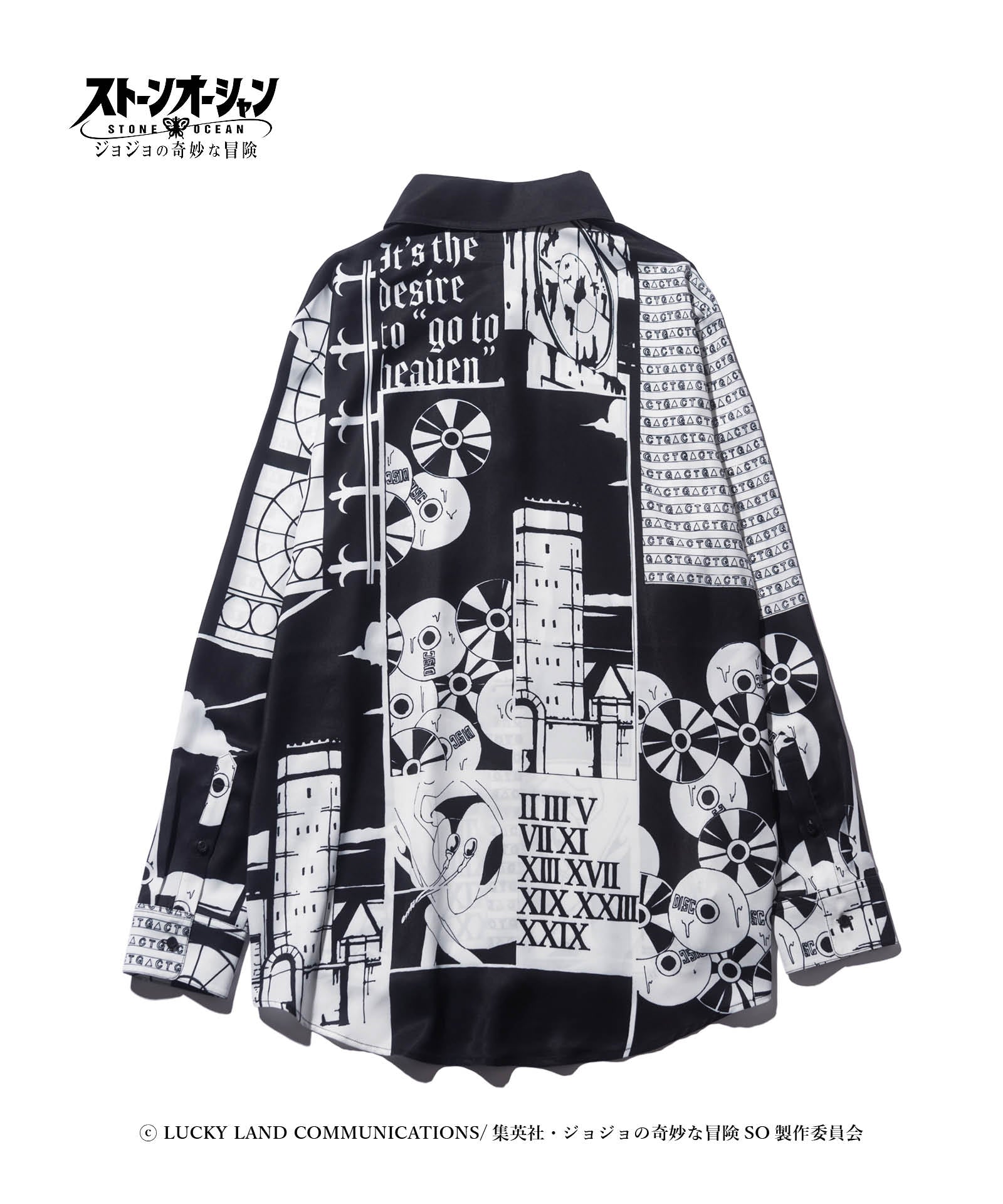 作中の宿敵として登場するエンリコ・プッチの佇まいをボディ全体で荘厳に表現したEnrico・P SH。描画技法には優雅で装飾的なアール・ヌーヴォーの様式を取り入れながら、総柄の隅々に描かれたのはディスクや文字列といった無機質的なモチーフ。どこか不穏なそのバランスは作中におけるプッチの恐ろしさを思い起こさせます。