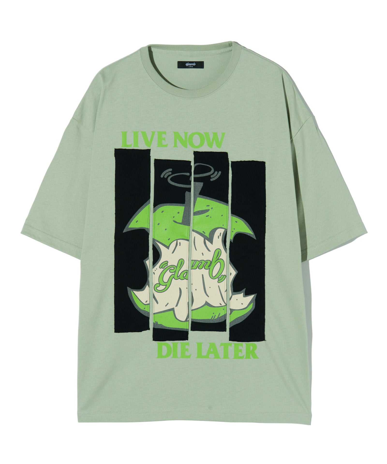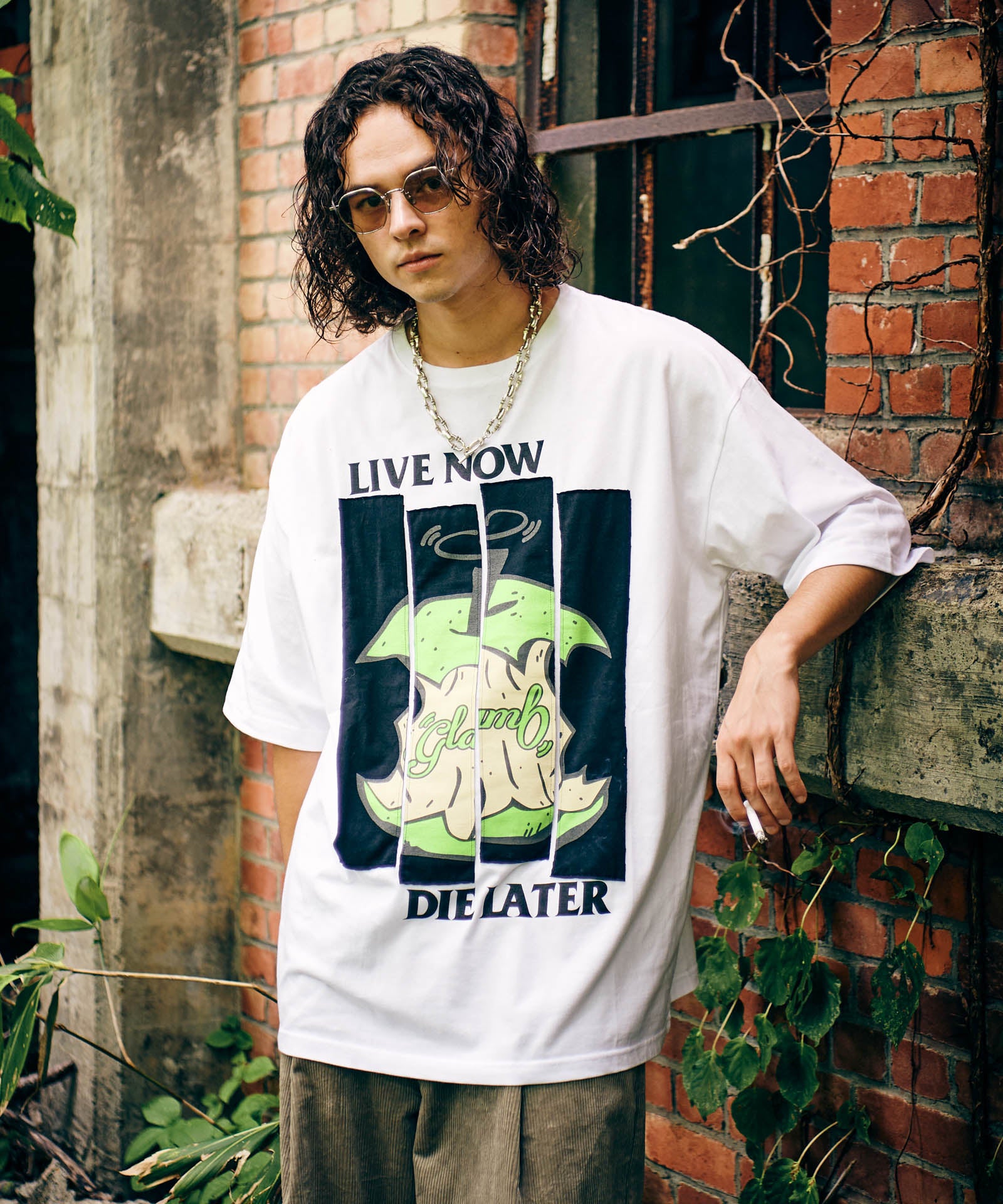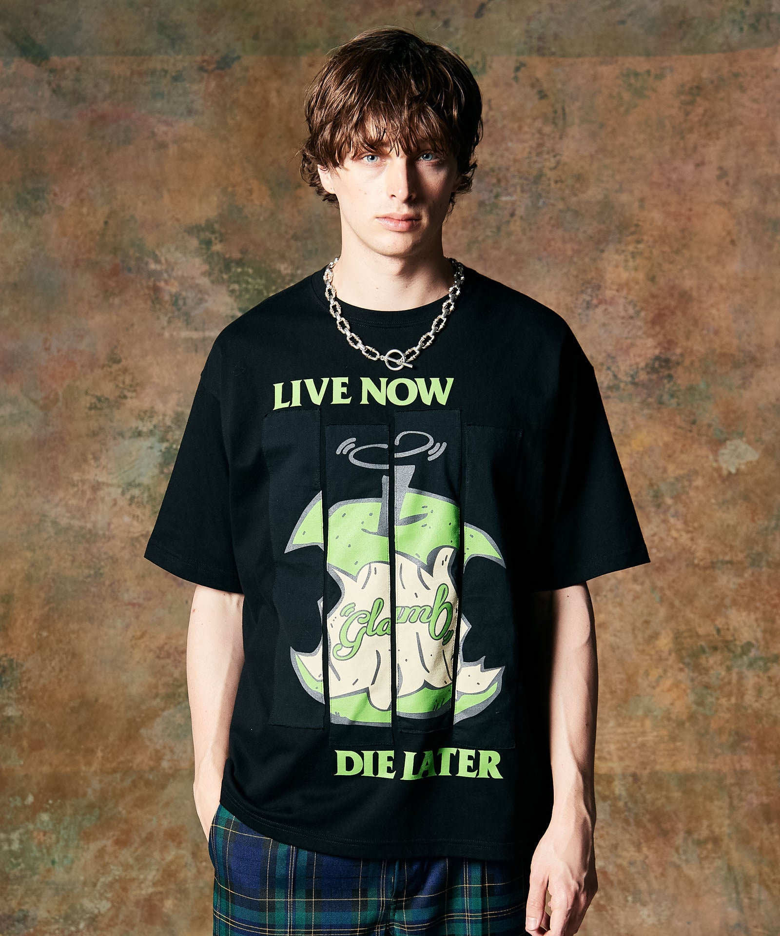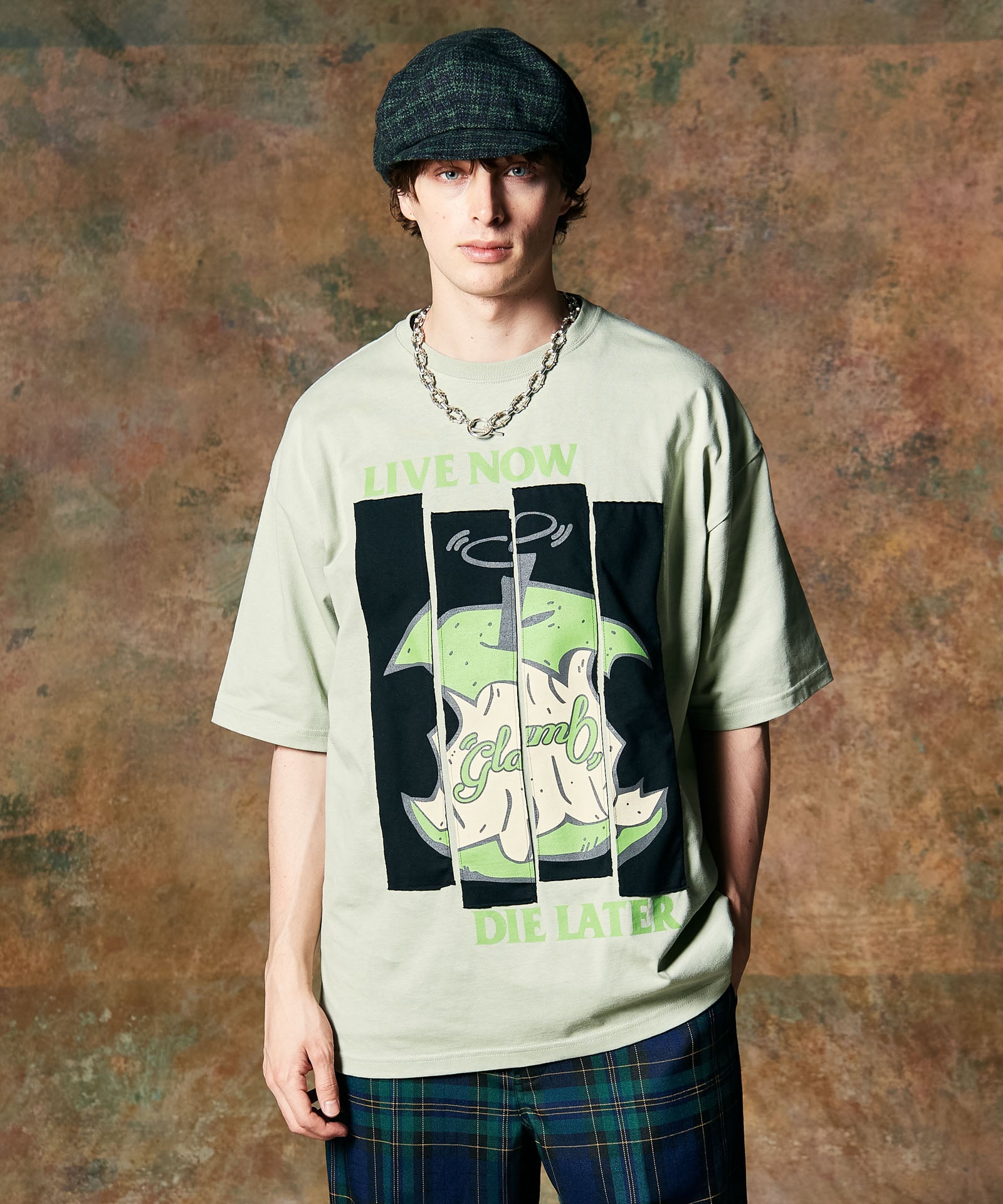 禁断の果実としての宗教的なイメージや世界的なロックバンドのレーベル名に使用されるなど、ポップカルチャーのアイコンの一つであるアップルモチーフをglambらしく提案するApple Flag T-Shirt。ベースとなる構図はハードコアパンクのムードを感じさせる4本の柱状。それらを4種の生地で叩きつけることでクラフトマンシップ漂うルックスにまとめました。ボディの生地に用いたのはコットン100%の5.6オンスヘビーウェイト天竺。ビッグシルエットのボディはオントレンドなスタイリングを叶えます。