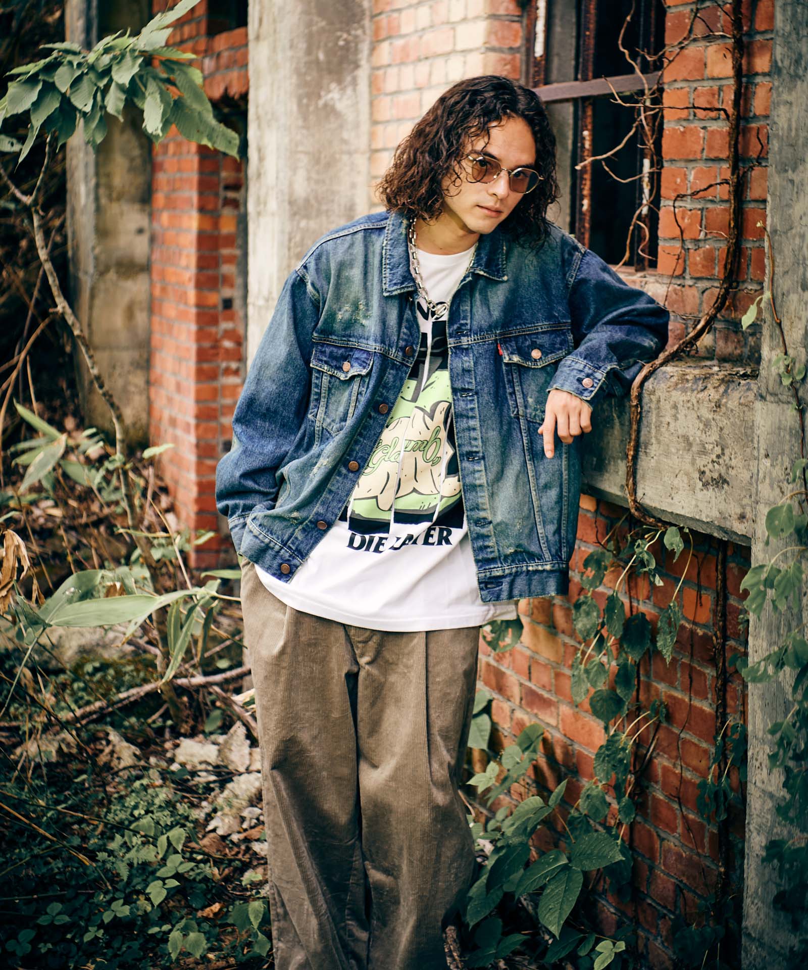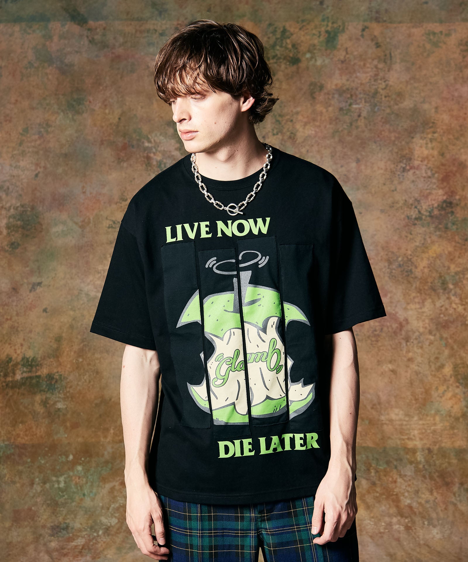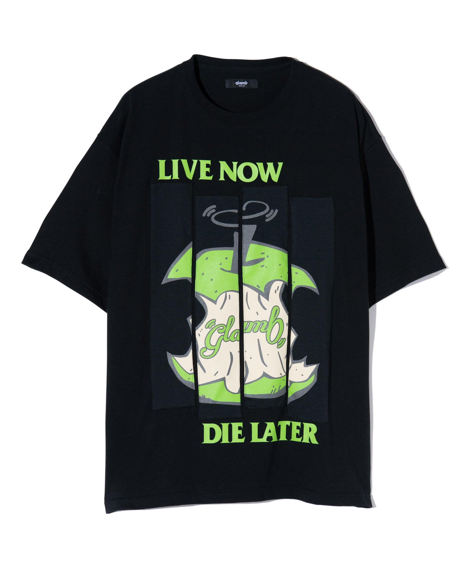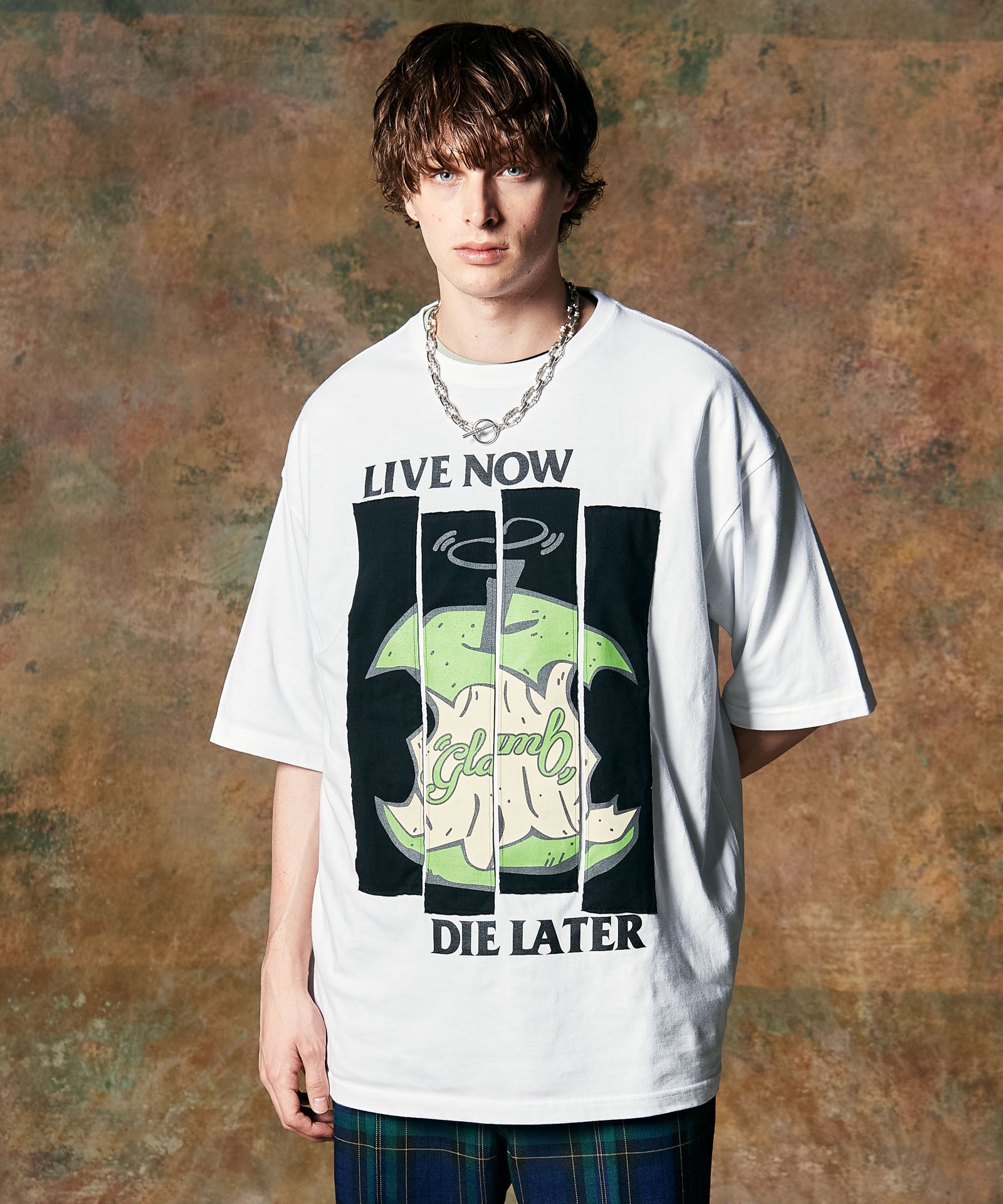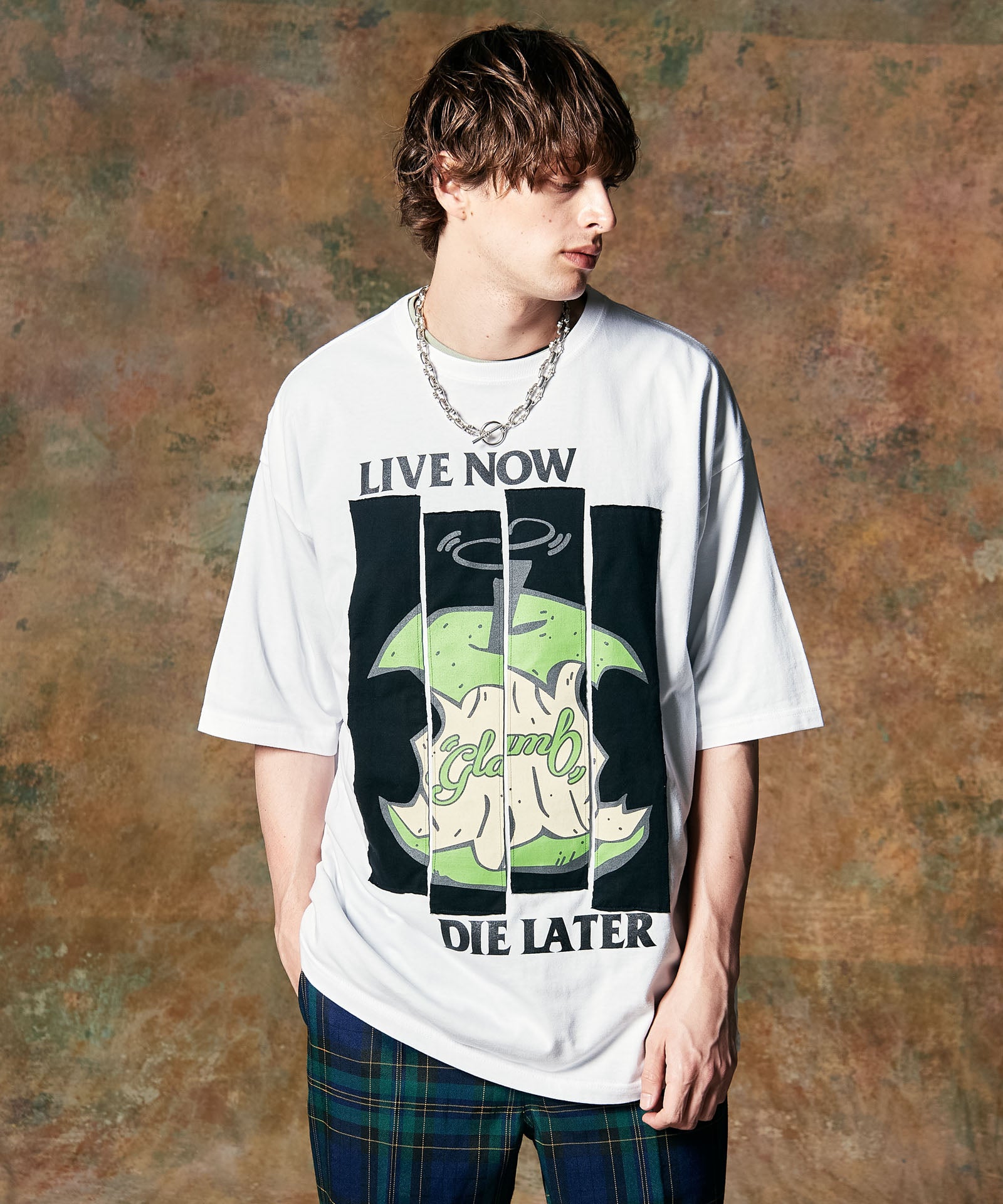 禁断の果実としての宗教的なイメージや世界的なロックバンドのレーベル名に使用されるなど、ポップカルチャーのアイコンの一つであるアップルモチーフをglambらしく提案するApple Flag T-Shirt。ベースとなる構図はハードコアパンクのムードを感じさせる4本の柱状。それらを4種の生地で叩きつけることでクラフトマンシップ漂うルックスにまとめました。ボディの生地に用いたのはコットン100%の5.6オンスヘビーウェイト天竺。ビッグシルエットのボディはオントレンドなスタイリングを叶えます。